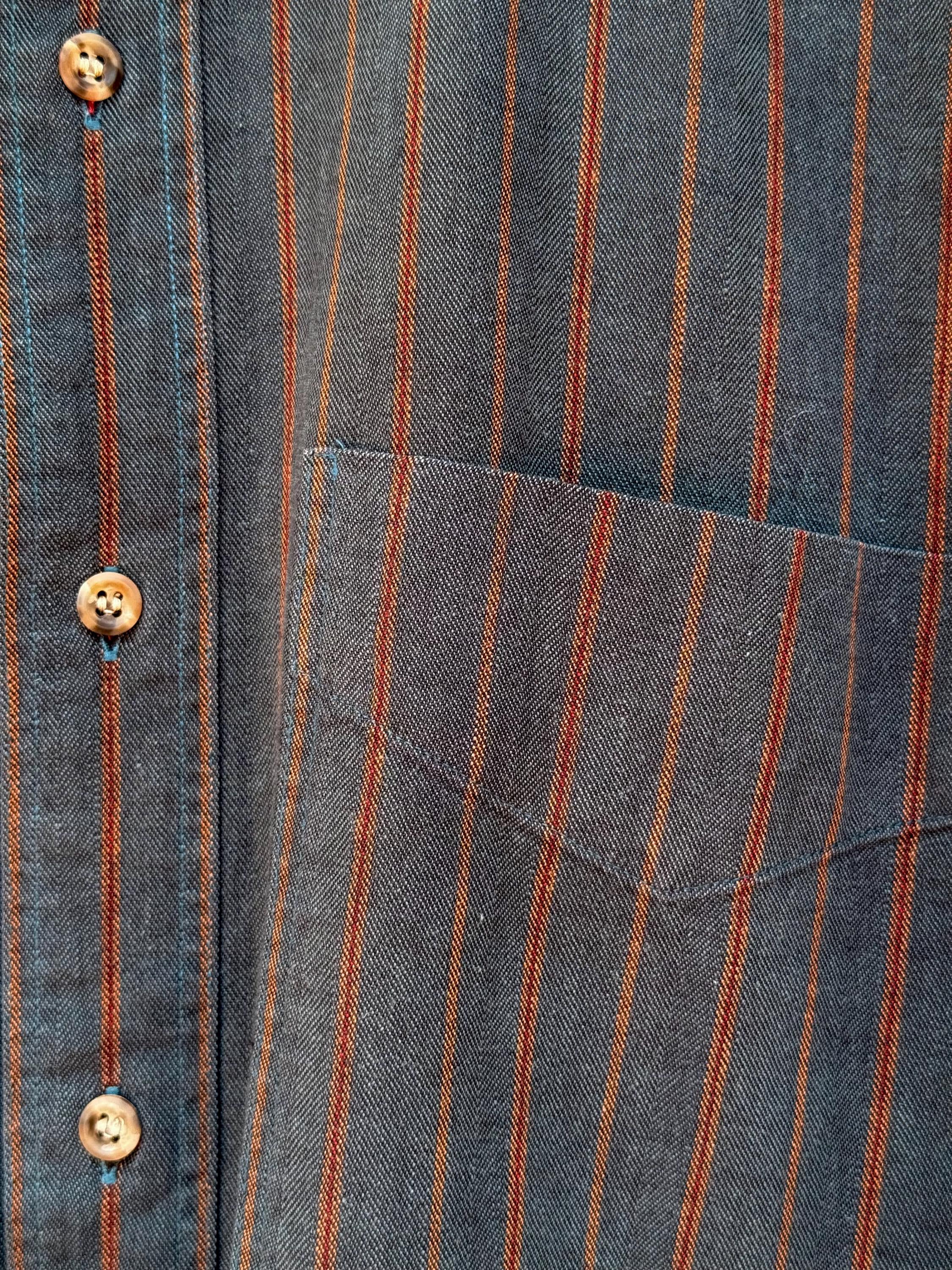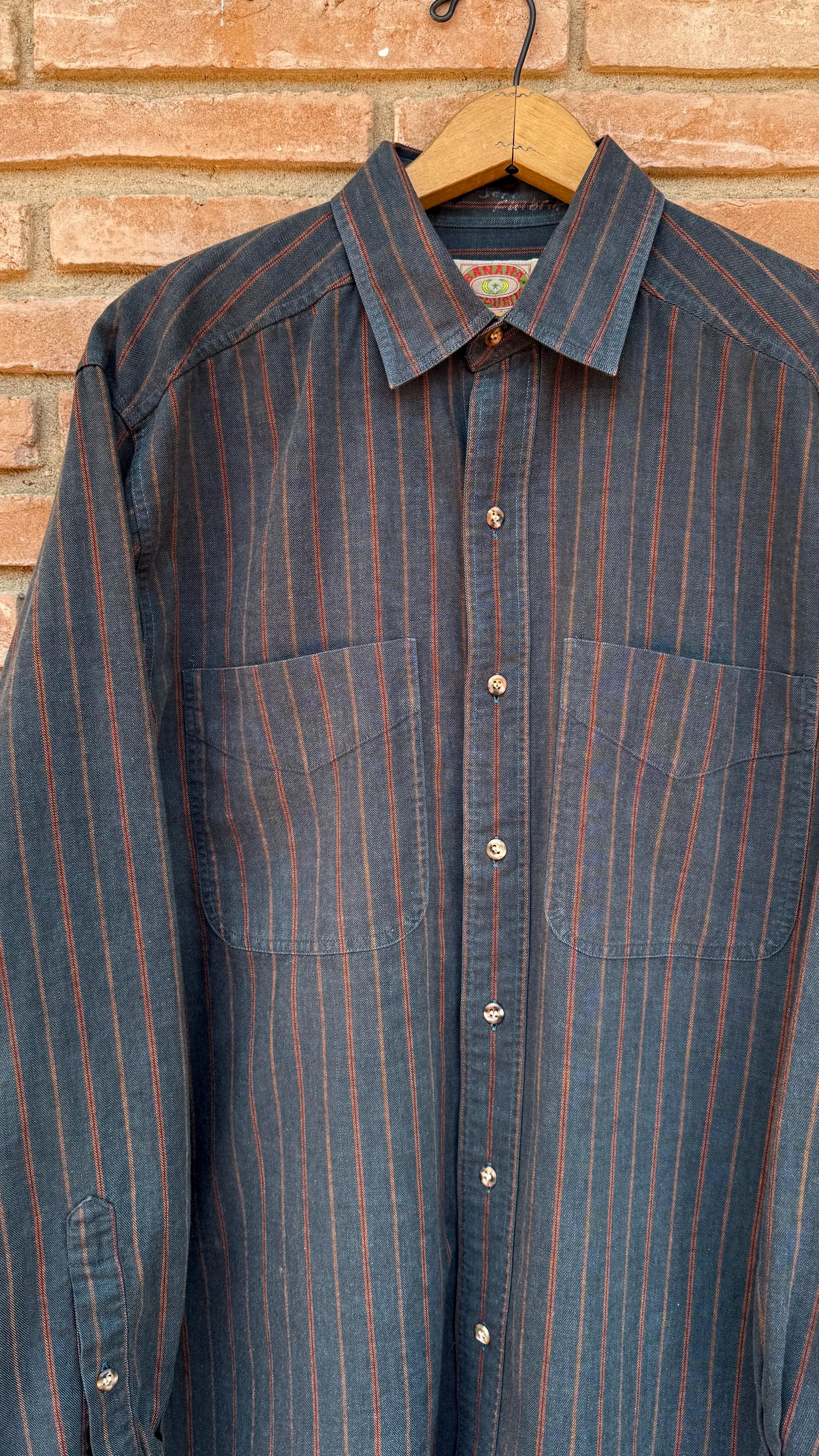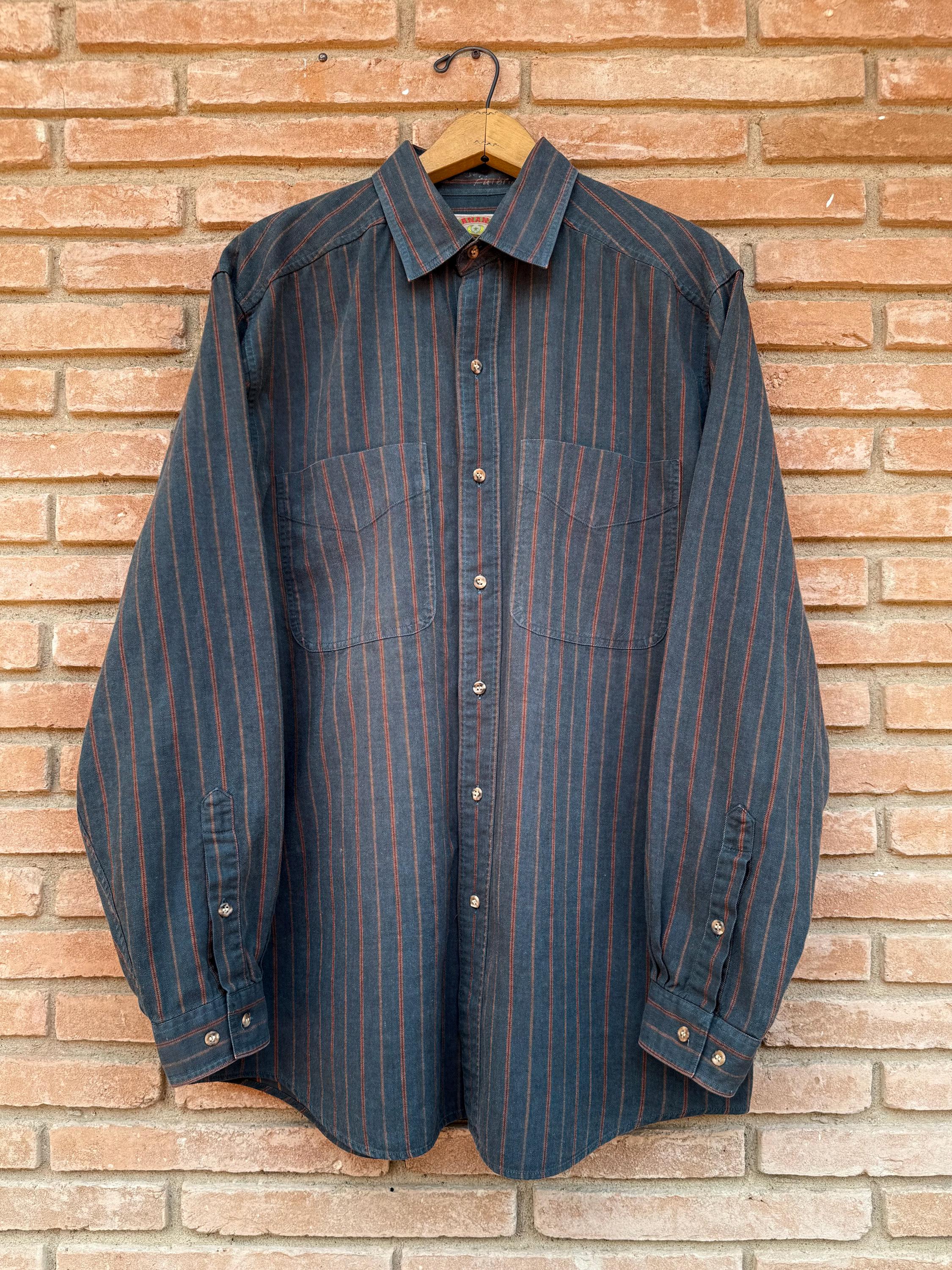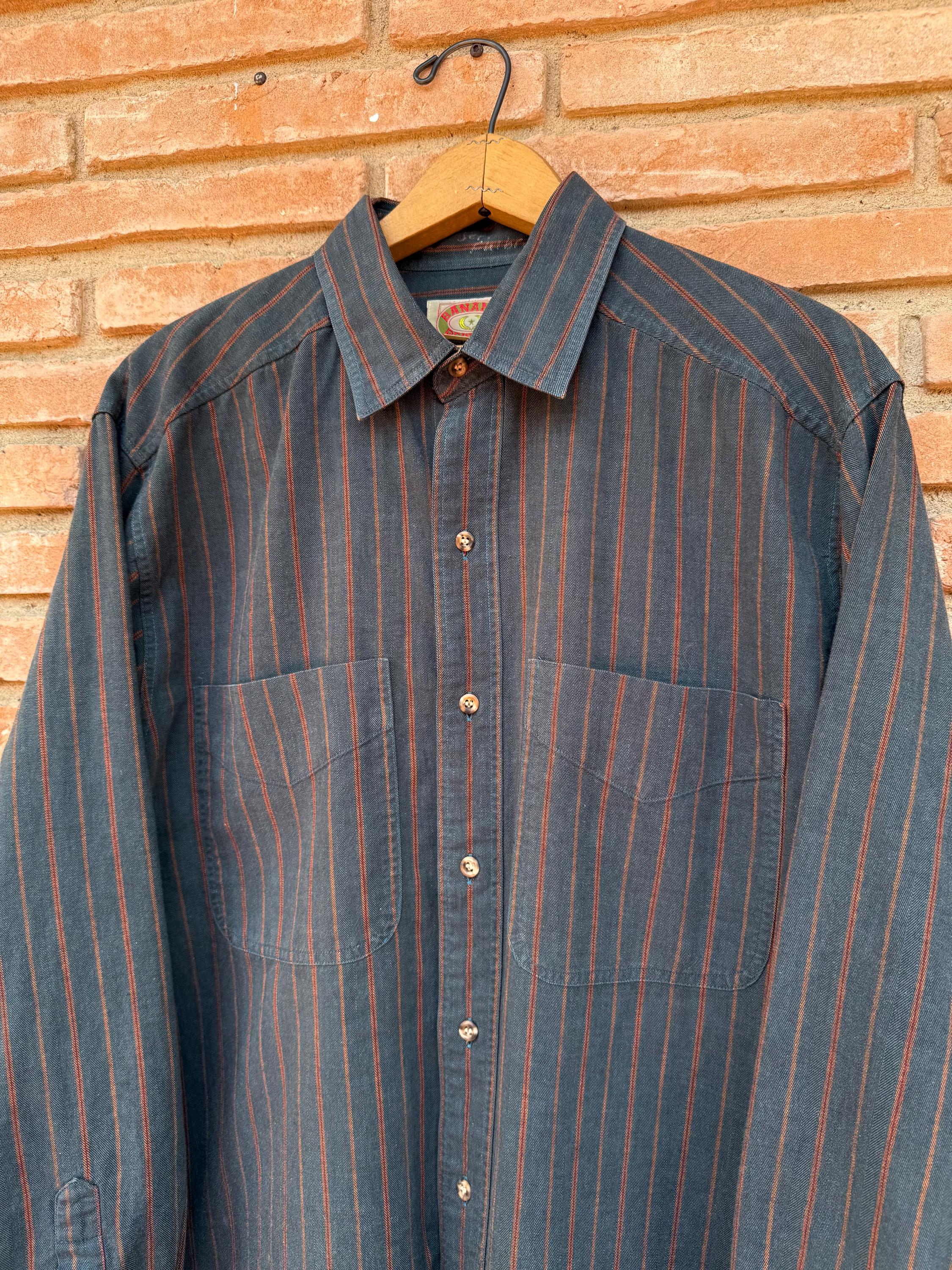 An authentic vintage shirt by Banana Republic (Mill Valley label). made from a medium weight woven twill vertical stripe fabric. a durable utility style in an interesting colorway.