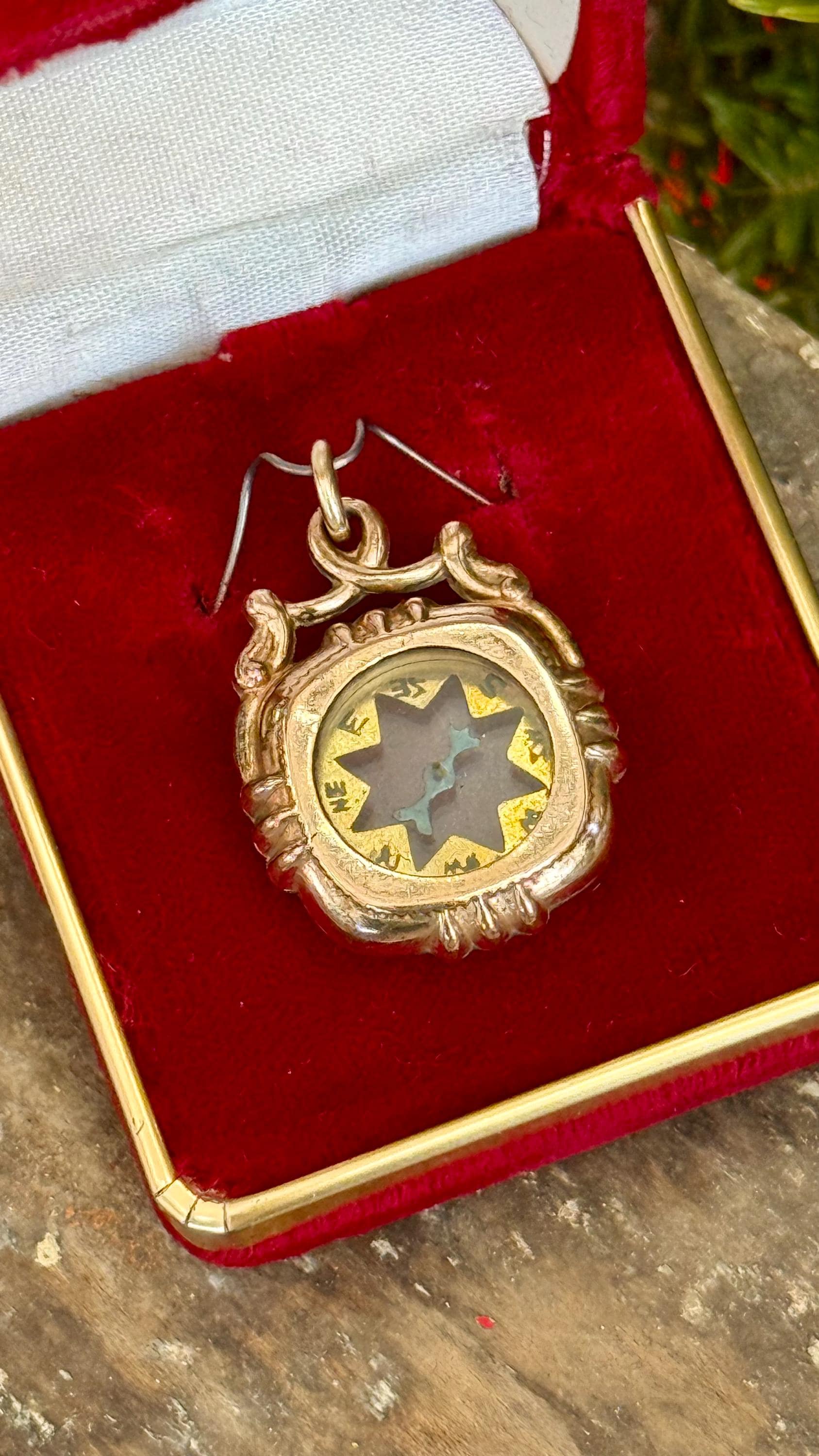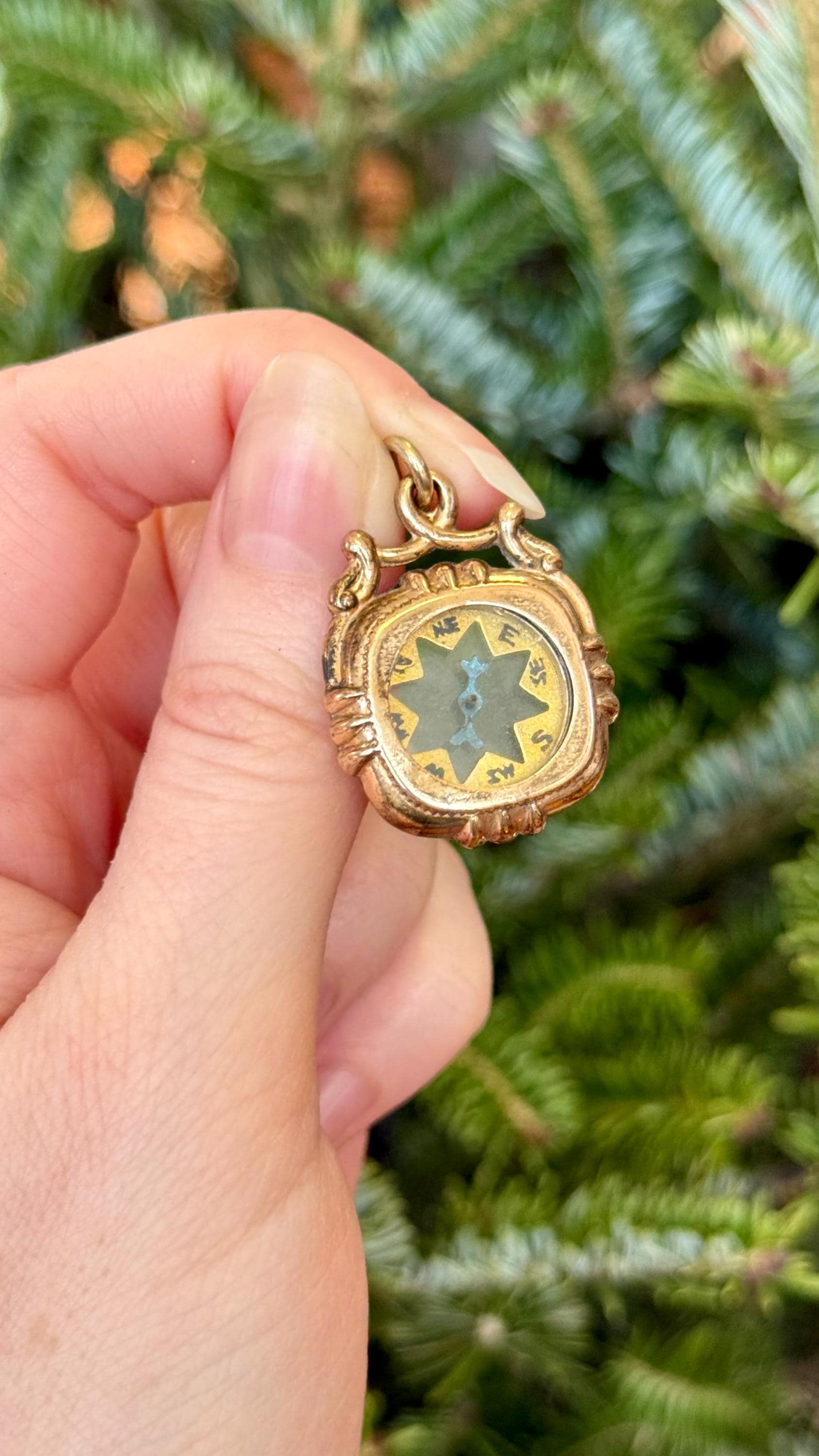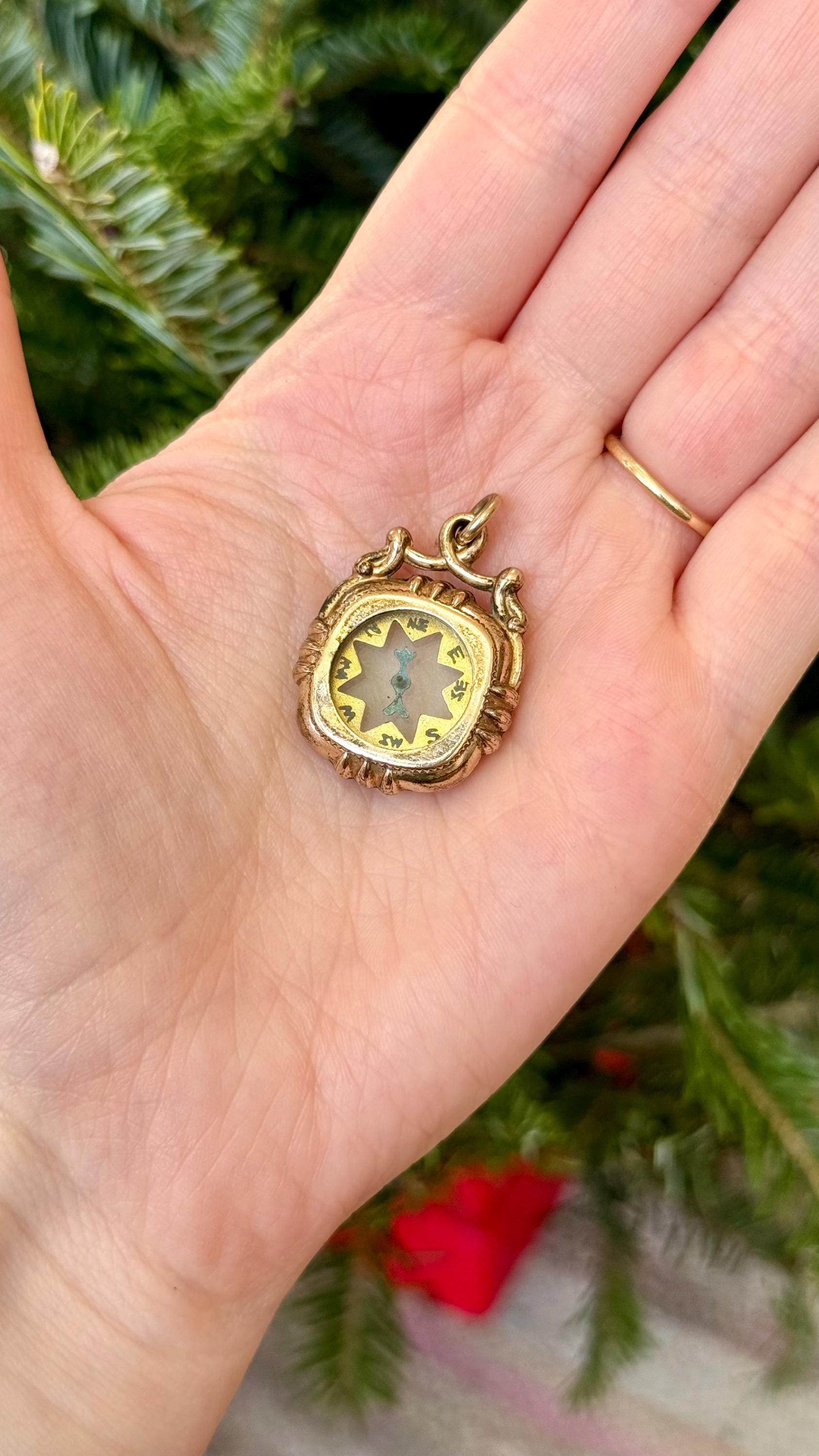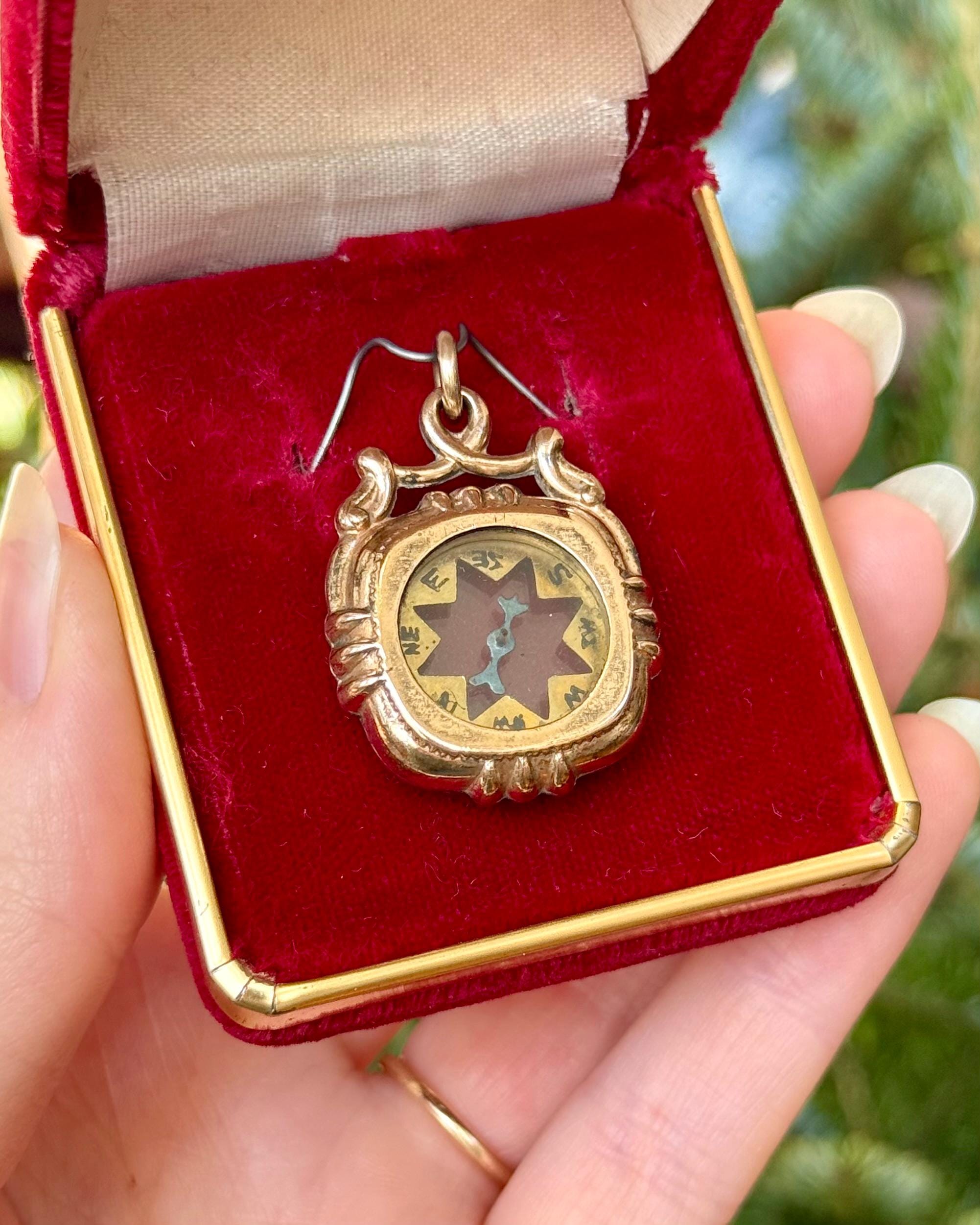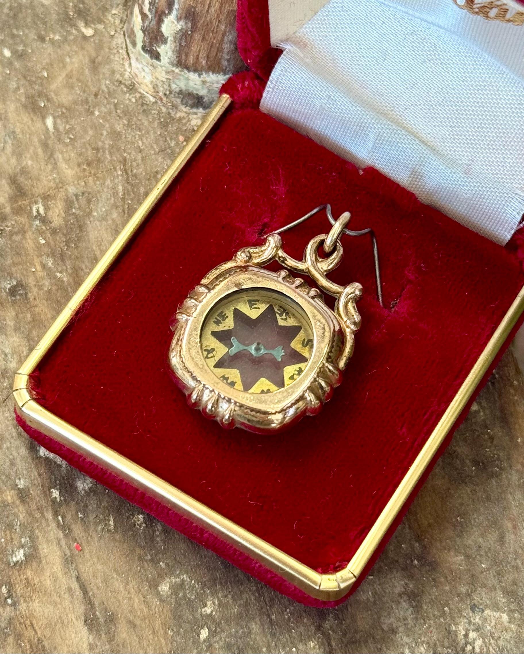 An authentic antique fob pendant. a functional double sided compass centerpiece with a crystal glass window, metallic blue hand, and a detailed bezel and bail. includes a reclaimed matching antique jump ring to fix onto jewelry of choice. would have originally been a decorative fob to hang at the end of a pocket watch chain. it has been cleaned and polished by us at Craft Union to restore color and shine while preserving some of its natural tarnish for an aged look.