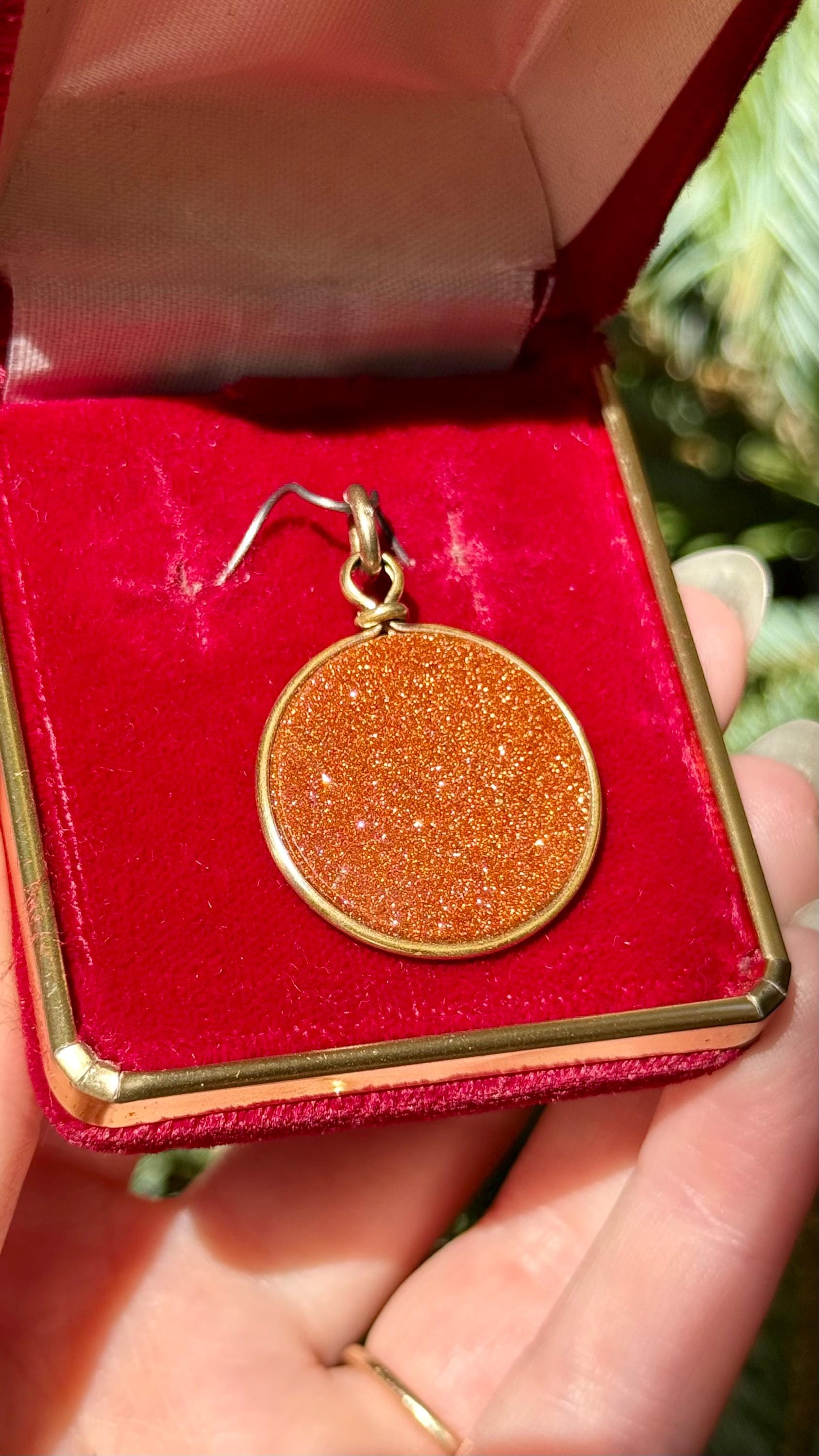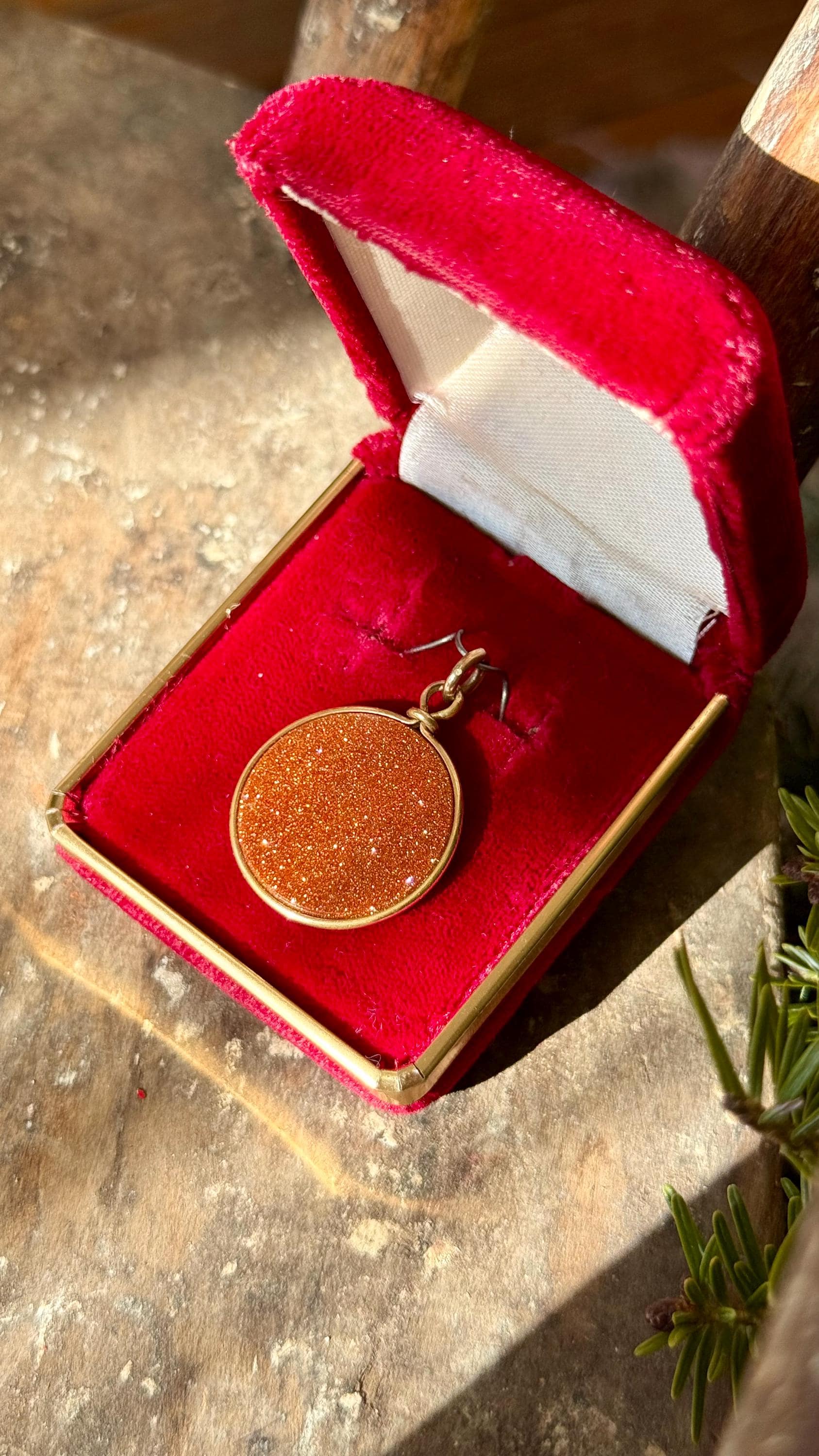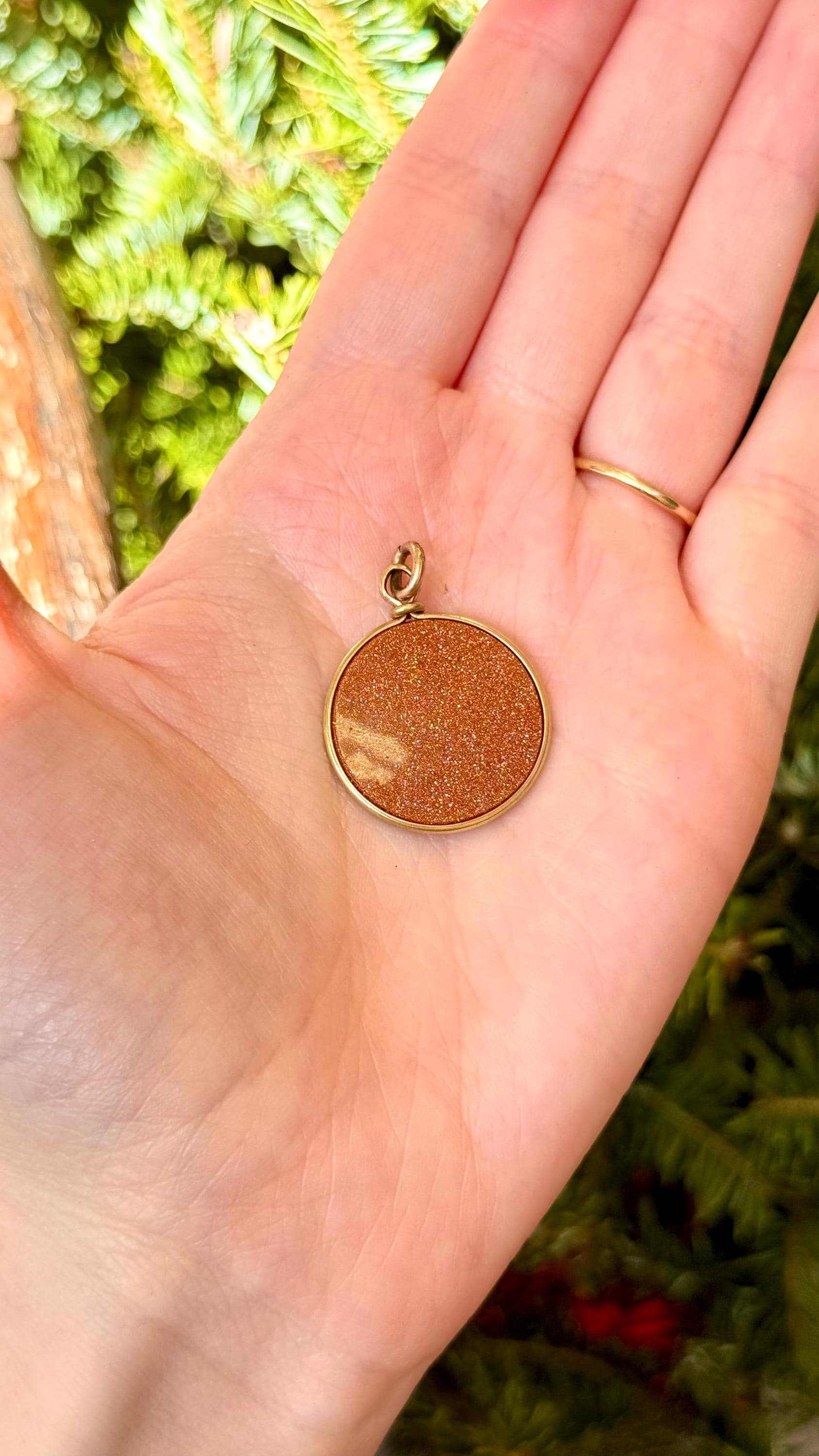 An authentic antique fob pendant. a smooth goldstone disc set in a bezel. goldstone is a manmade stone crafted from glass and copper particles that glisten beautifully in light. includes a reclaimed matching antique jump ring to fix onto jewelry of choice. would have originally been a decorative fob to hang at the end of a pocket watch chain. it has been cleaned and polished by us at Craft Union to restore color and shine while preserving some of its natural tarnish for an aged look.