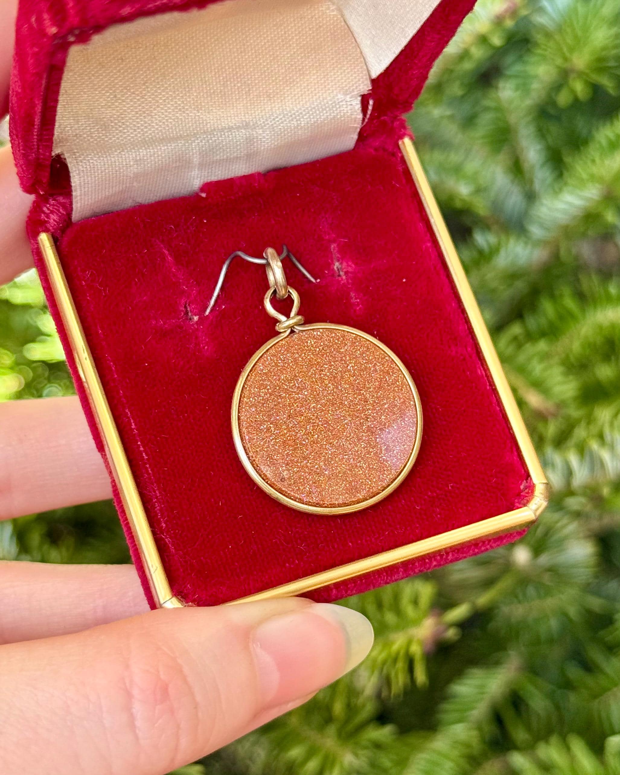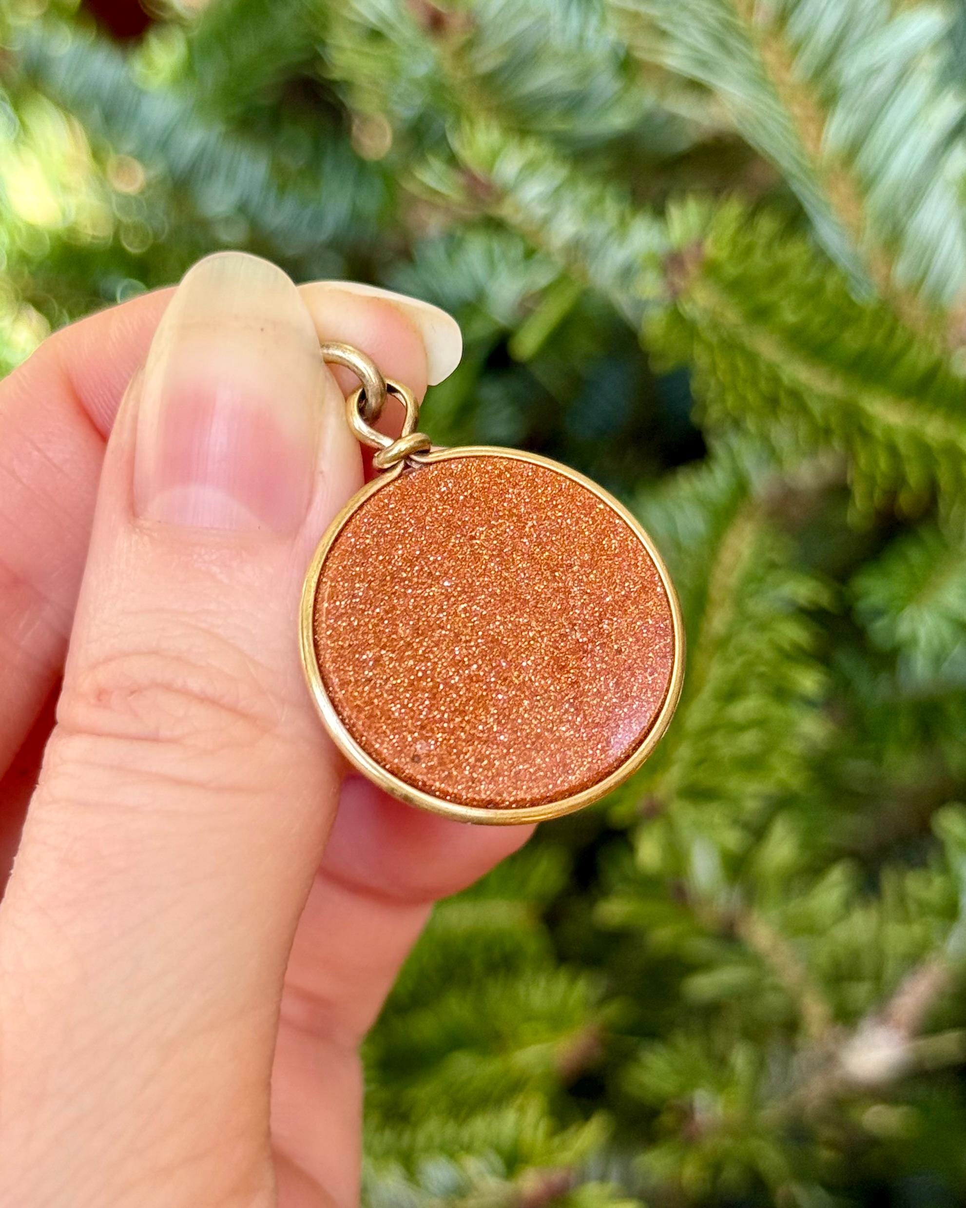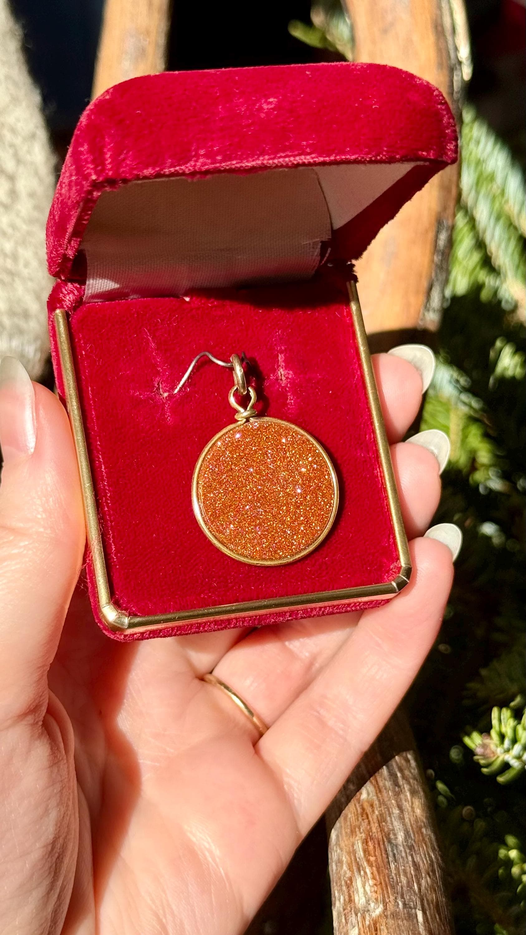 An authentic antique fob pendant. a smooth goldstone disc set in a bezel. goldstone is a manmade stone crafted from glass and copper particles that glisten beautifully in light. includes a reclaimed matching antique jump ring to fix onto jewelry of choice. would have originally been a decorative fob to hang at the end of a pocket watch chain. it has been cleaned and polished by us at Craft Union to restore color and shine while preserving some of its natural tarnish for an aged look.