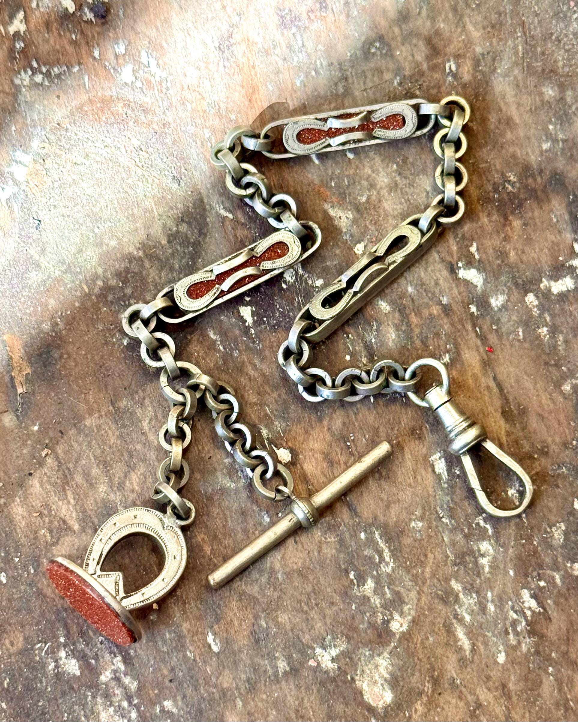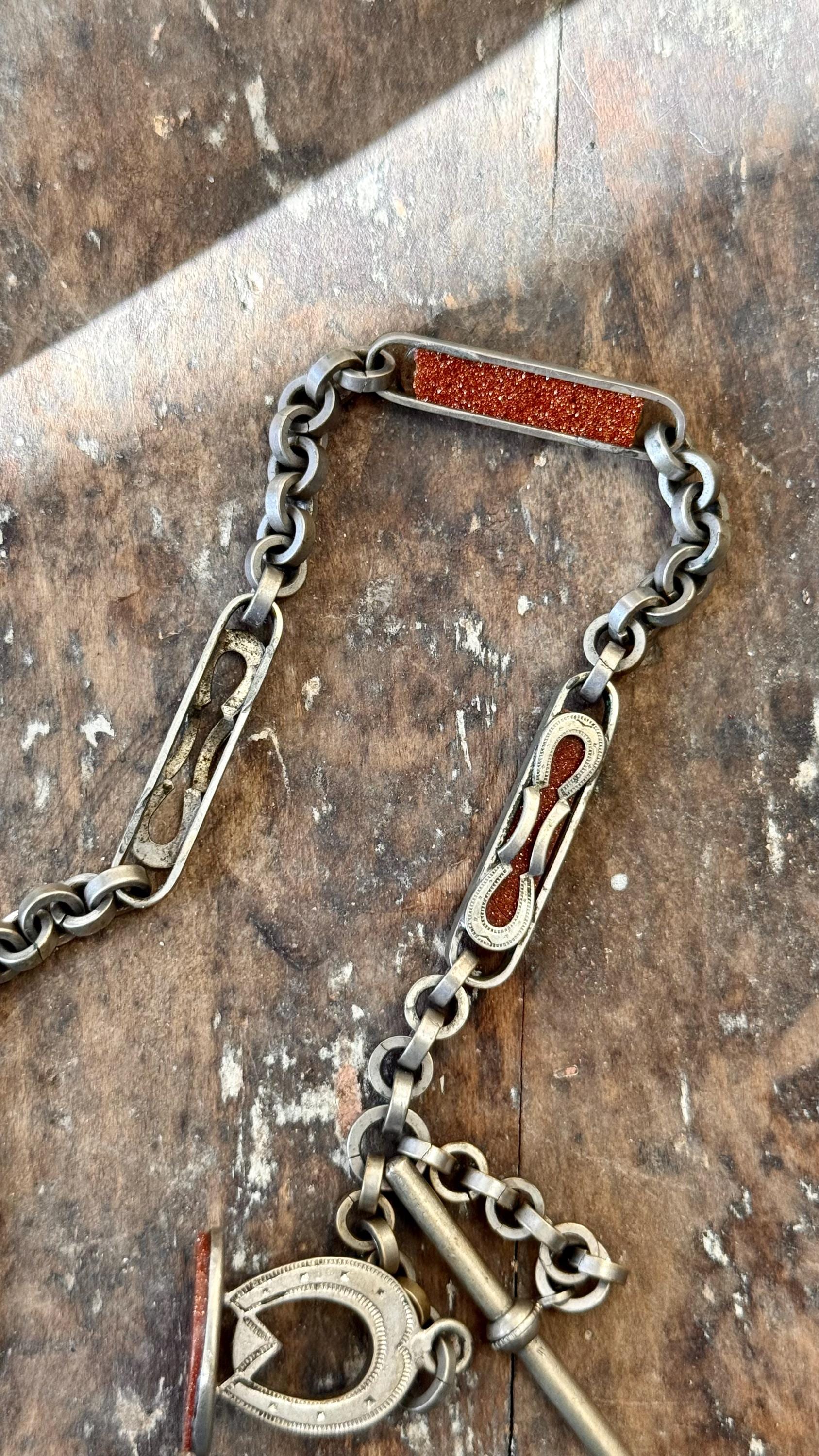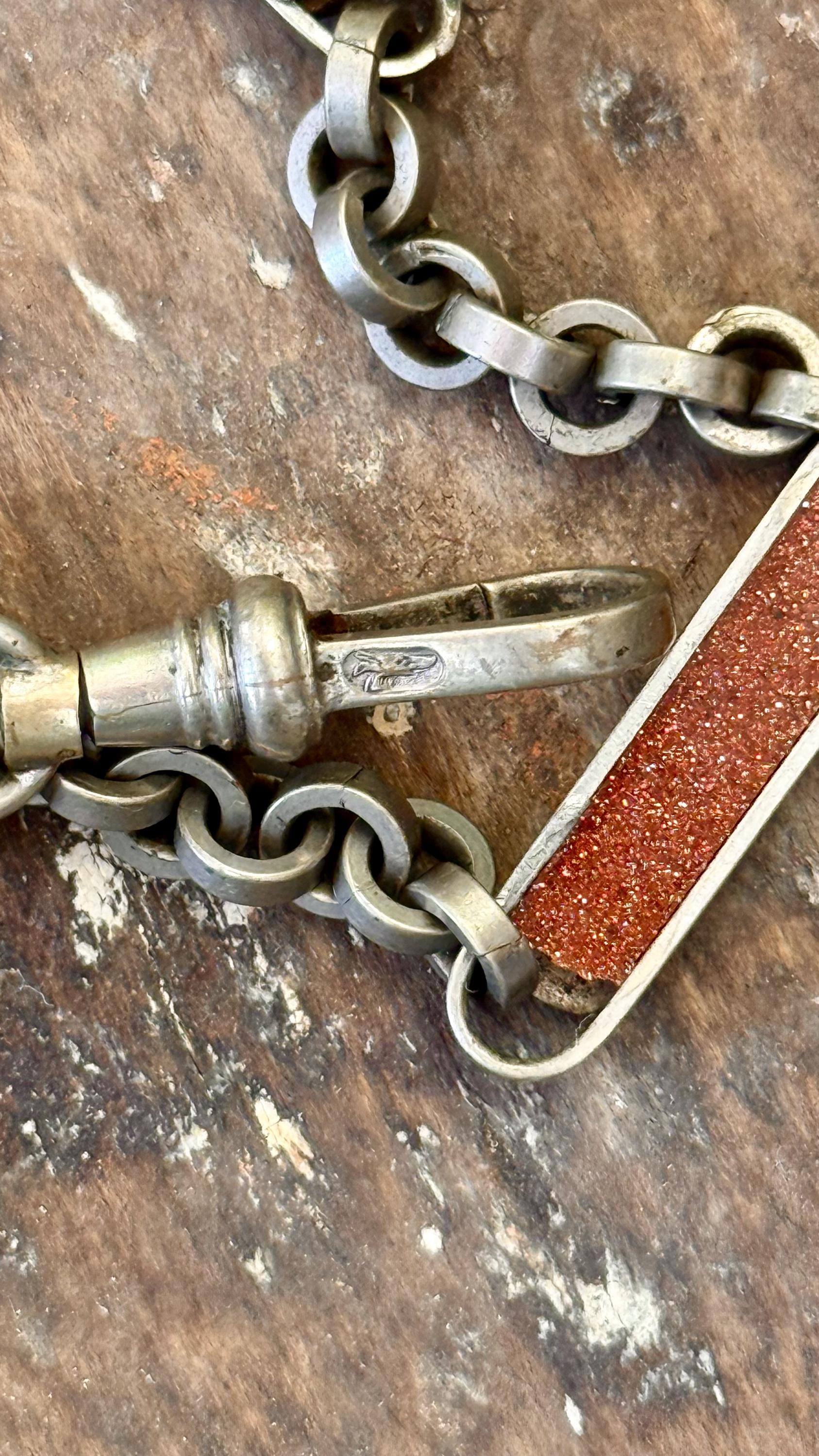 An authentic antique watch chain piece. features a beautiful lucky horseshoe fob, Albert T Bar, swivel dog clip, and unique chain links with horseshoe motifs and goldstone inlay. (goldstone is a manmade stone of glass and copper particles that glistens beautifully in light) . the entire piece is intricately crafted from “German Silver” (not real silver, a popular affordable alternative among silversmiths). European hallmarks are located on the dog clip and one of the round rings, the pictorial mark resembles a greyhound dog, likely French.