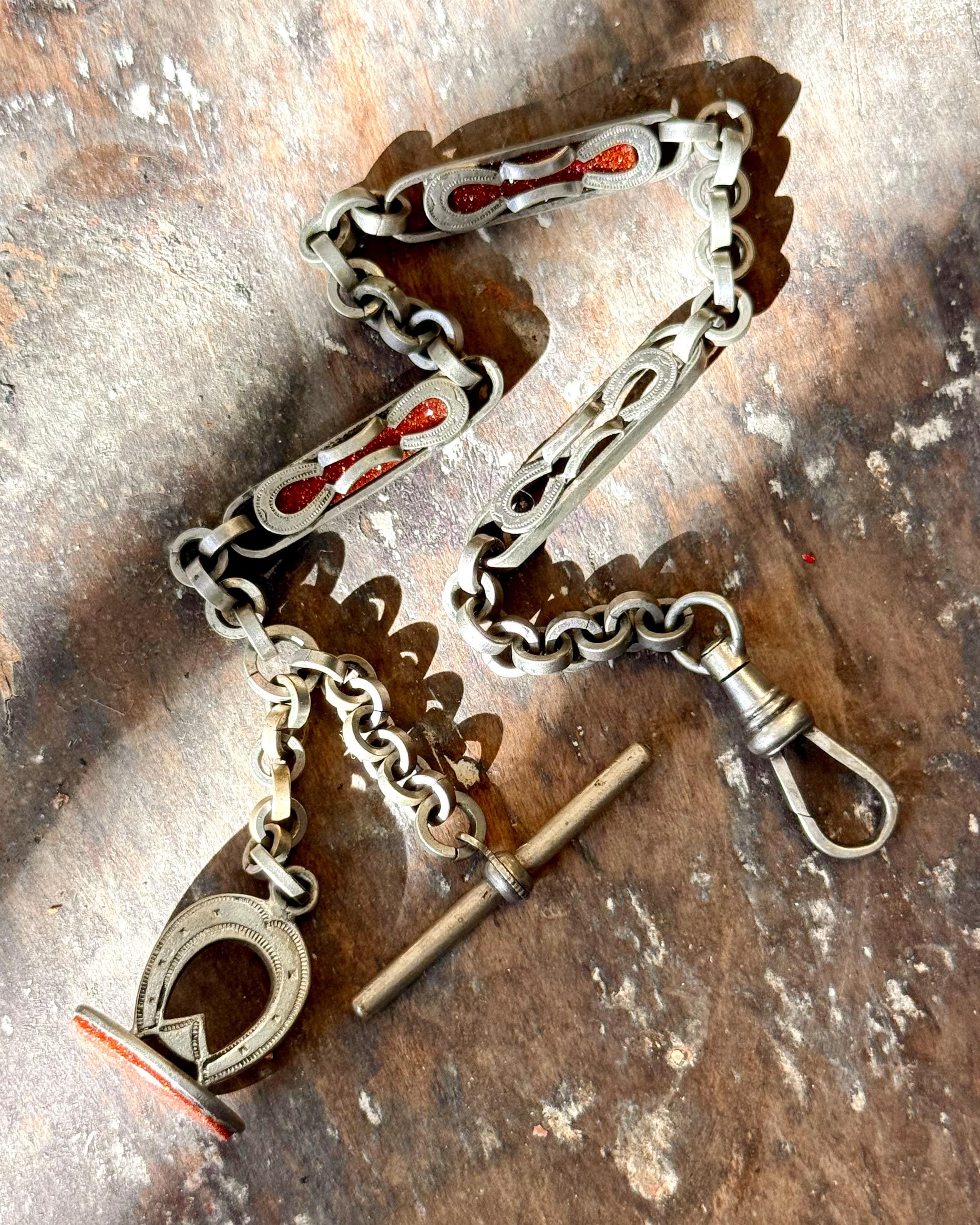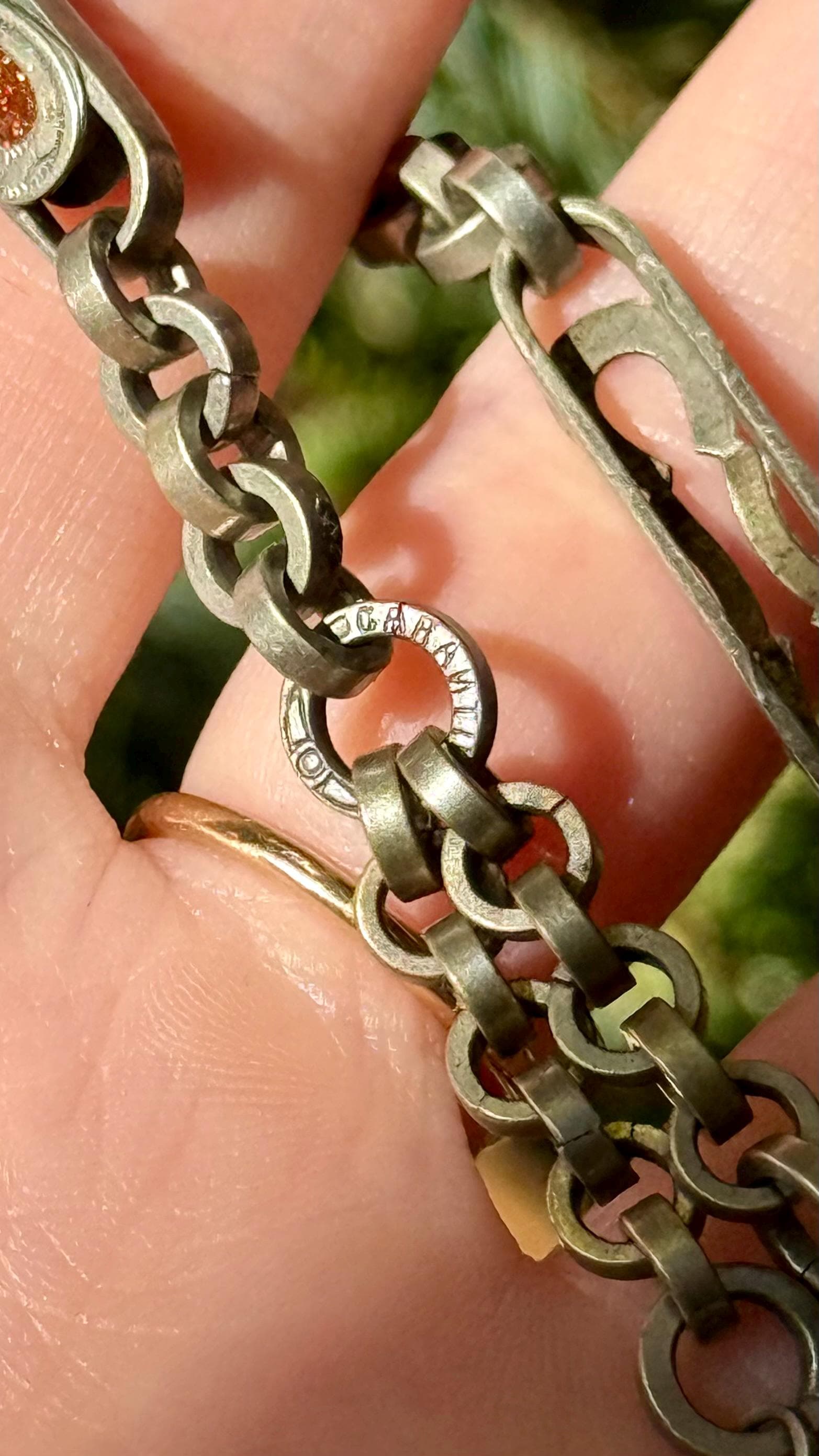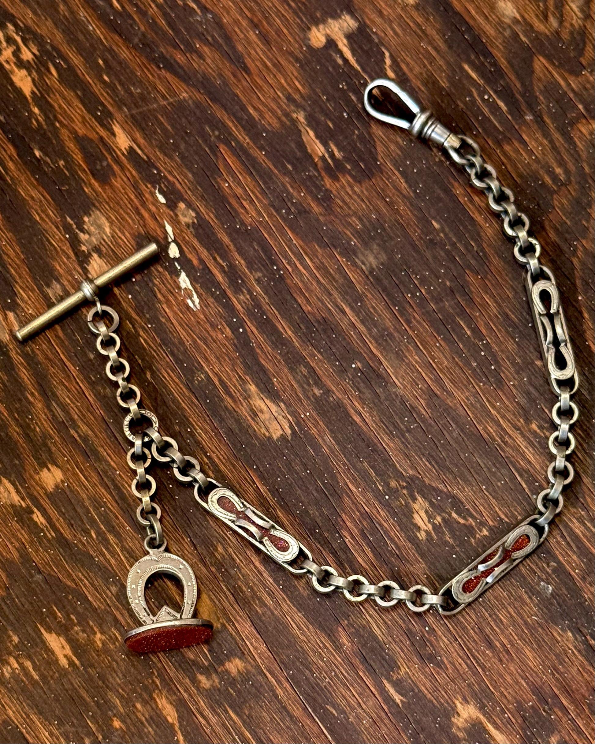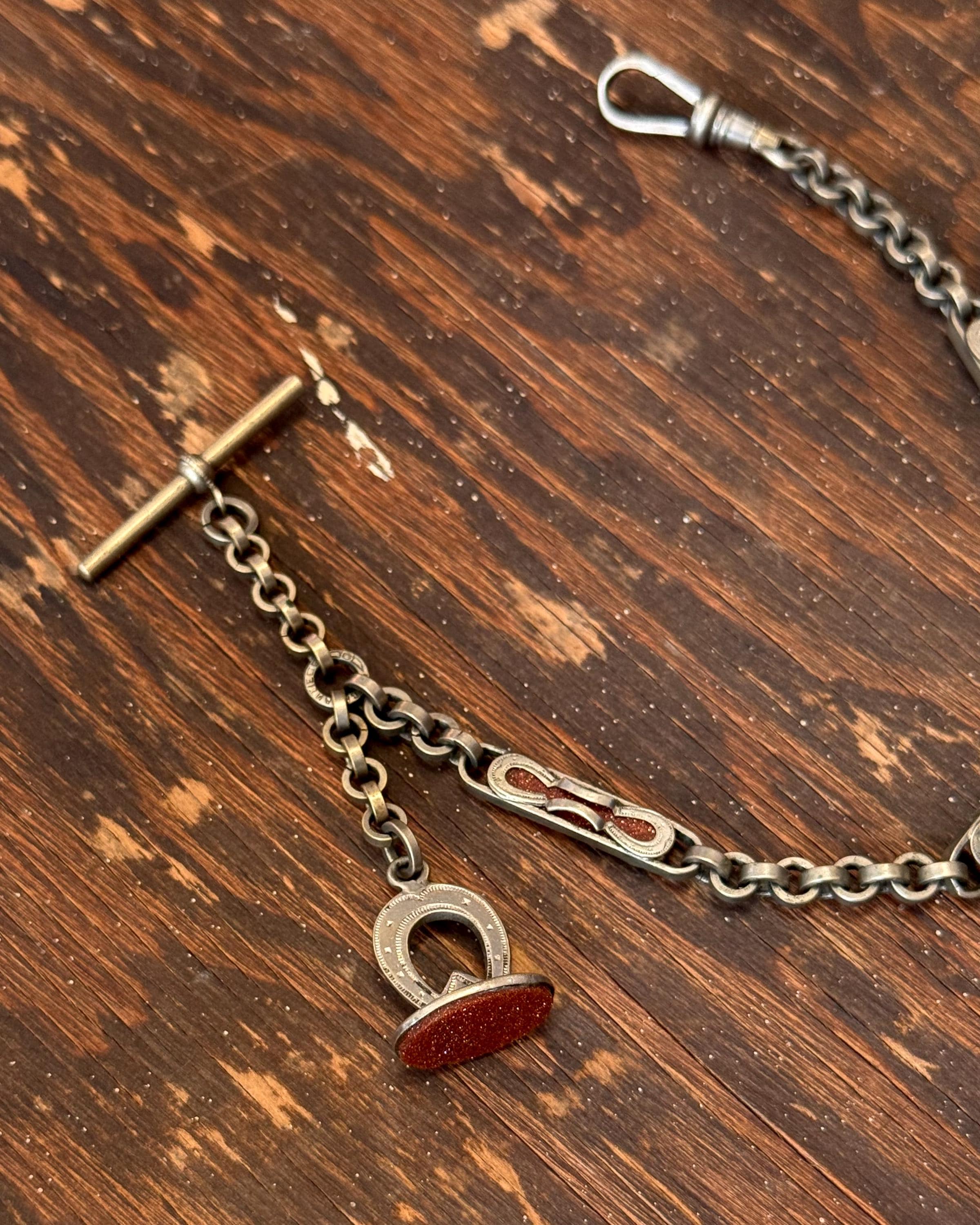 An authentic antique watch chain piece. features a beautiful lucky horseshoe fob, Albert T Bar, swivel dog clip, and unique chain links with horseshoe motifs and goldstone inlay. (goldstone is a manmade stone of glass and copper particles that glistens beautifully in light) . the entire piece is intricately crafted from “German Silver” (not real silver, a popular affordable alternative among silversmiths). European hallmarks are located on the dog clip and one of the round rings, the pictorial mark resembles a greyhound dog, likely French.