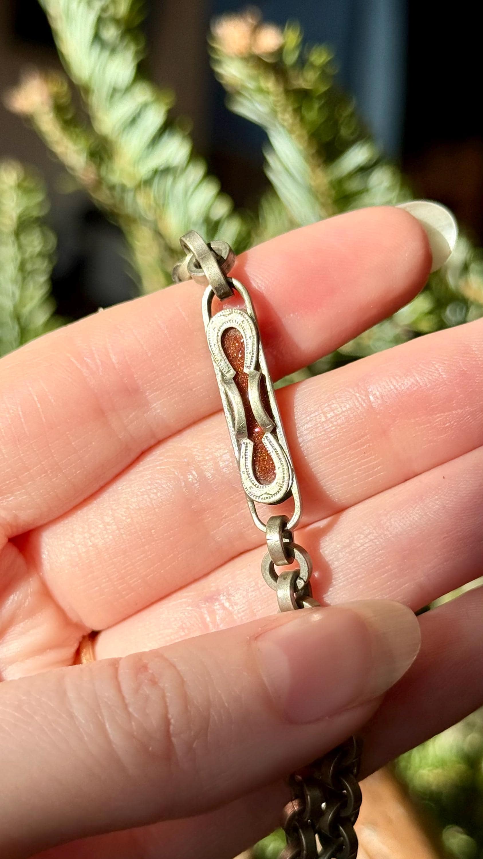 condition : great with subtle imperfections. appropriate signs of age as seen in photos including natural patina and tarnish, the middle horseshoe chain link is missing the matching horseshoe piece on the back side that would've encased the goldstone piece, and the third horseshoe chain link is missing the gold stone detail and the back side, however due to its age we would still considered this in appropriate condition as it is still a functional and wearable piece! clean and ready to wear!