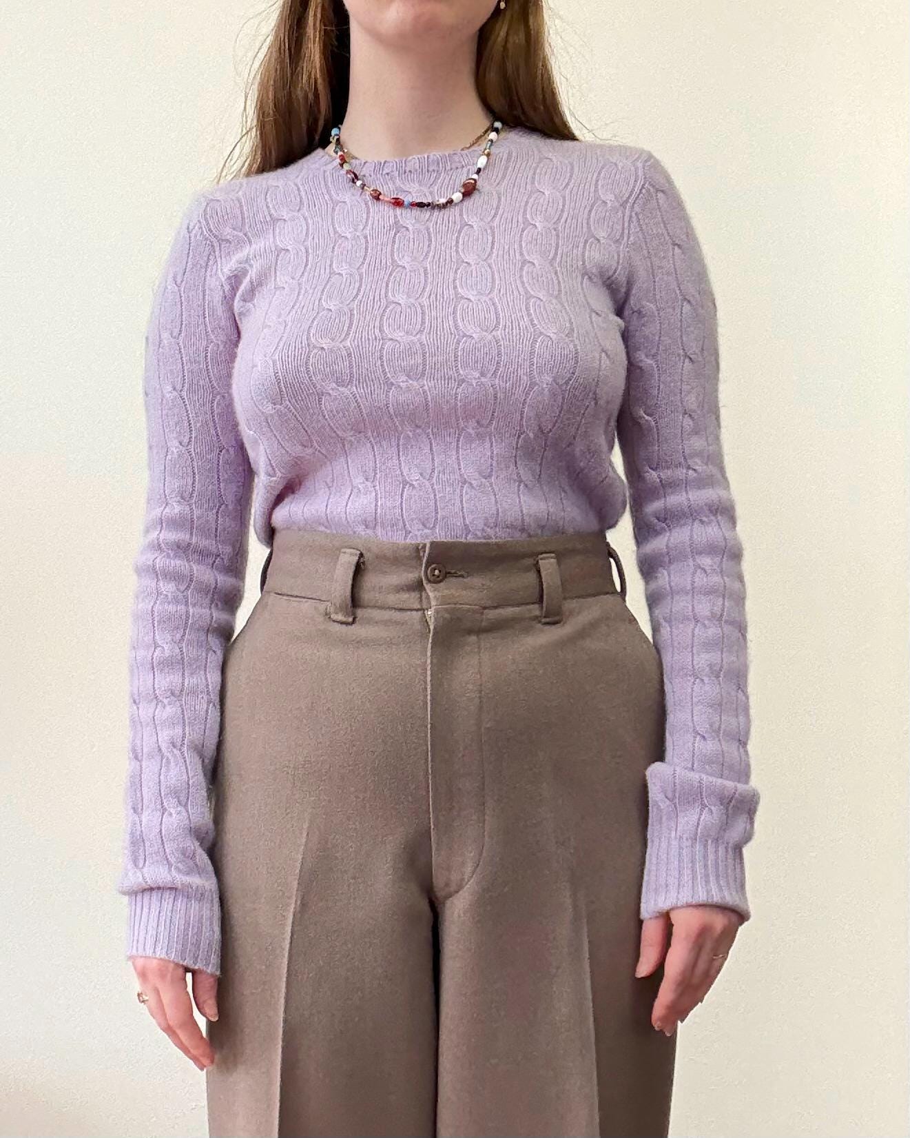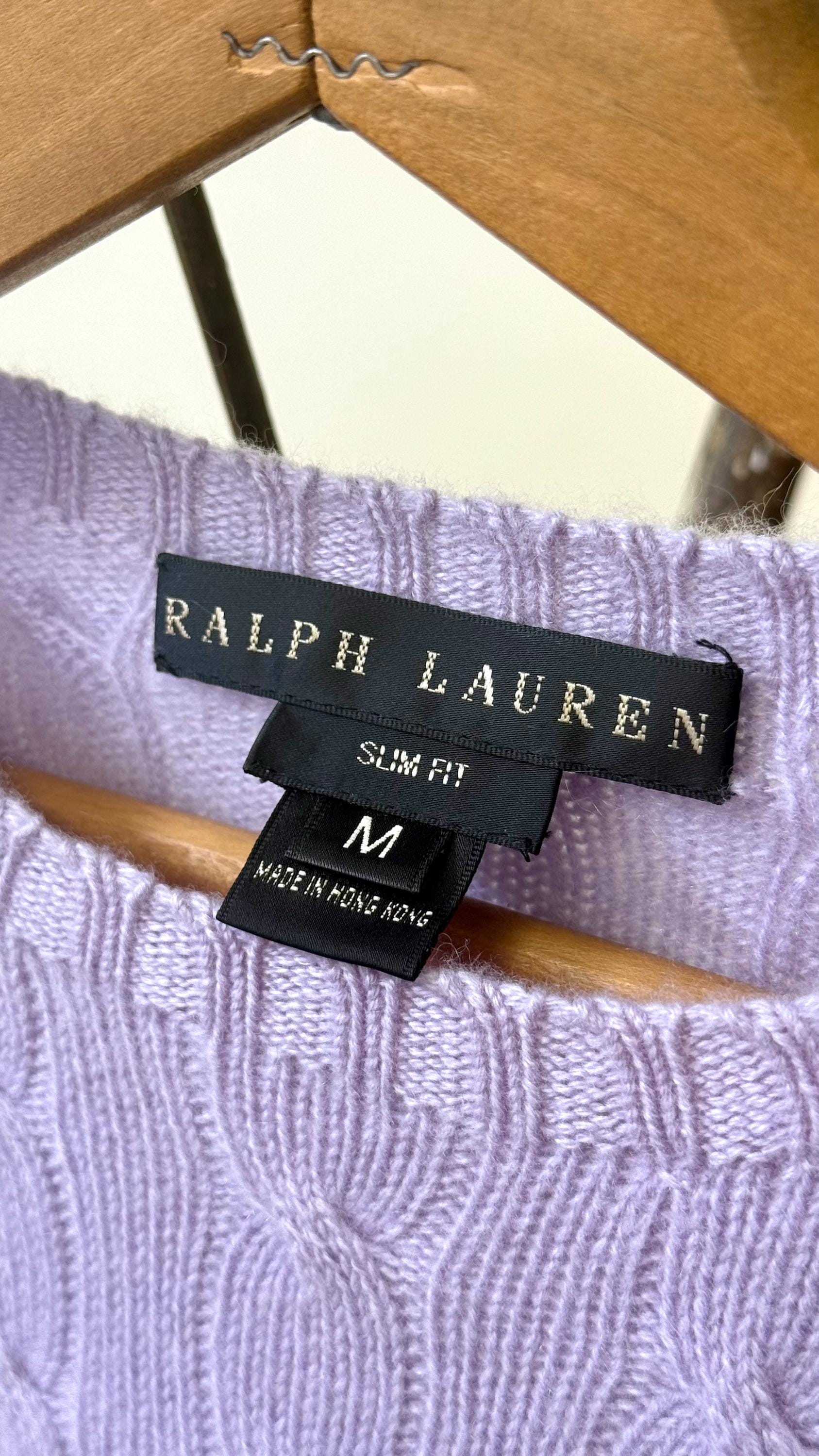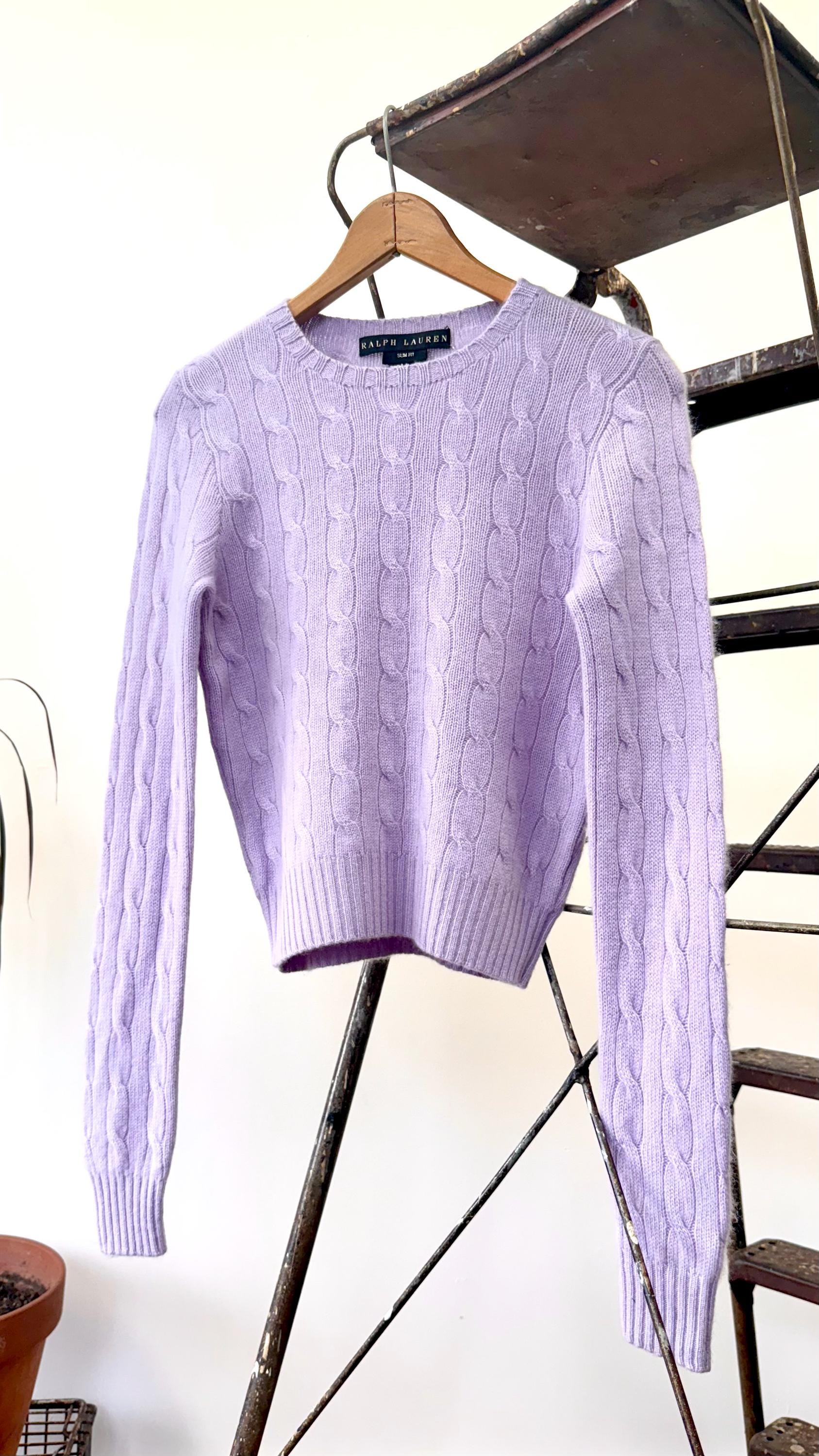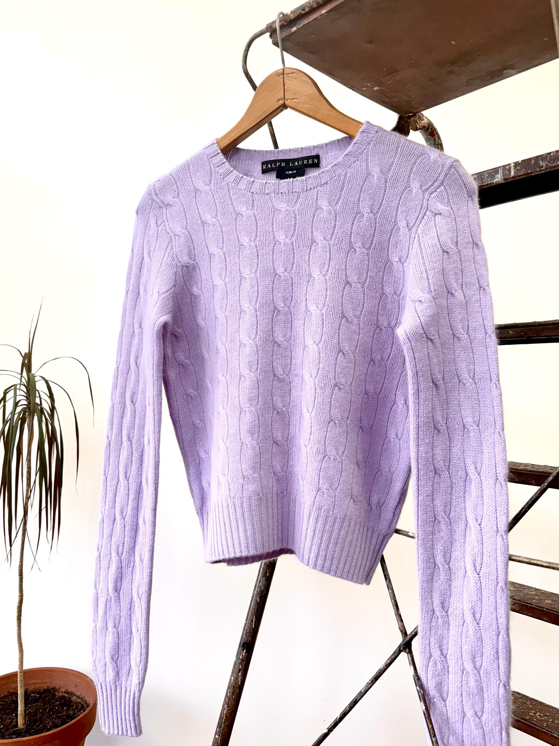 An authentic vintage Ralph Lauren black label sweater. a luxurious ultra soft cashmere in a lovely pastel hue and classic cable knit pattern. its is a lightweight knit that makes a great layering piece. features a preppy “slim fit” that it semi fitted in the body with longer arms and a feminine crew neckline.