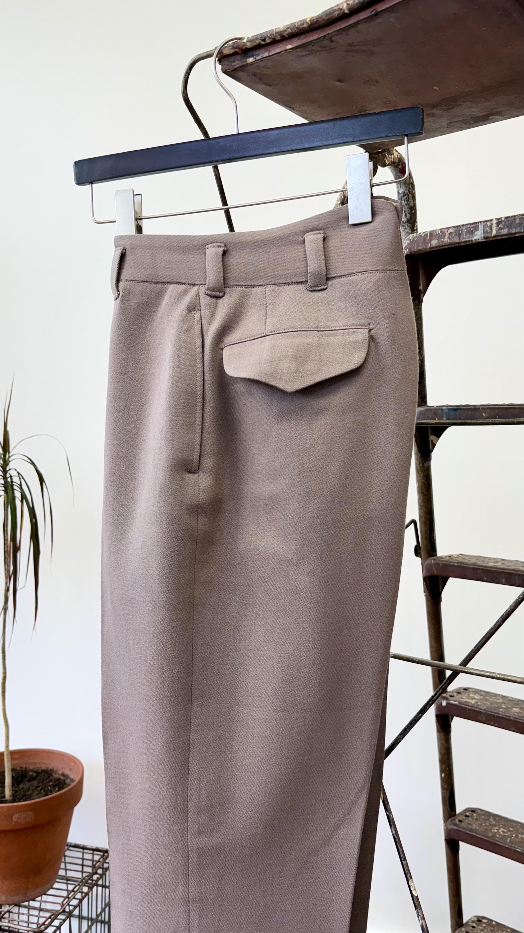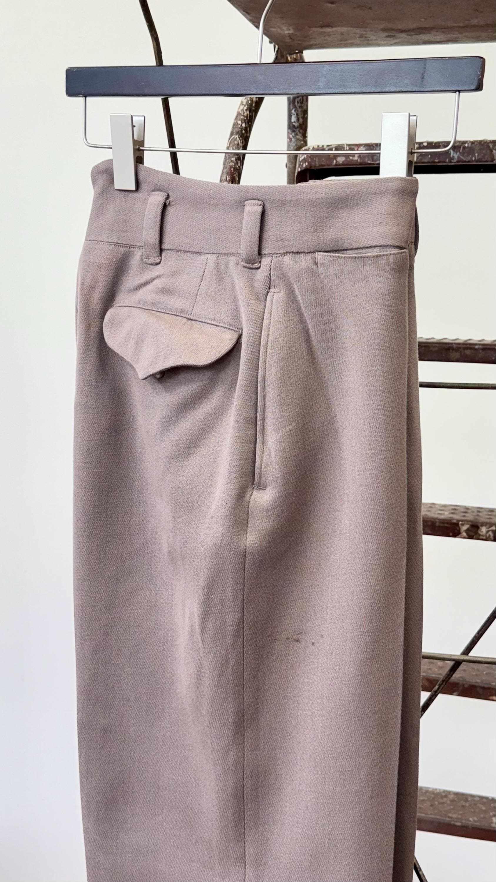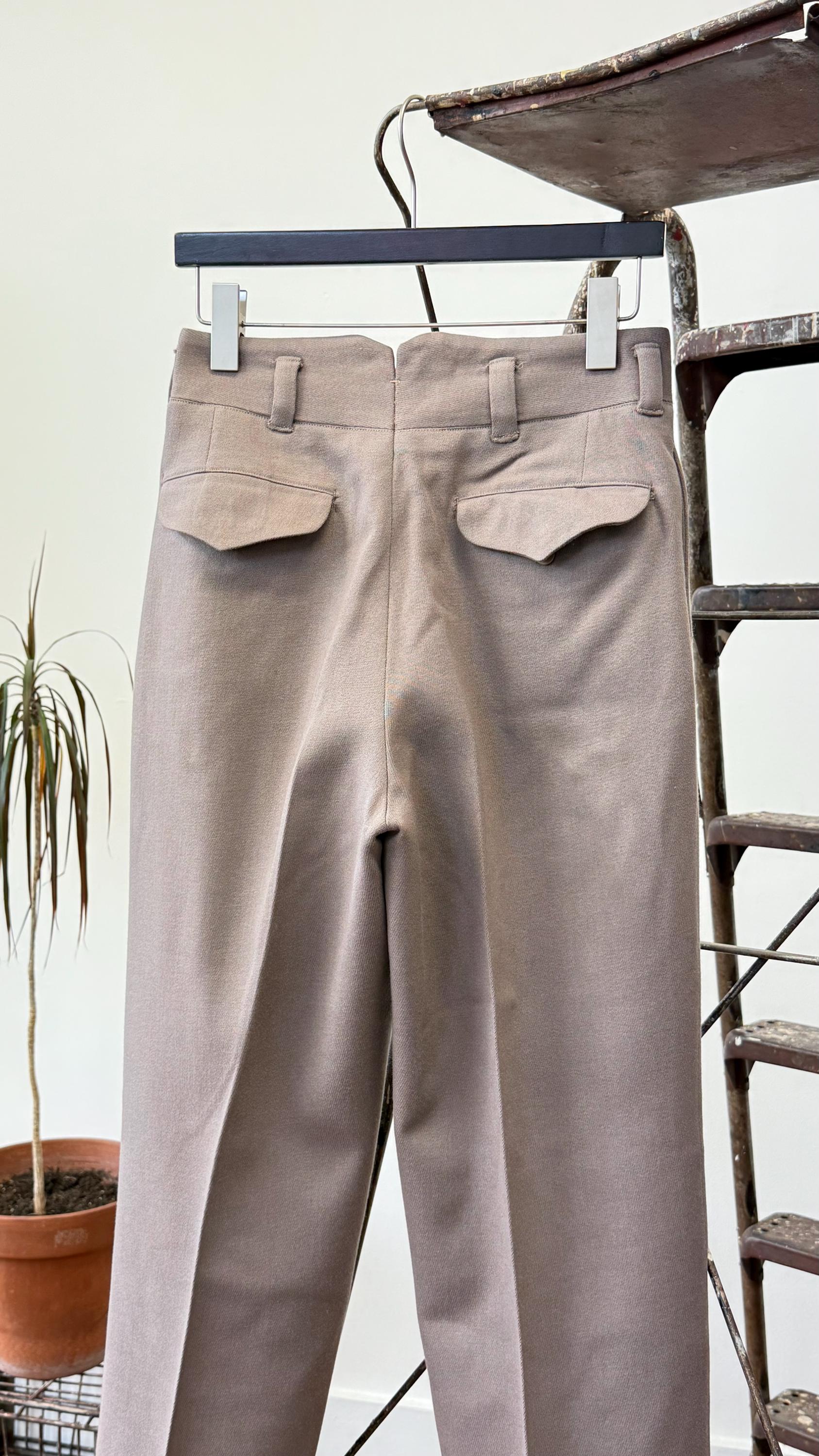 An authentic vintage menswear trouser. features a high rise fit with a creased wide straight leg, thick waistband, and flap back pockets. made from a heavyweight whipcord fabric to provide structure to the shape of these awesome pants! fastens with a zipper fly and button. custom identification patch located on the coin pocket interior, dated 1951. due to its unique cut, makes a great gender neutral fit!