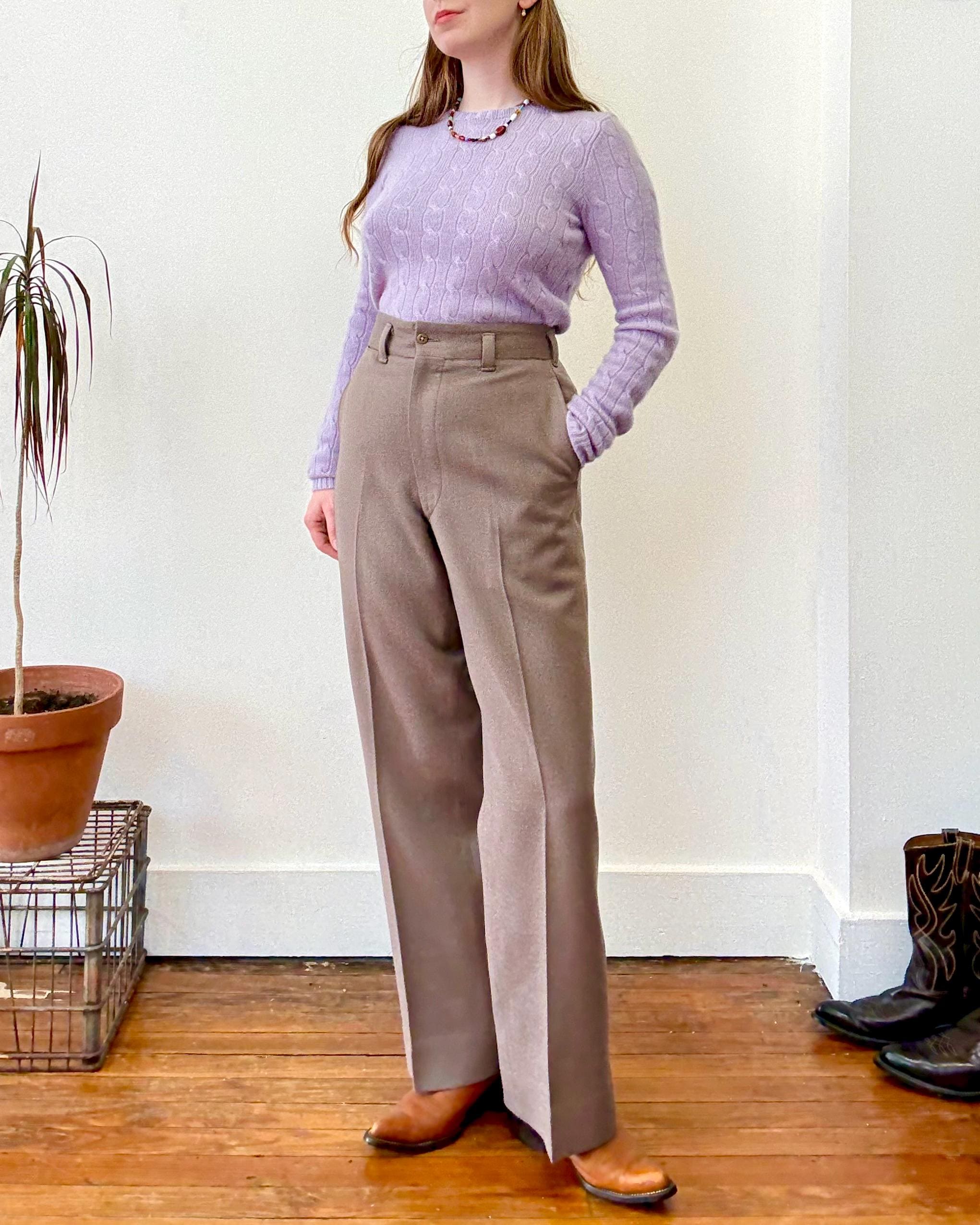 An authentic vintage menswear trouser. features a high rise fit with a creased wide straight leg, thick waistband, and flap back pockets. made from a heavyweight whipcord fabric to provide structure to the shape of these awesome pants! fastens with a zipper fly and button. custom identification patch located on the coin pocket interior, dated 1951. despite shown on female model, they are actually designed as mens trousers.. so due to its unique cut, makes a great gender neutral fit for anyone!