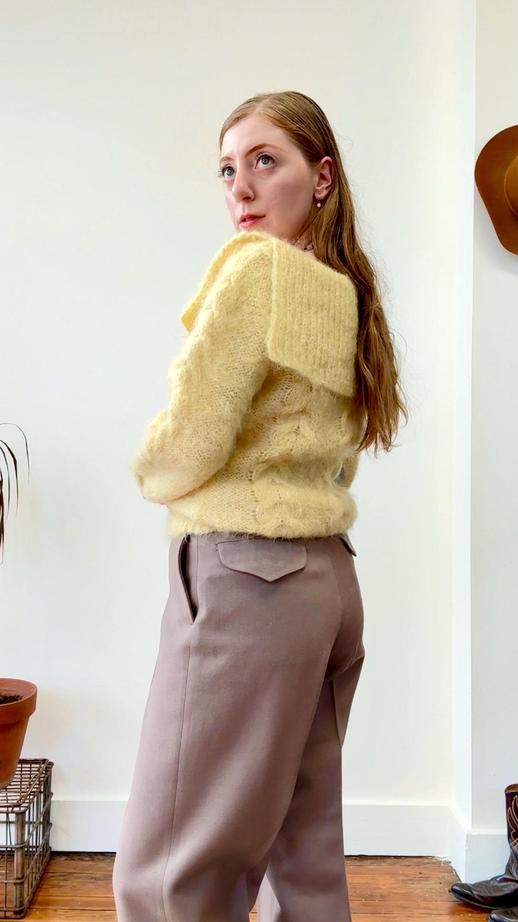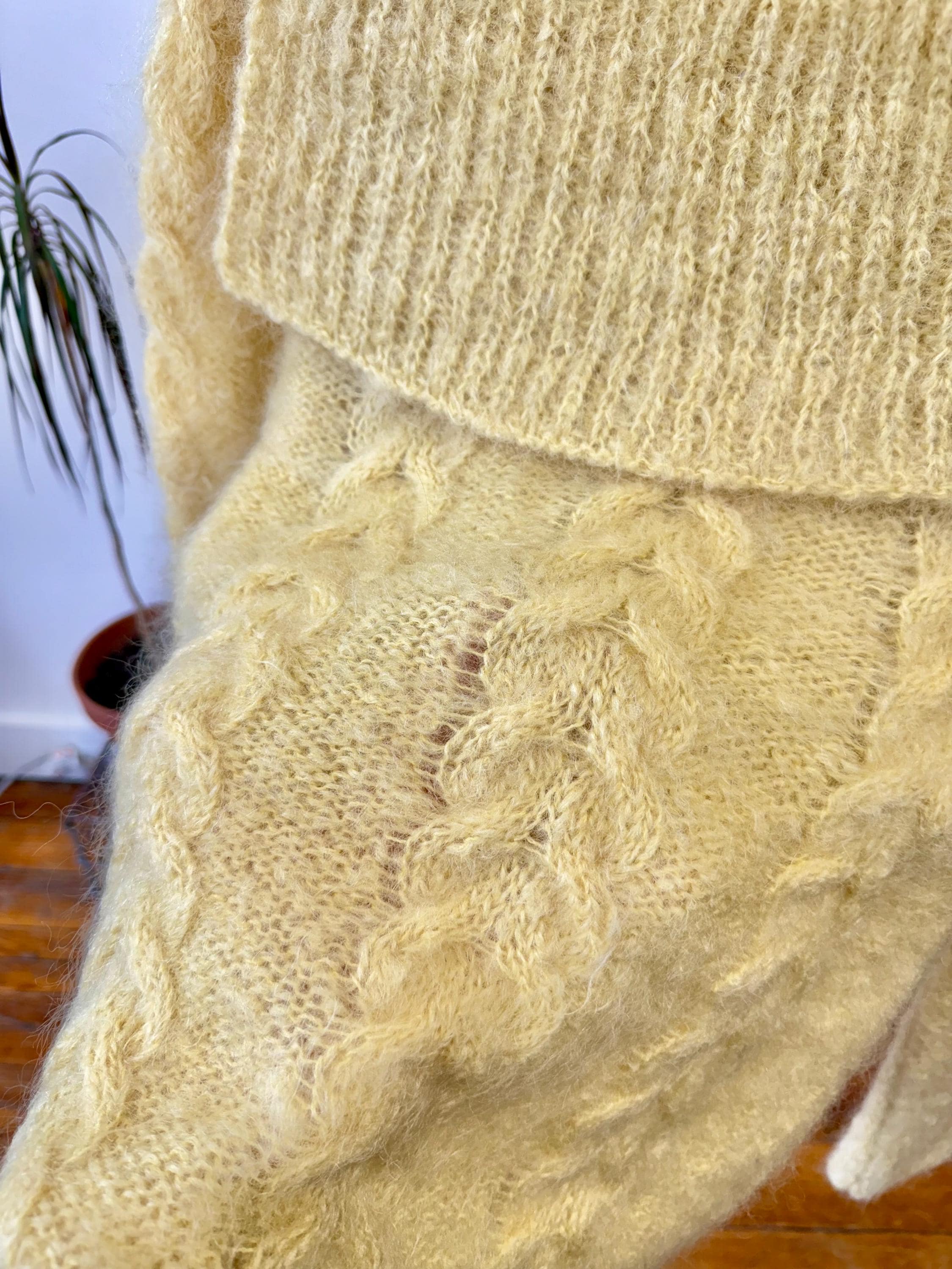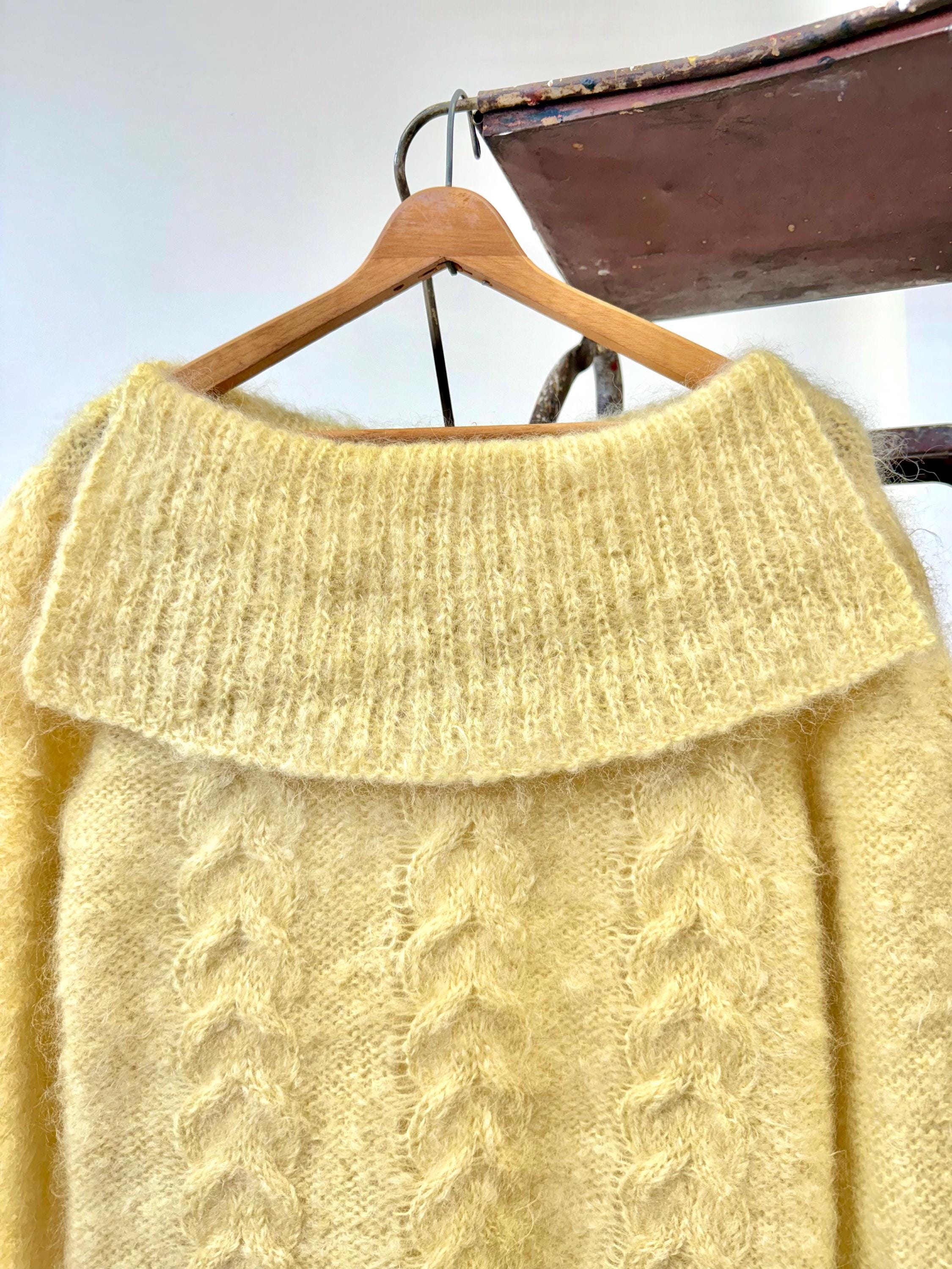 An authentic vintage sweater. hand knit from a heavily textured mohair or highland wool yarn in a soft butter hue. features a double sided bib or sailor style collar on a boat neckline.
