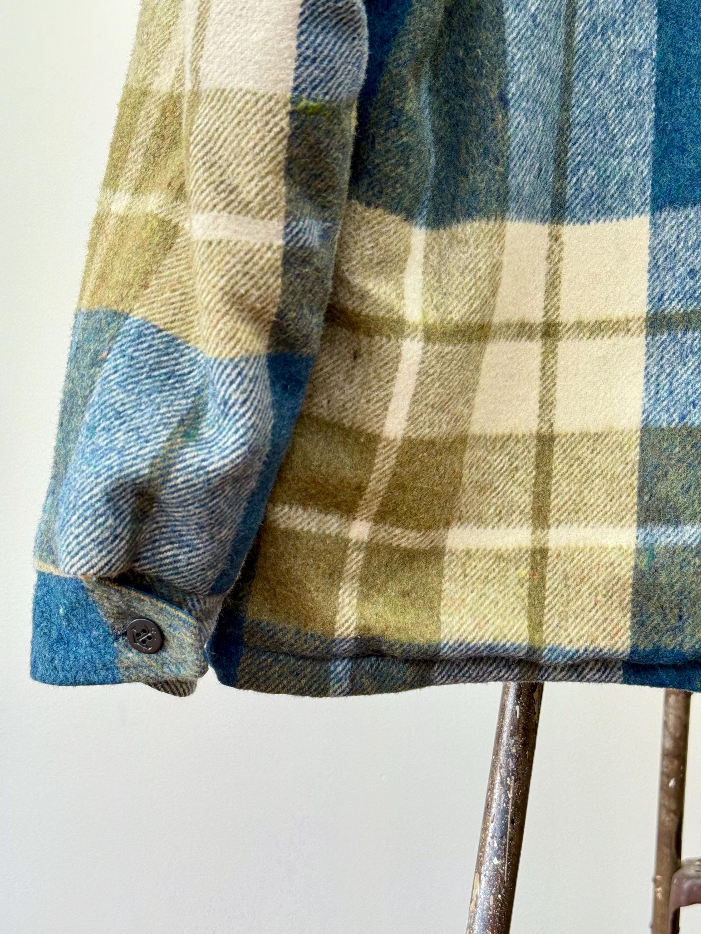 An authentic vintage flannel shirt jacket. a classic “CPO” style with fleece body lining and quilted inner sleeves. a heavyweight woven plaid with great color and softer texture. mismatched buttons. a great layering piece for cold weather.