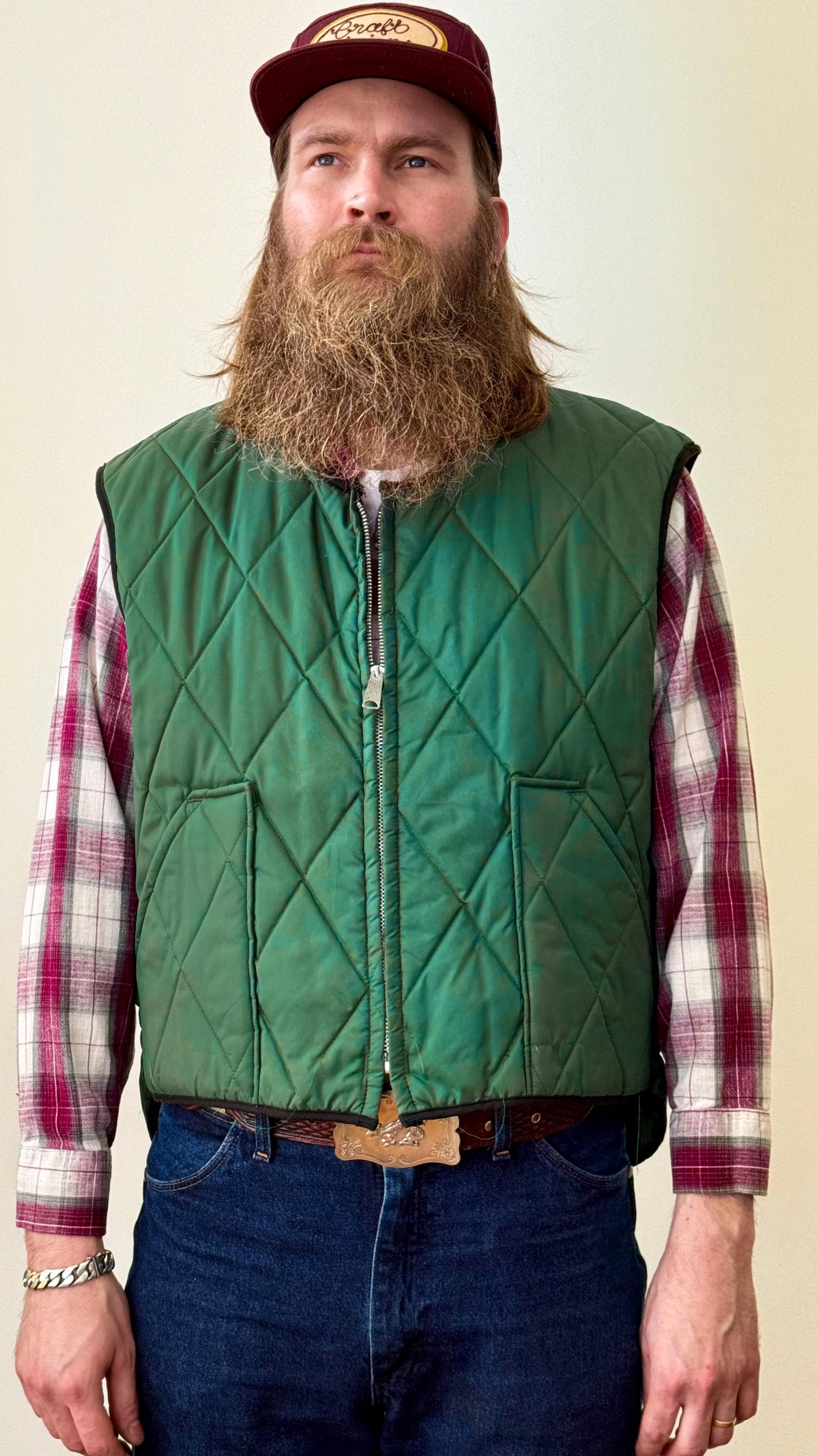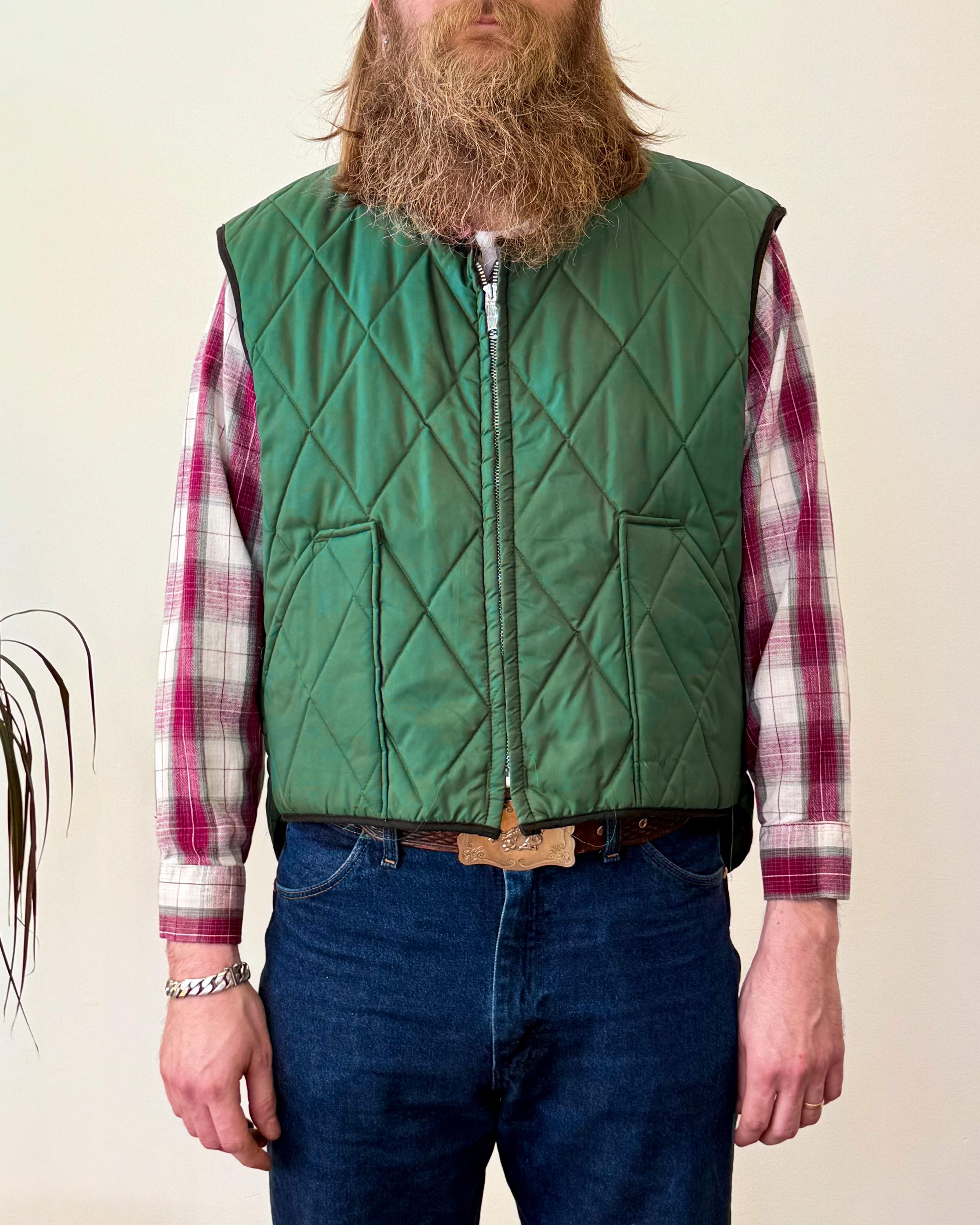 An authentic vintage quilted vest by Lee Outerwear label. a utilitarian workwear style design that is lightweight yet effective. fastens with a heavy duty metal zipper and includes waist pockets. a great layering piece to add extra insulation under jackets and coats in colder weather. made in USA