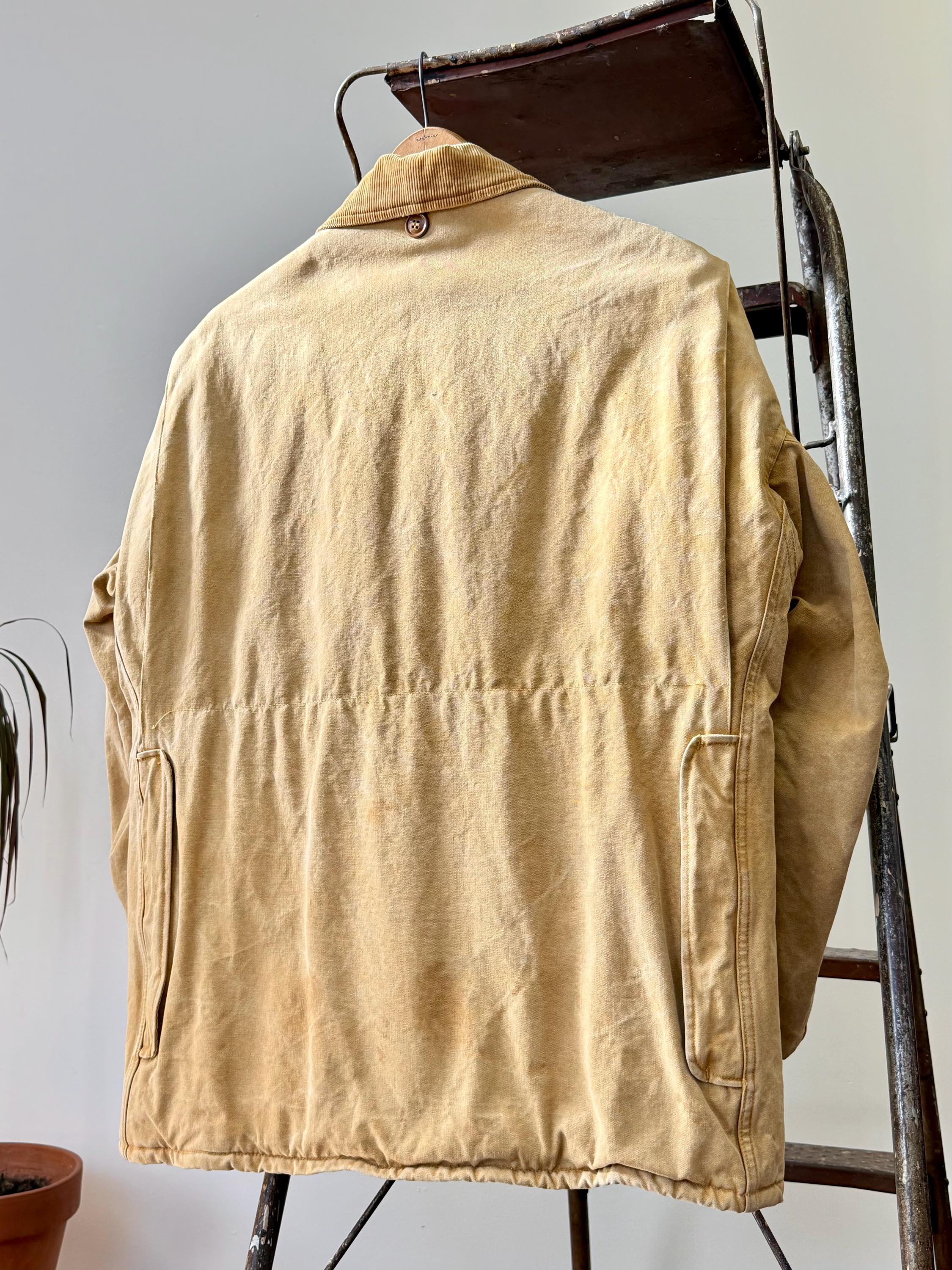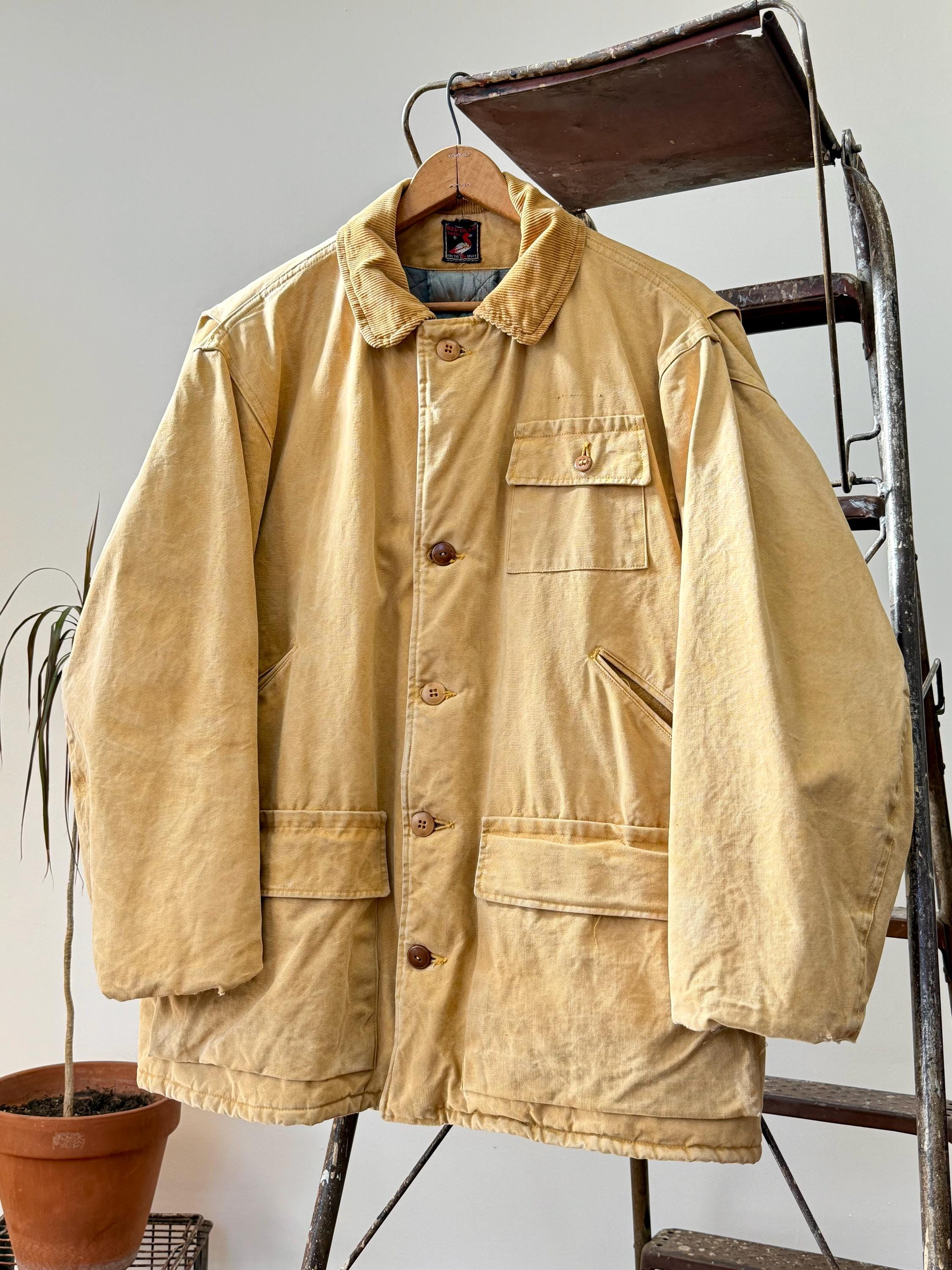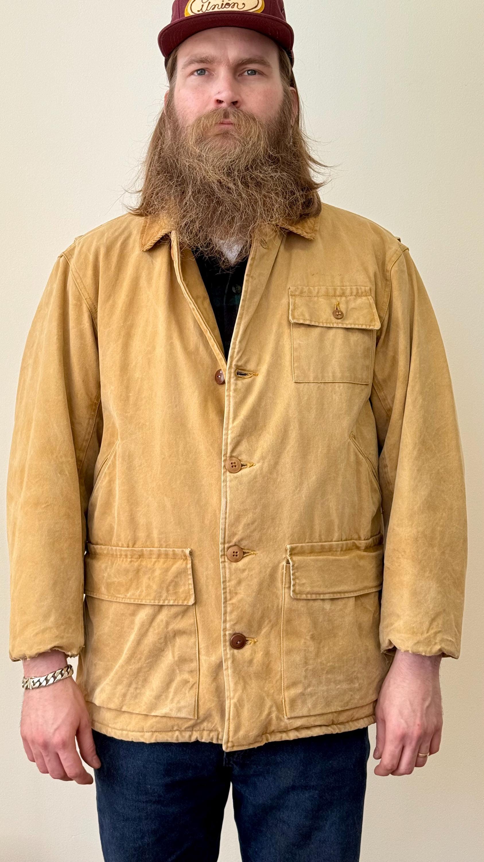 An authentic vintage hunting barn jacket by Red Head brand. designed for rugged outdoor activities. well worn with naturally distressed details and patina. insulated quilted satin lining. vegetable ivory button front fasteners. exterior pockets and back game pouch. made in USA