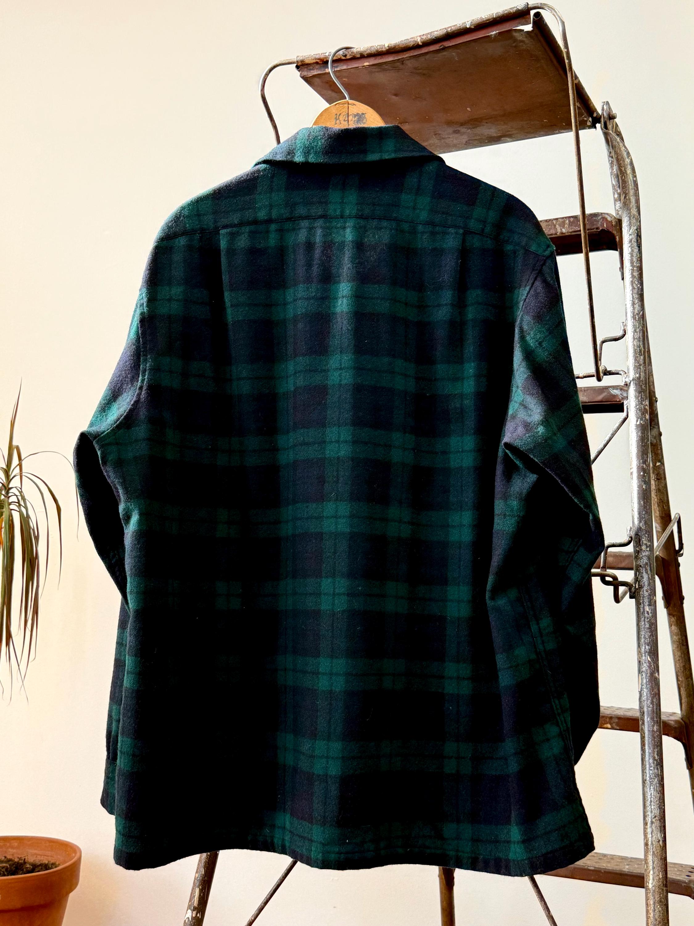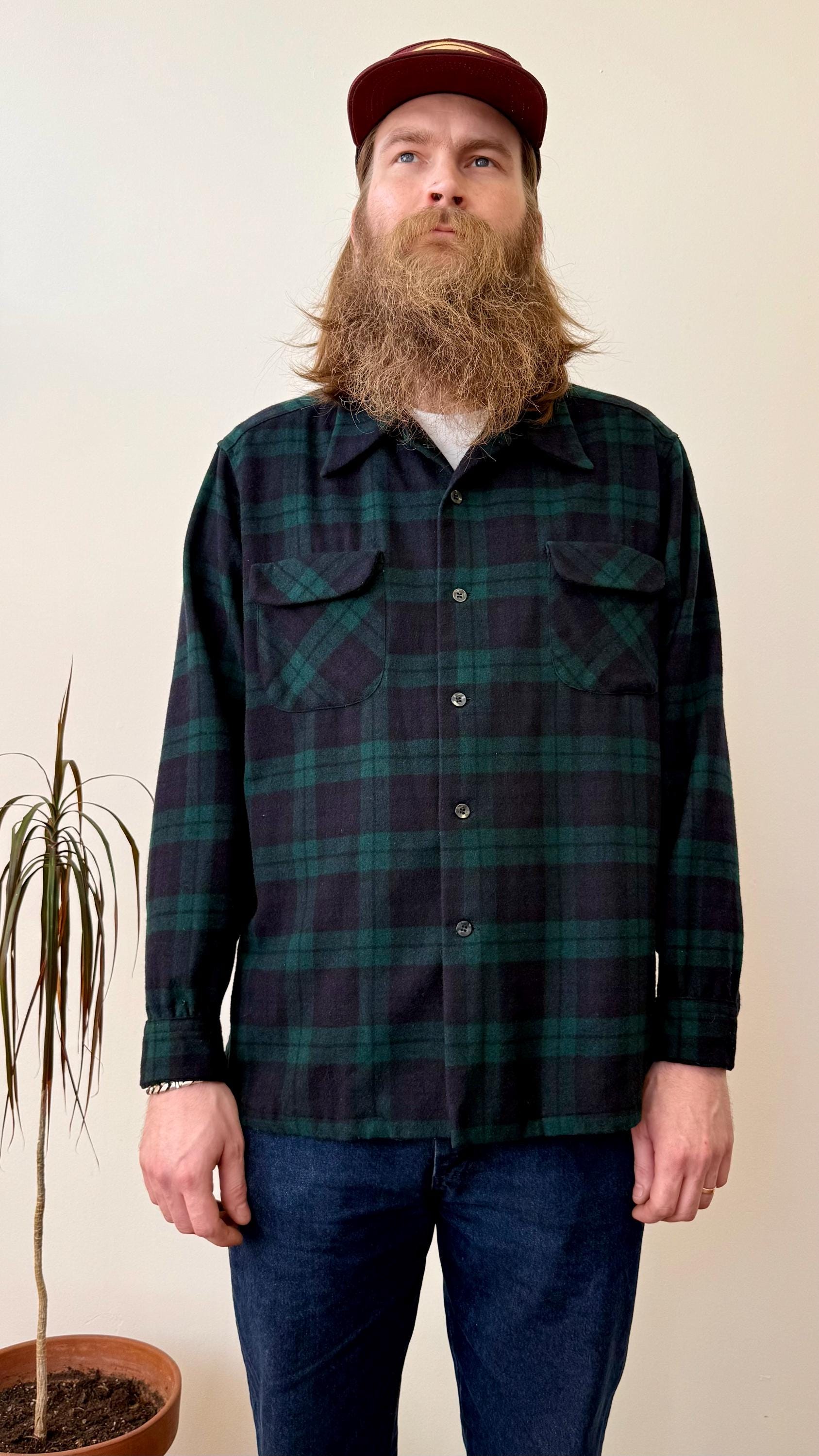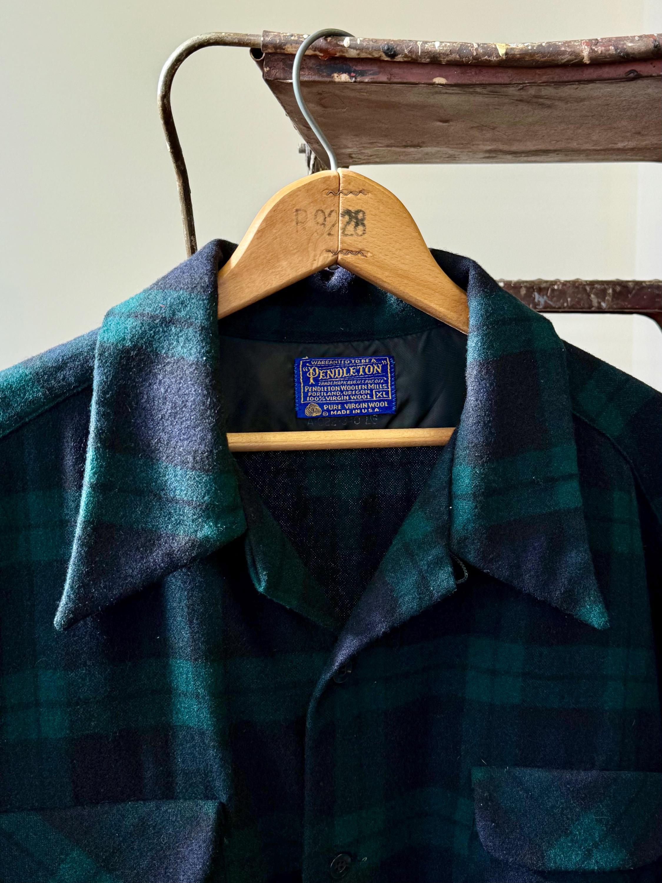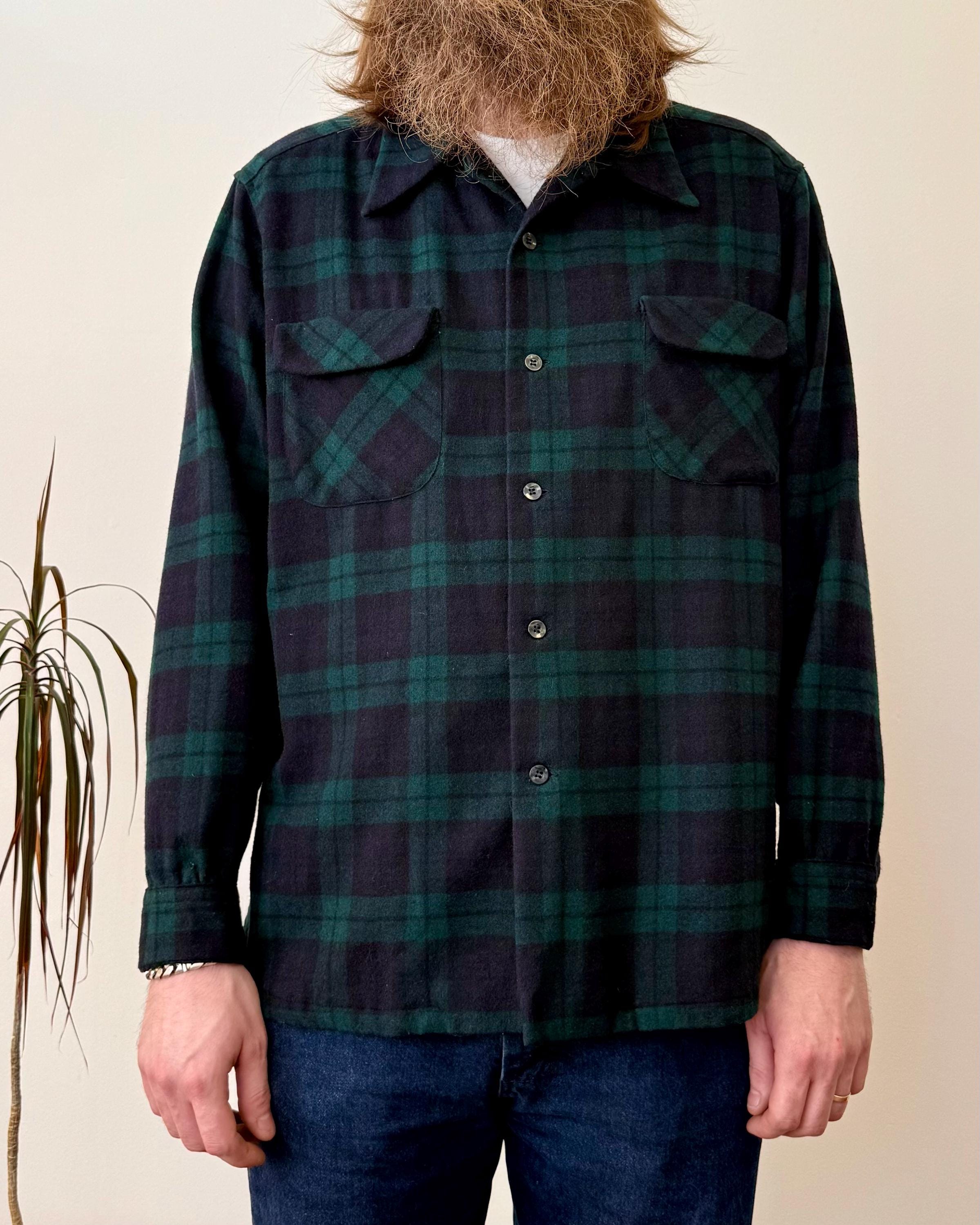 An authentic vintage camp loop collar long sleeve shirt by Pendleton. a classic board shirt style with flap pockets. features a wide crop fit. a luxurious woven tartan fabric. made in USA