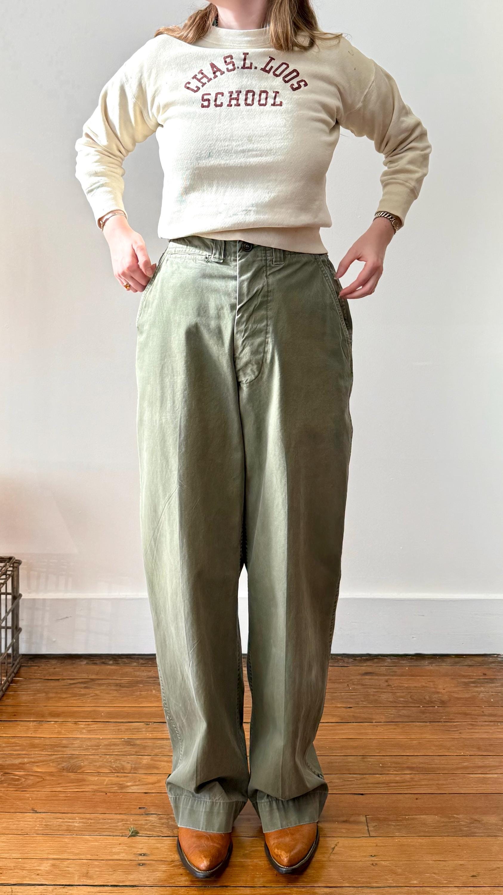 An authentic vintage pair WWII 1940s M-43 OD Cotton Field trousers. adjustable buttons tabs at back of waist and leg opening. button fly. durable cotton sateen fabric. a loose straight fit with a higher rise makes for a great gender neutral style!