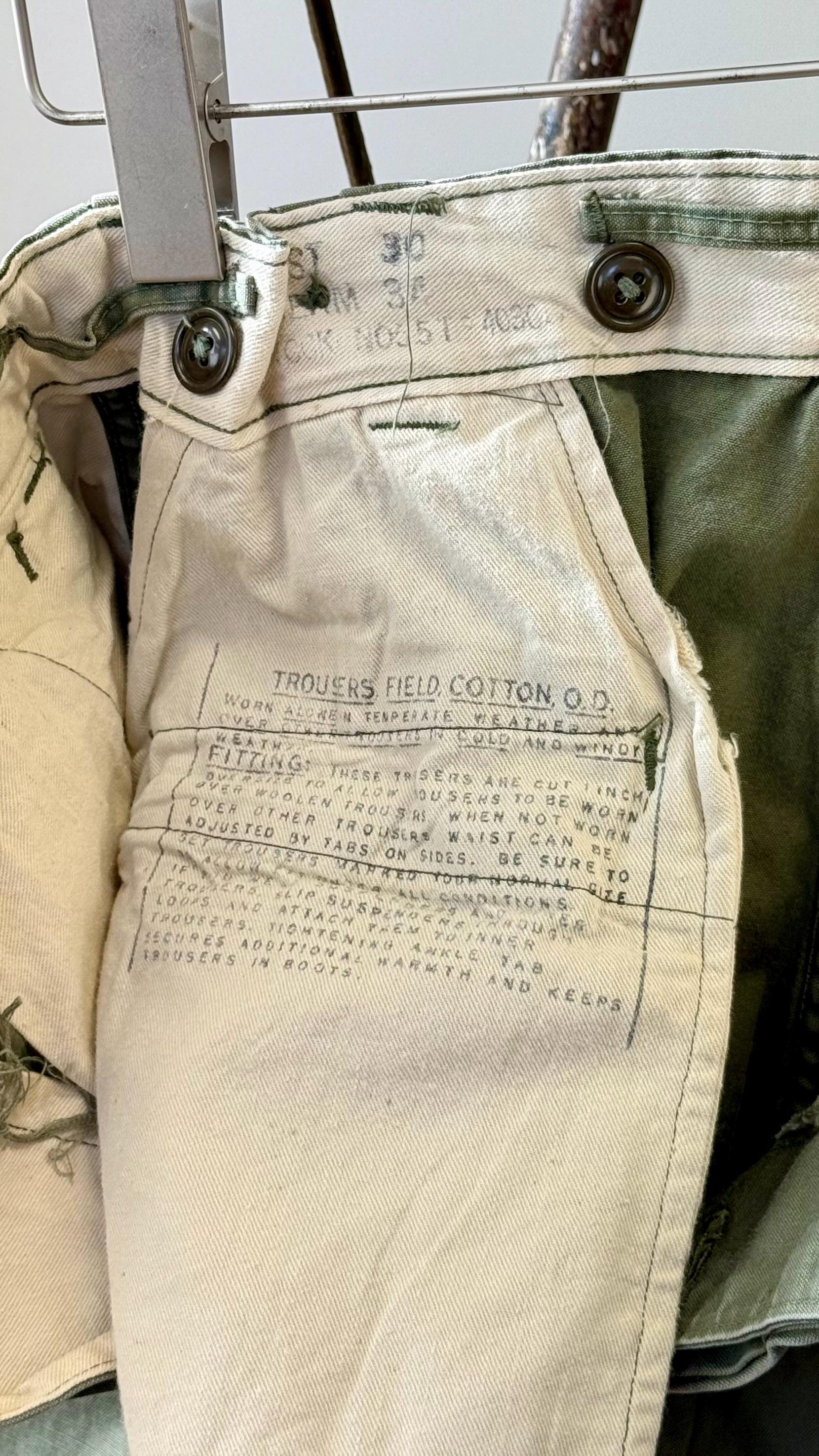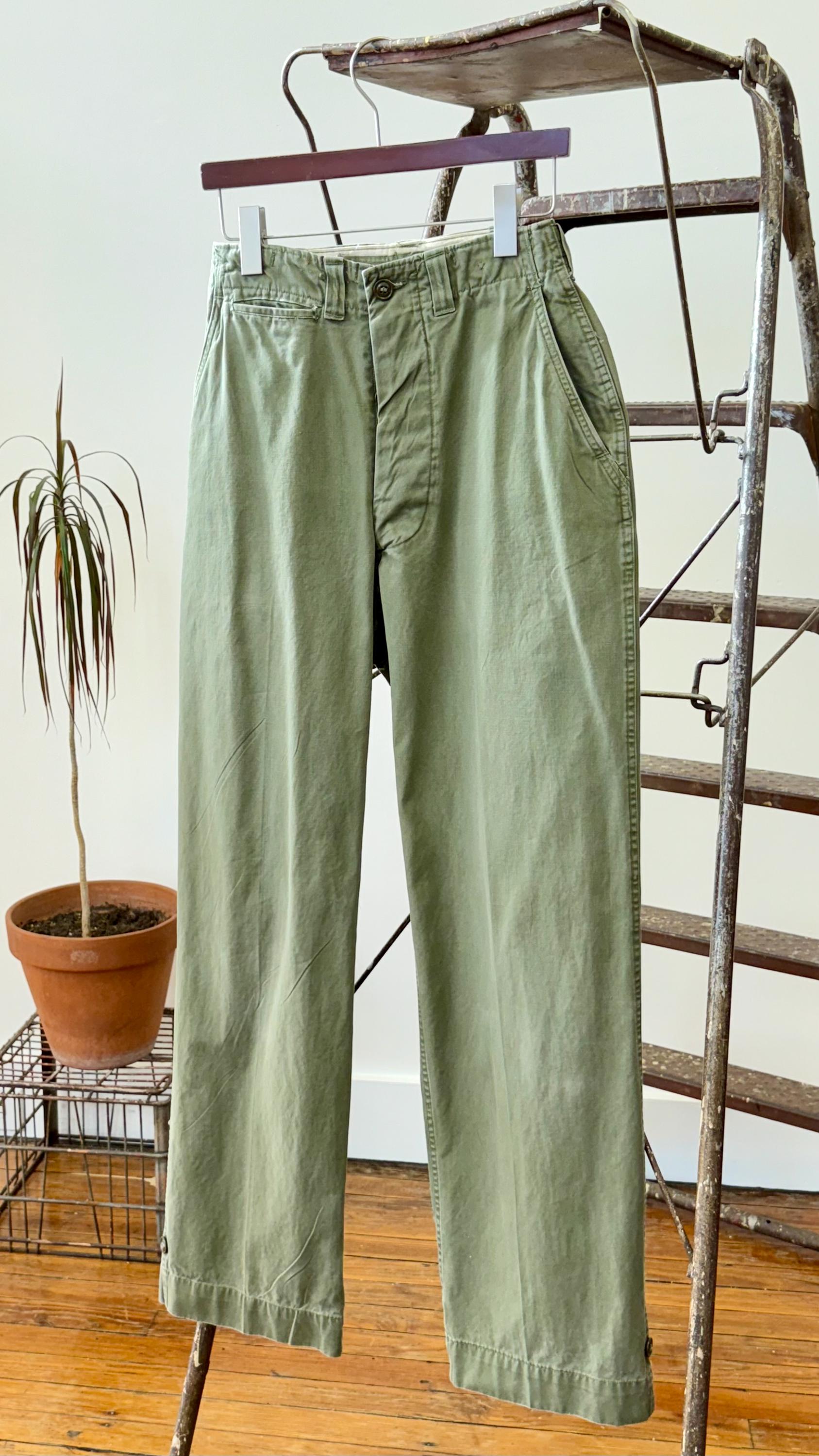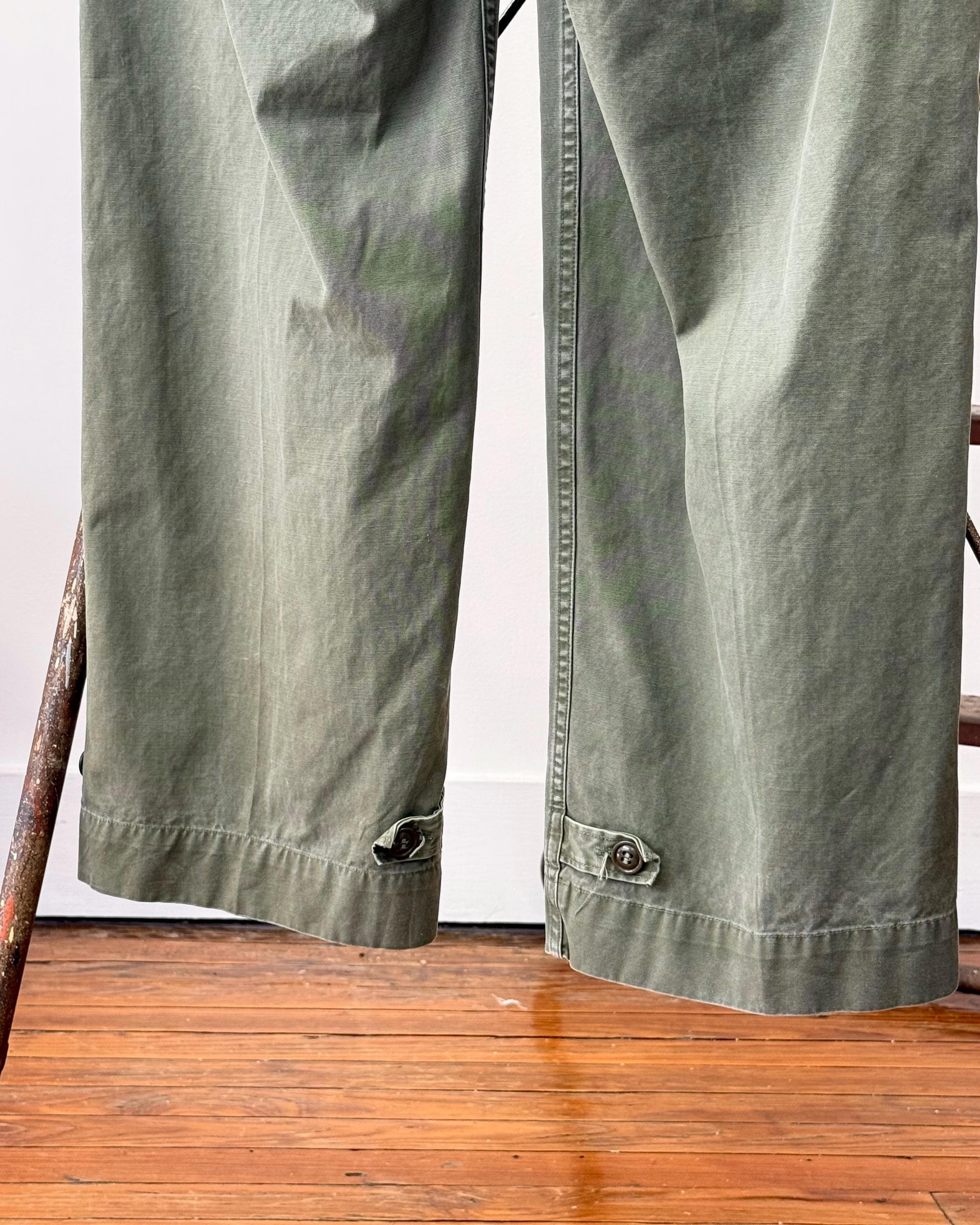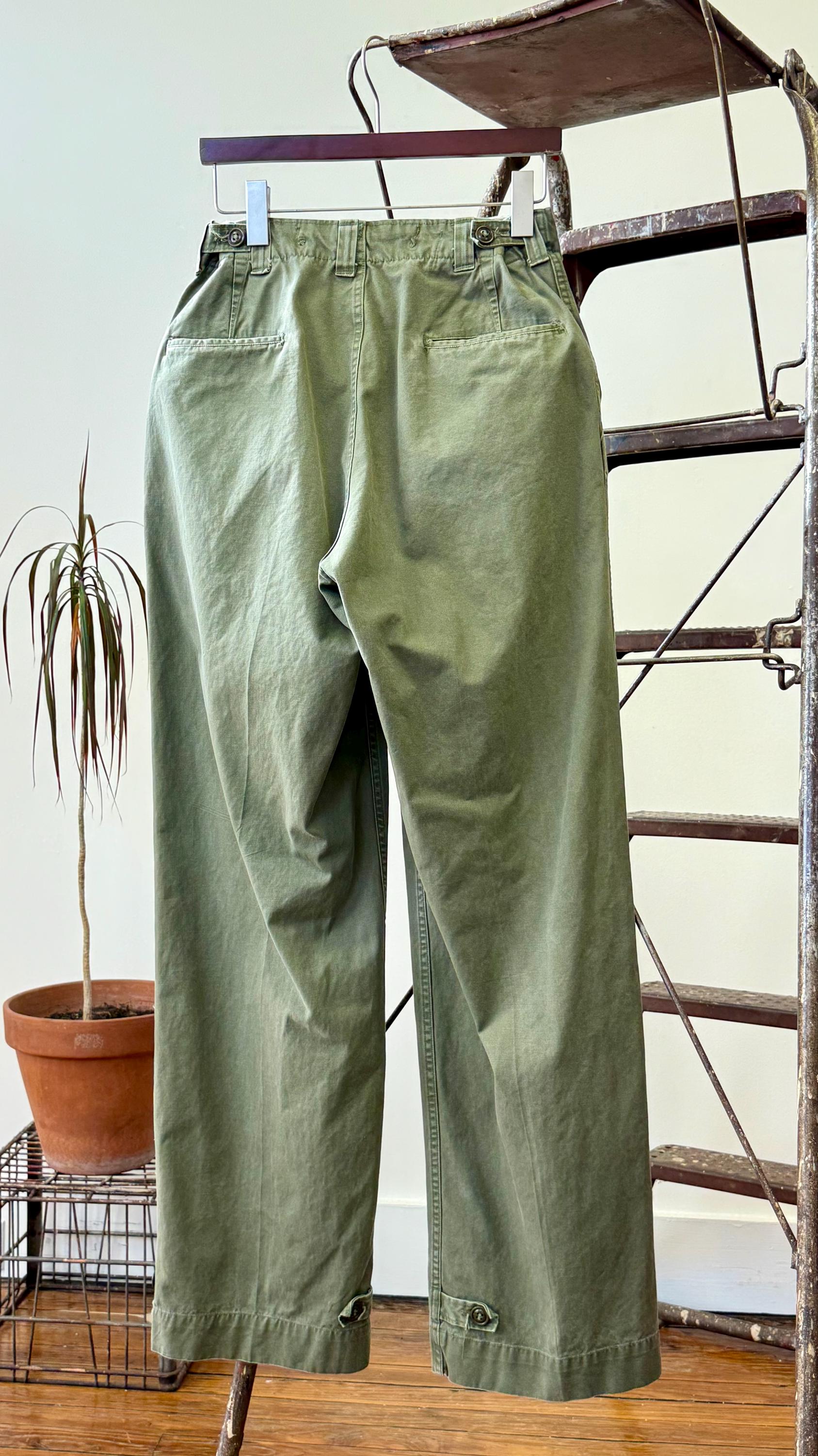 An authentic vintage pair WWII 1940s M-43 OD Cotton Field trousers. adjustable buttons tabs at waist and leg opening. button fly. durable cotton sateen fabric. a loose straight fit with a higher rise makes for a great gender neutral style!