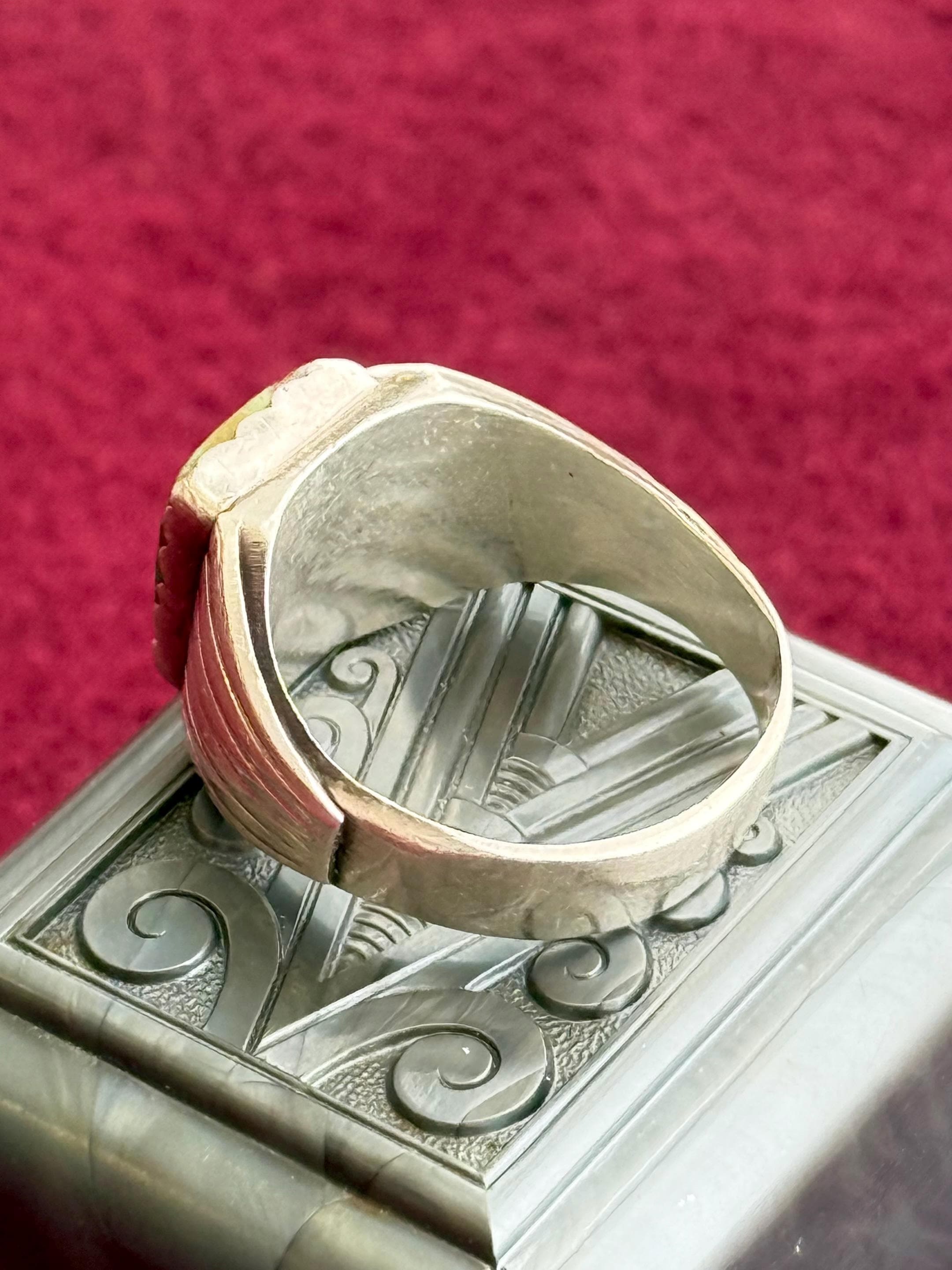 condition : great! appropriate signs of age as seen in photos including natural patina and tarnish, back of band shows a faint soldering seam from previously being resized. clean and ready to wear!