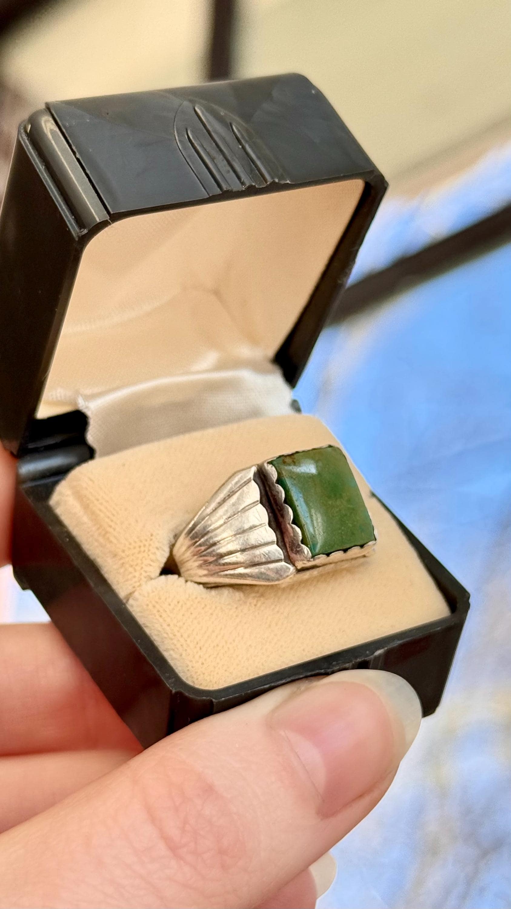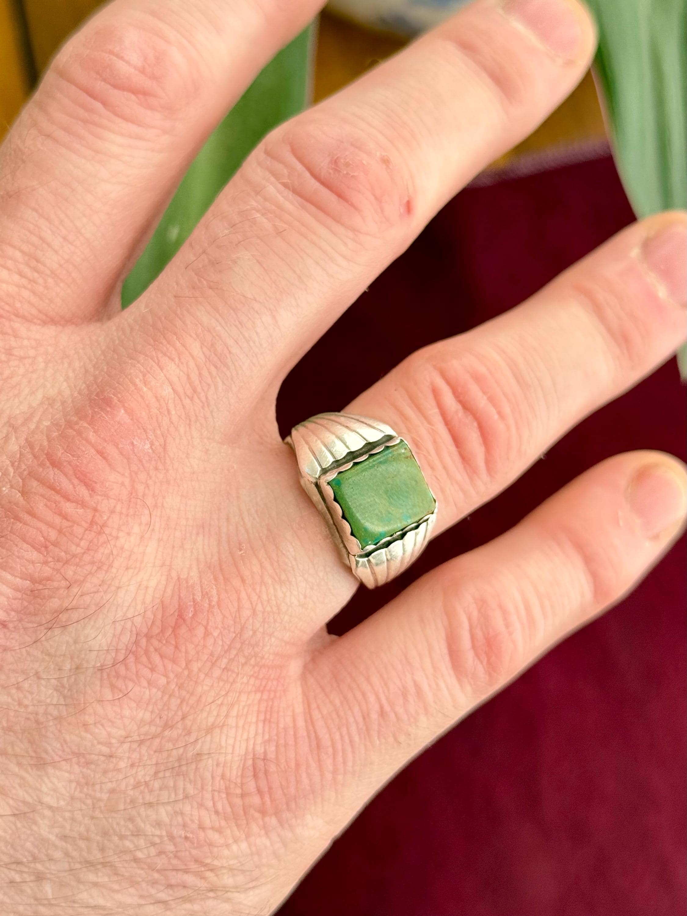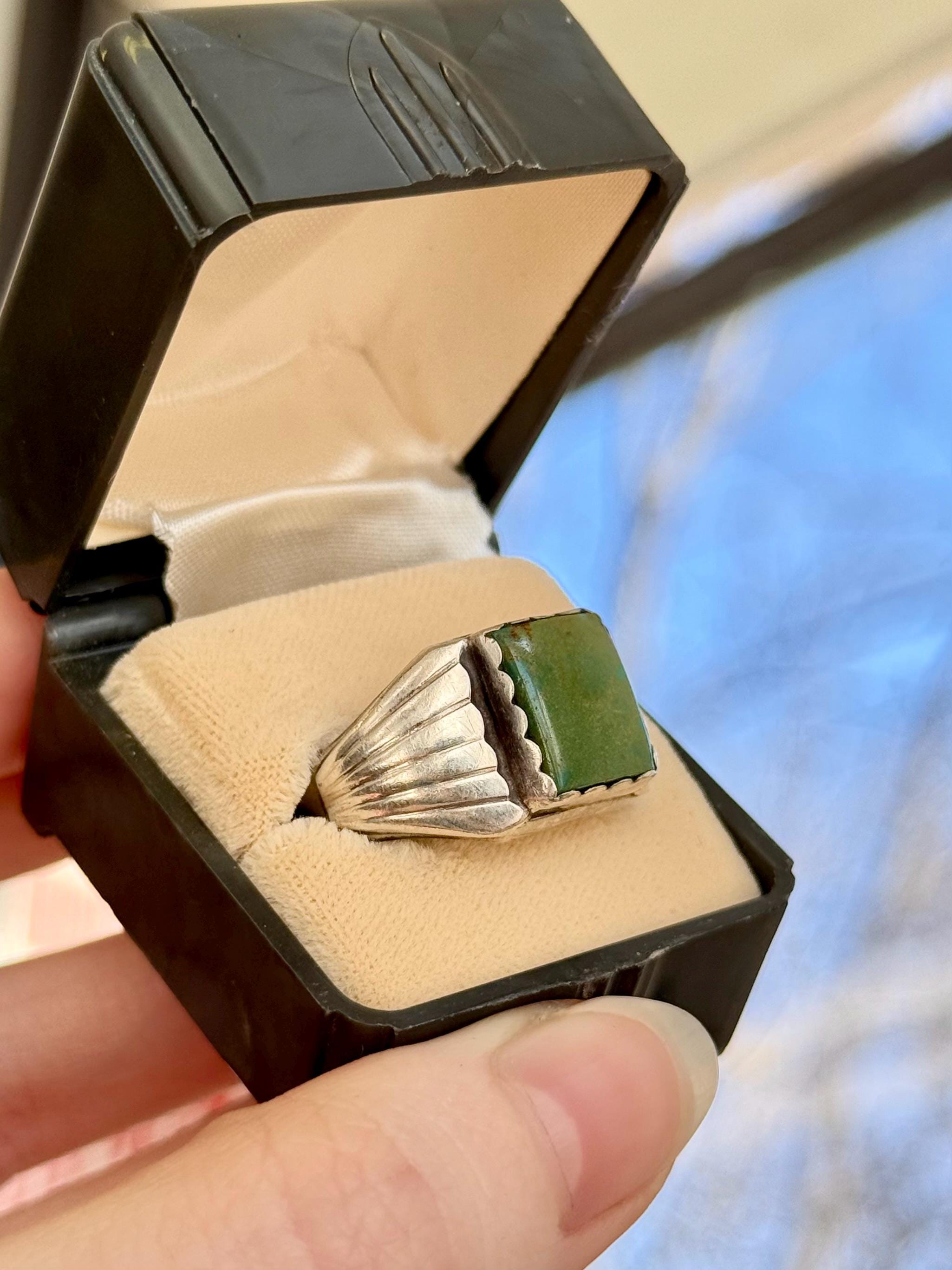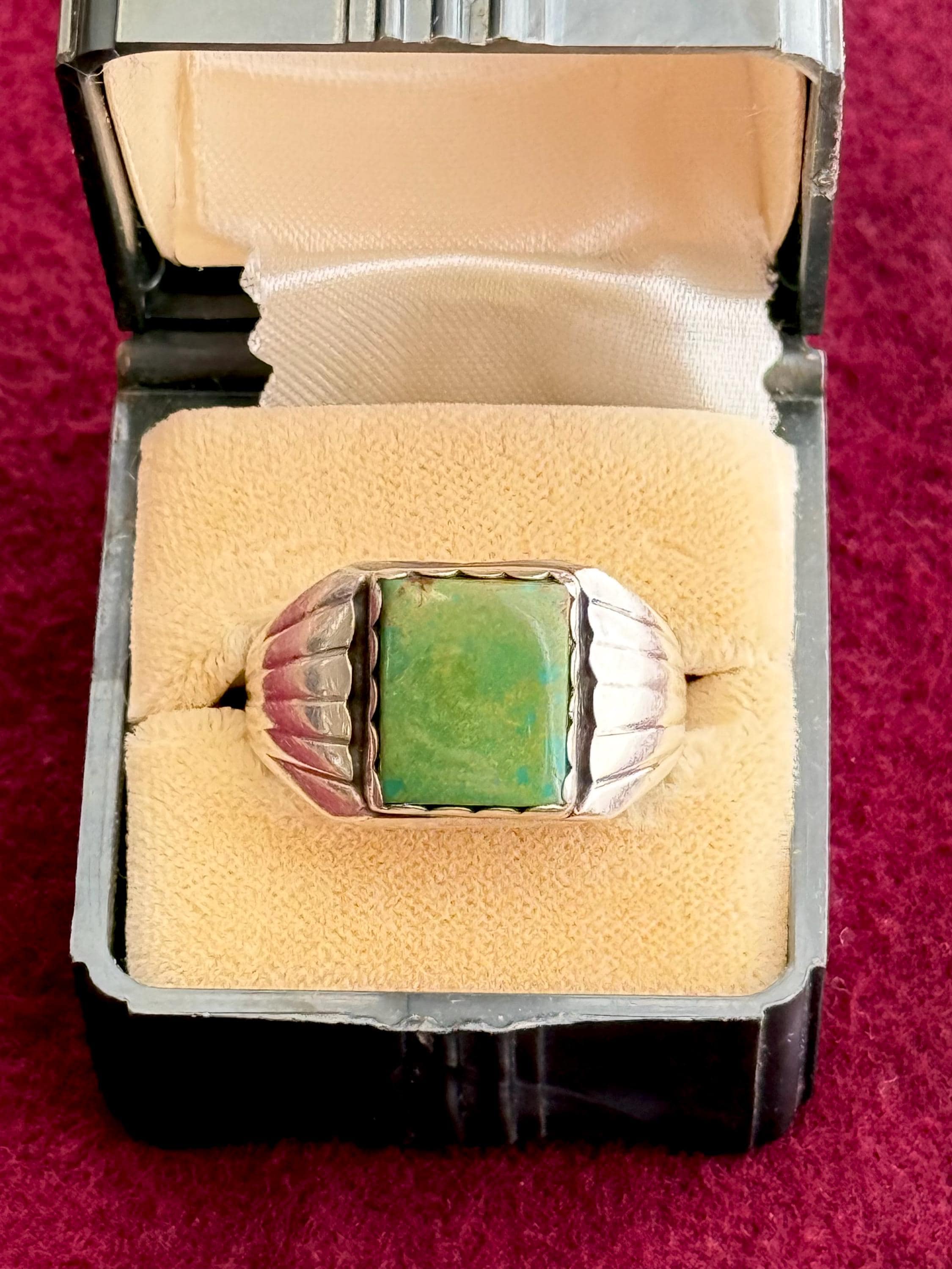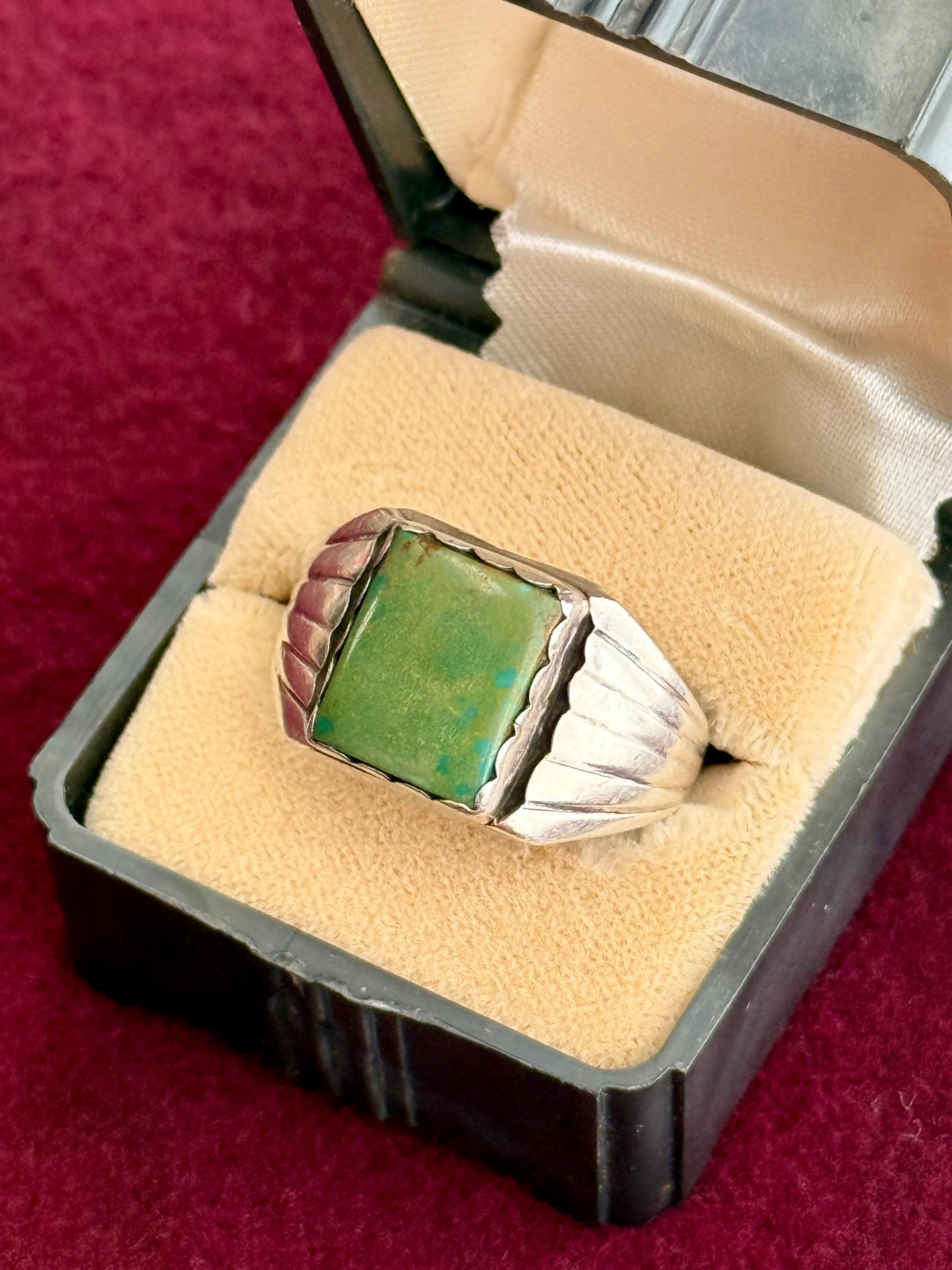 An authentic vintage ring featuring a signet style natural green turquoise setting with a scalloped bezel. a wide “winged” or “sun ray” motif on side of the band. An excellent example of southwestern native American craftsmanship. stone has been polished smooth with an high shine finish. unmarked.