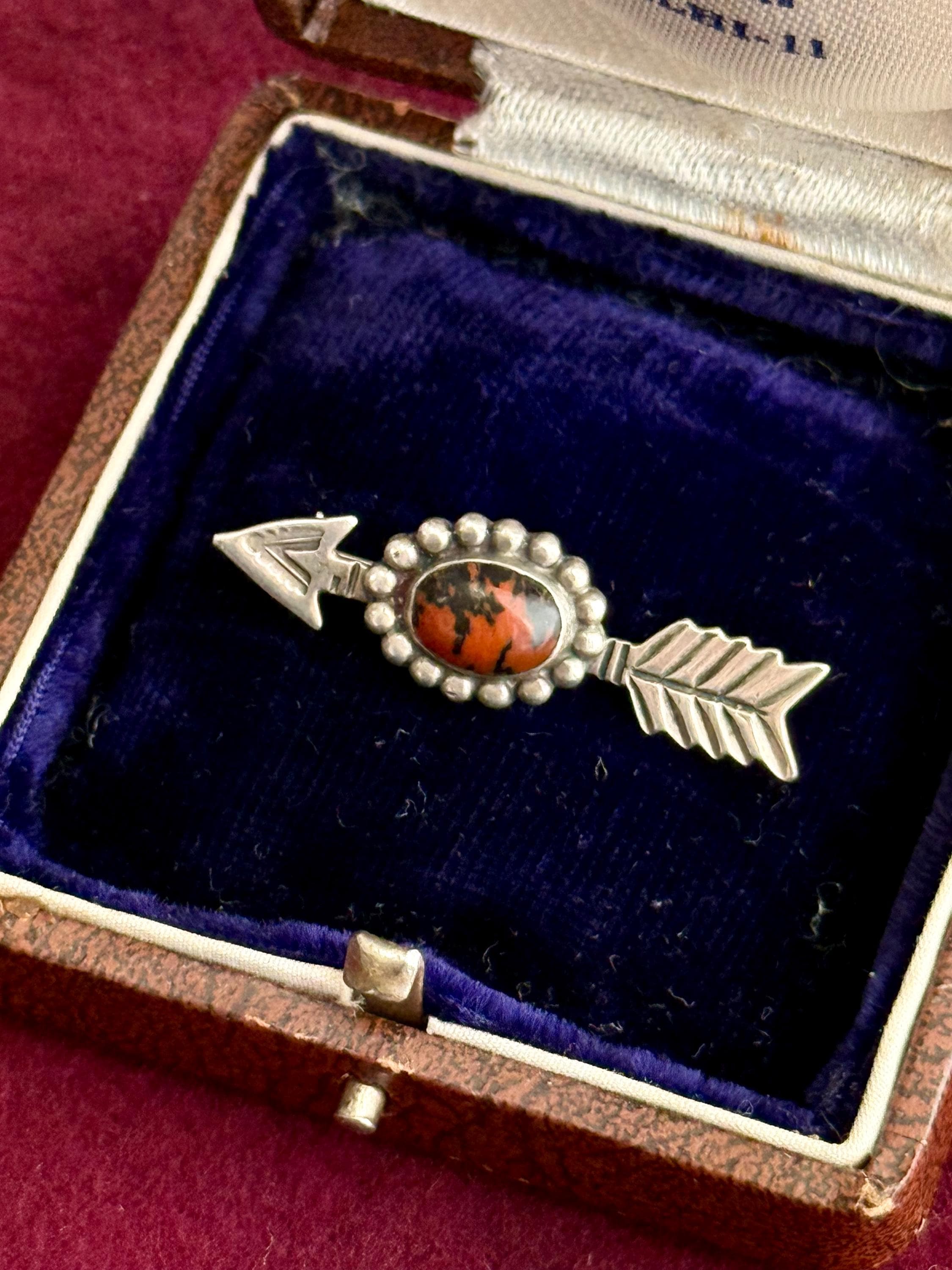 An authentic vintage small pin brooch. crafted of sterling silver with a petrified (fossilized) wood stone center. shaped into an arrow with hand stamped detail and flower petal like motif. can be styled on a jacket lapel, as a hat band pin, etc. unmarked.