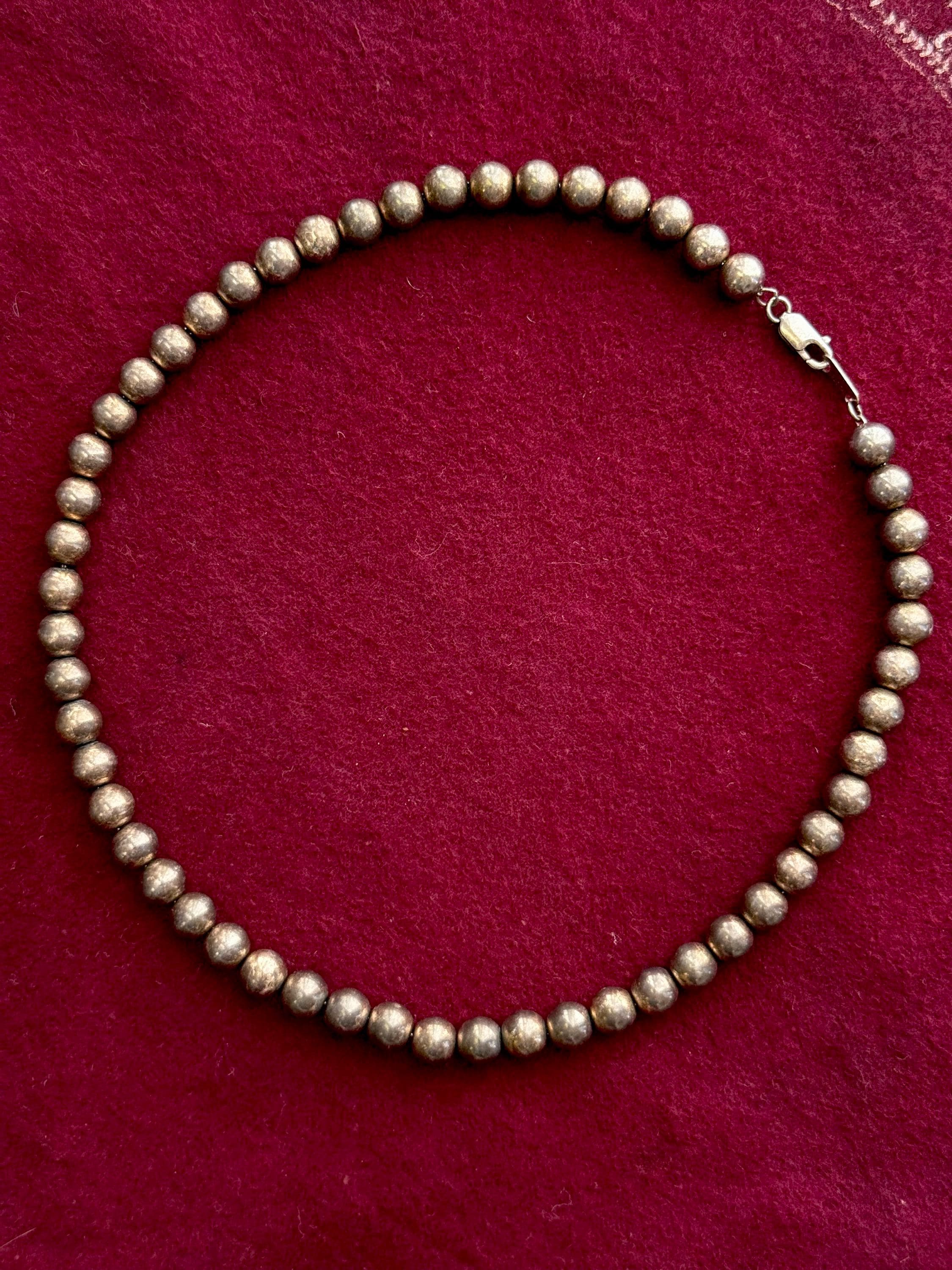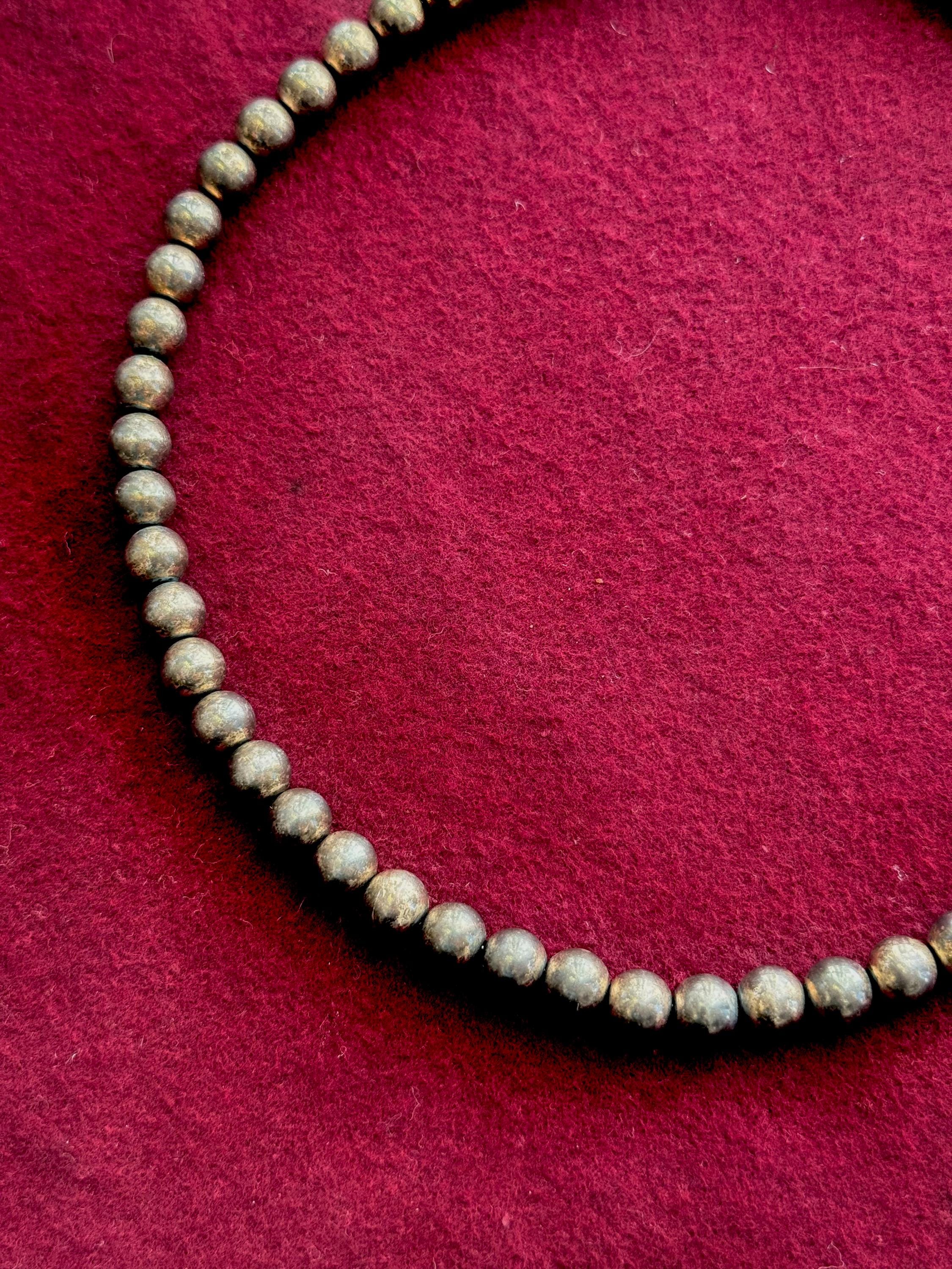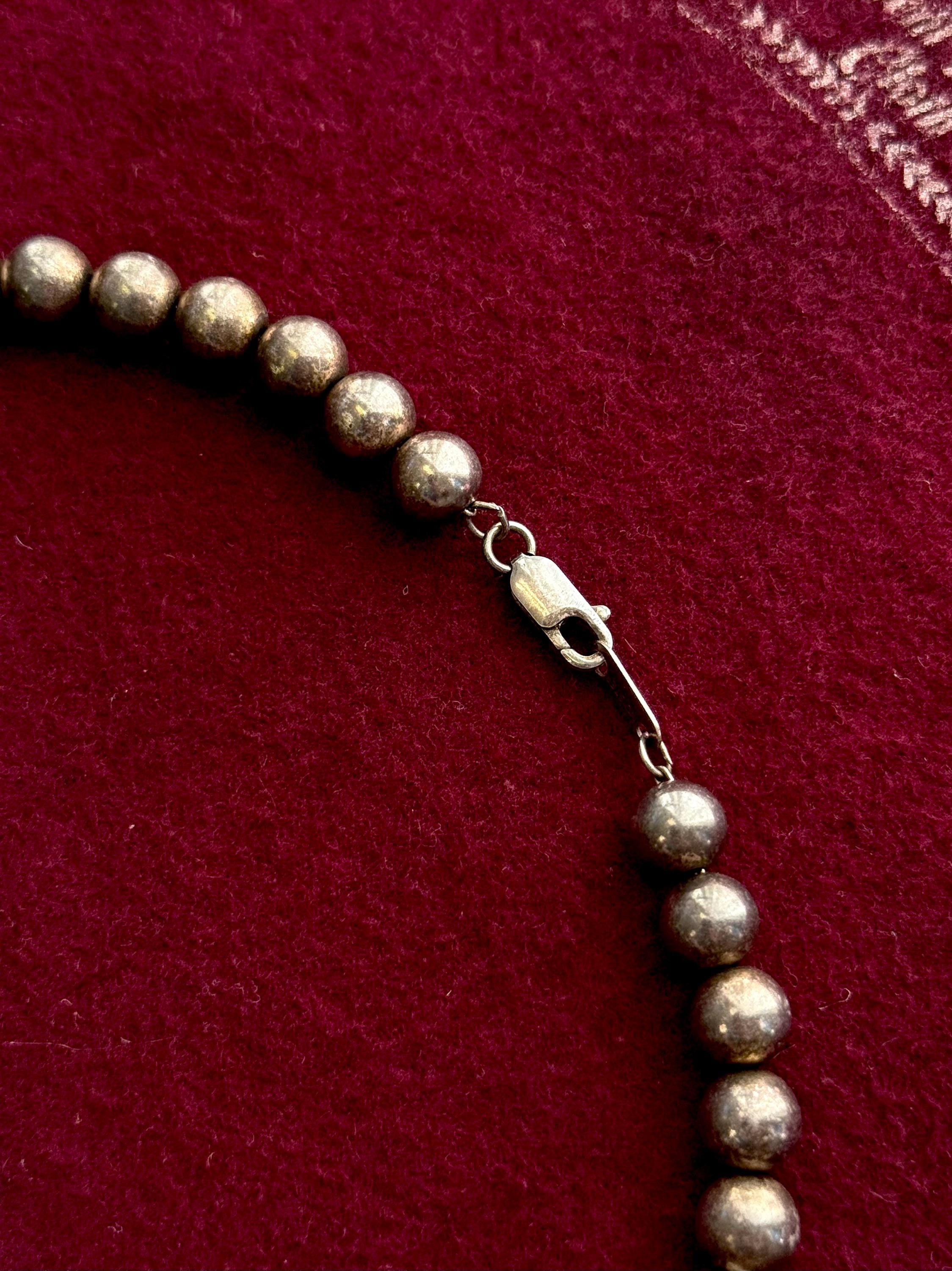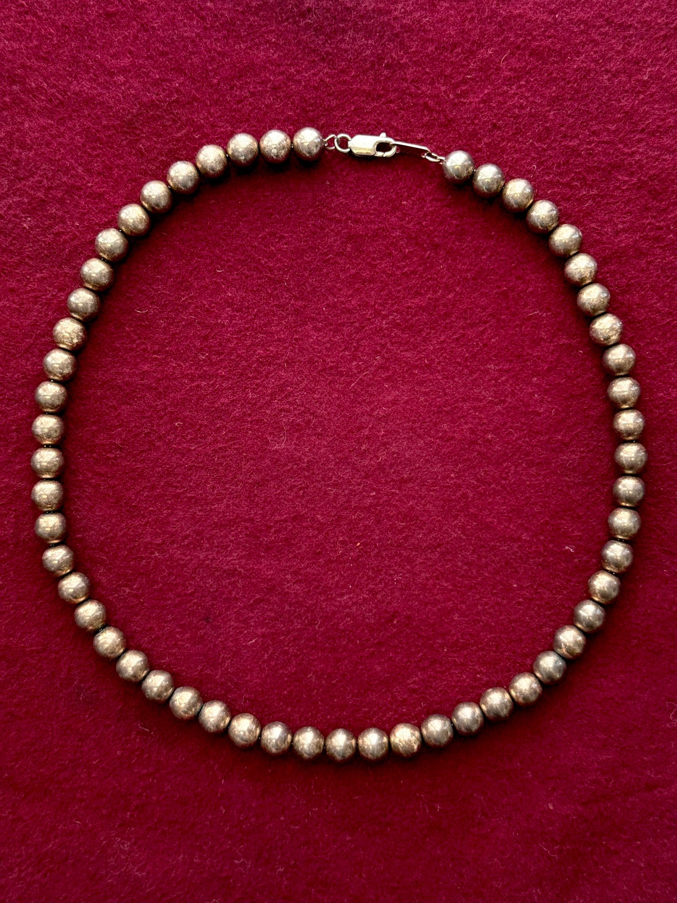 An authentic vintage necklace. a single strand of sterling silver pearls in a longer choker length. strung on a fine chain. lobster clasp. similar to a design commonly known as “navajo pearls” but unlikely this exact piece is native american made. unidentified hallmark located on clasp. marked sterling.