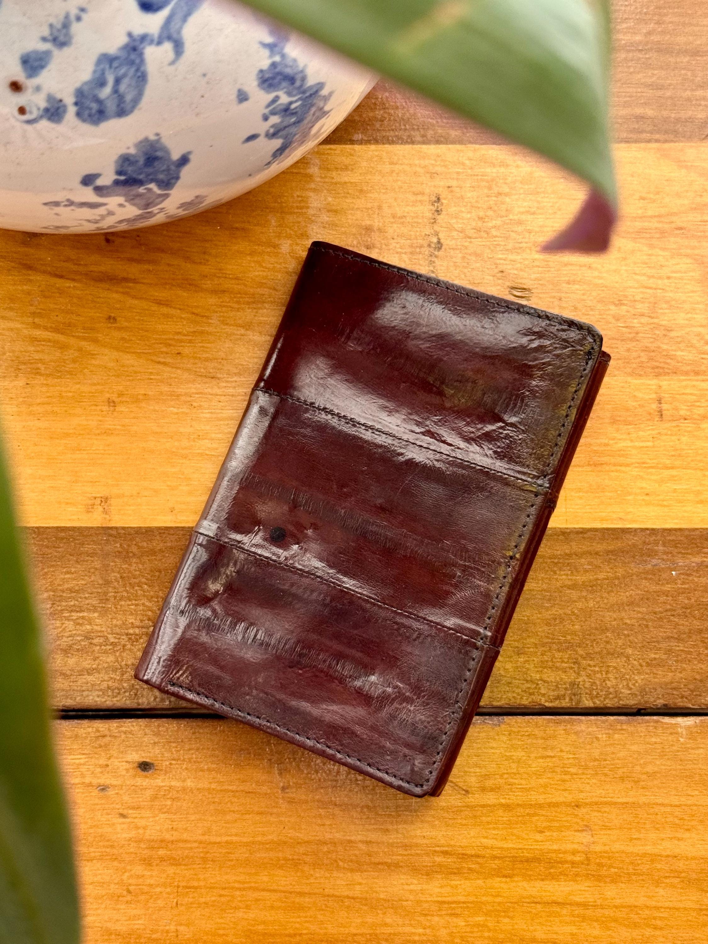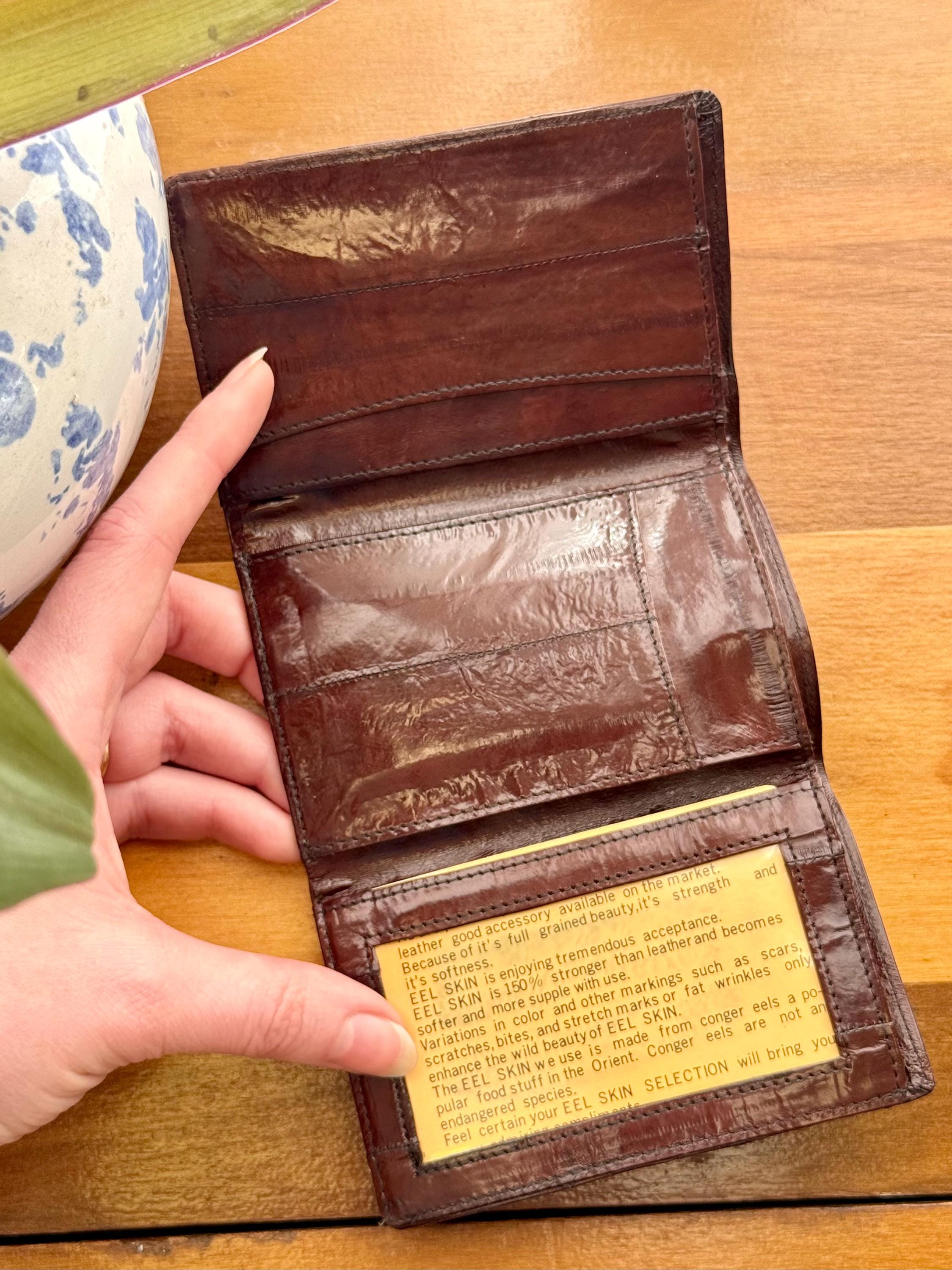 An authentic vintage trifold wallet. crafted from a fine smooth eel skin. includes original card insert. appears to have never been used!