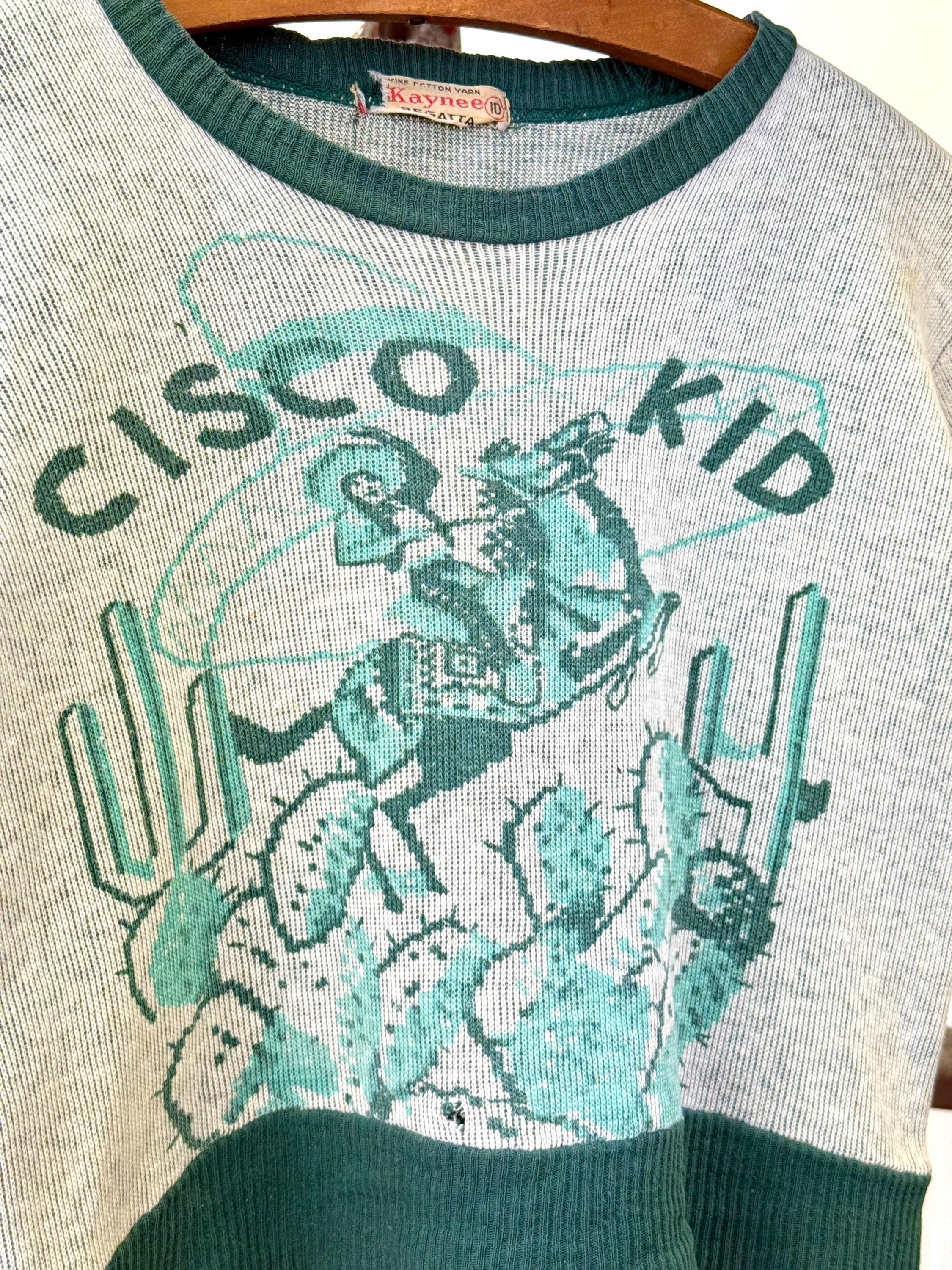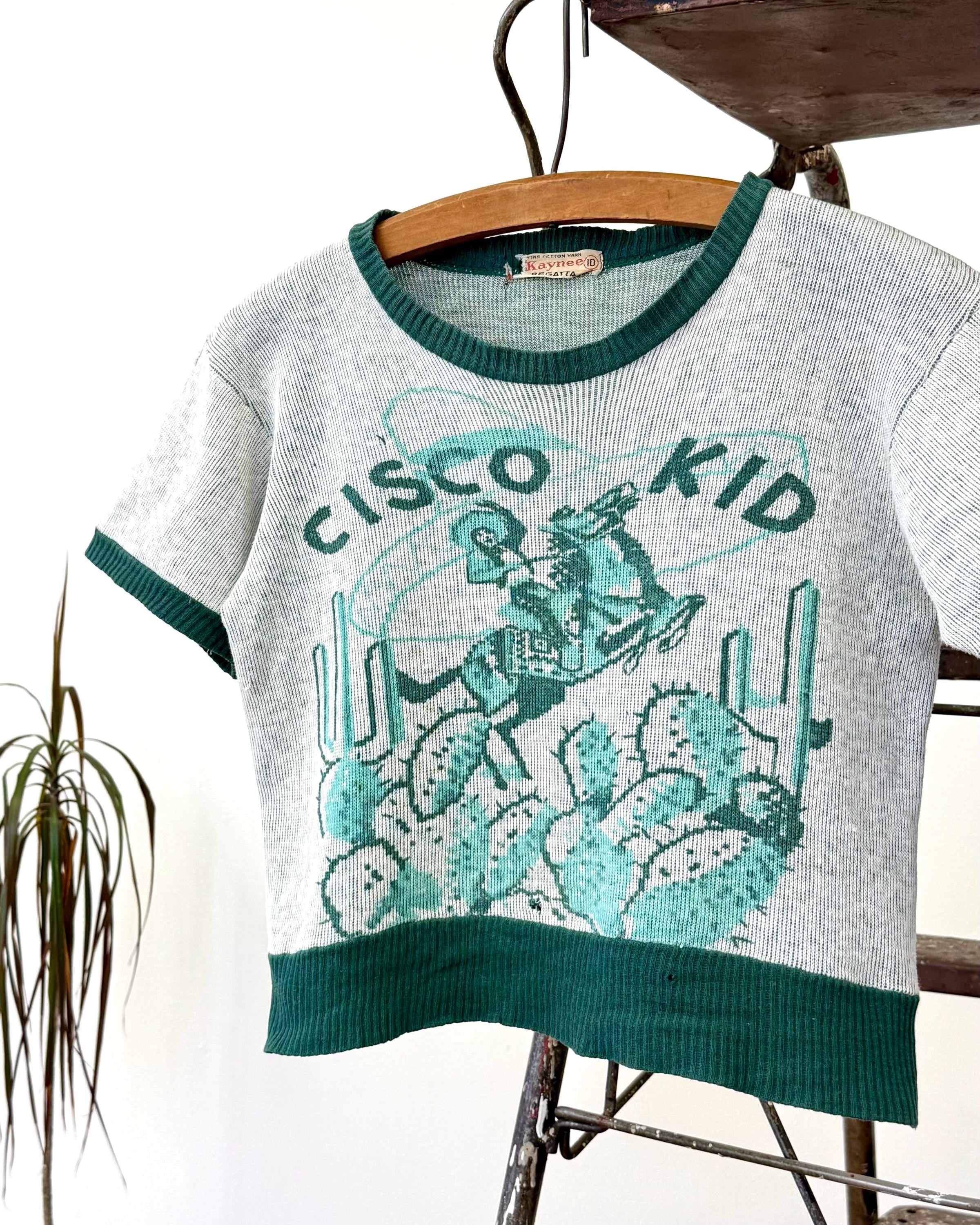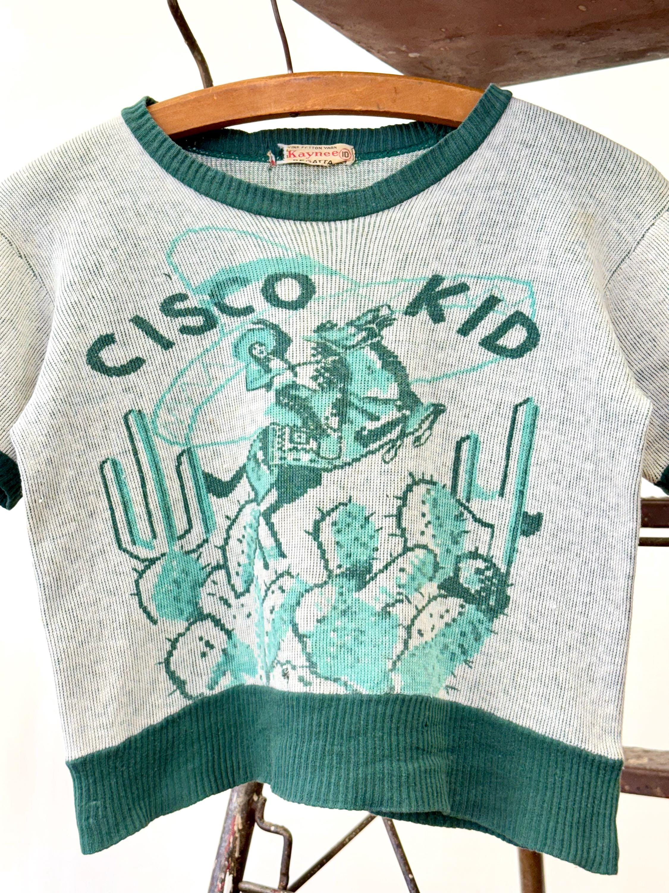 An authentic vintage short sleeve t shirt style knit sweater. features a printed graphic of the Cisco Kid, a Mexican caballero and popular Western comic/film character. an incredible collectible for any western enthusiast!