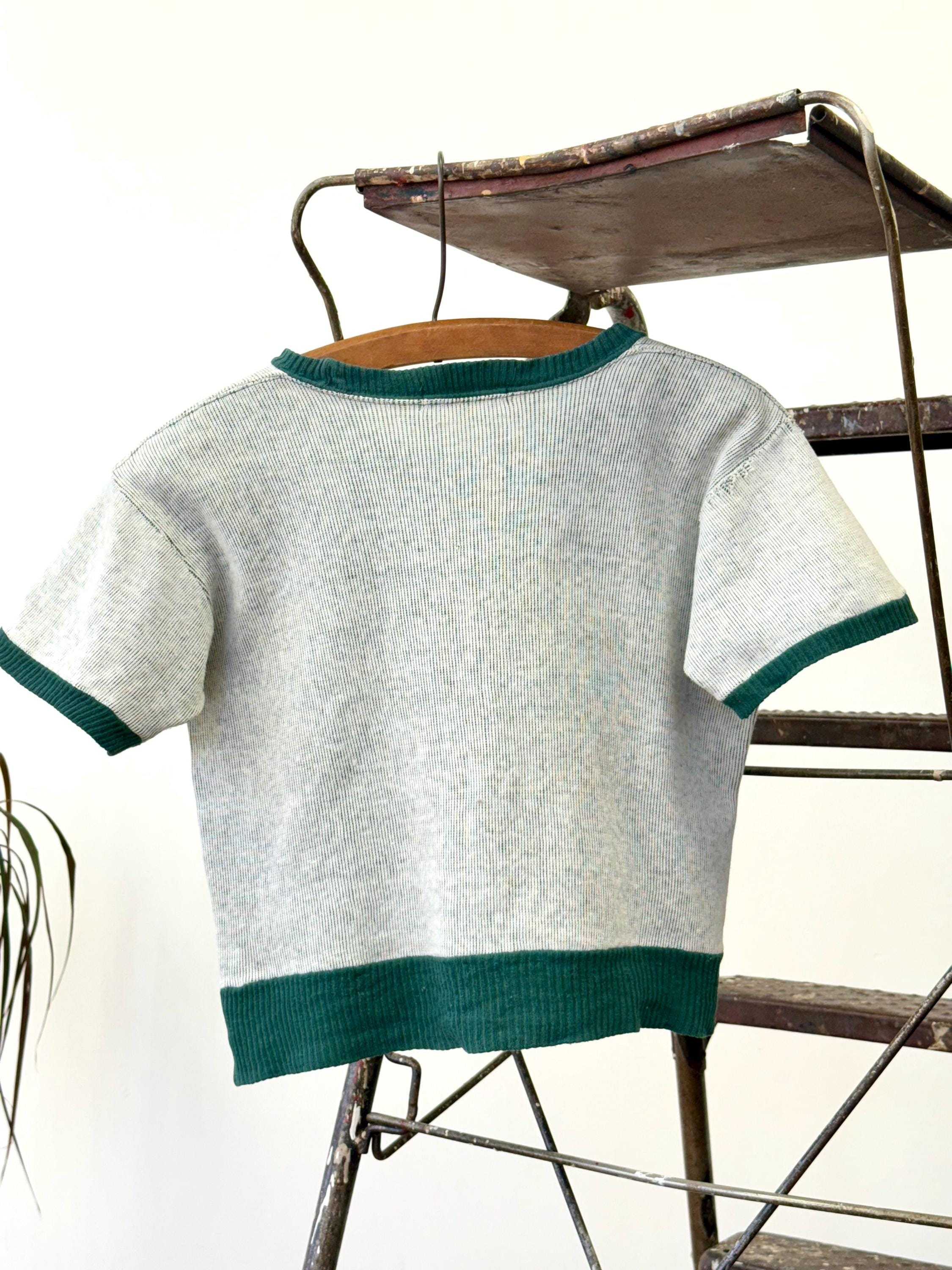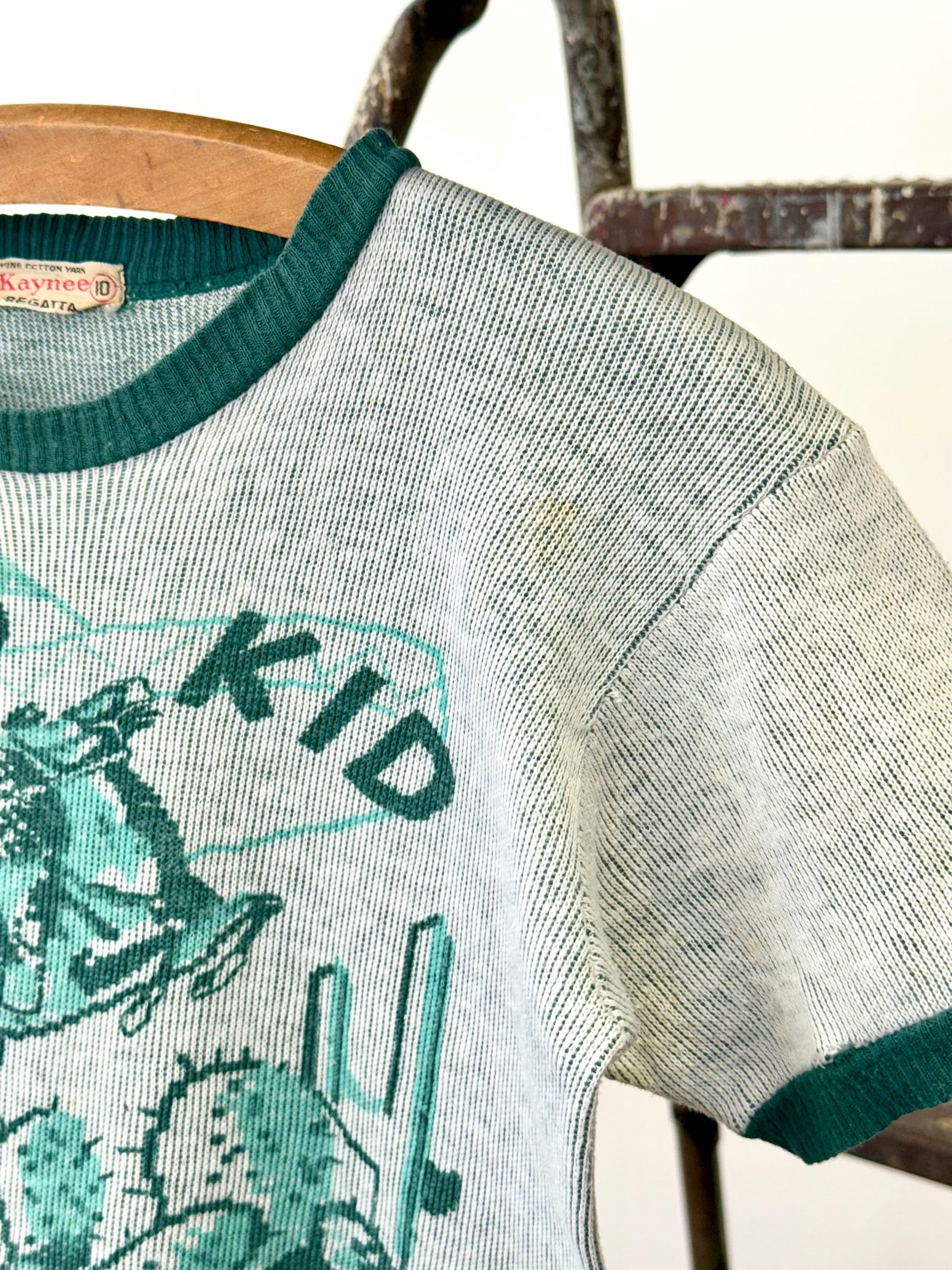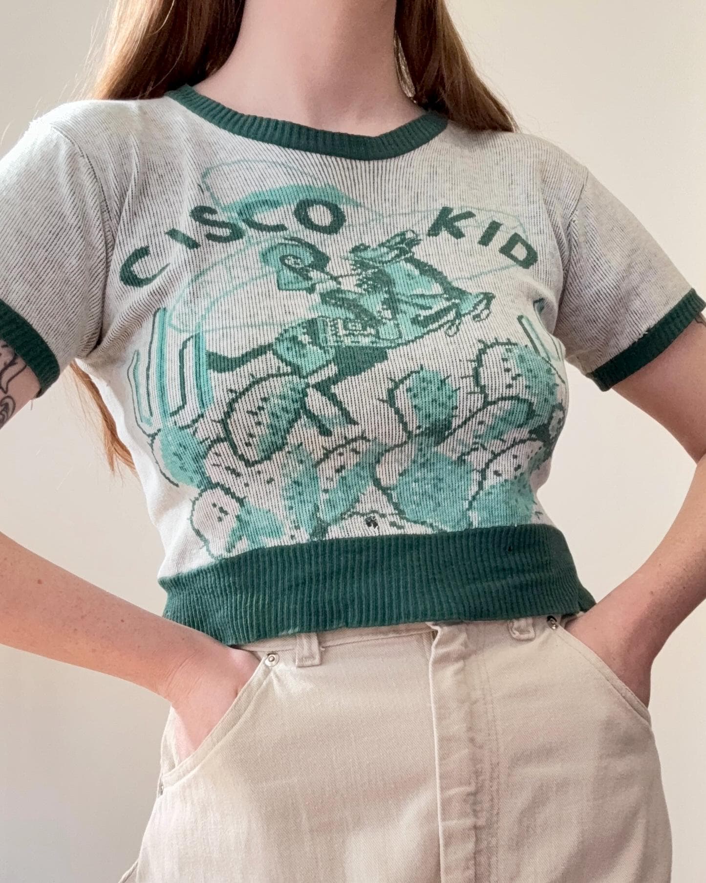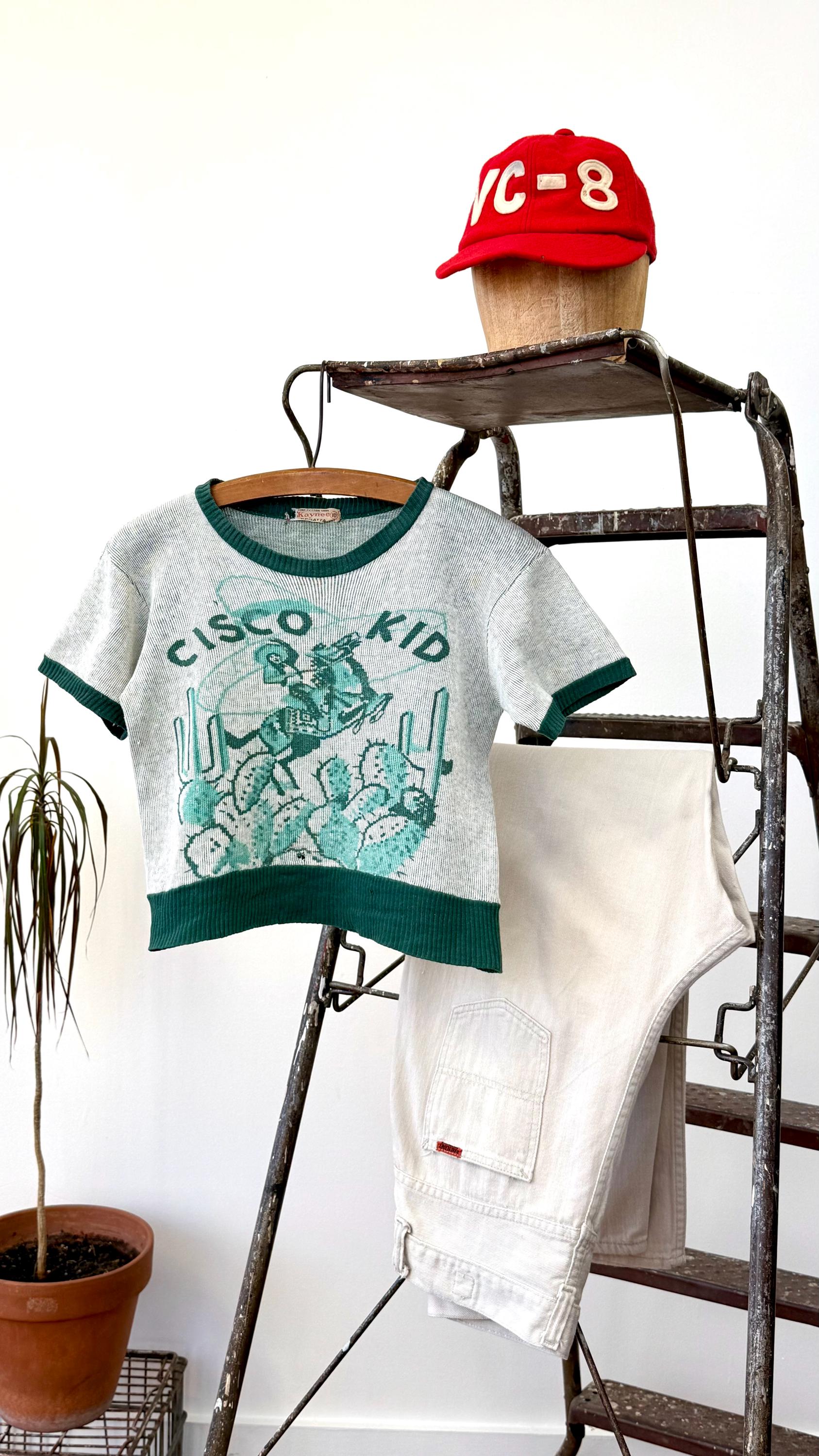 An authentic vintage short sleeve t shirt style knit sweater. features a printed graphic of the Cisco Kid, a Mexican caballero and popular Western comic/film character. an incredible collectible for any western enthusiast!