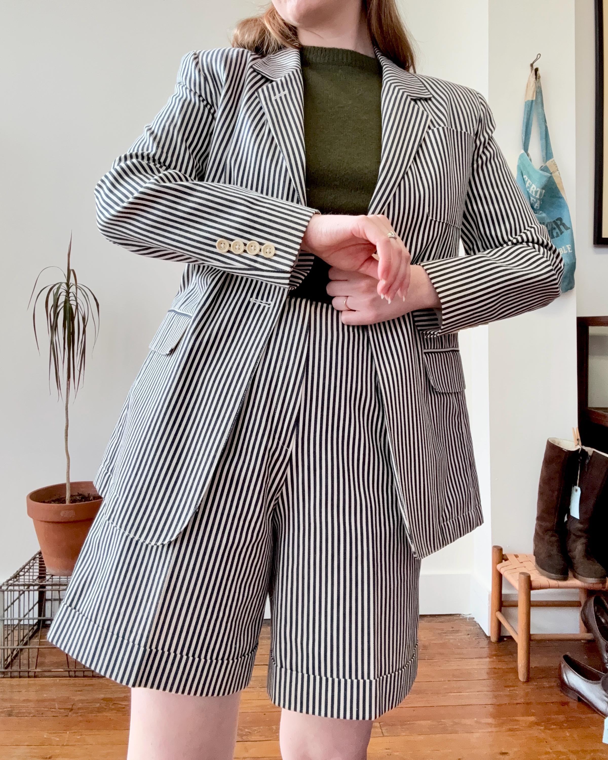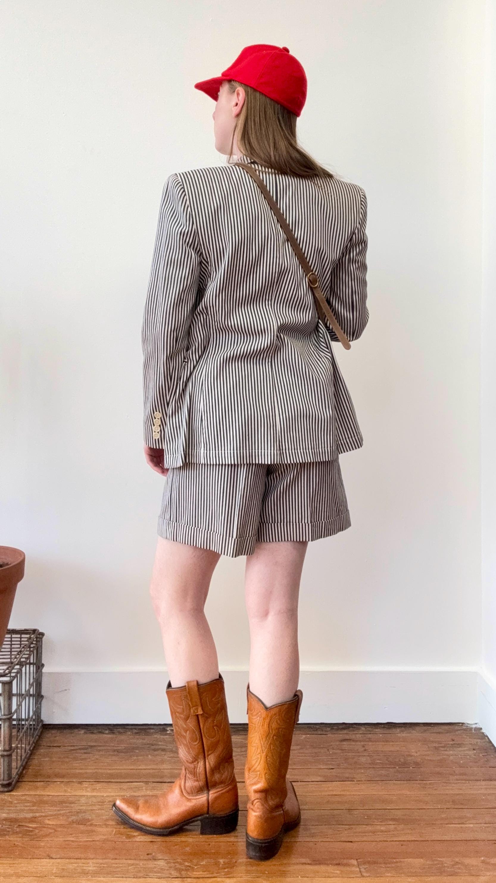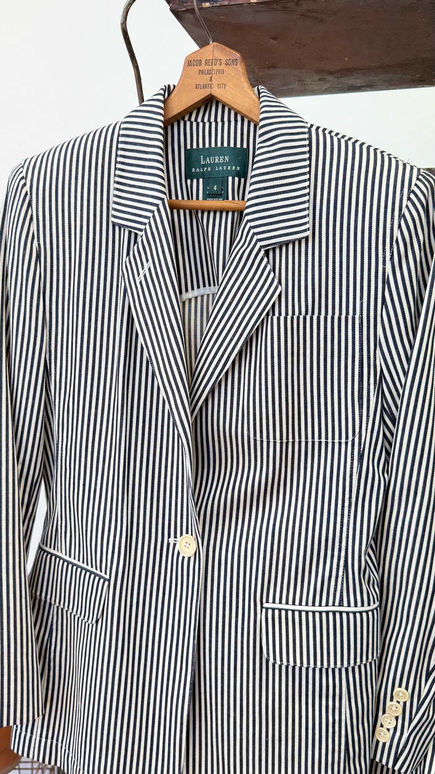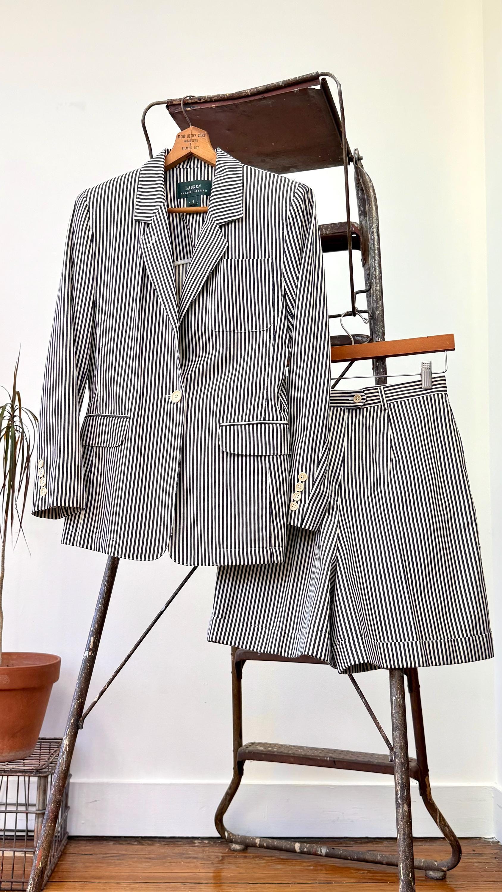 An authentic vintage two piece womens suit set by the Lauren Ralph Lauren label. crafted from a high quality stripe denim fabric. features a blazer style jacket with a tailored fit and shoulder pads for added structure. the shorts are creased and cuffed with chino style pockets. both pieces have a classic suiting look and feel to them, you’d expect nothing less from Ralph Lauren. made in USA