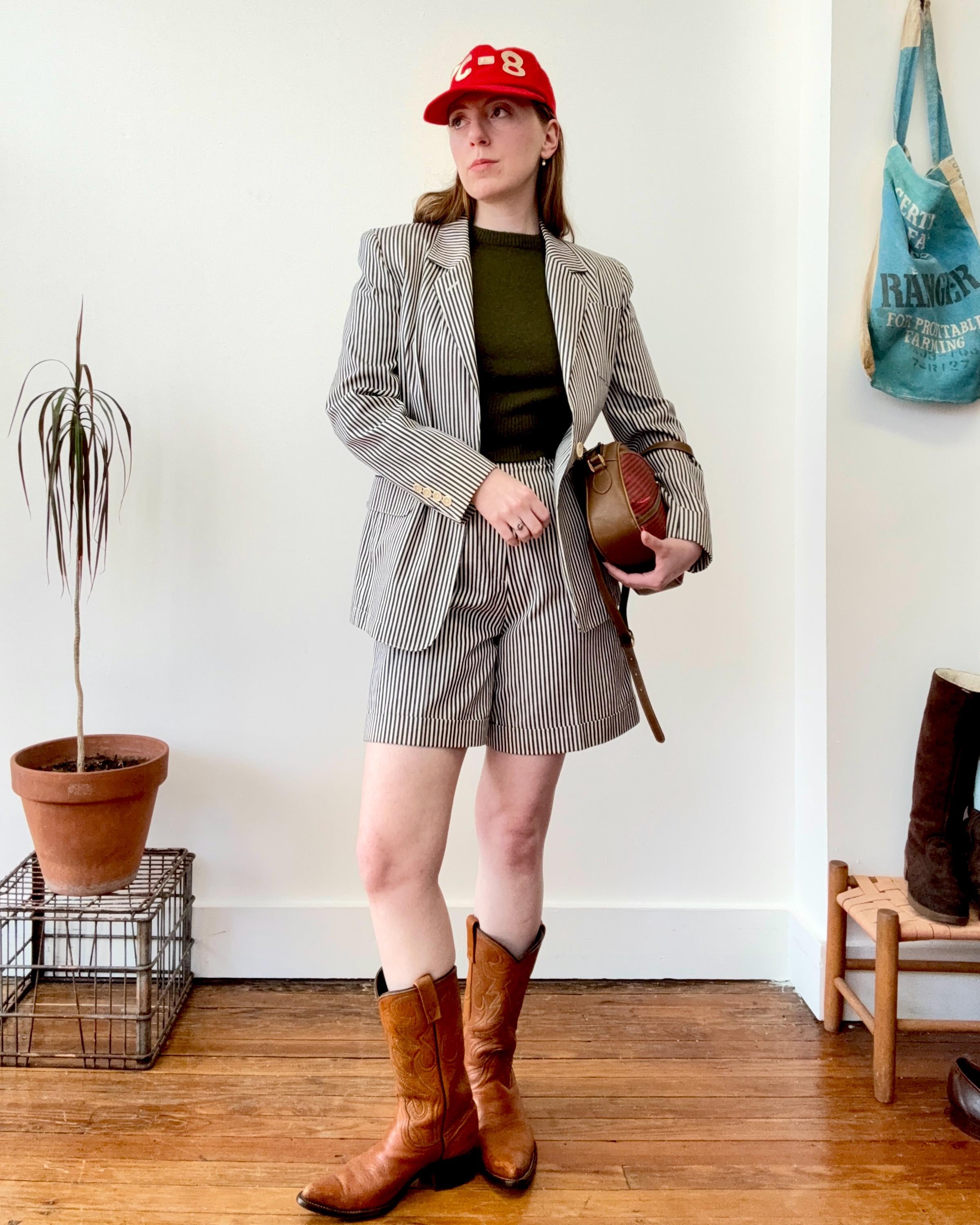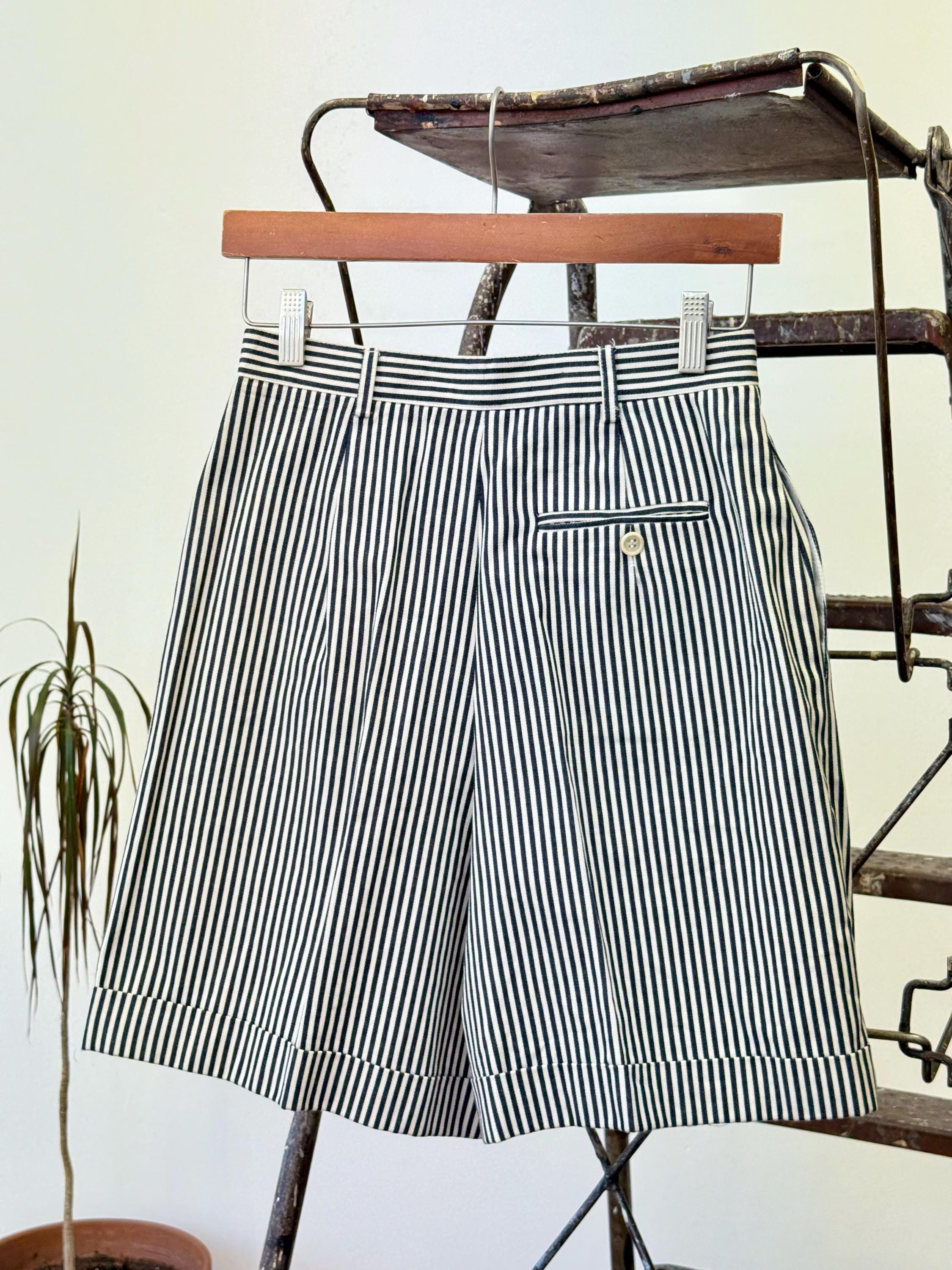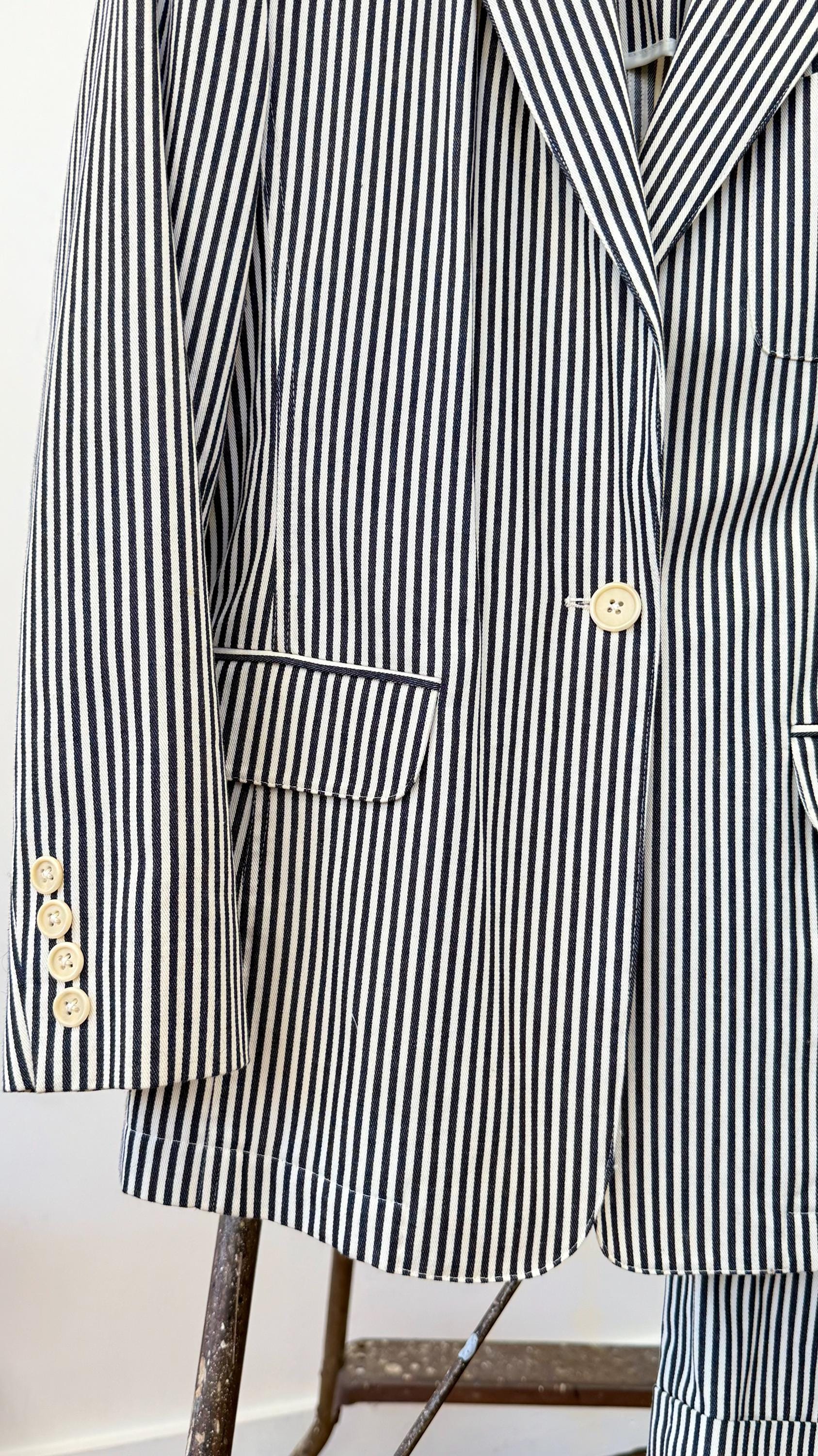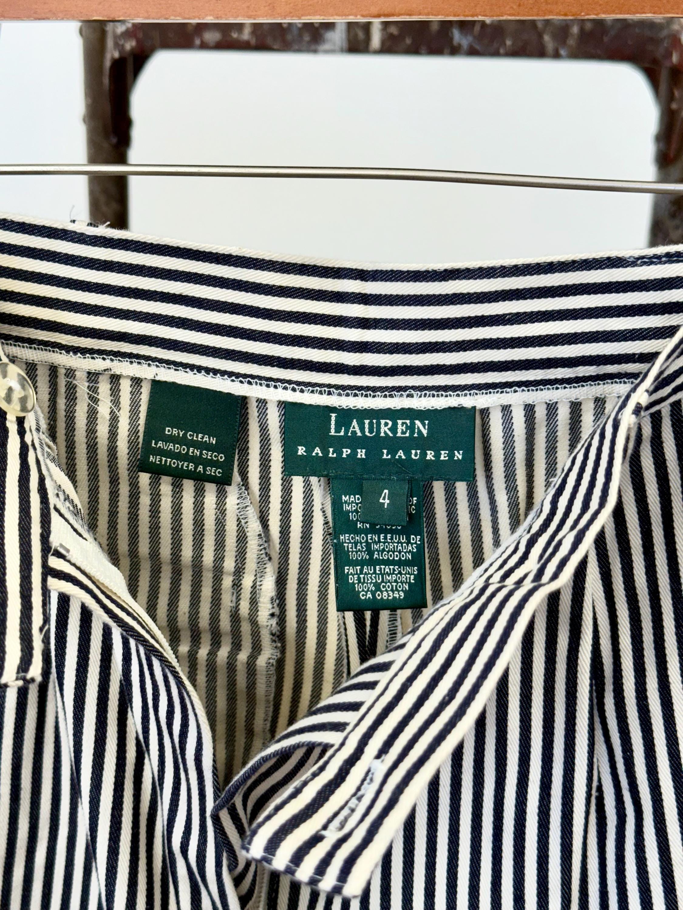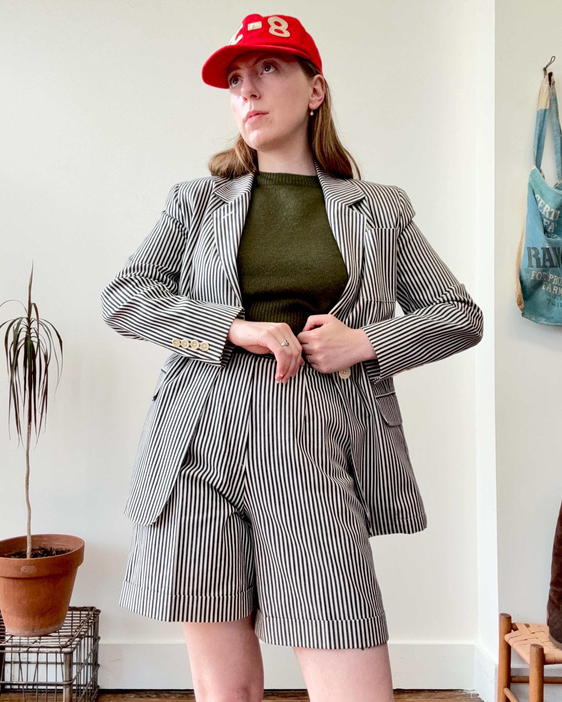 An authentic vintage two piece womens suit set by the Lauren Ralph Lauren label. crafted from a high quality stripe denim fabric. features a blazer style jacket with a tailored fit and shoulder pads for added structure. the shorts are creased and cuffed with chino style pockets. both pieces have a classic suiting look and feel to them, you’d expect nothing less from Ralph Lauren. made in USA