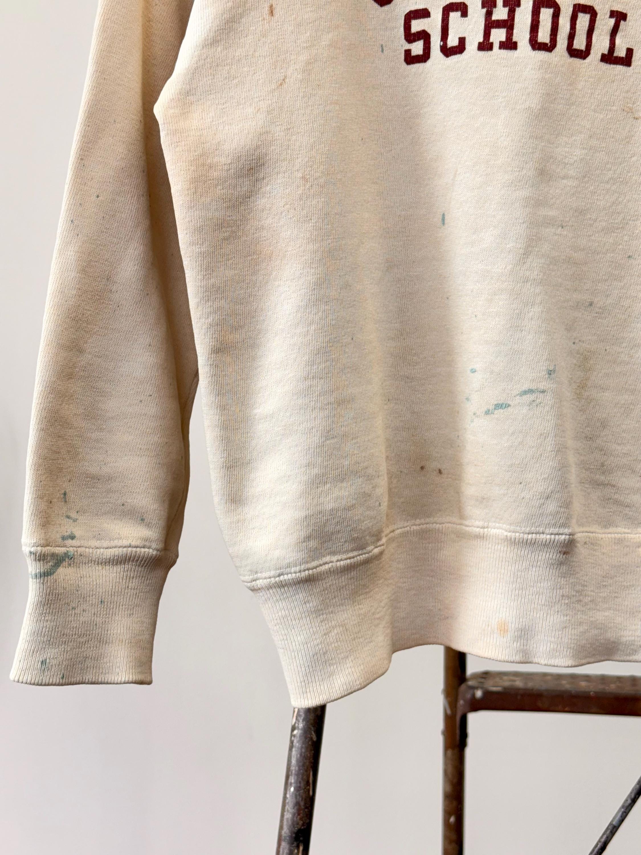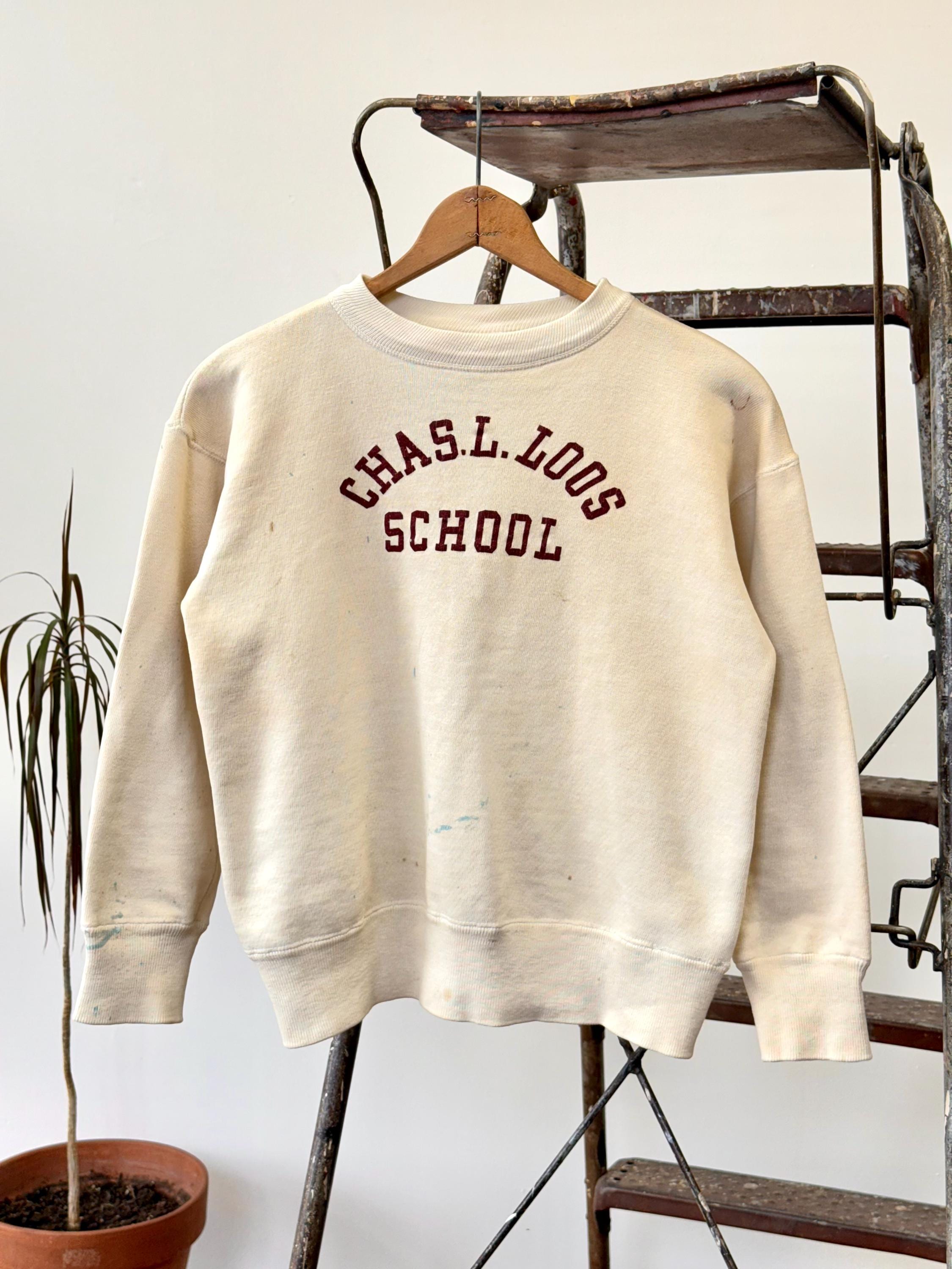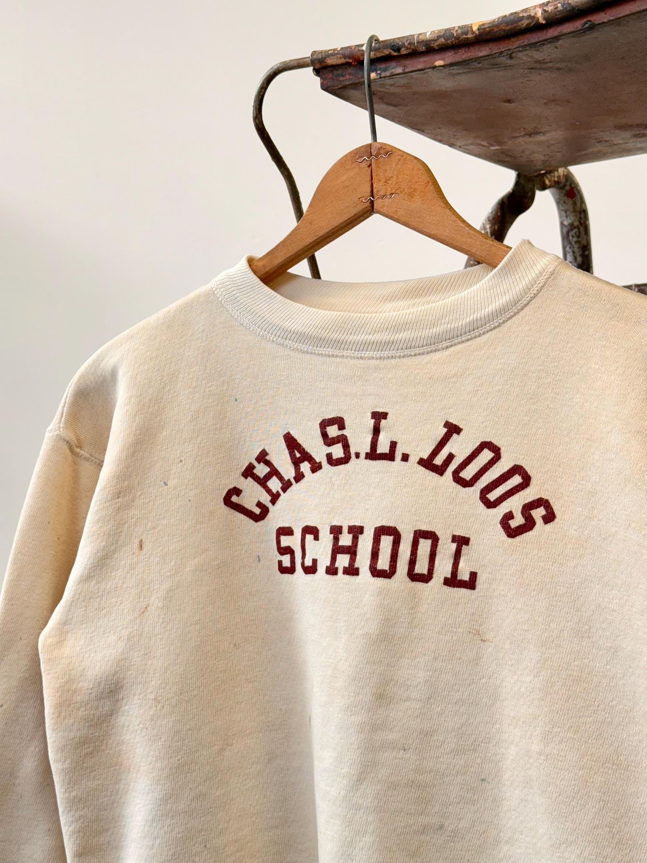 An authentic vintage sweatshirt. made for the Chas L Loos School of the Dayton Ohio area. their name is screen printed on the front. well worn and distressed including powder blue paint splatters and natural patina. soft cotton fleece pullover crewneck by Champion Sportswear. a wide crop fit.