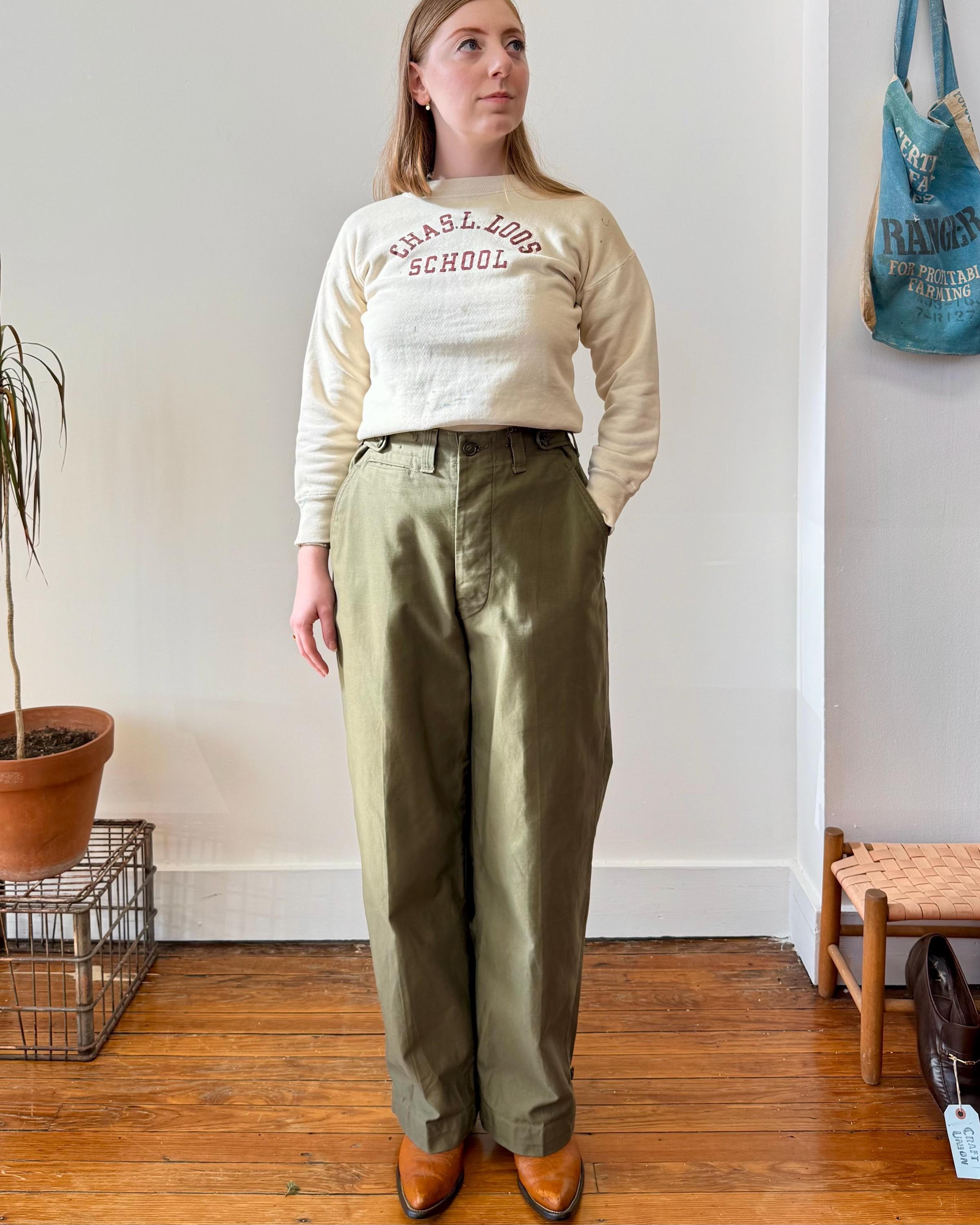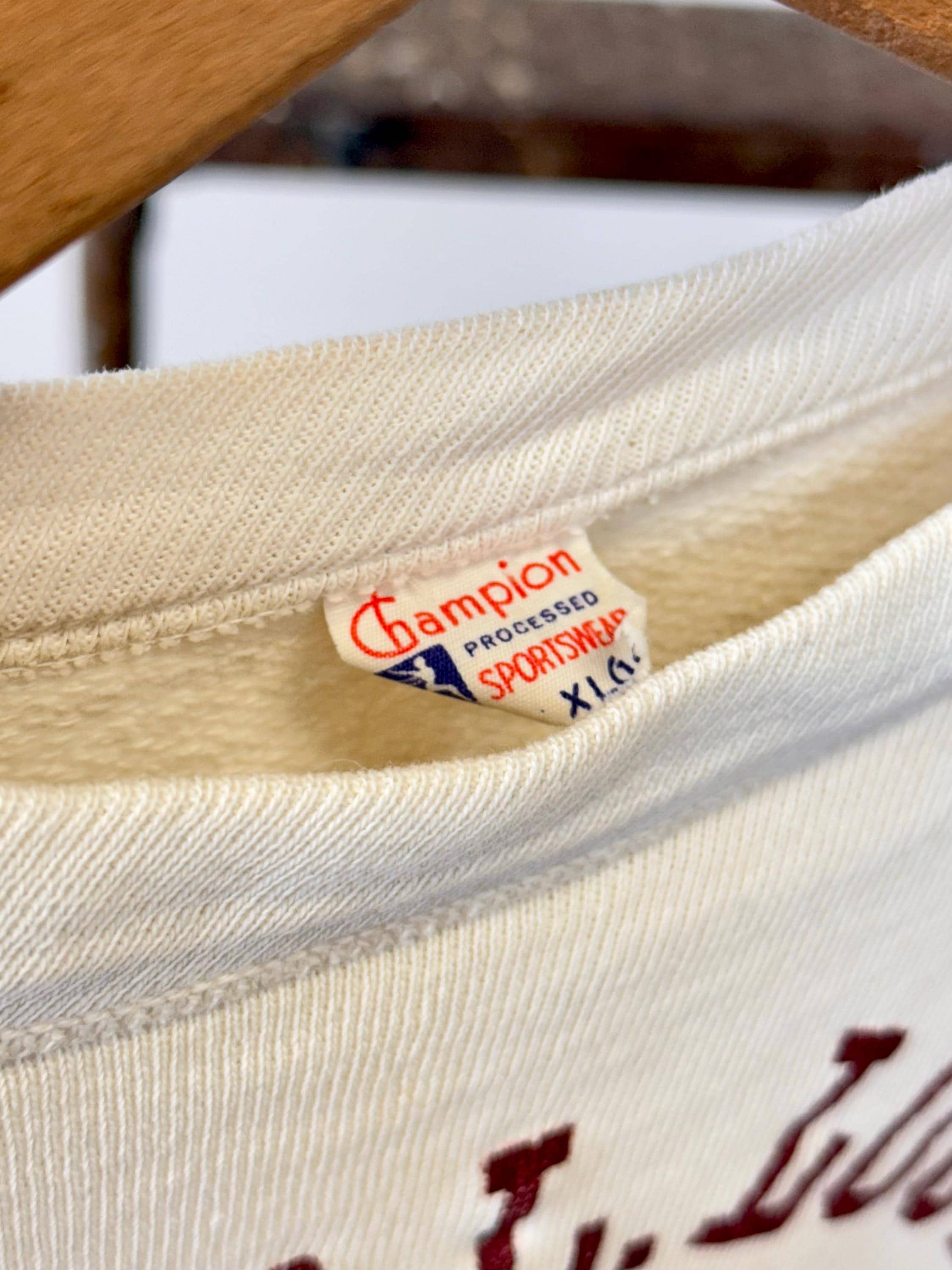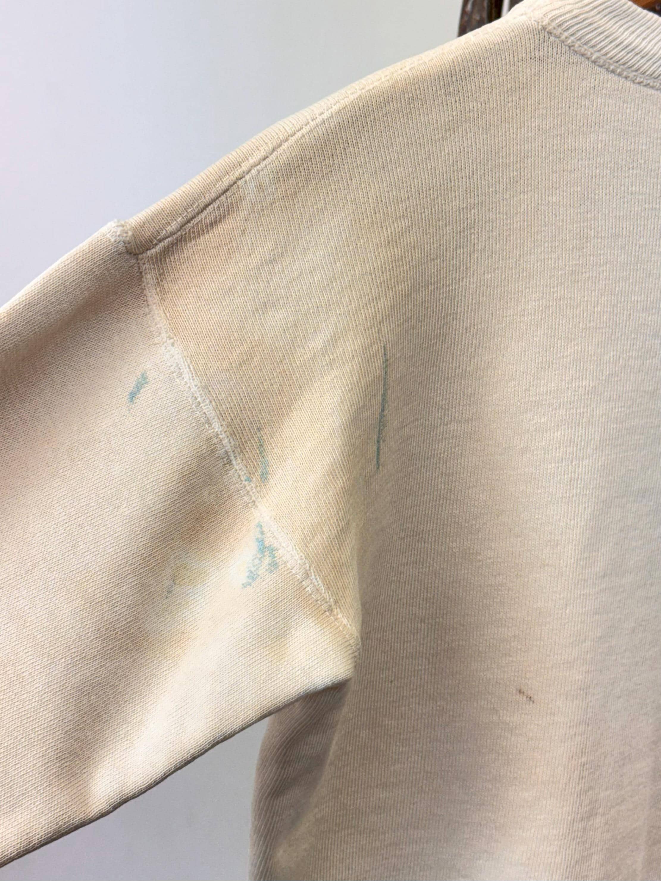 An authentic vintage sweatshirt. made for the Chas L Loos School of the Dayton Ohio area. their name is screen printed on the front. well worn and distressed including powder blue paint splatters and natural patina. soft cotton fleece pullover crewneck by Champion Sportswear. a wide crop fit.