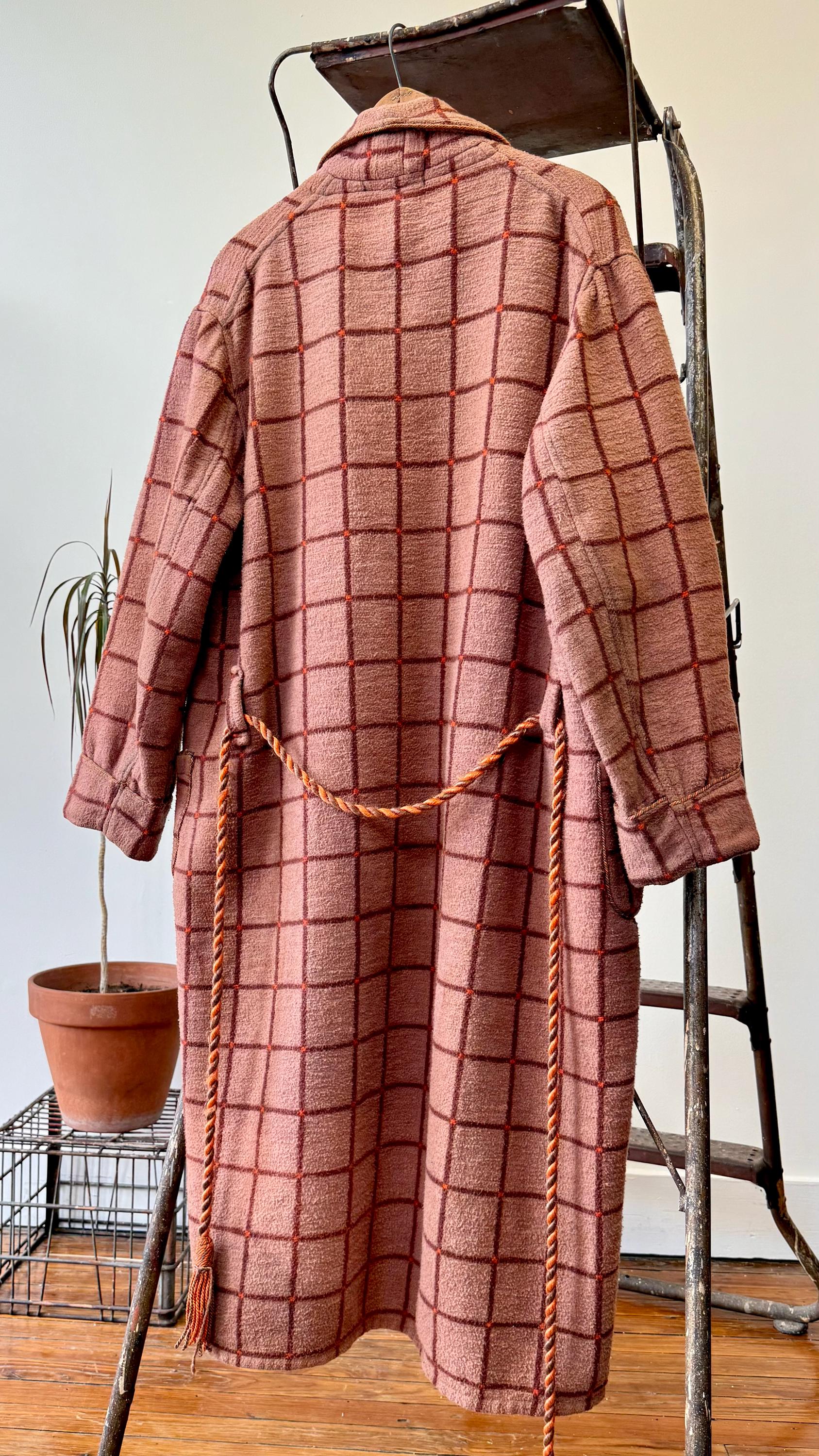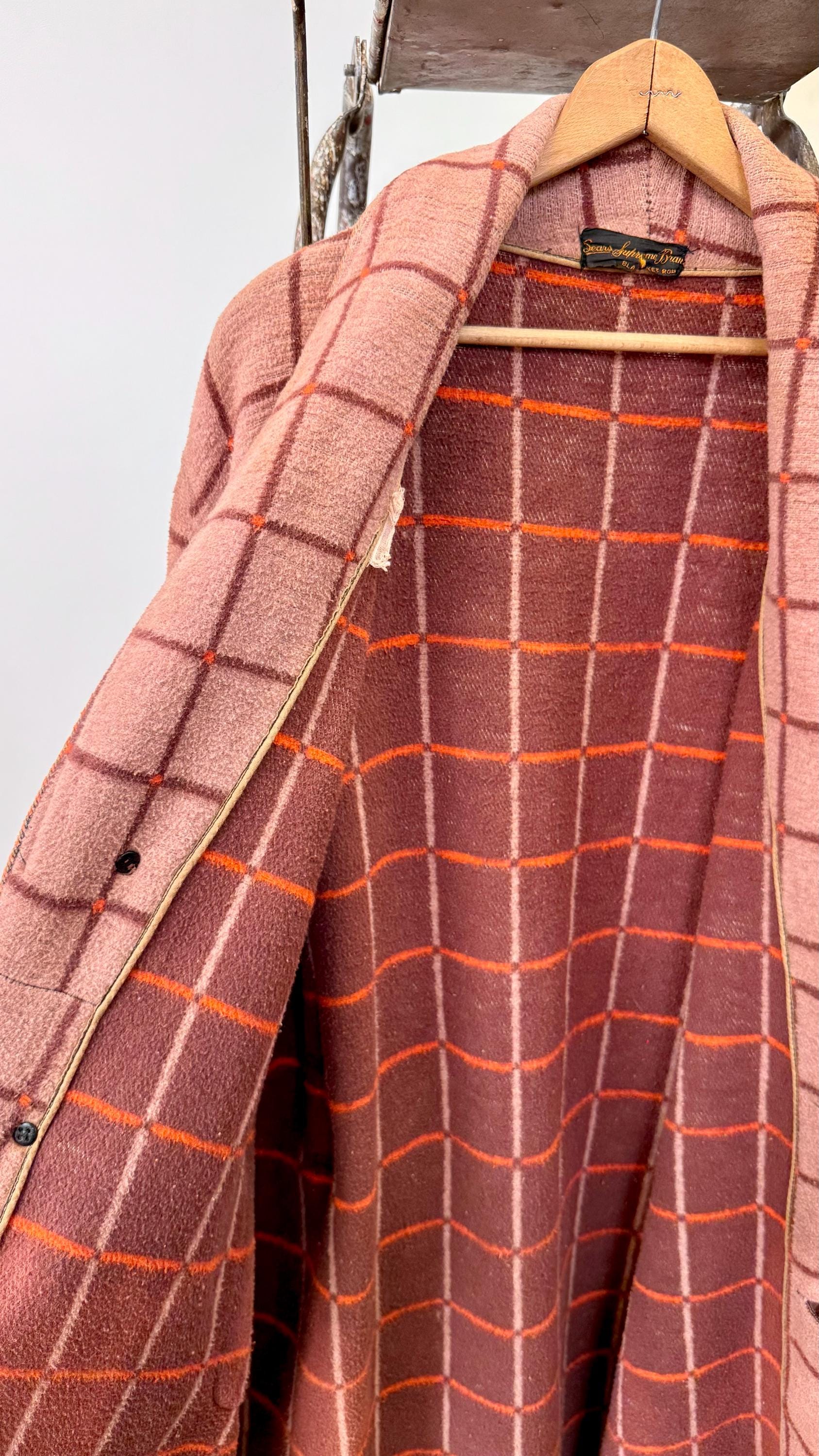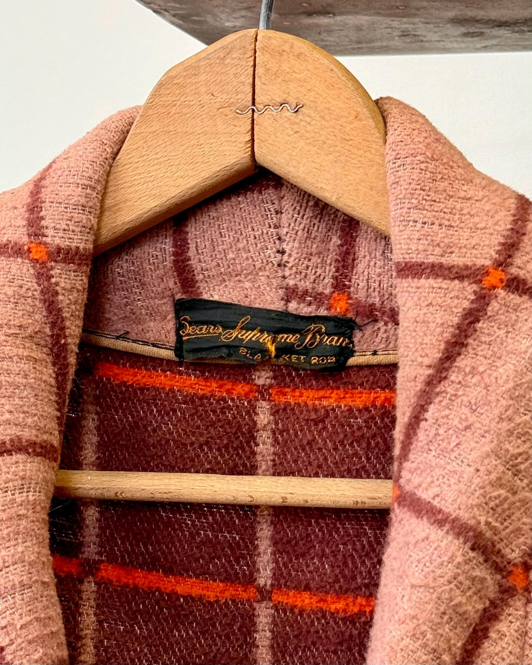 An authentic vintage blanket robe. similar in style to a Beacon blanket robe but this one was produced by Sears’ Supreme Brand label. crafted from the same ultra soft fleece cotton fabric many camp style blankets were made, this one has a unique geometric grid pattern. the colors are reversed in the lining but the garment itself is not “reversible”. features a shawl collar neckline, large button front closure, waist pockets, and a satin cord rope belt with tassels. a great gender neutral style you could easily wear at home or as outerwear!