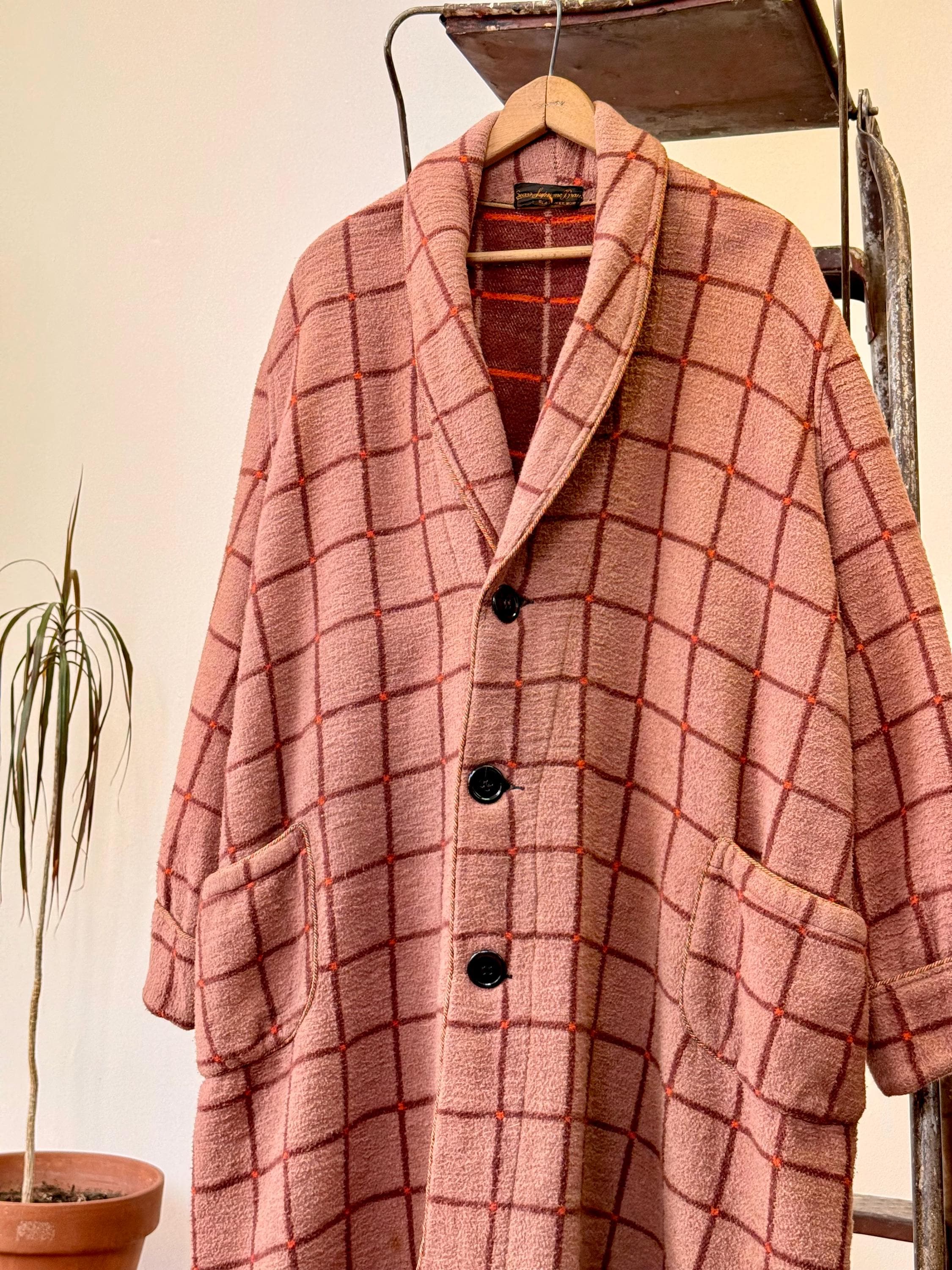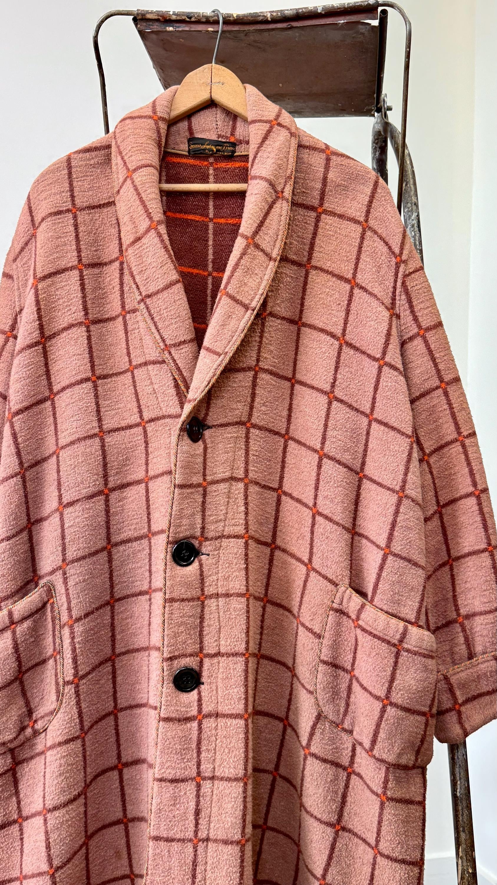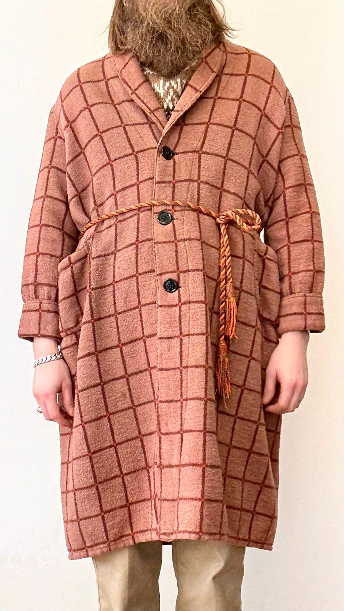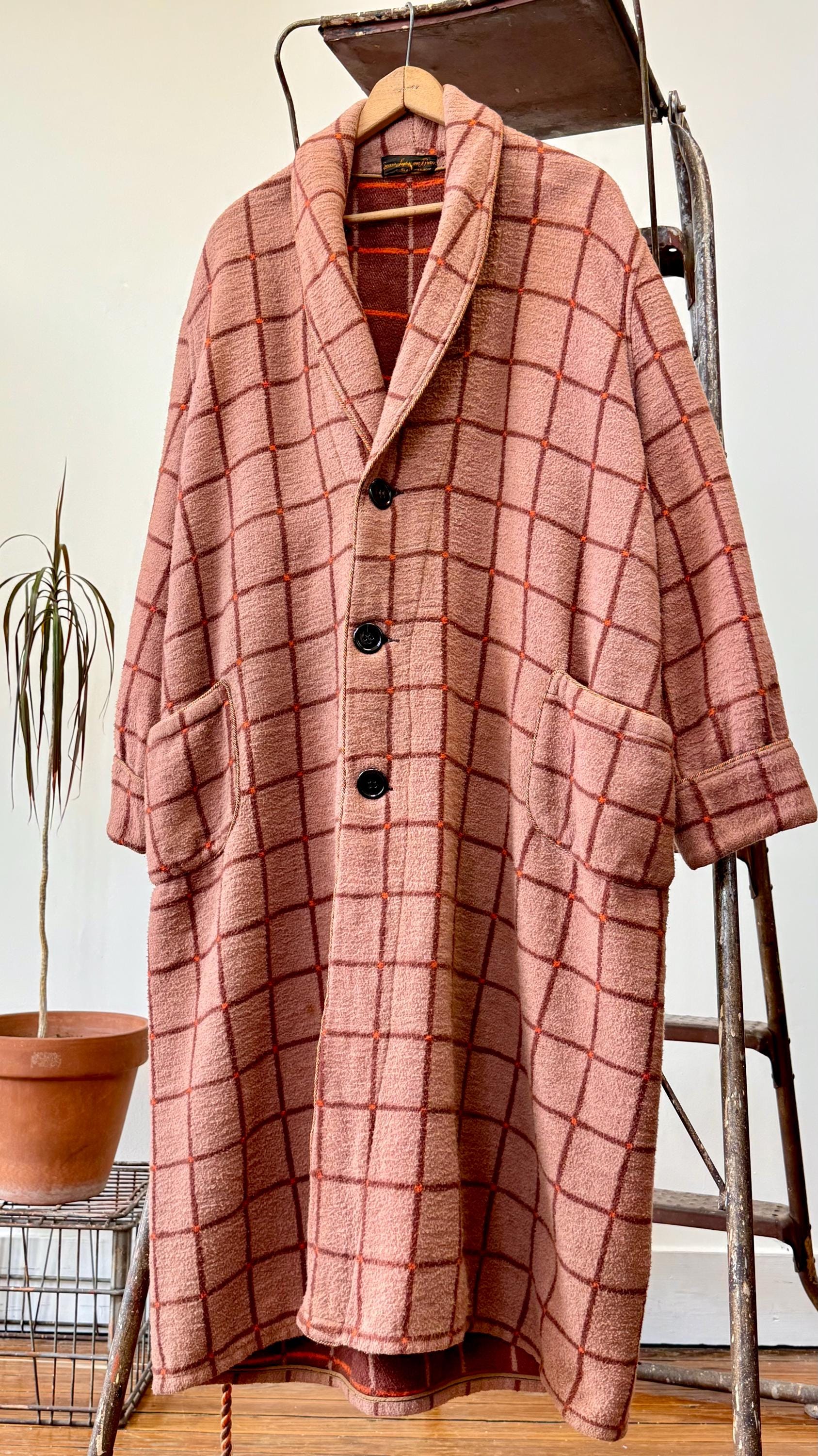 An authentic vintage blanket robe. similar in style to a Beacon blanket robe but this one was produced by Sears’ Supreme Brand label. crafted from the same ultra soft fleece cotton fabric many camp style blankets were made, this one has a unique geometric grid pattern. the colors are reversed in the lining but the garment itself is not “reversible”. features a shawl collar neckline, large button front closure, waist pockets, and a satin cord rope belt with tassels. a great gender neutral style you could easily wear at home or as outerwear!