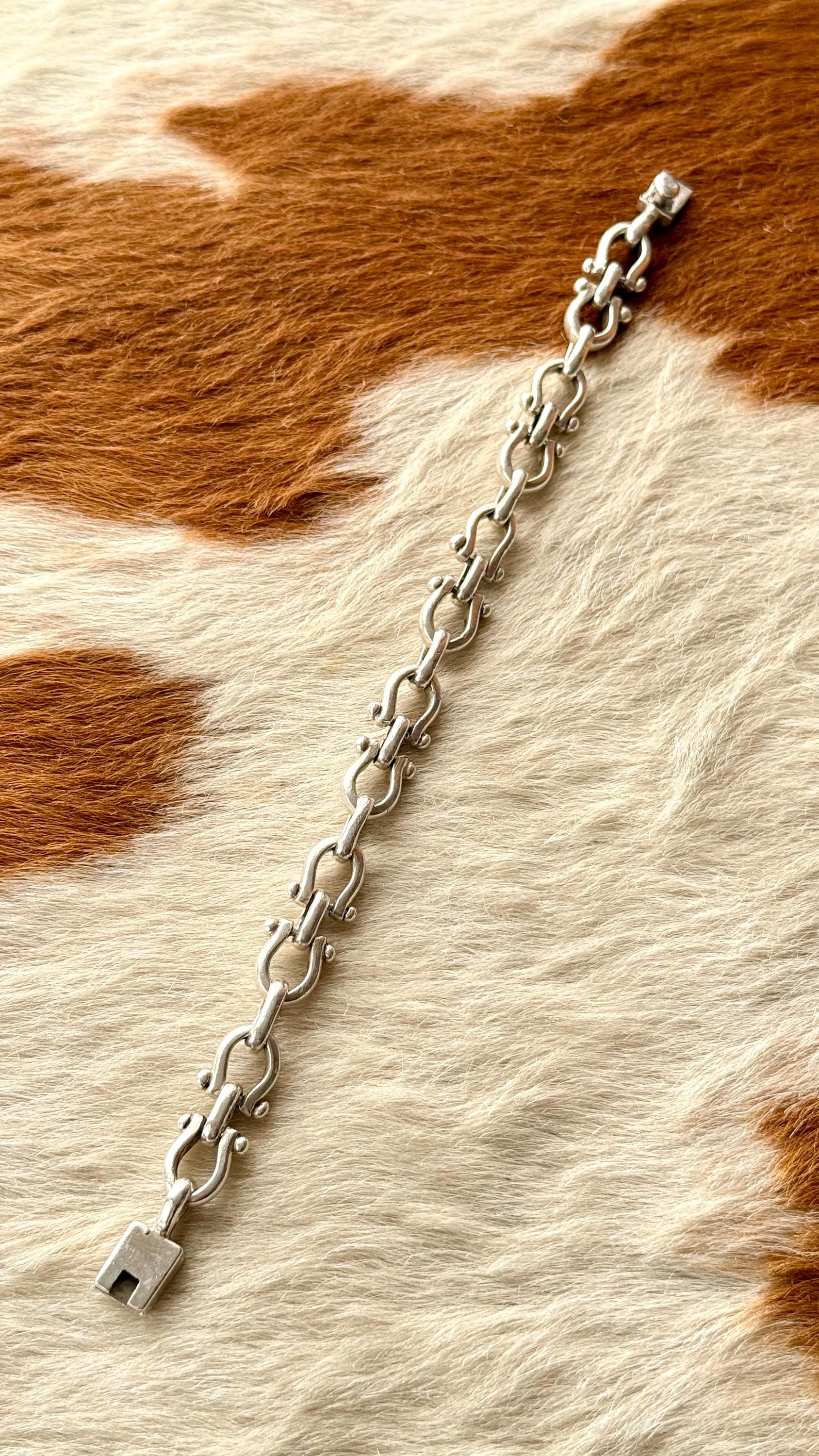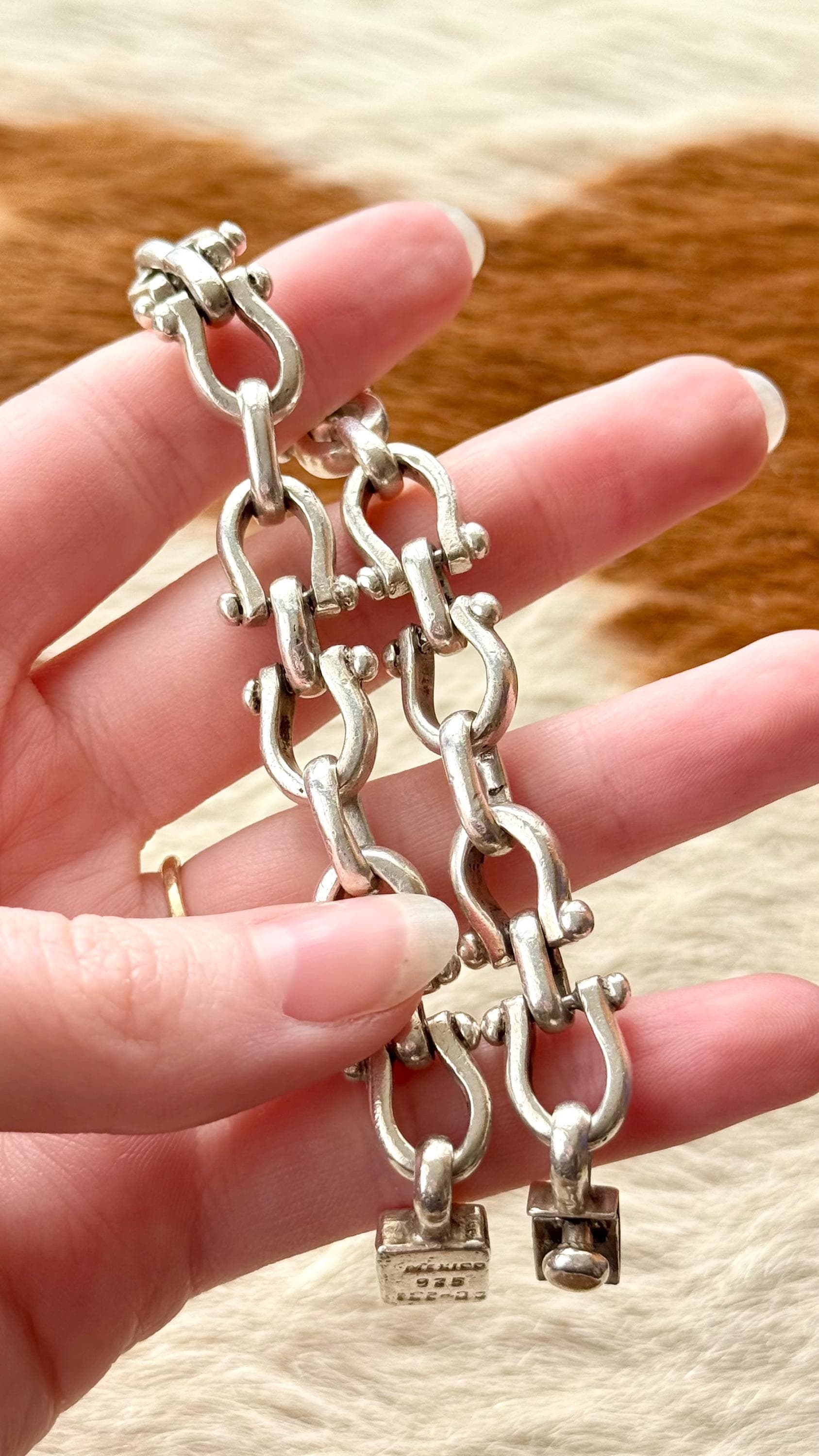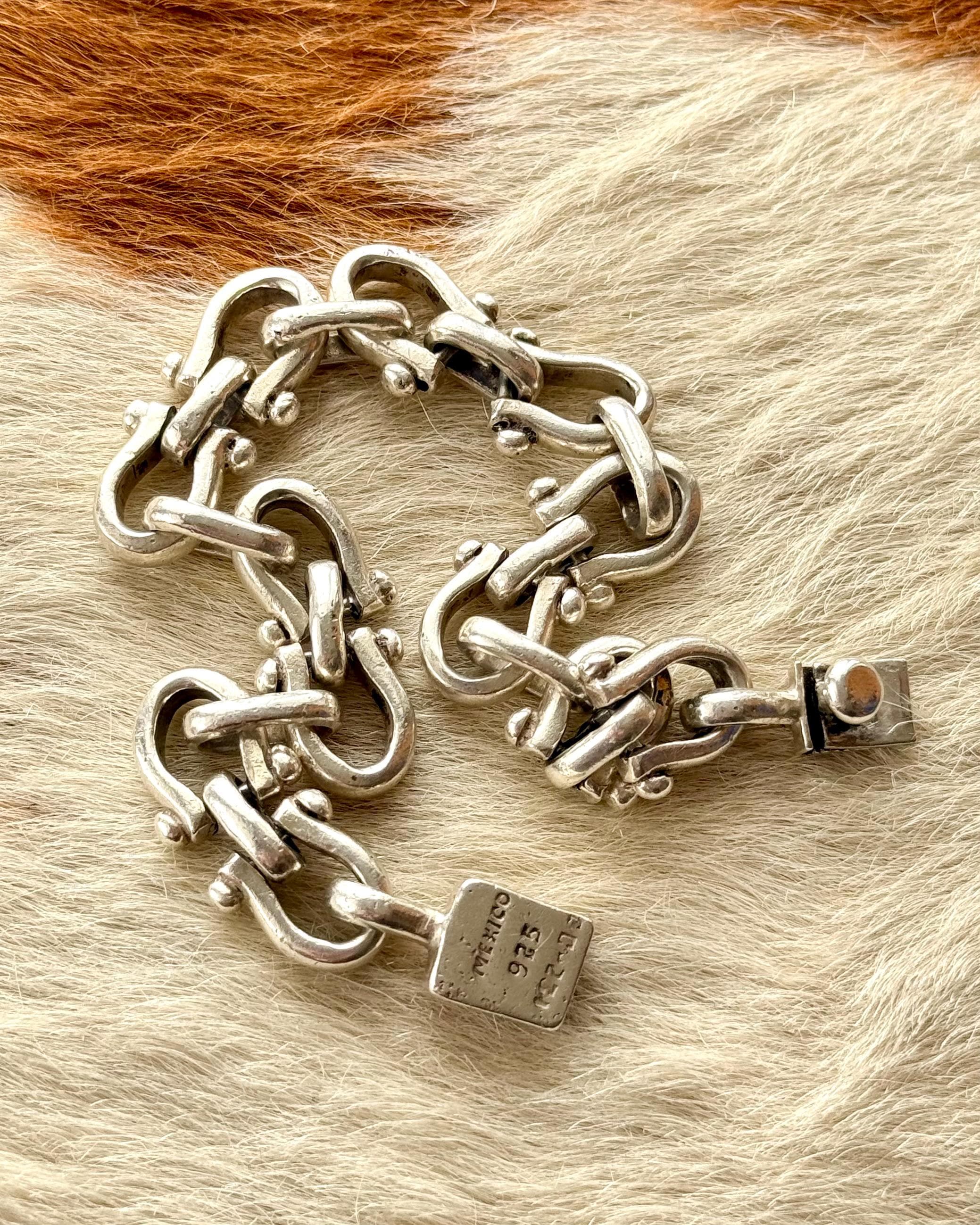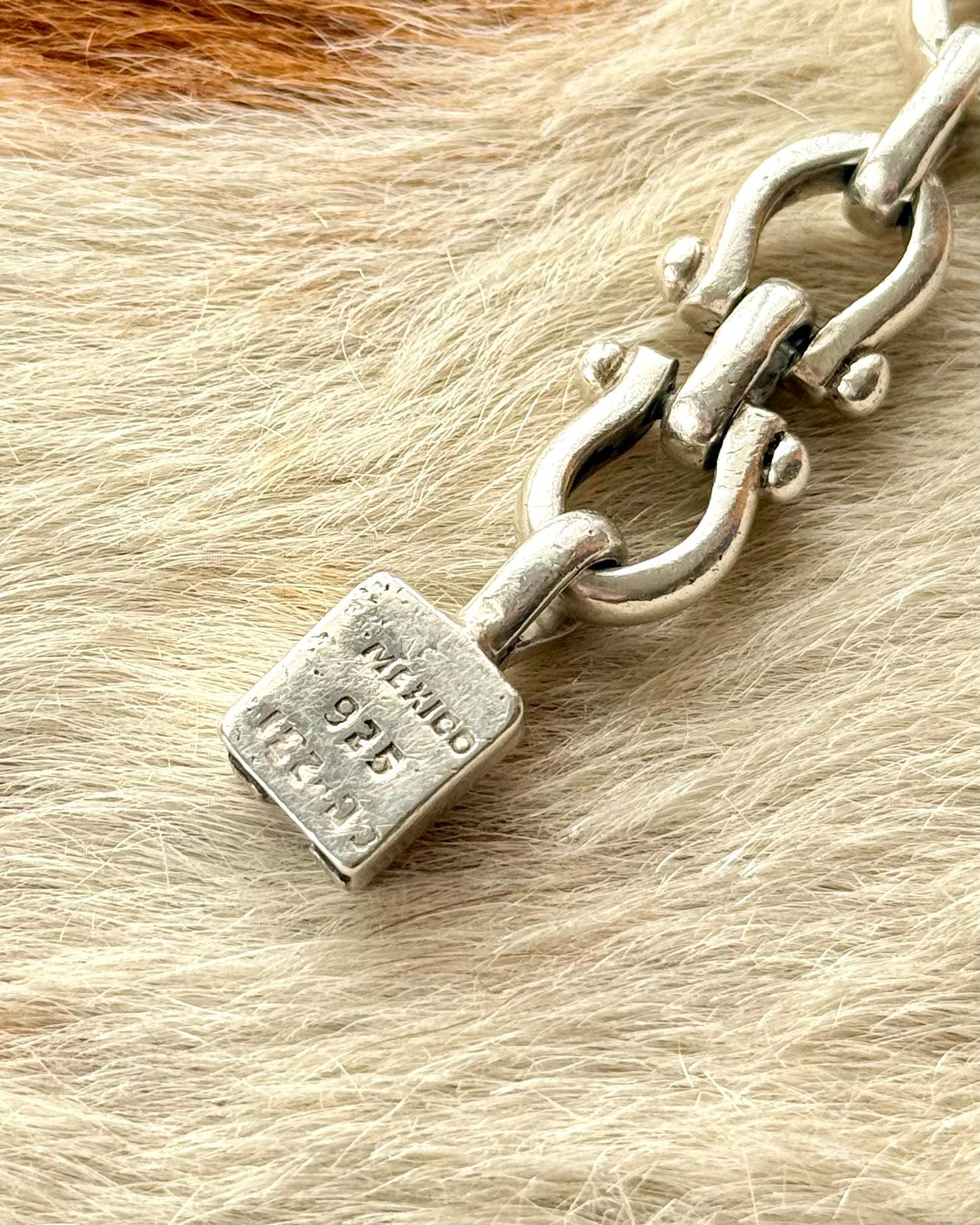 An authentic vintage chain bracelet by Taxco, Mexican silver. a horseshoe shackle style link chain beautifully crafted from solid sterling silver in a nice dense weight with box clasp. an excellent example of high quality silver jewelry and fine craftsmanship that will only get better with age. a great gender neutral style in a longer length best for larger wrists.