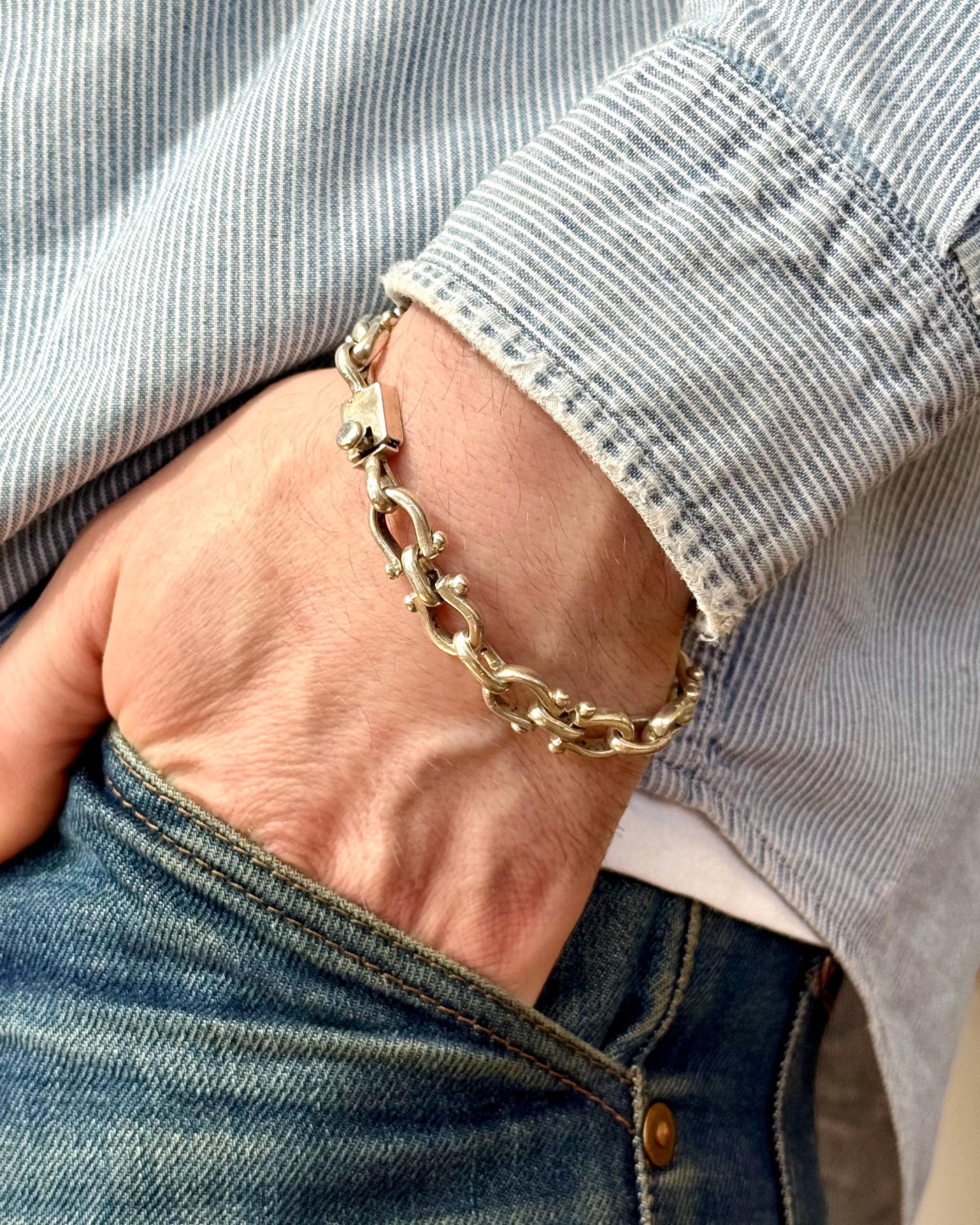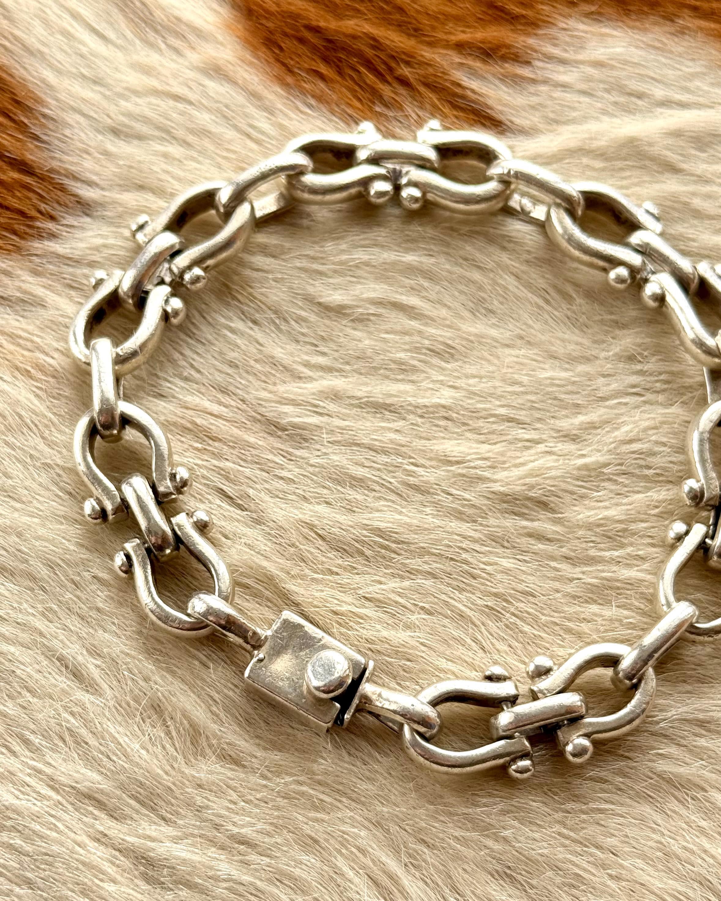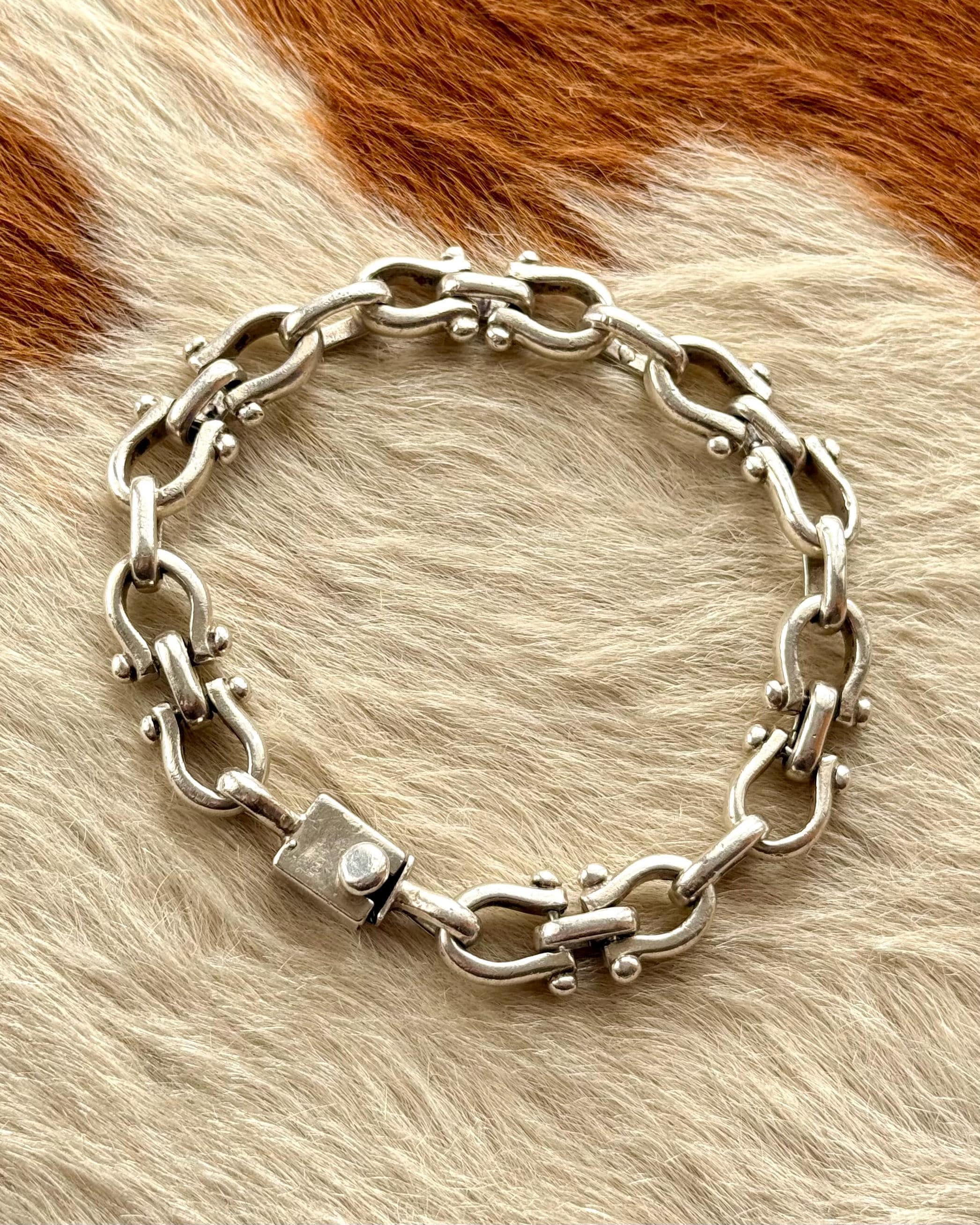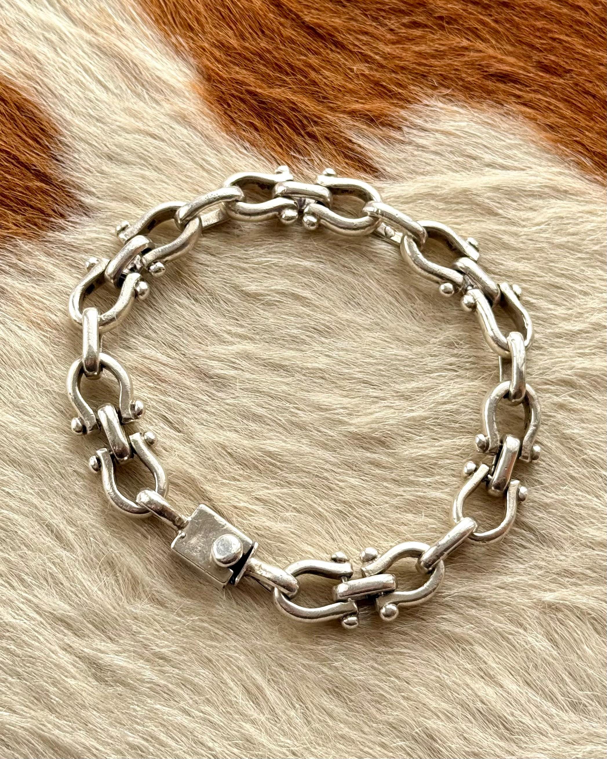An authentic vintage chain bracelet by Taxco, Mexican silver. a horseshoe shackle style link chain beautifully crafted from solid sterling silver in a nice dense weight with box clasp. an excellent example of high quality silver jewelry and fine craftsmanship that will only get better with age. a great gender neutral style in a longer length best for larger wrists.