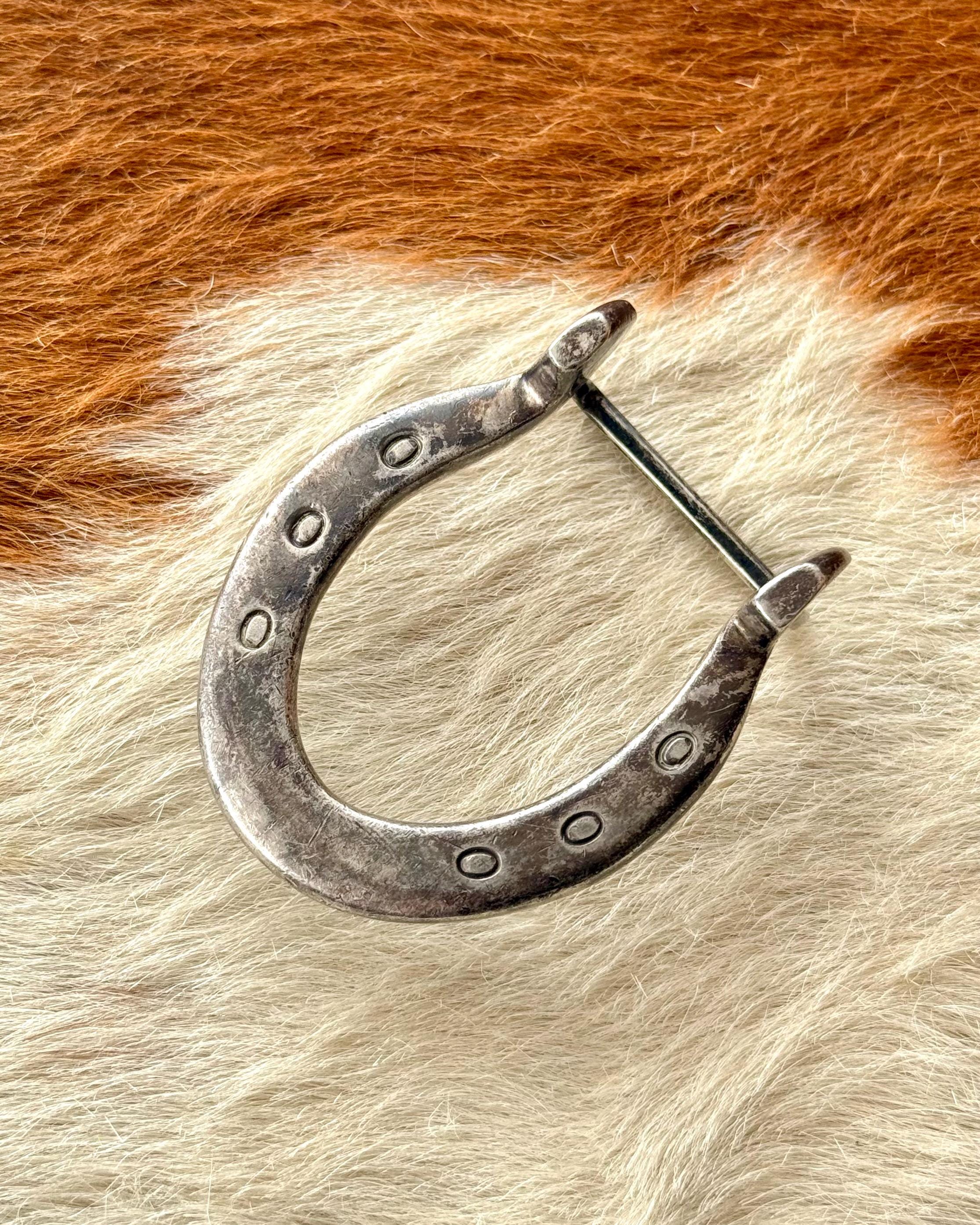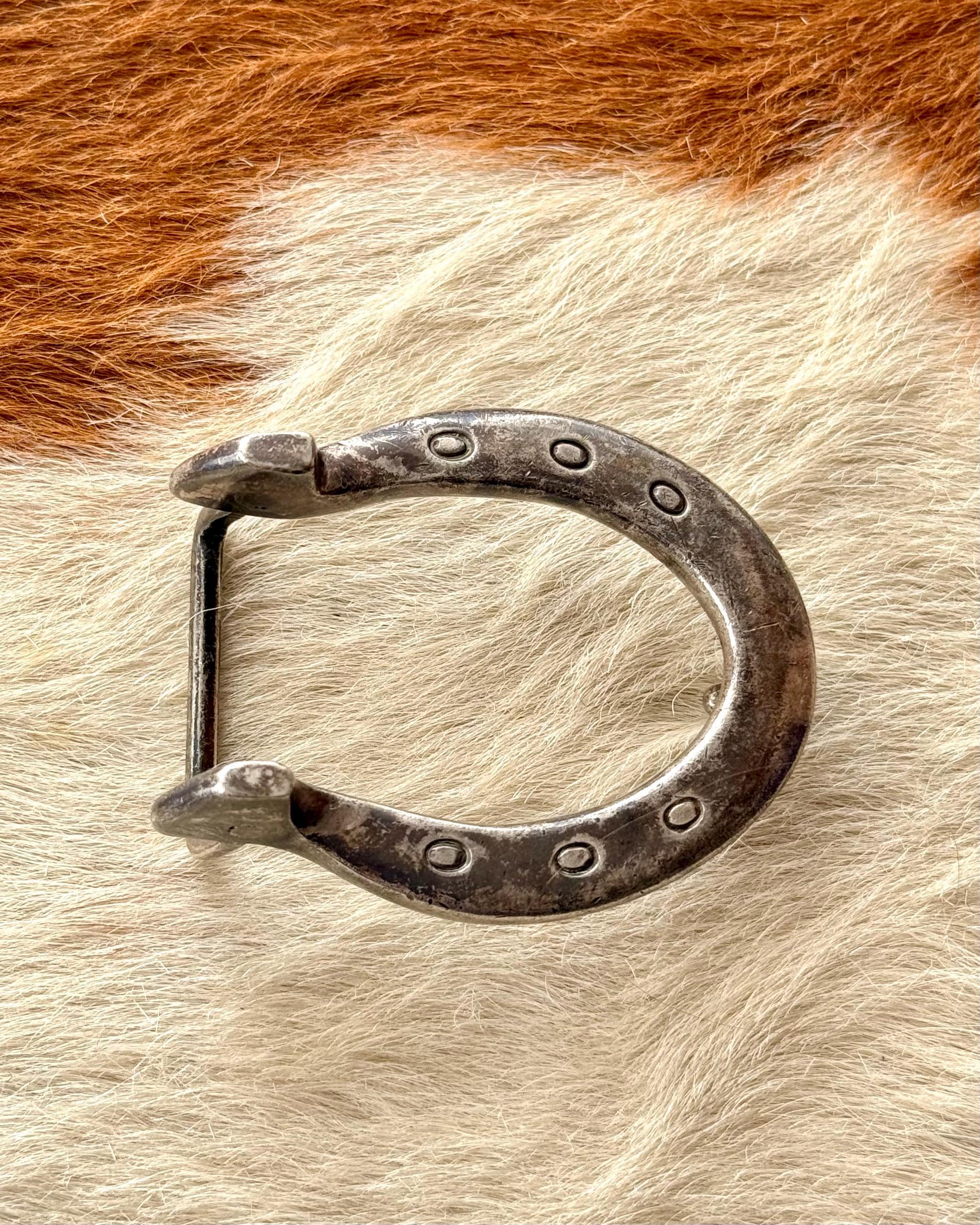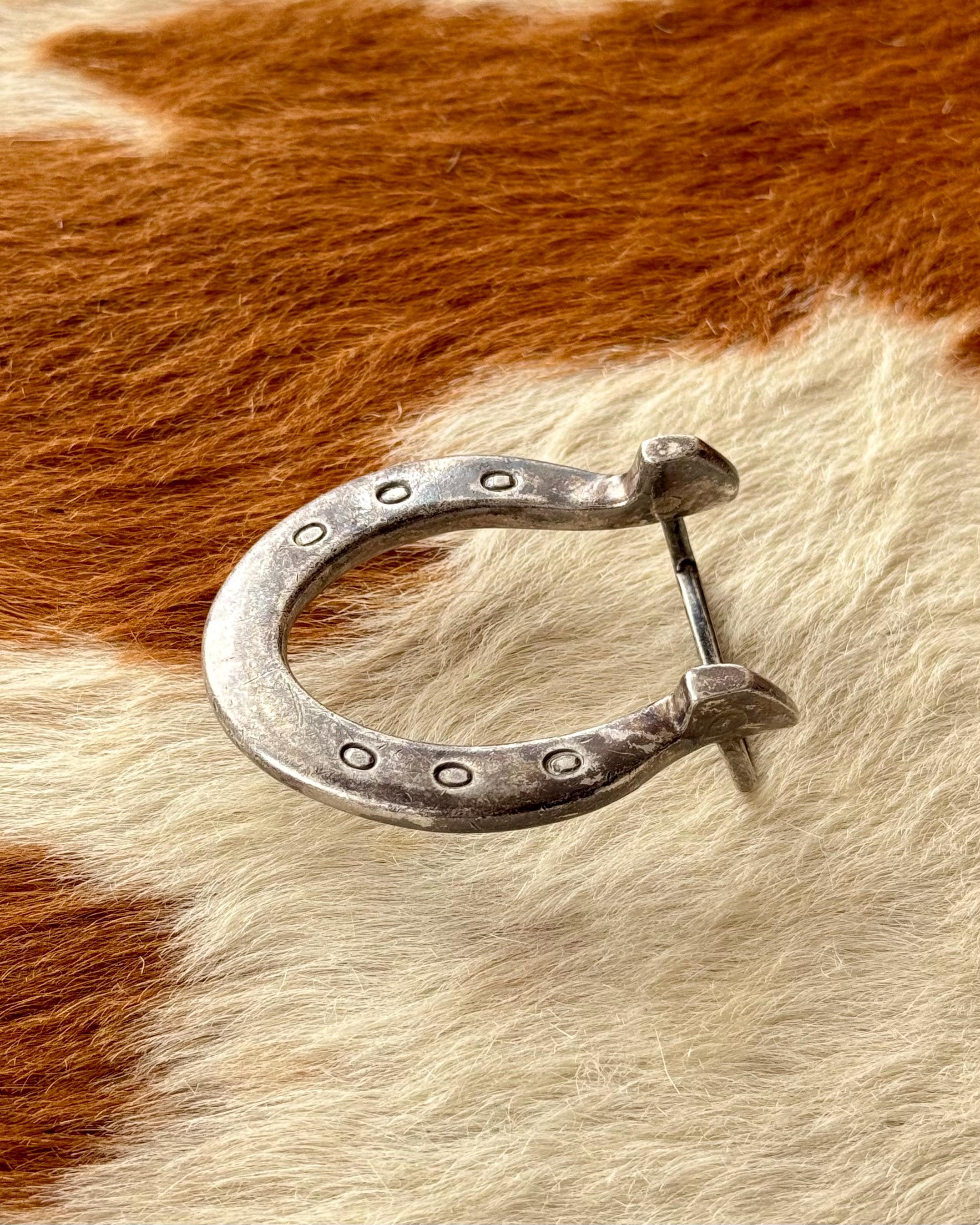 An authentic vintage belt buckle. a classic horseshoe shape with prominent heels and nail holes for an elevated western look. beautifully crafted from solid sterling silver in a nice dense weight. unmarked but has been professionally tested.