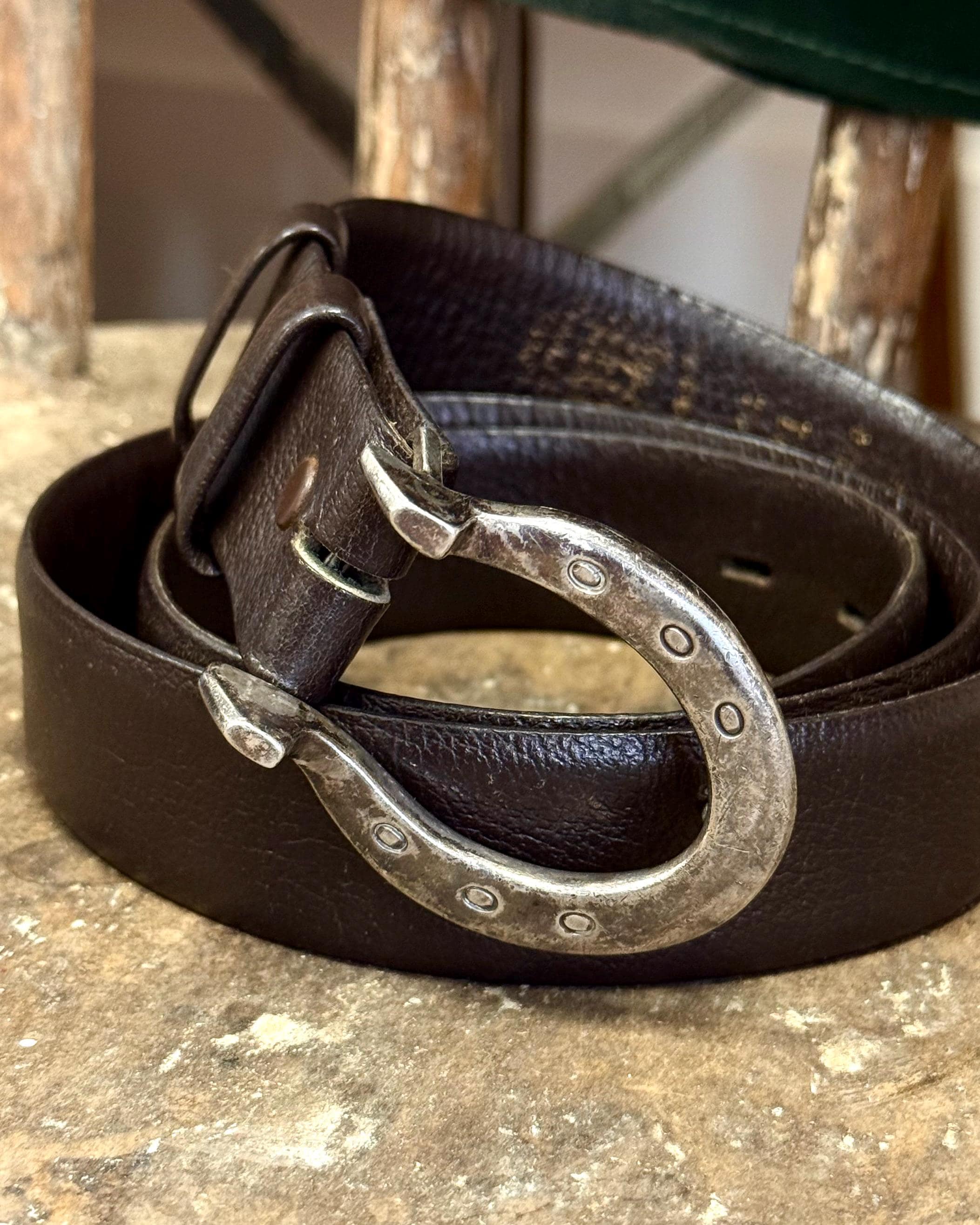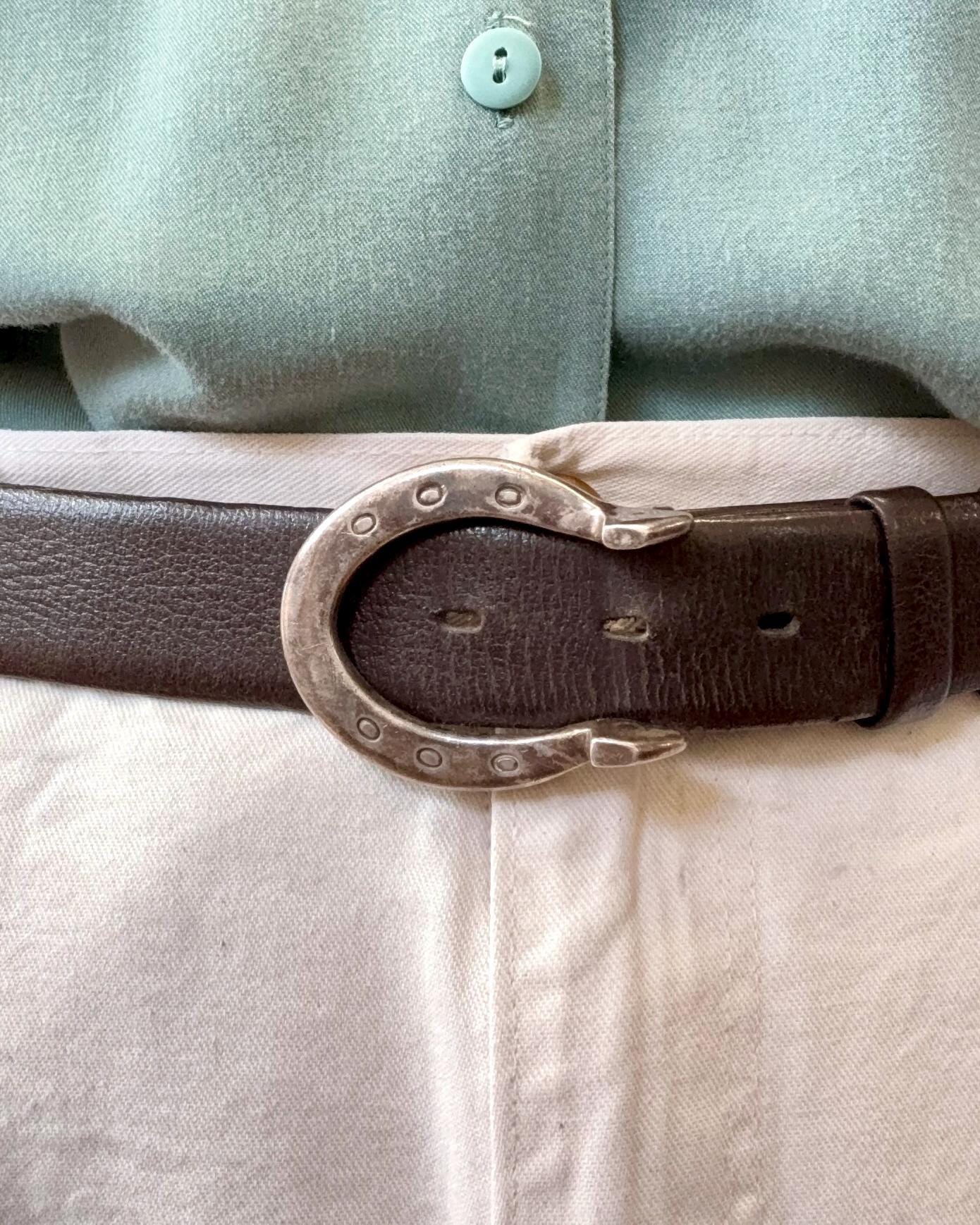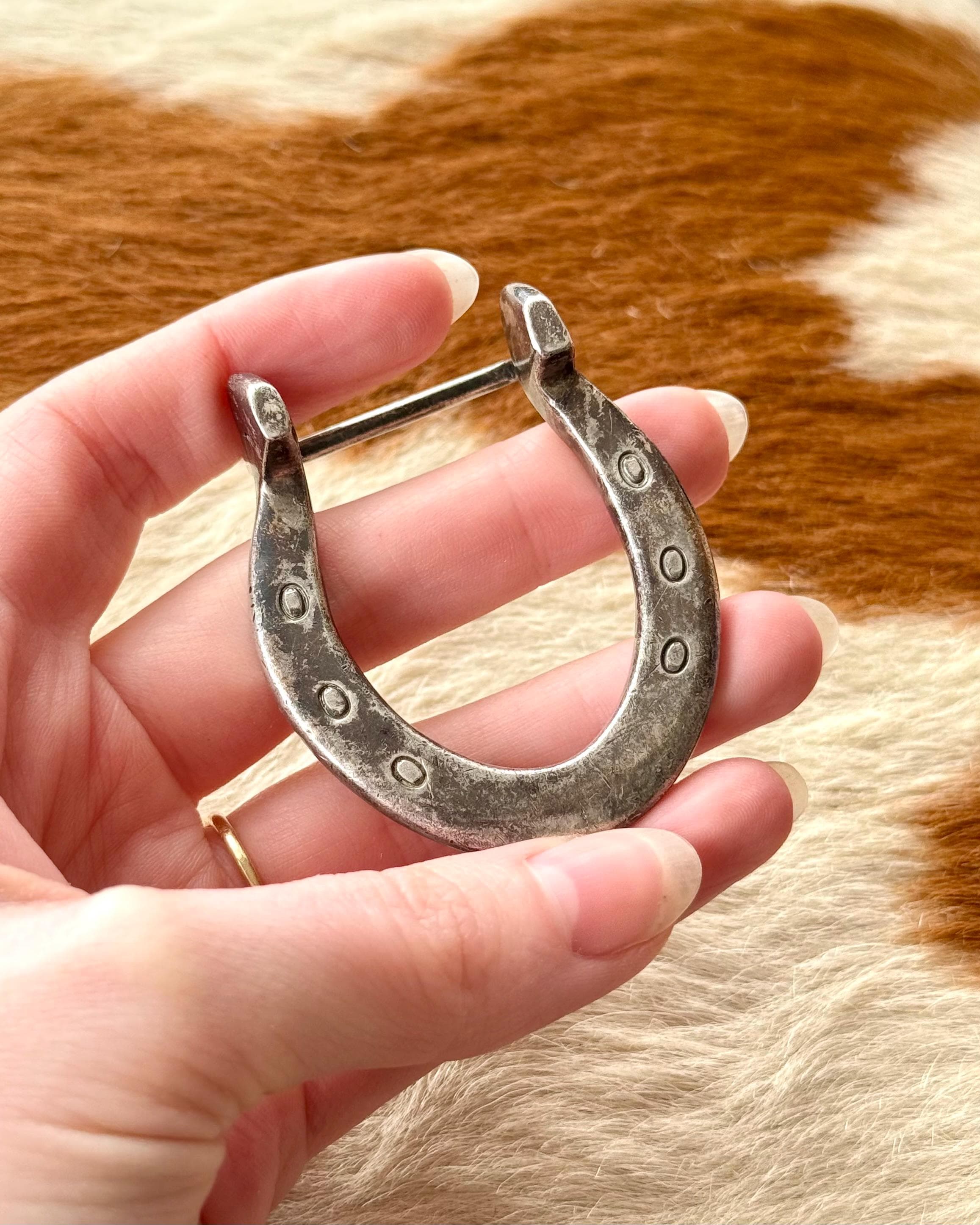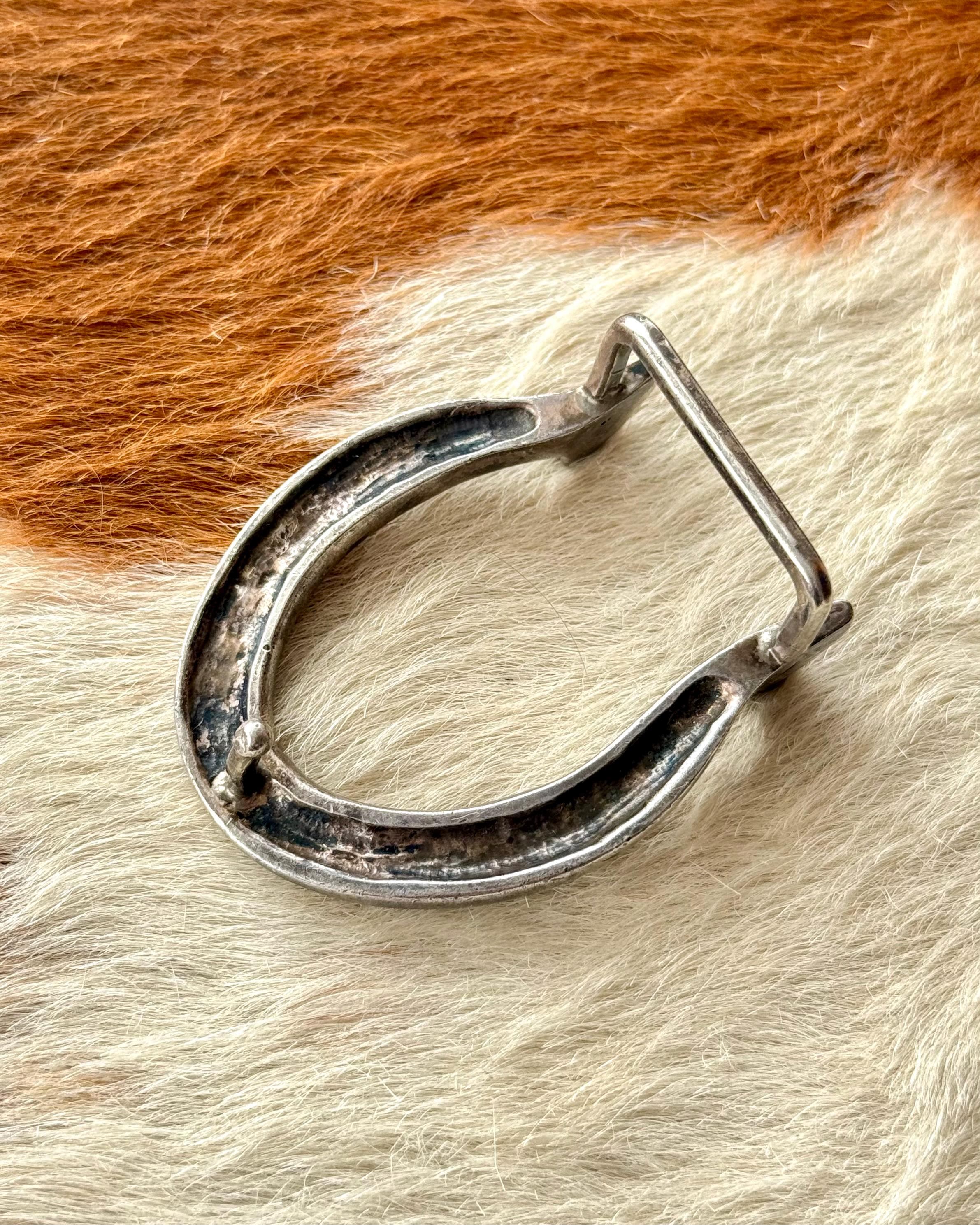 An authentic vintage belt buckle. a classic horseshoe shape with prominent heels and nail holes for an elevated western look. beautifully crafted from solid sterling silver in a nice dense weight. unmarked but has been professionally tested.