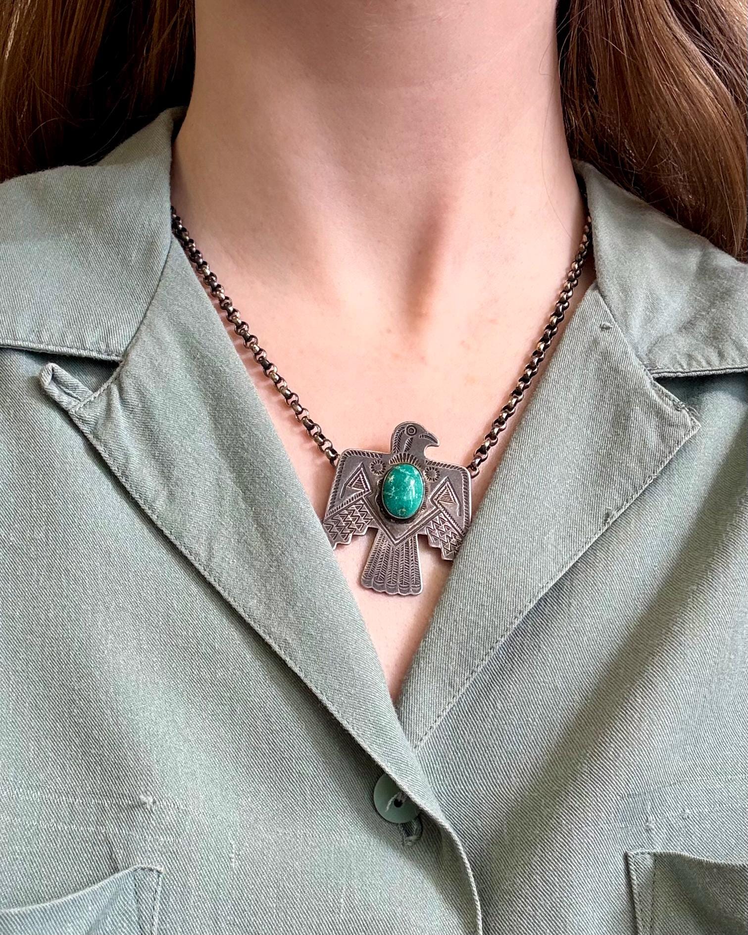 chain shown styled with a Navajo Thunderbird brooch as pendant,