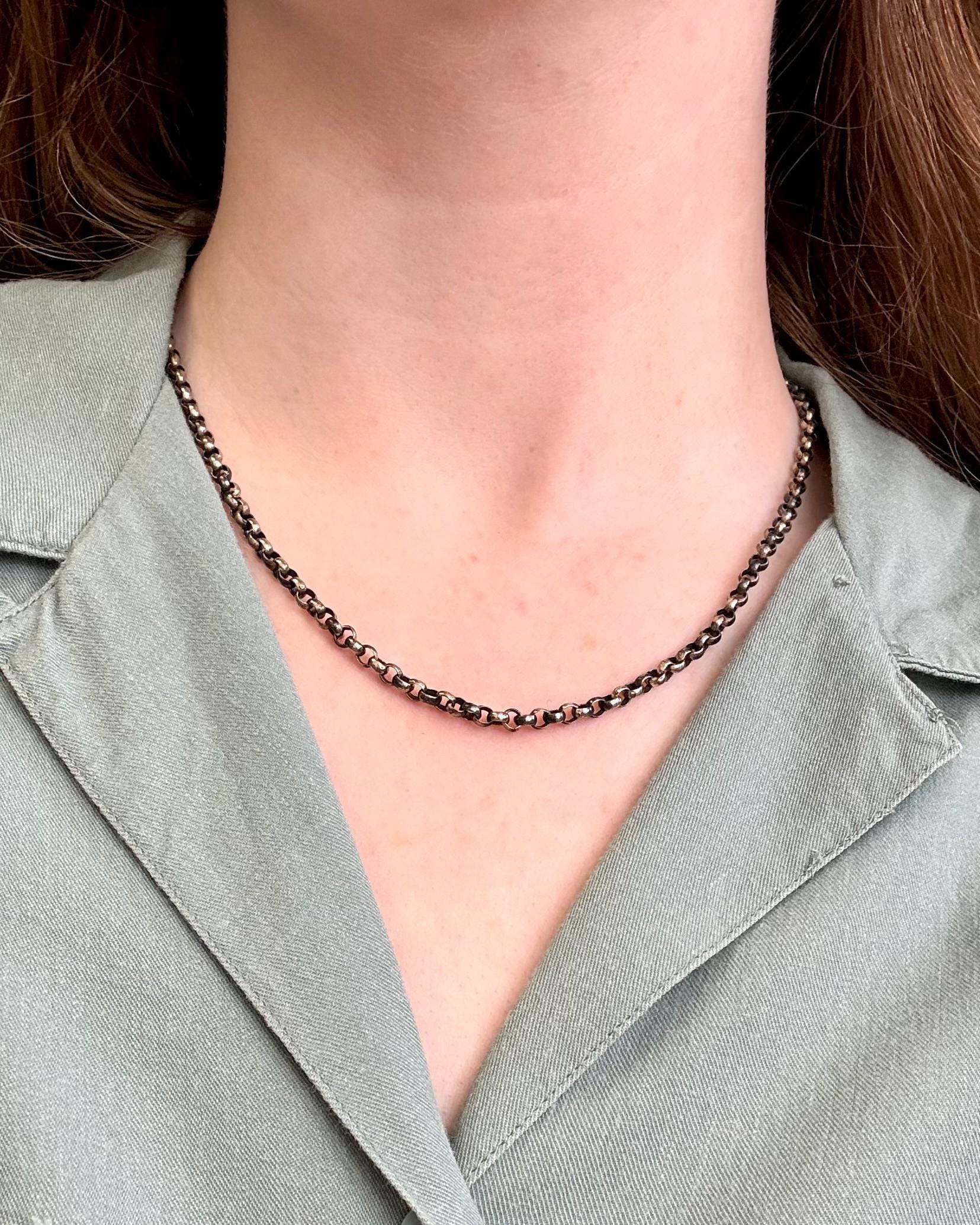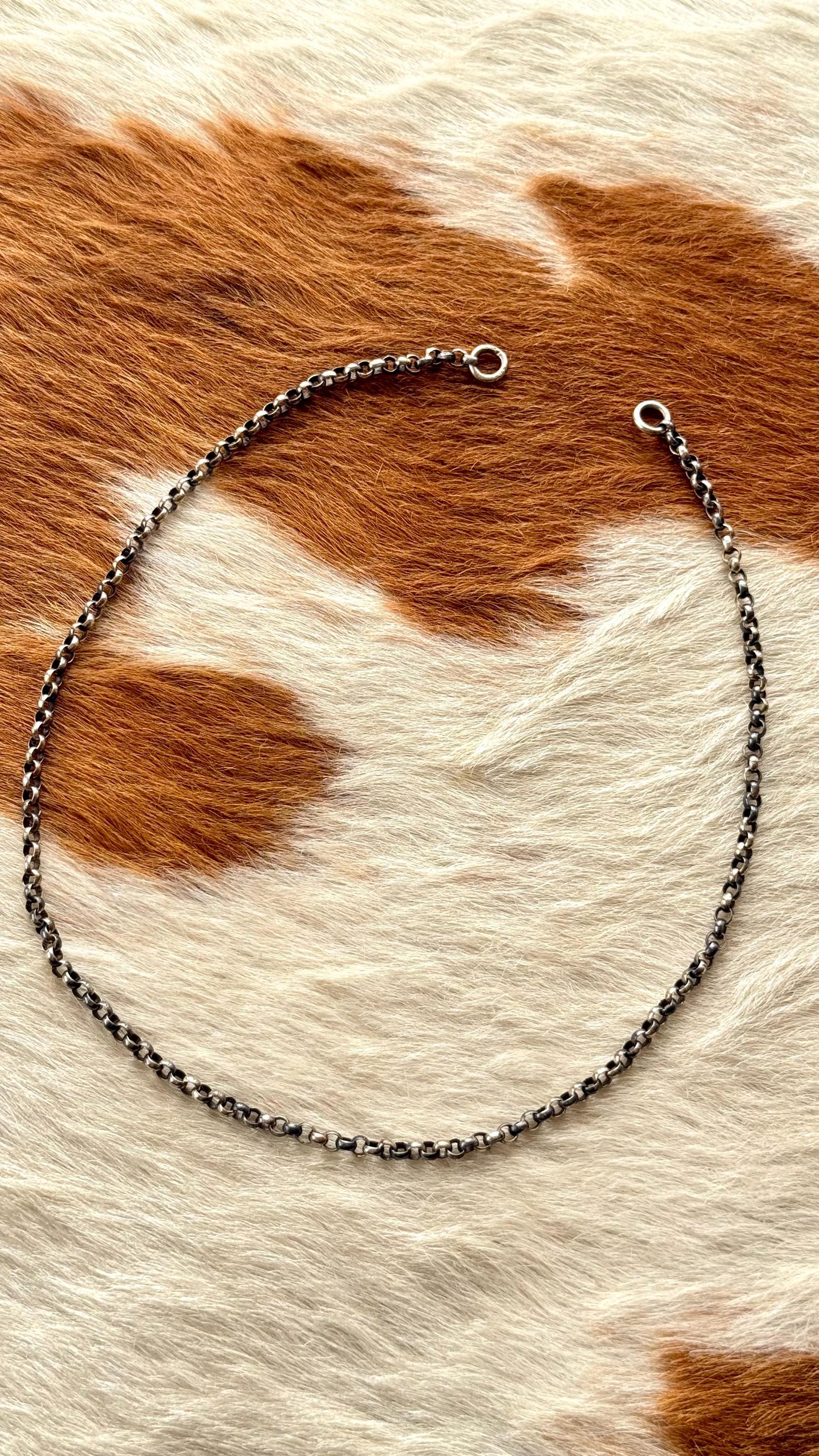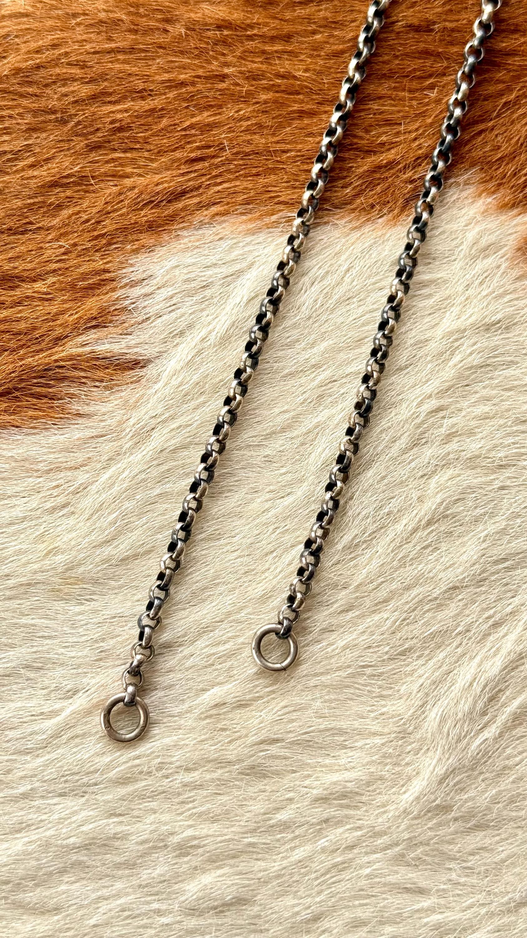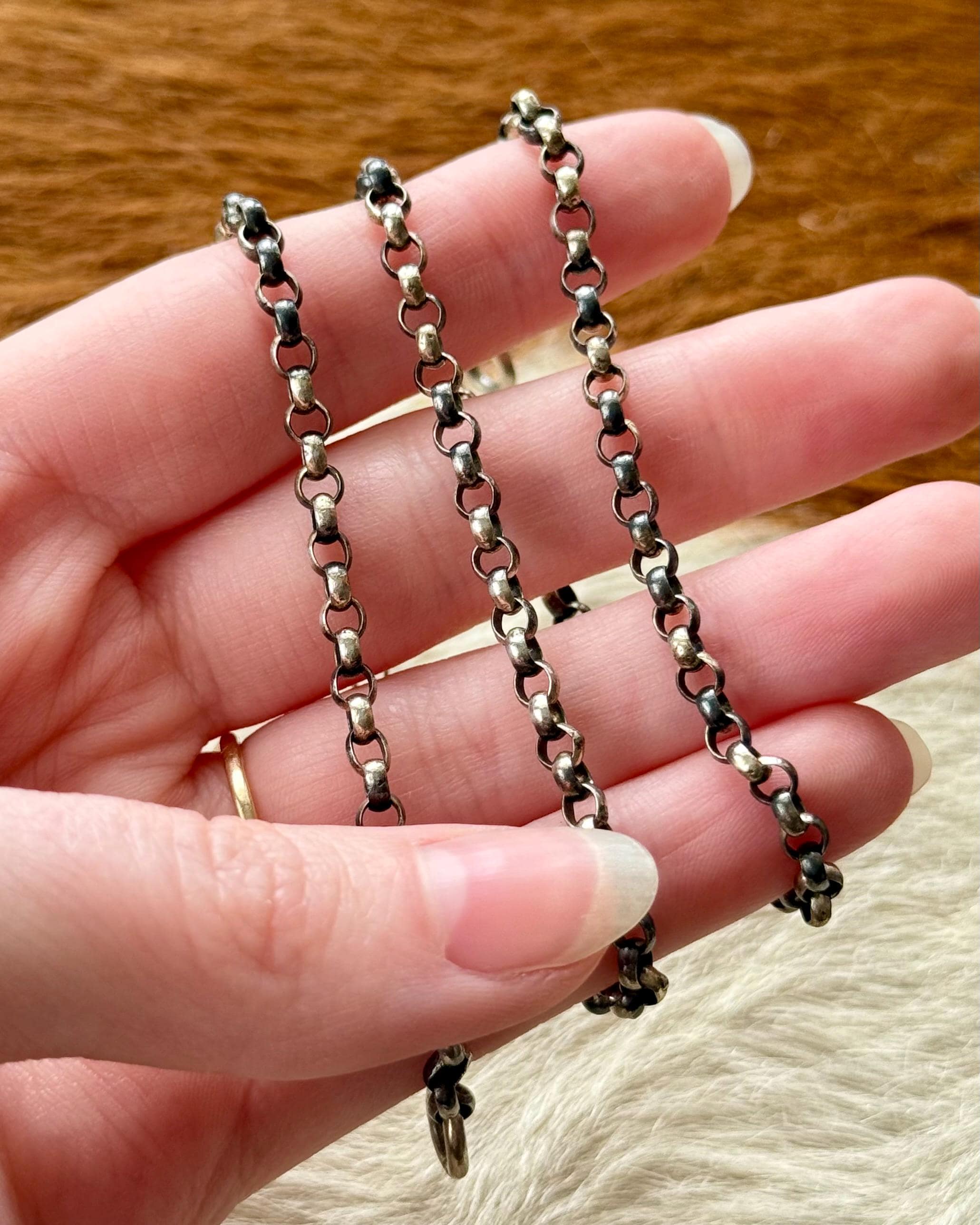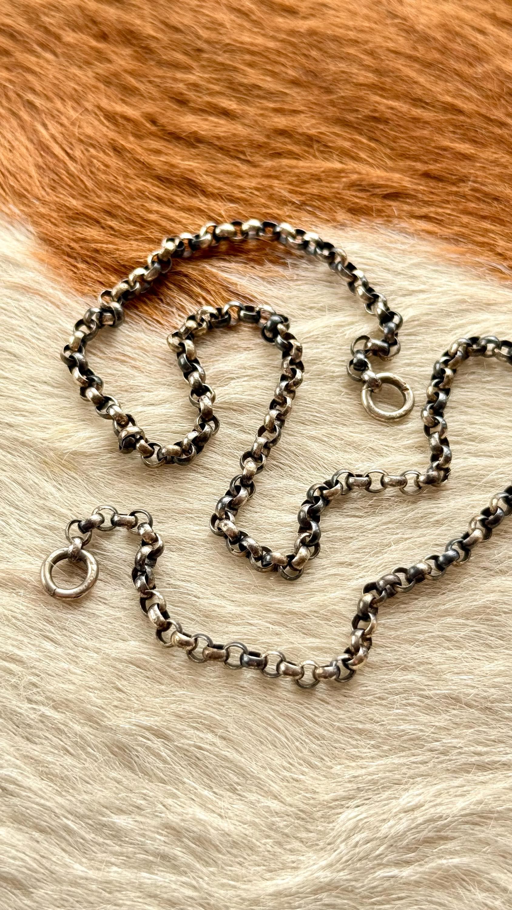 An authentic vintage chain necklace. this sought after rolo style antique chain was reclaimed by us from a broken Art Deco era handbag closure. what was originally a strap is now an excellent one of a kind antique piece of sterling silver jewelry. both ends of the chain still have their original ring findings which now function as the perfect fasteners for a lock, carabiner or brooch as a pendant. but of course a proper clasp can be added of your own choosing. you will receive a chain ONLY. unmarked but has been professionally tested.