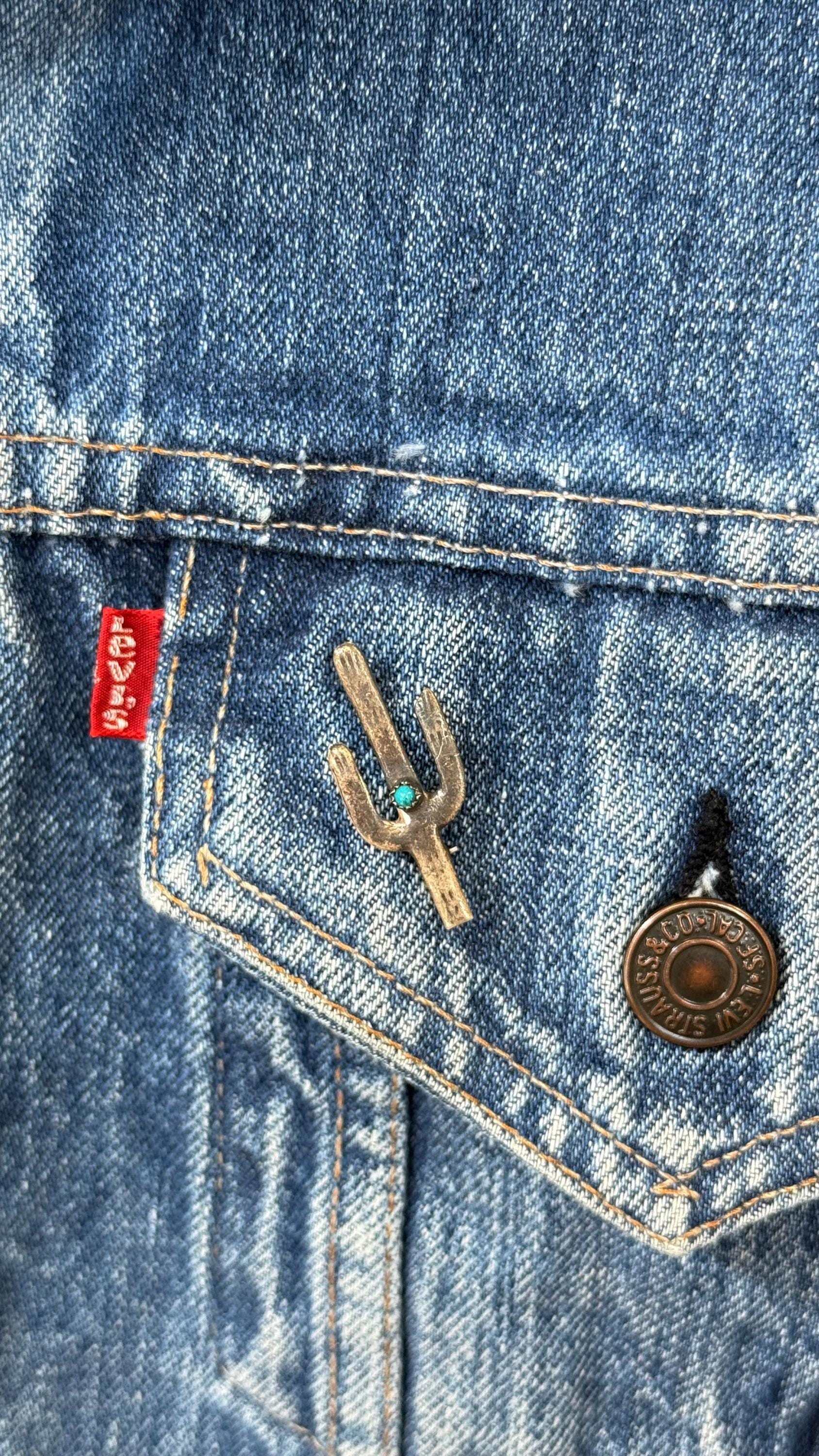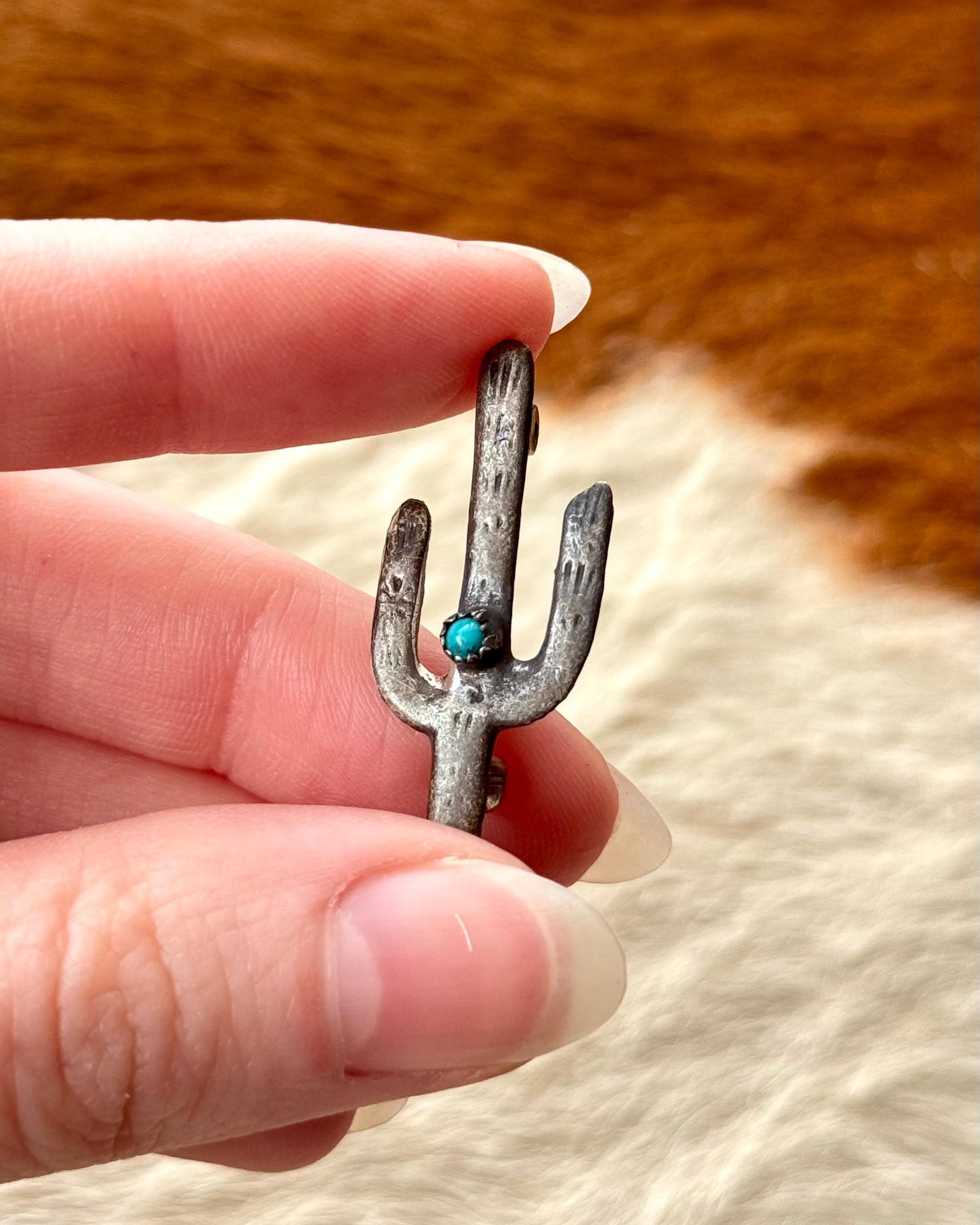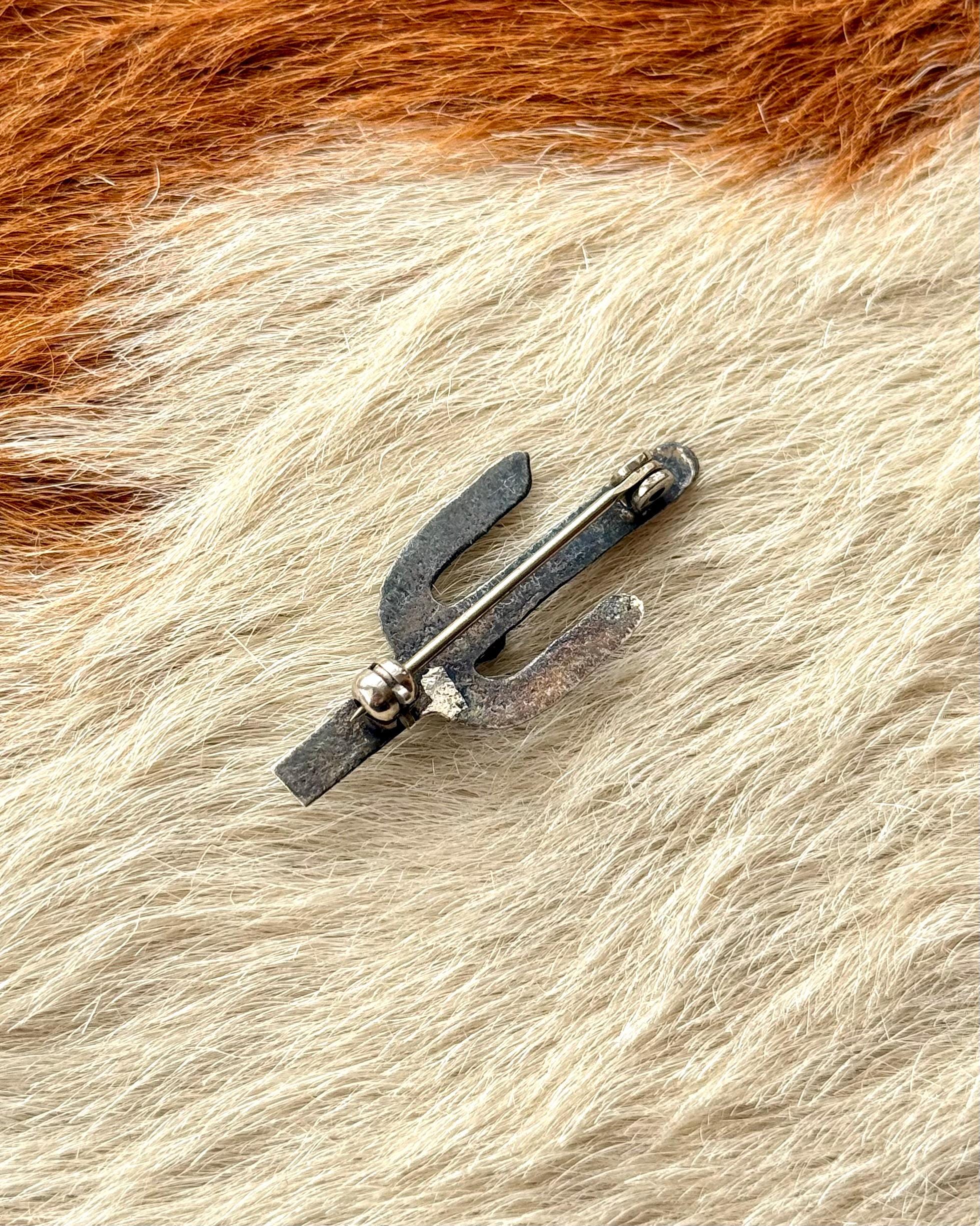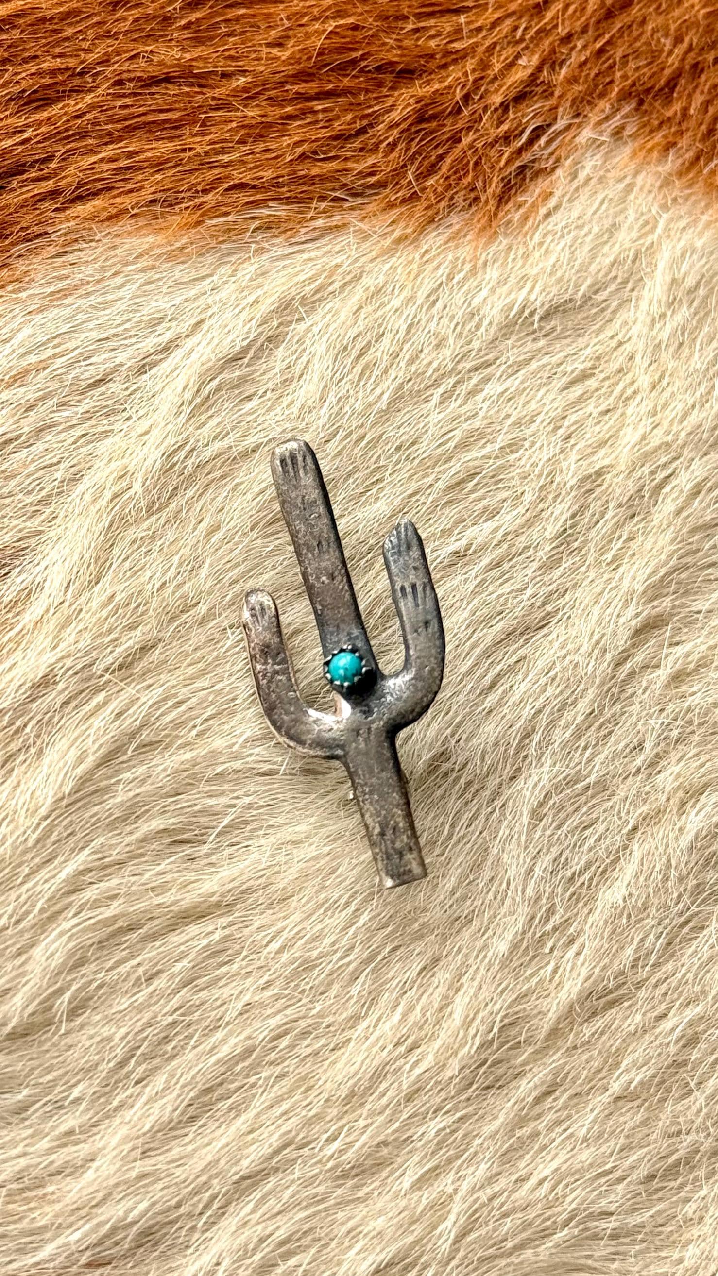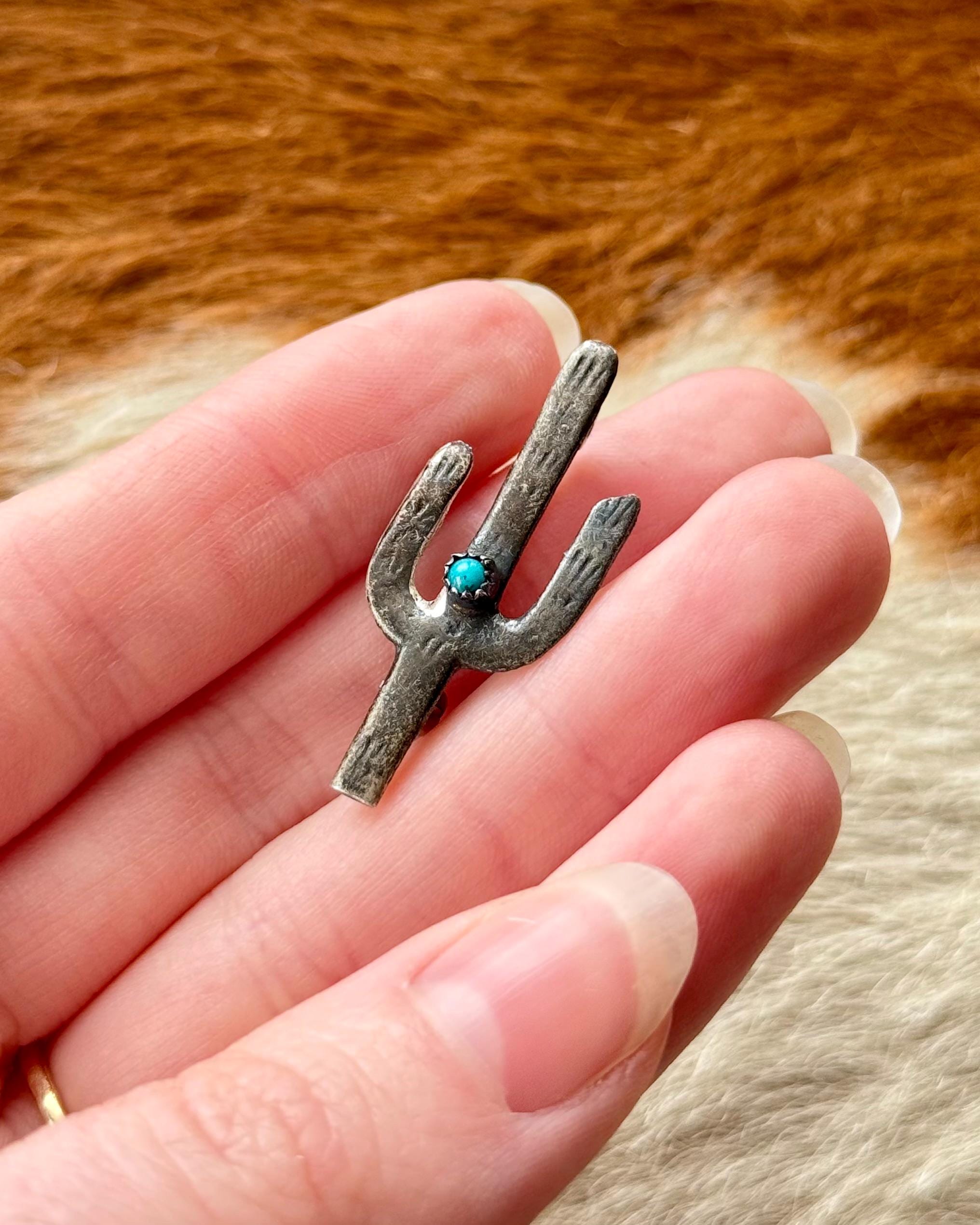 An authentic vintage pin brooch. crafted of sterling silver with a natural turquoise stone center. a classic cactus shape with hand stamped or etched detail. a fun southwestern motif. a smaller size great for styling on a jacket lapel, hat band, handbag, etc. unmarked Navajo jewelry.