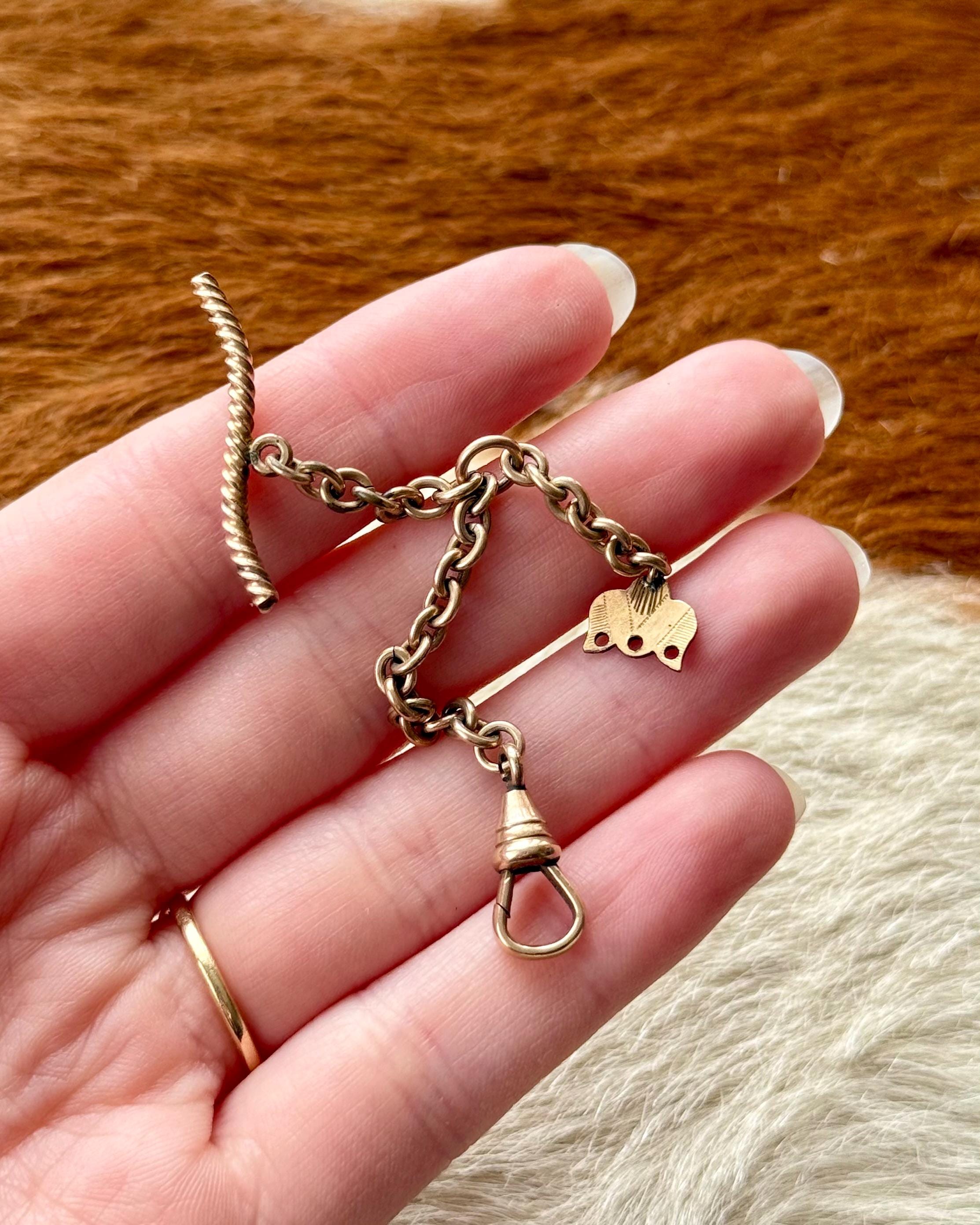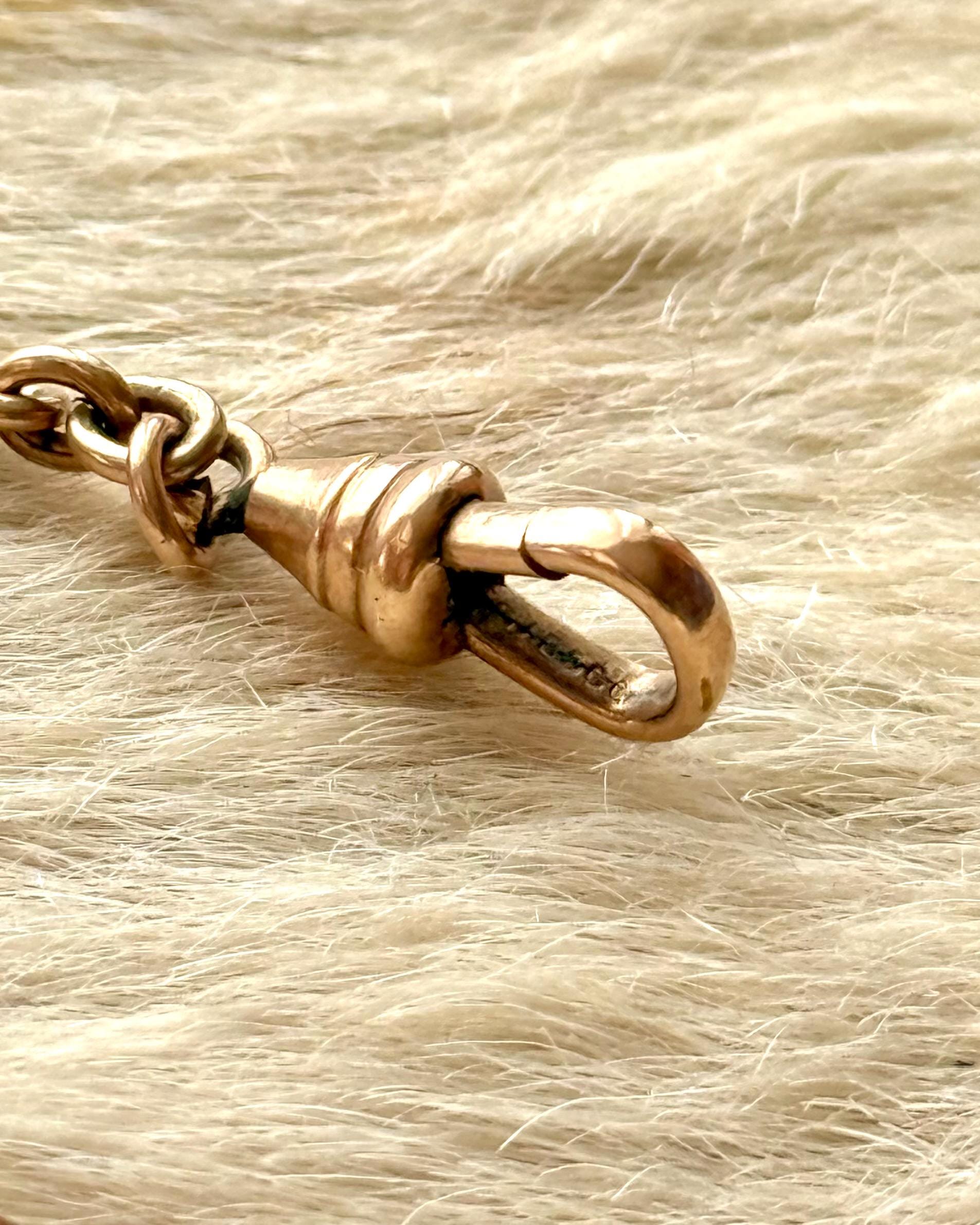 Authentic antique watch chain finding. a three part piece featuring a swivel dog clip fastener, rope T bar toggle, and another tulip shaped attachment to fix additional chains or charms. this piece would have originally been found on a longer chain to wear with a pocket watch. for modern styling, assemble with jewelry of choice to create your own personalized necklace or other accessory! makers marke located inside of the dog clip