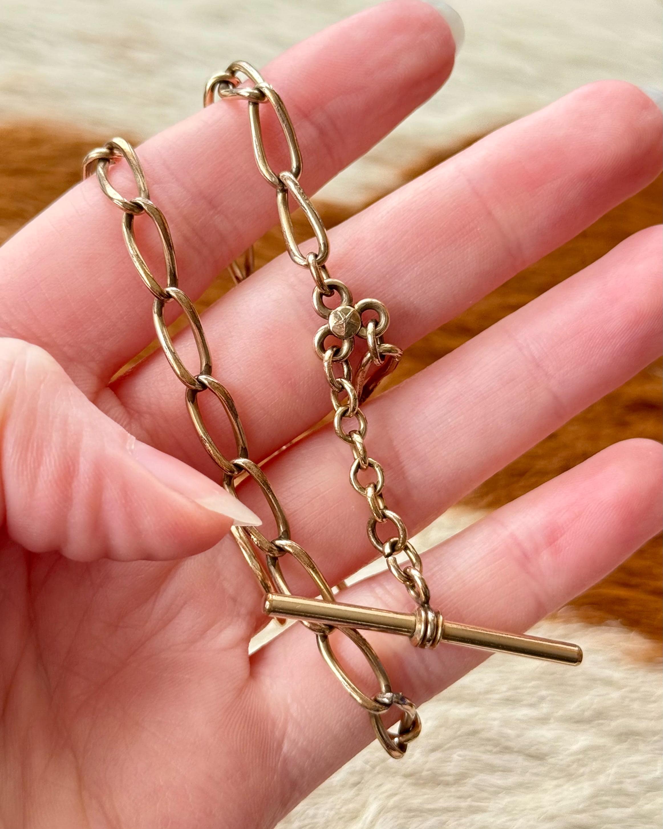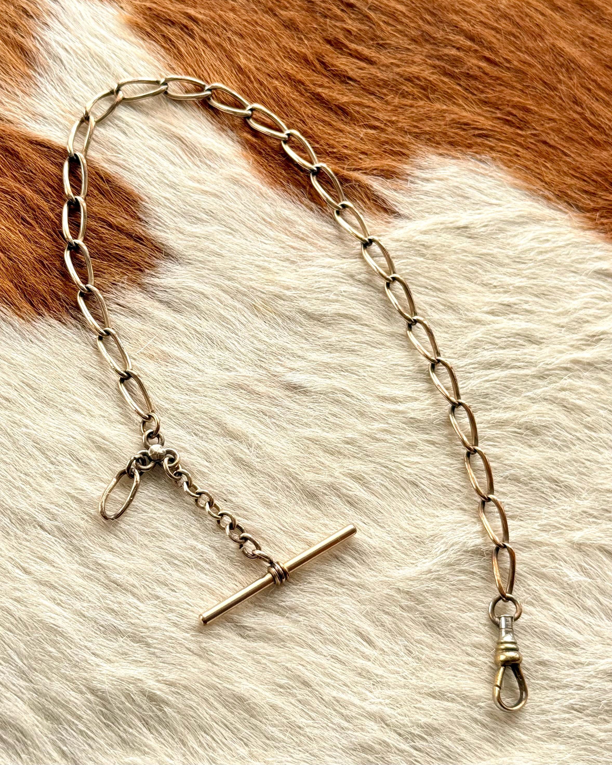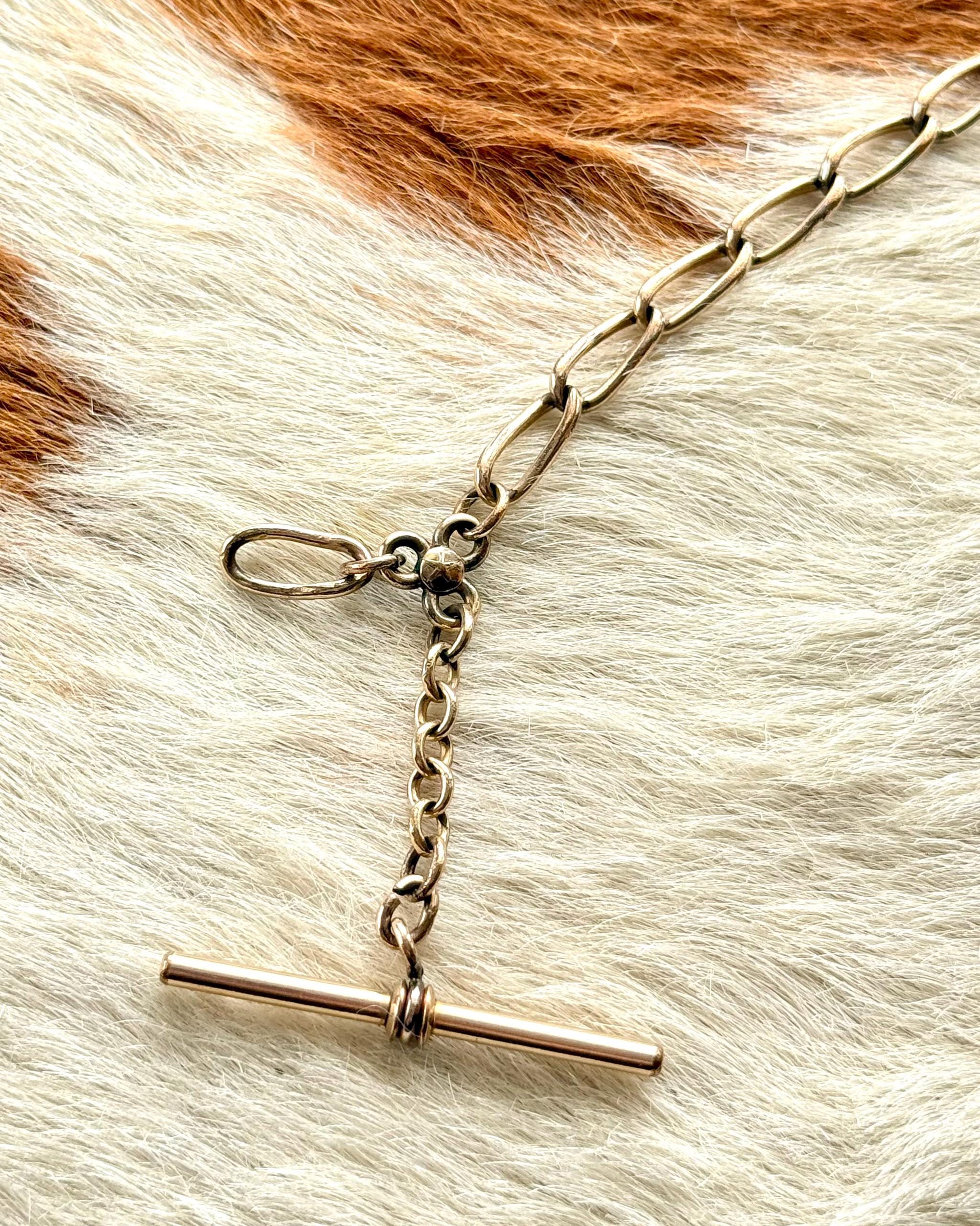 Authentic antique watch chain jewelry. a multi part piece featuring an open oval chain, classic Albert T bar toggle, and triple ring clover shaped attachment with star motif to fix additional chains or charms. this piece would have originally been used to wear with a pocket watch. for modern styling, assemble with jewelry of choice to create your own personalized necklace or other accessory!