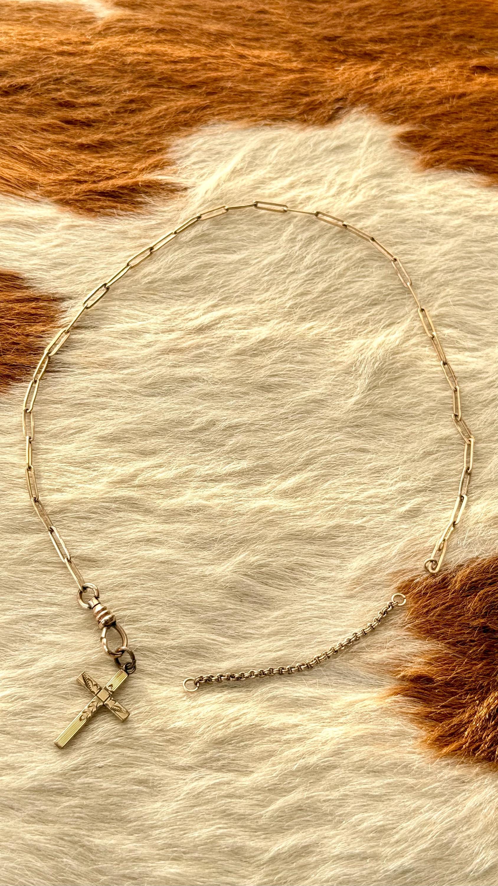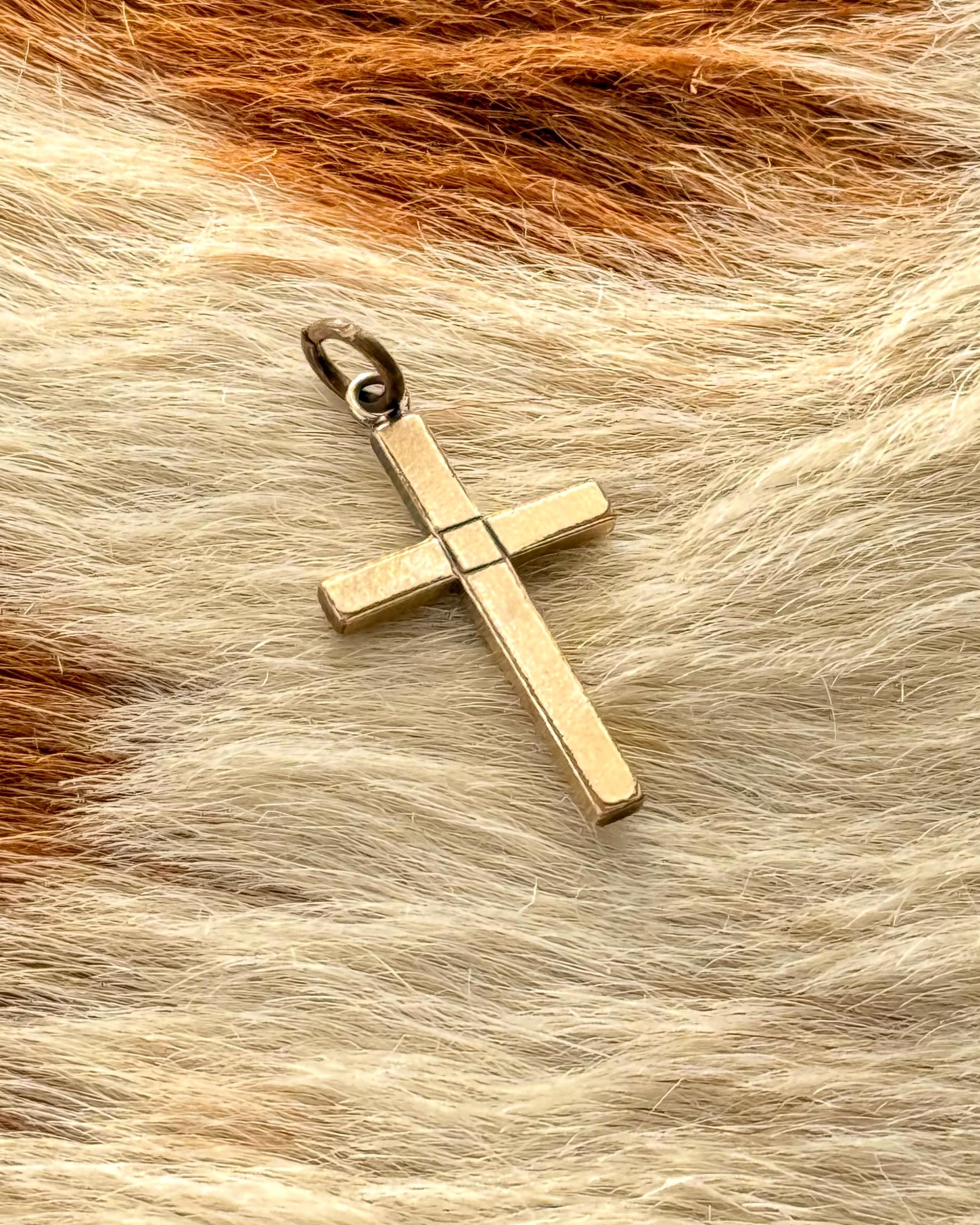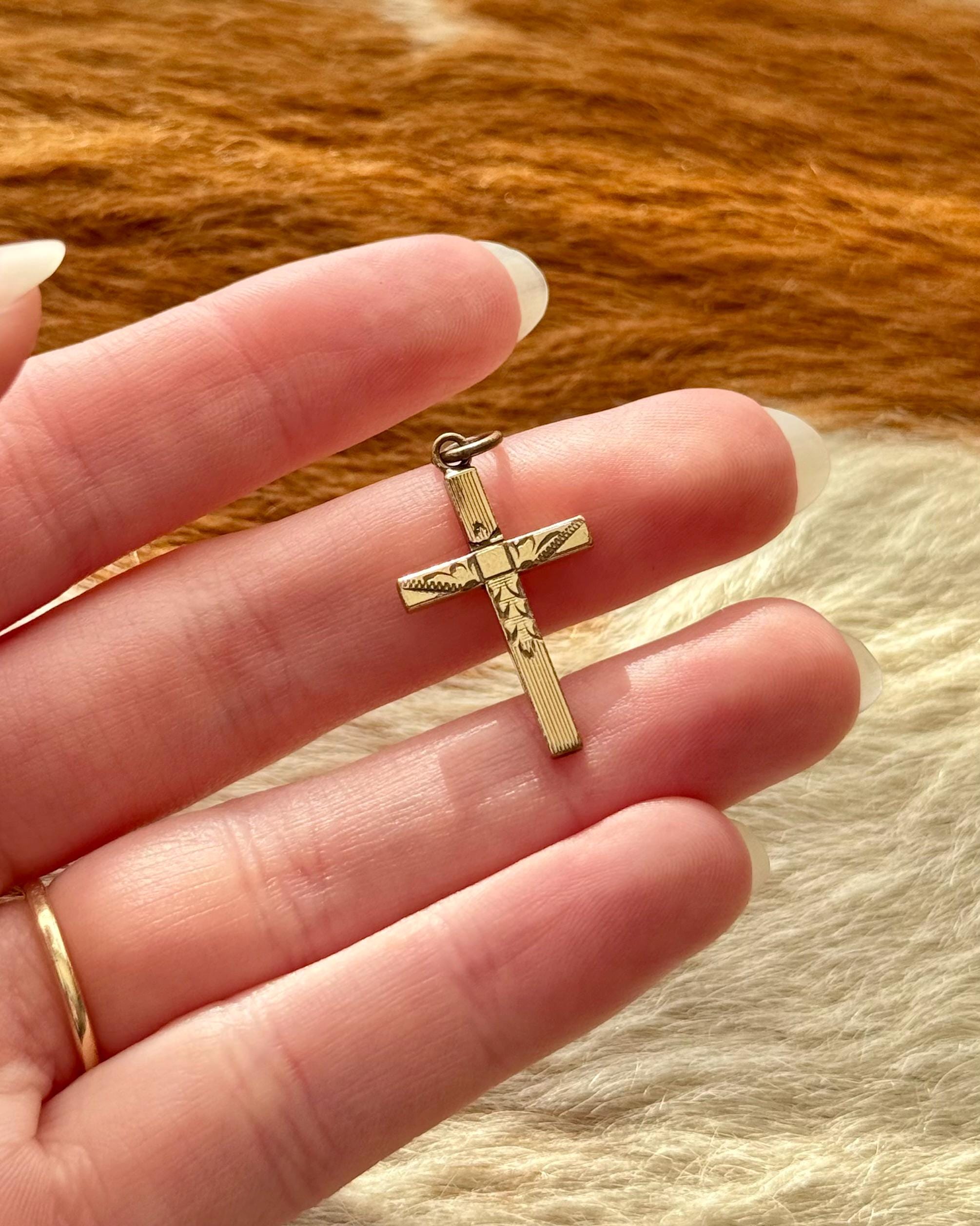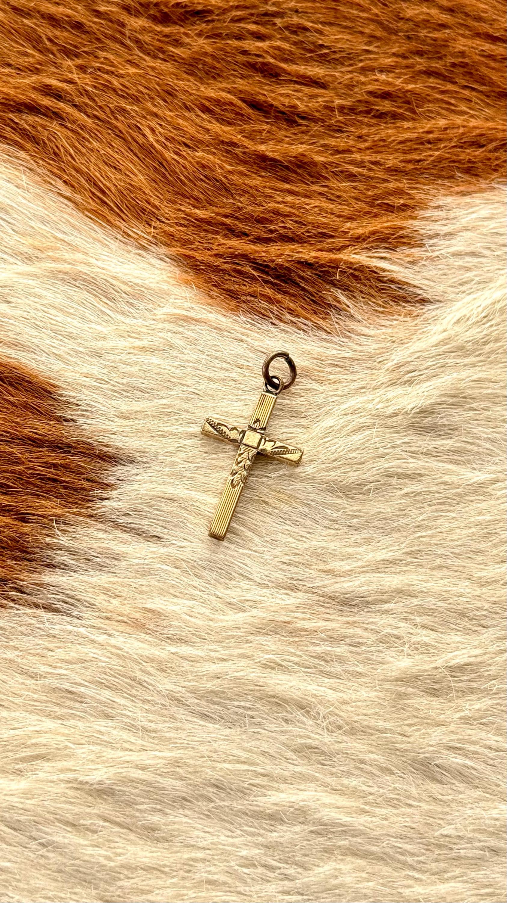 An authentic vintage cross charm pendant. a classic cross shape with etched design and textured stripe detail. could alos be worn showing the reverse side - flat with a squared lines. includes its original jump ring to string onto your own jewelry of choice.