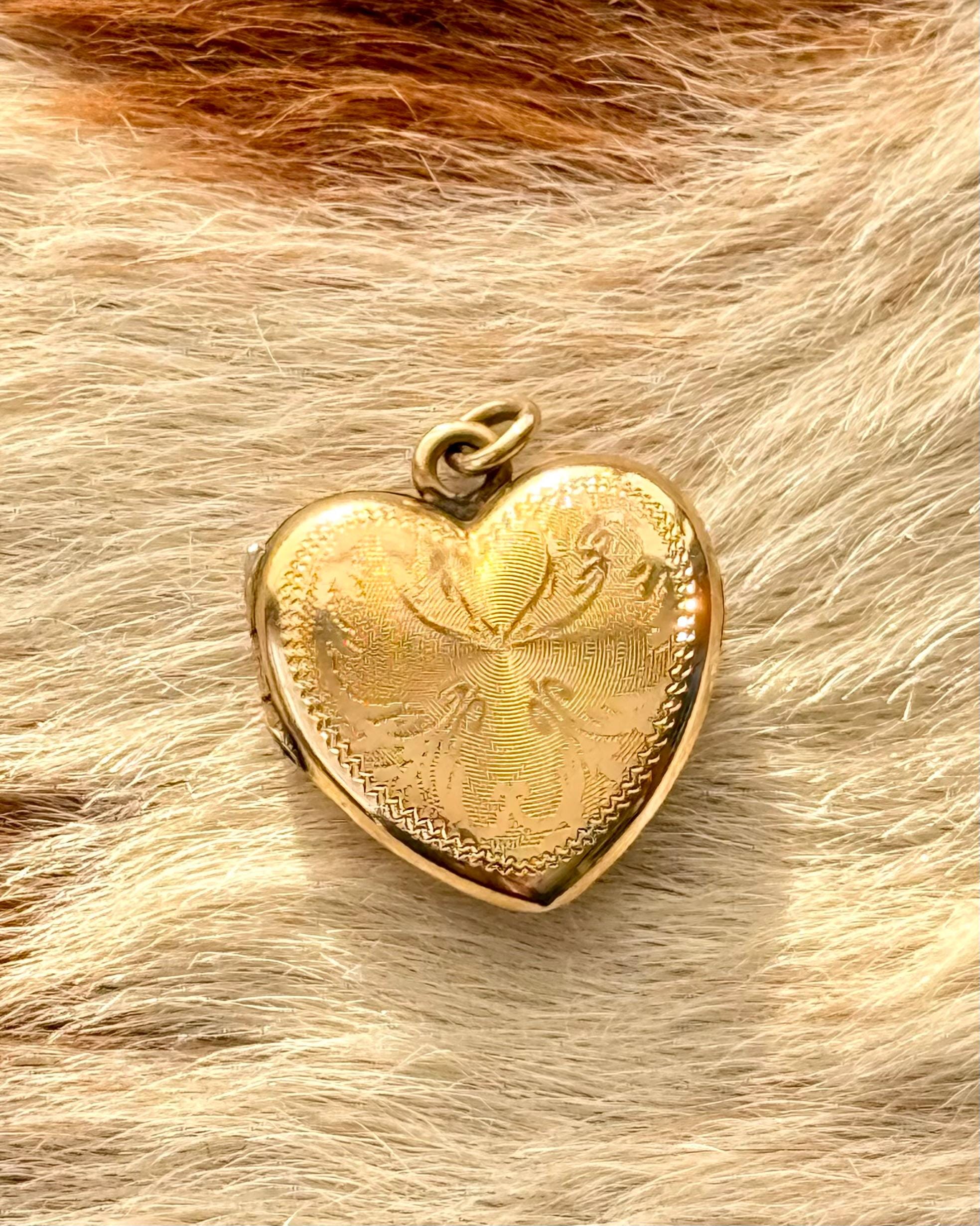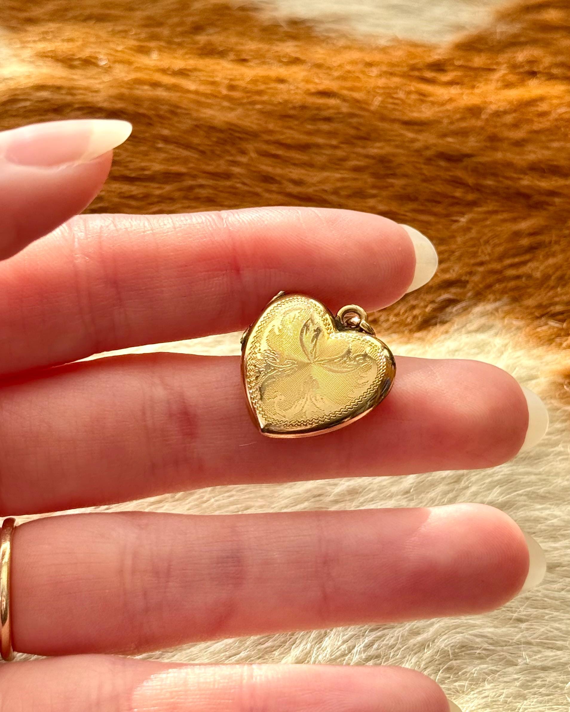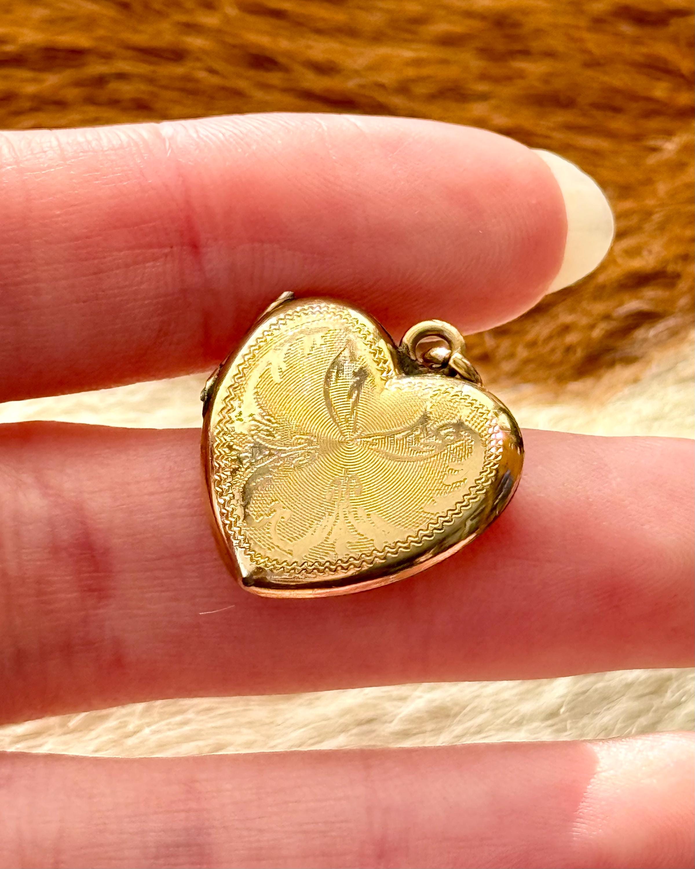 An authentic antique locket pendant. this yellow gold heart shaped functional photo locket features a mesmerizing “flaming” border with an etched spiral texture background. includes jump ring to string onto your own jewelry of choice.
