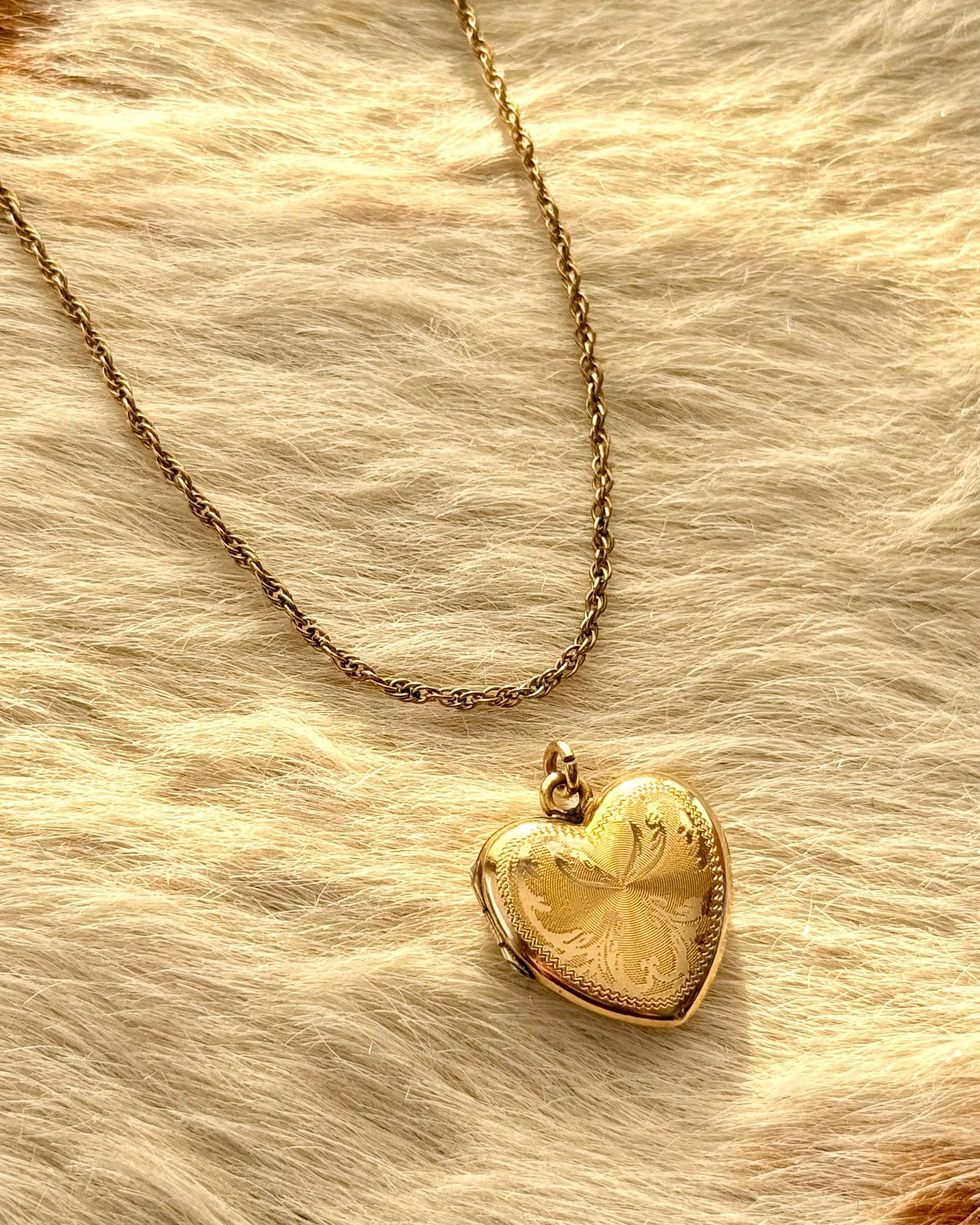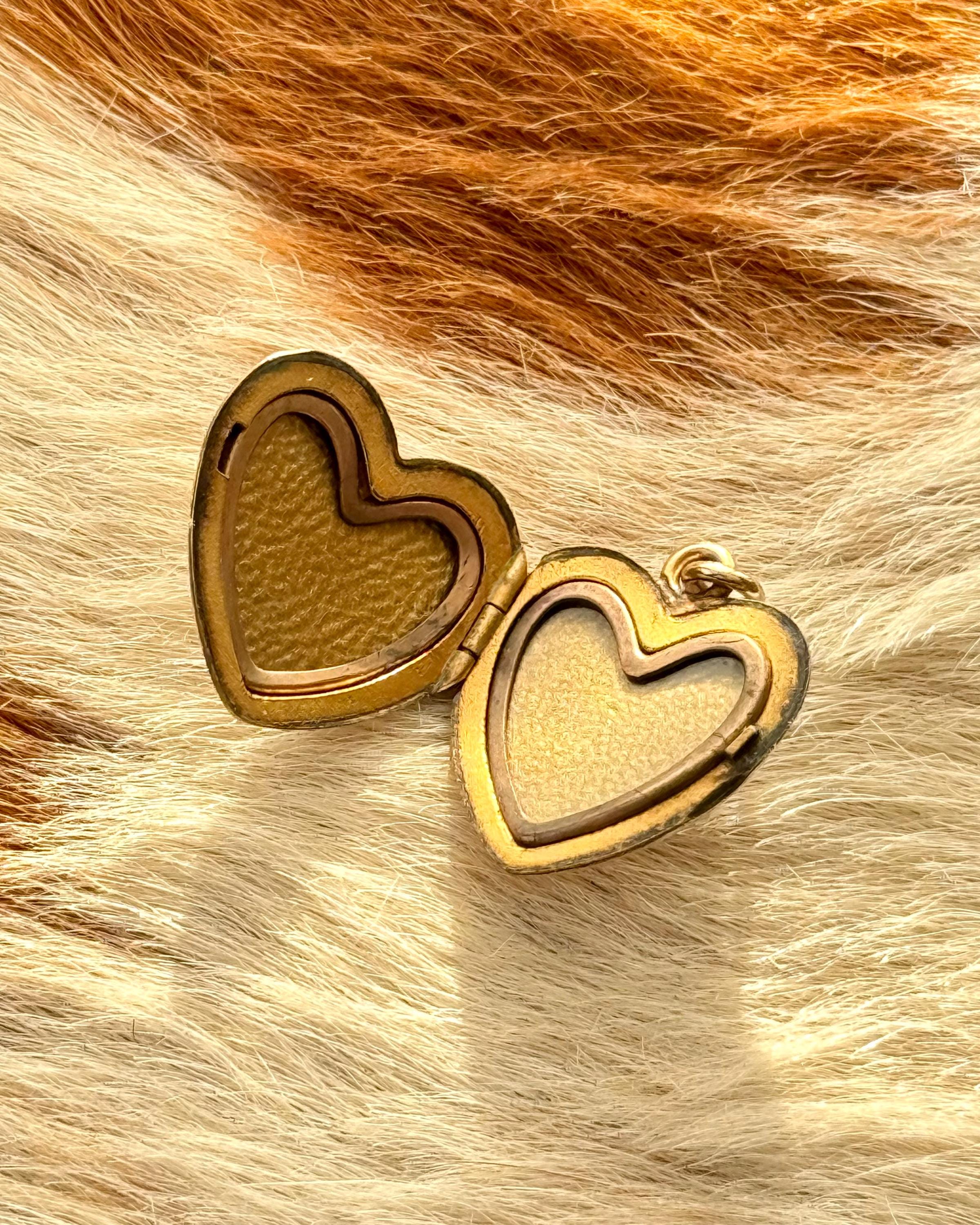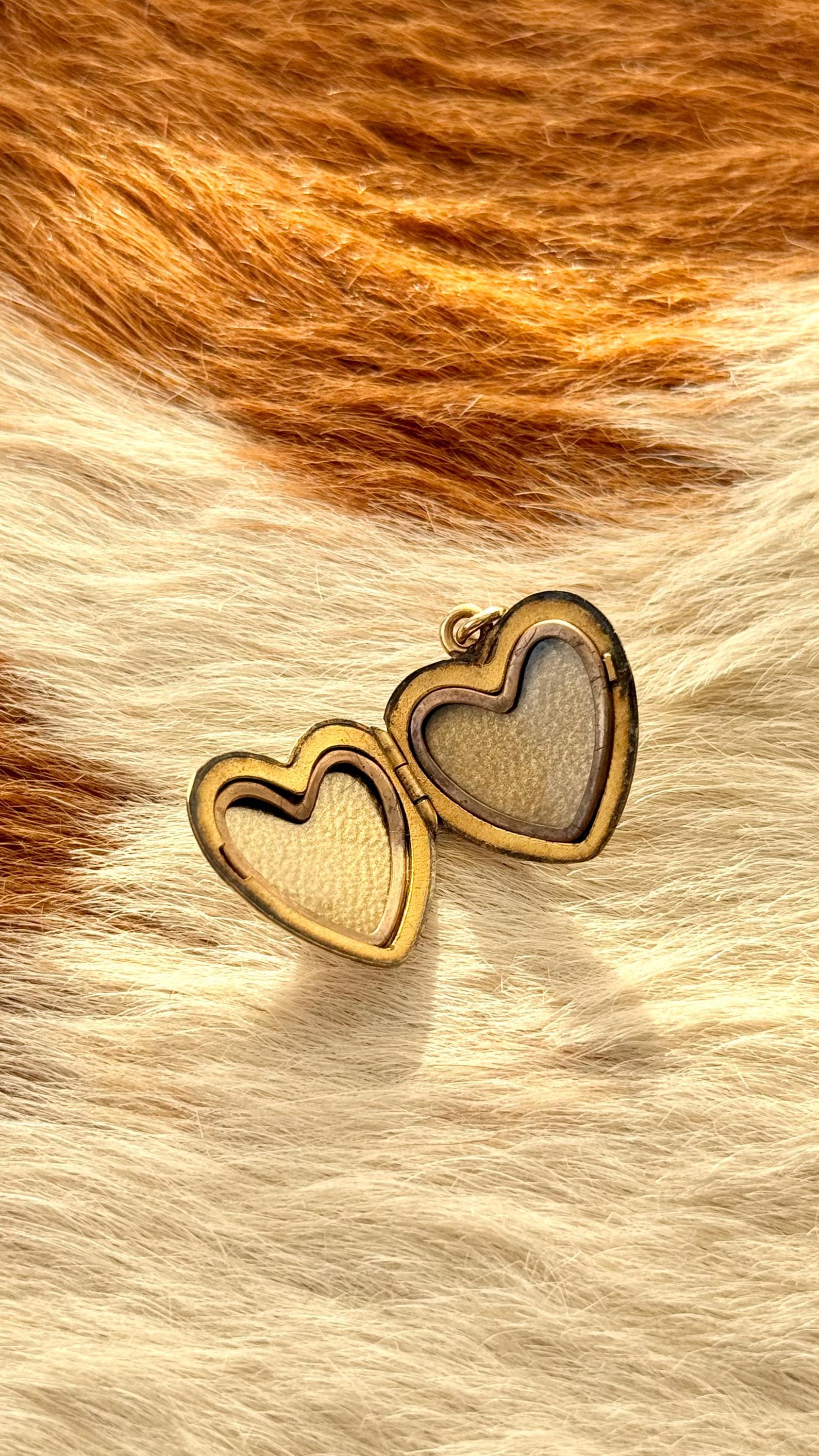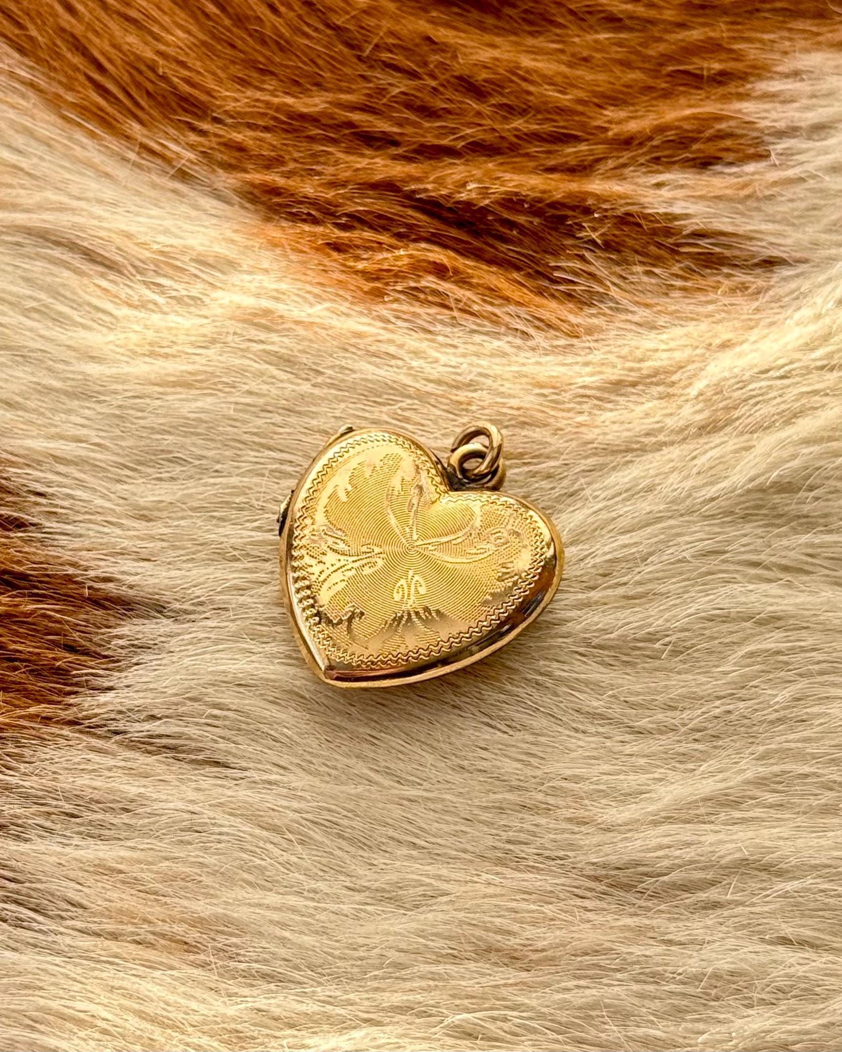 An authentic antique locket pendant. this yellow gold heart shaped functional photo locket features a mesmerizing “flaming” border with an etched spiral texture background. includes jump ring to string onto your own jewelry of choice.