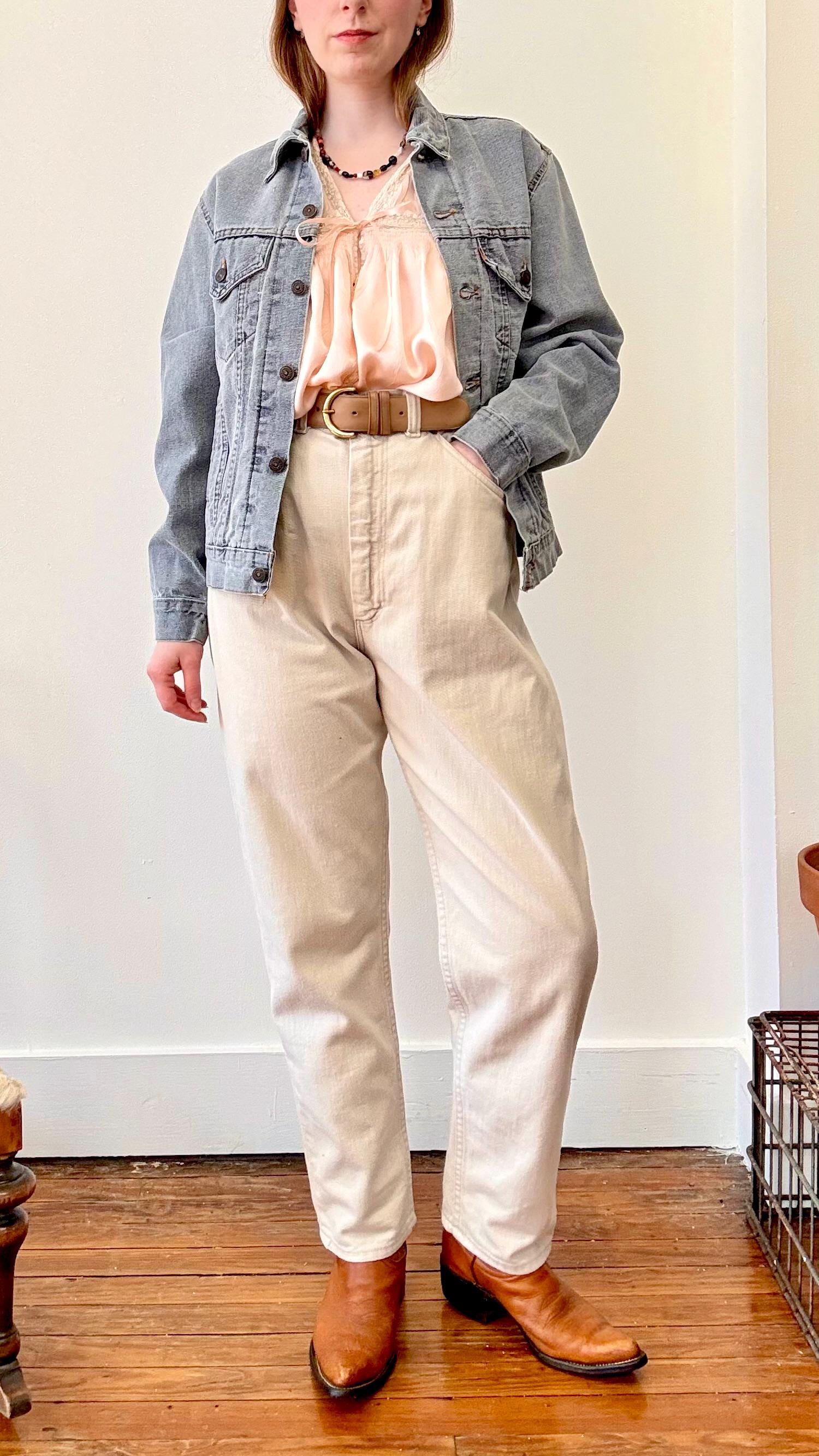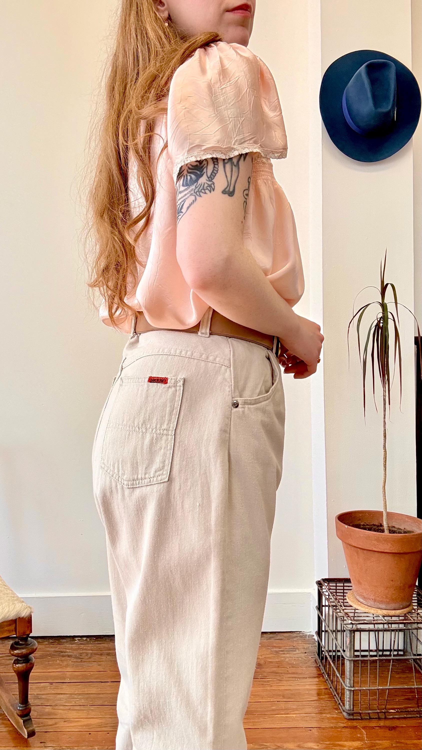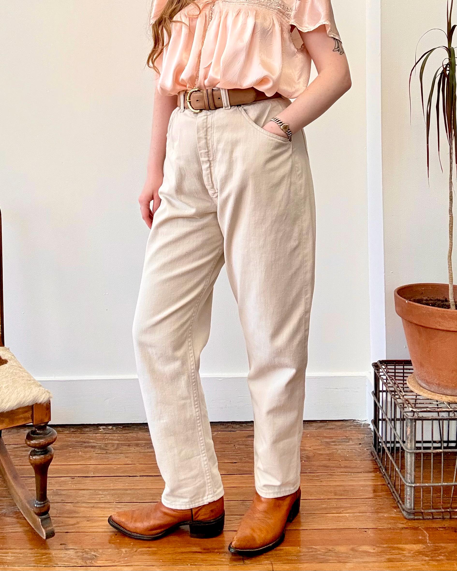 An authentic vintage pair of selvedge denim jeans by Penney’s Ranchcraft. a classic fifties cowboy cut designed for women with a high rise, full hip and relaxed straight leg for boots. undyed natural color medium weight denim. features a metal zipper fly. and orange branded tab at the back pocket.