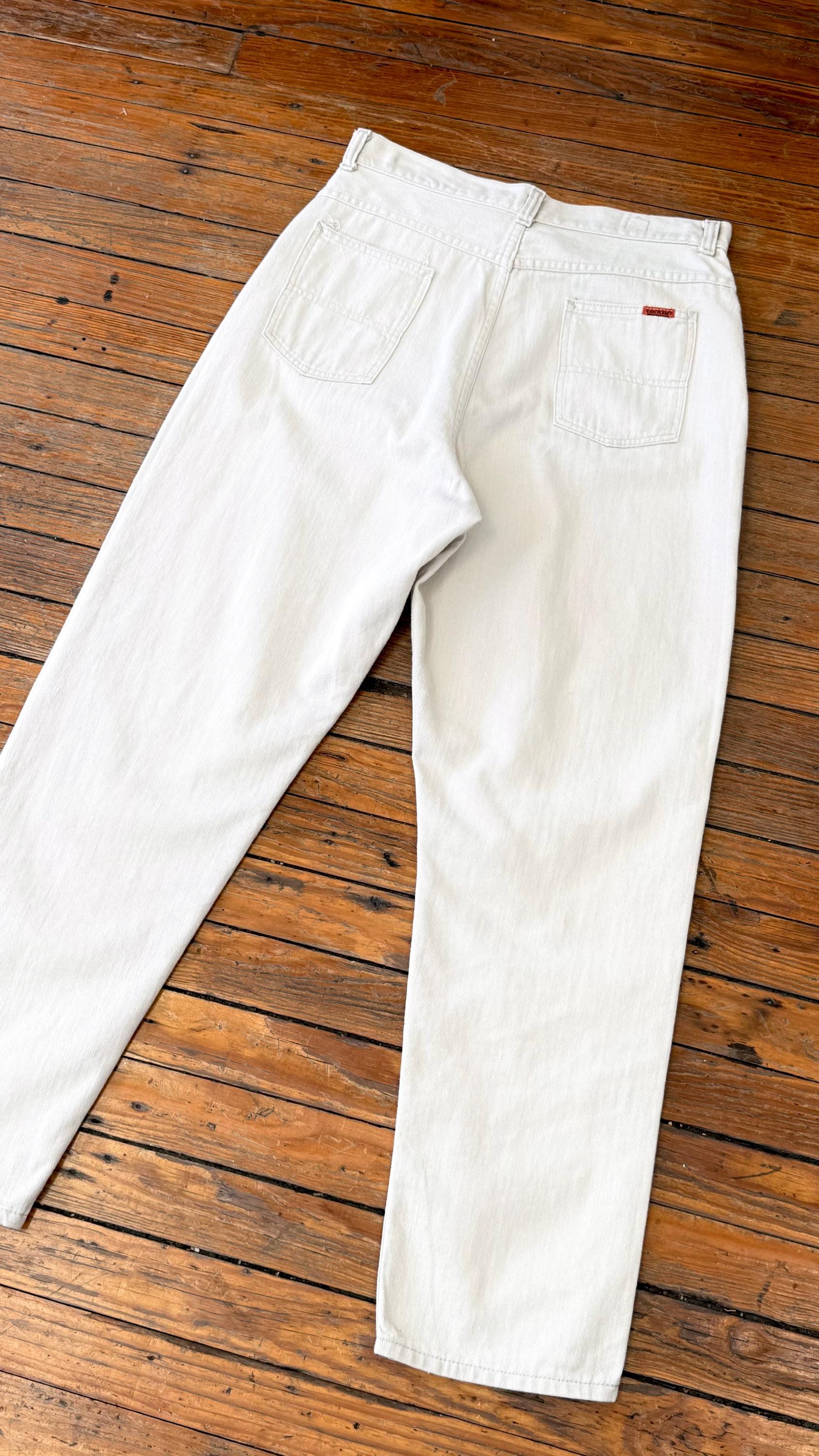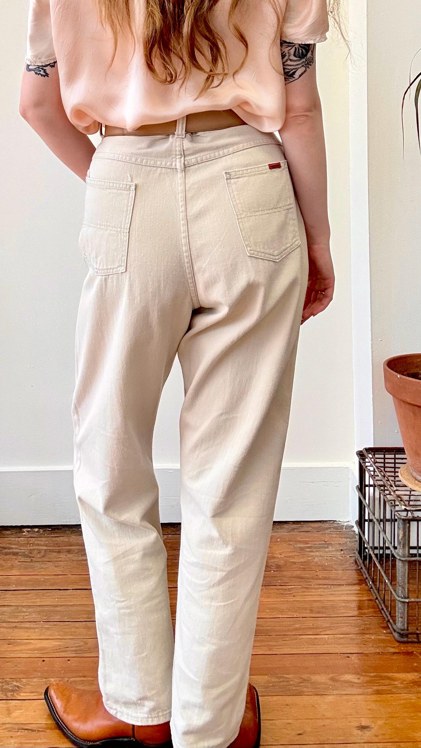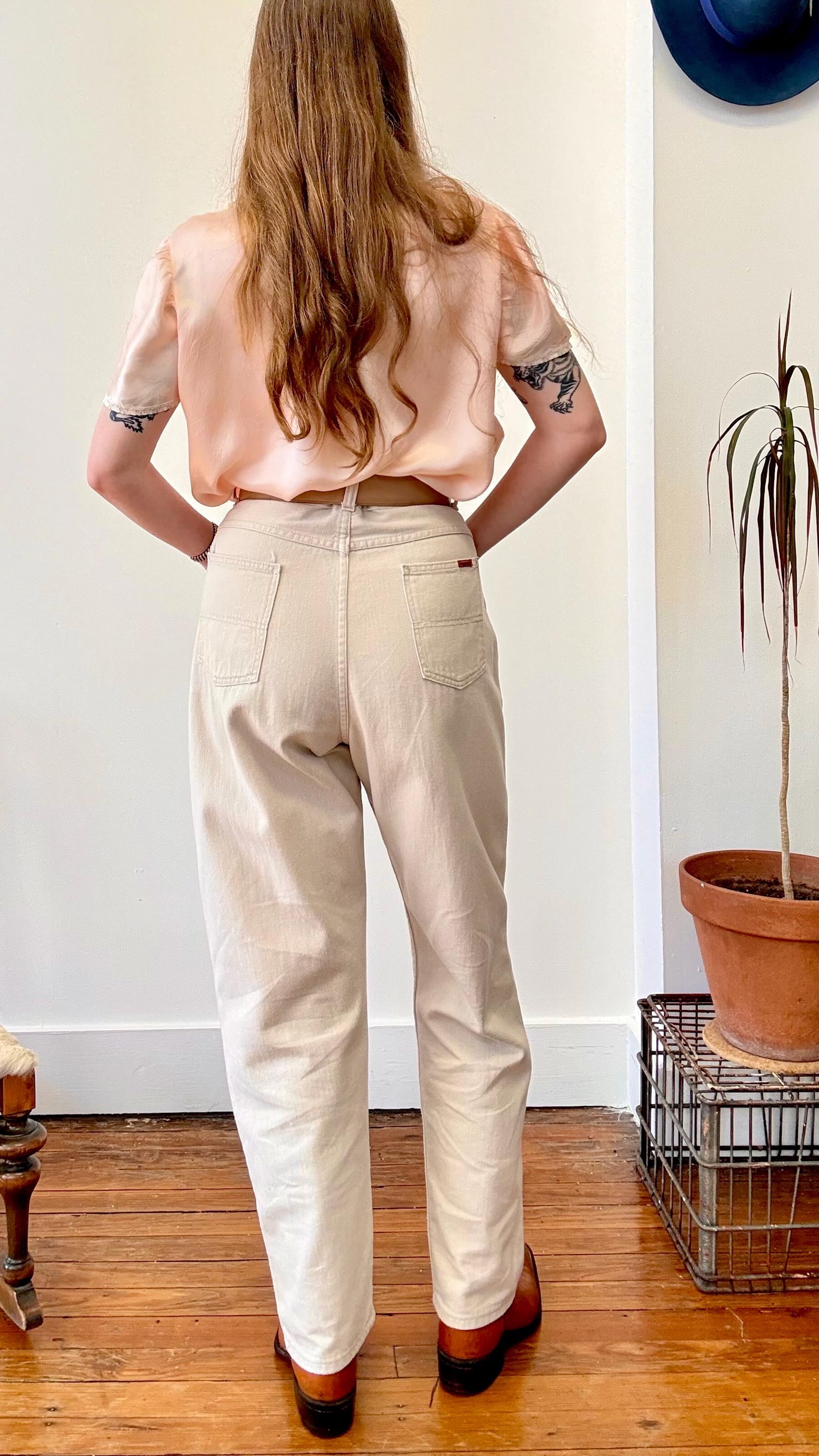 An authentic vintage pair of selvedge denim jeans by Penney’s Ranchcraft. a classic fifties cowboy cut designed for women with a high rise, full hip and relaxed straight leg for boots. undyed natural color medium weight denim. features a metal zipper fly. and orange branded tab at the back pocket.