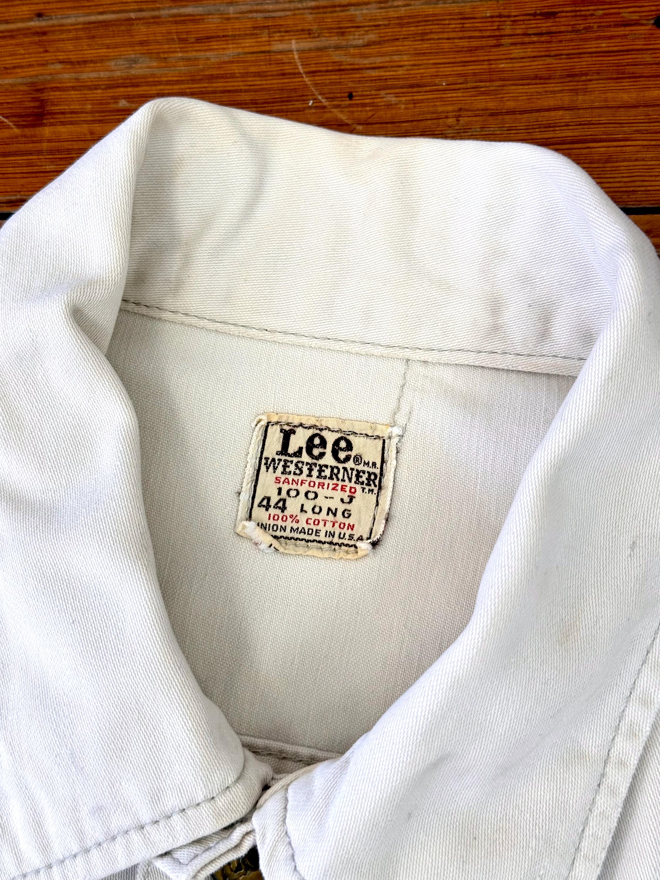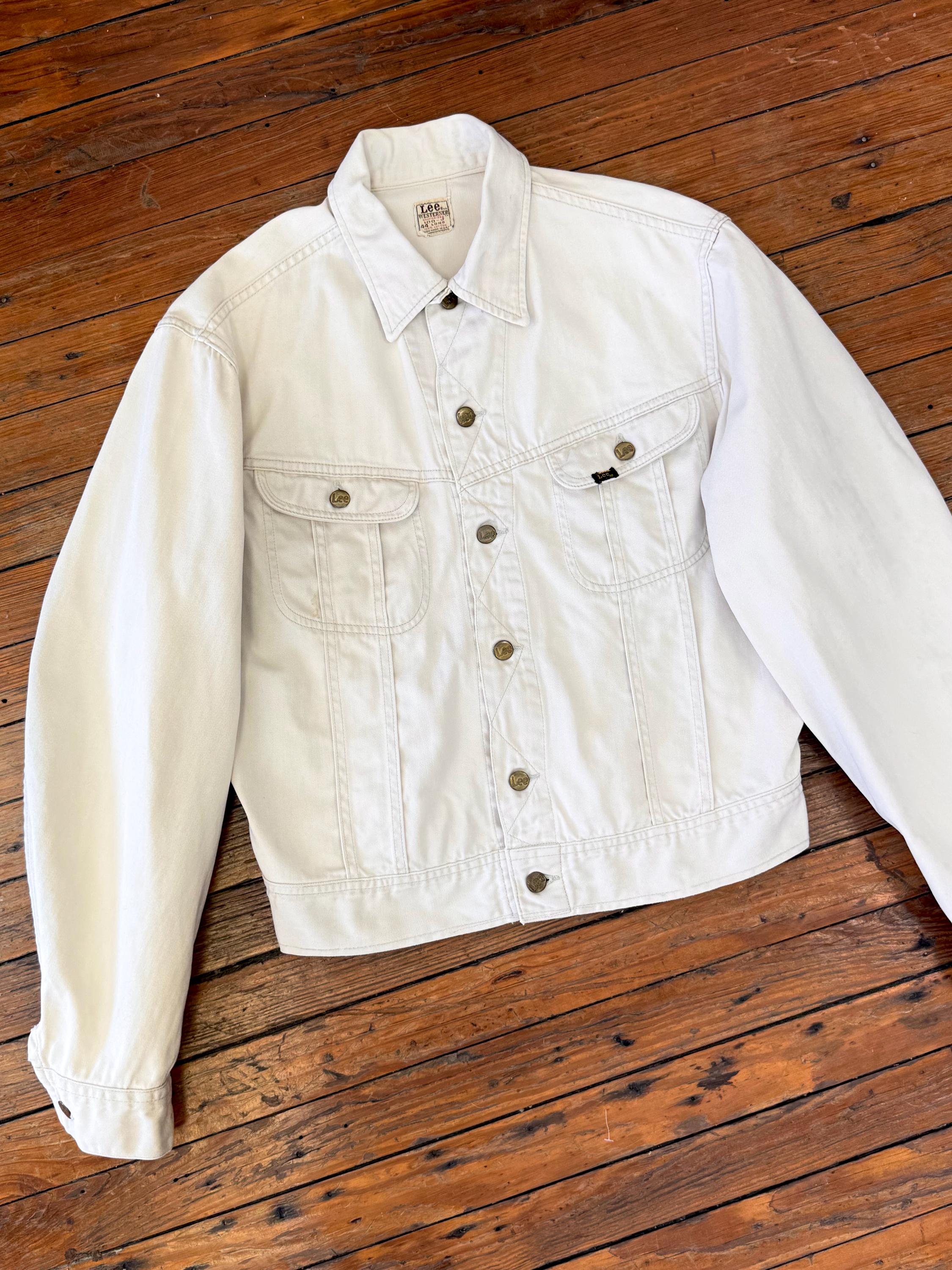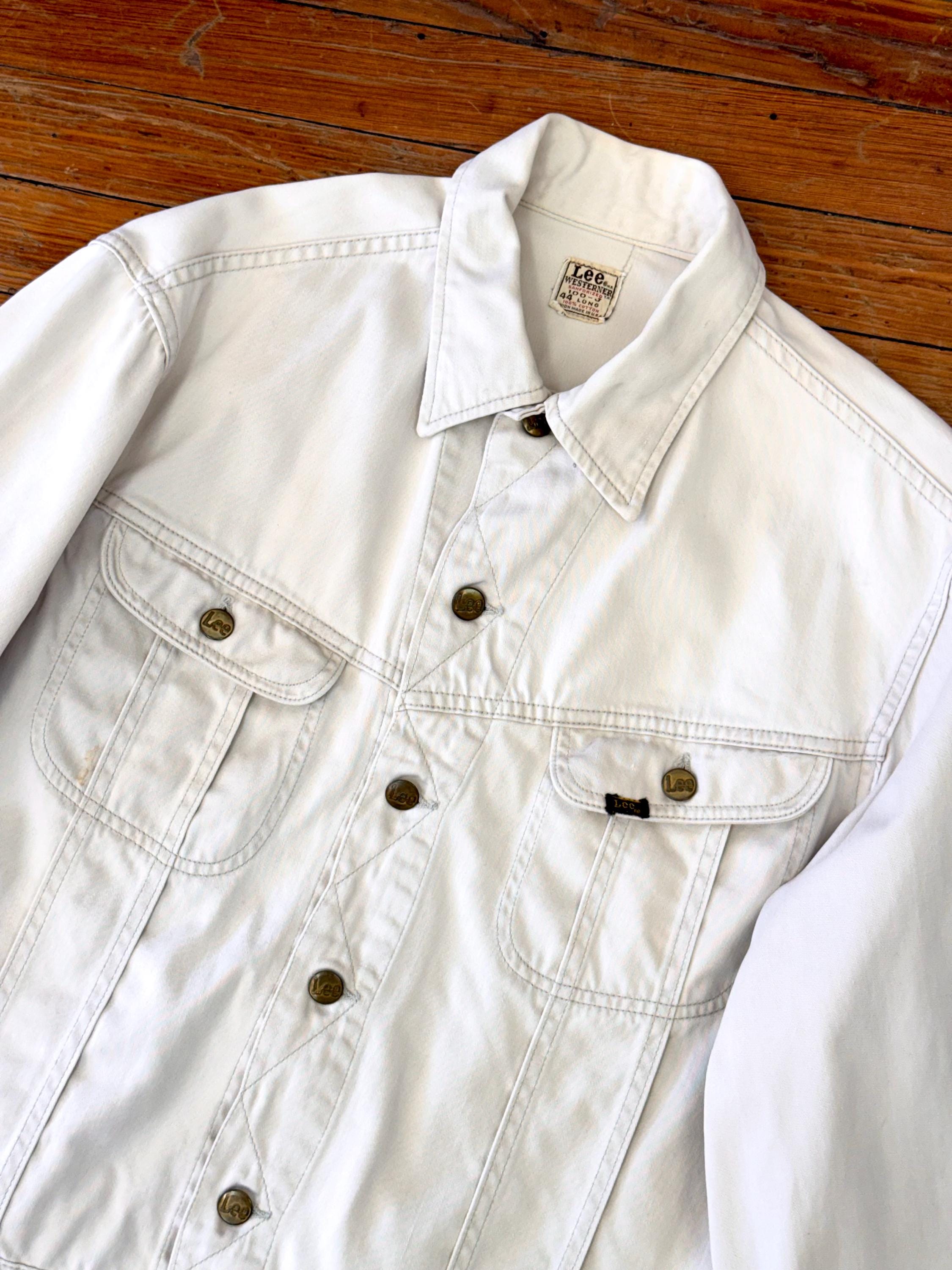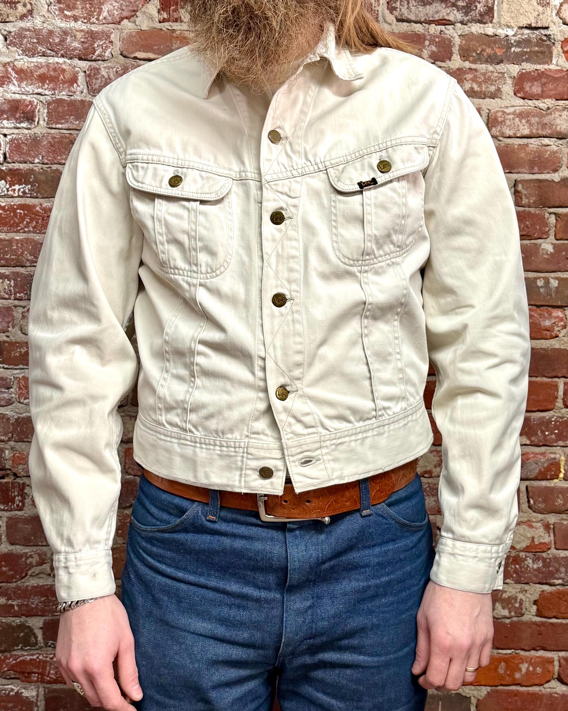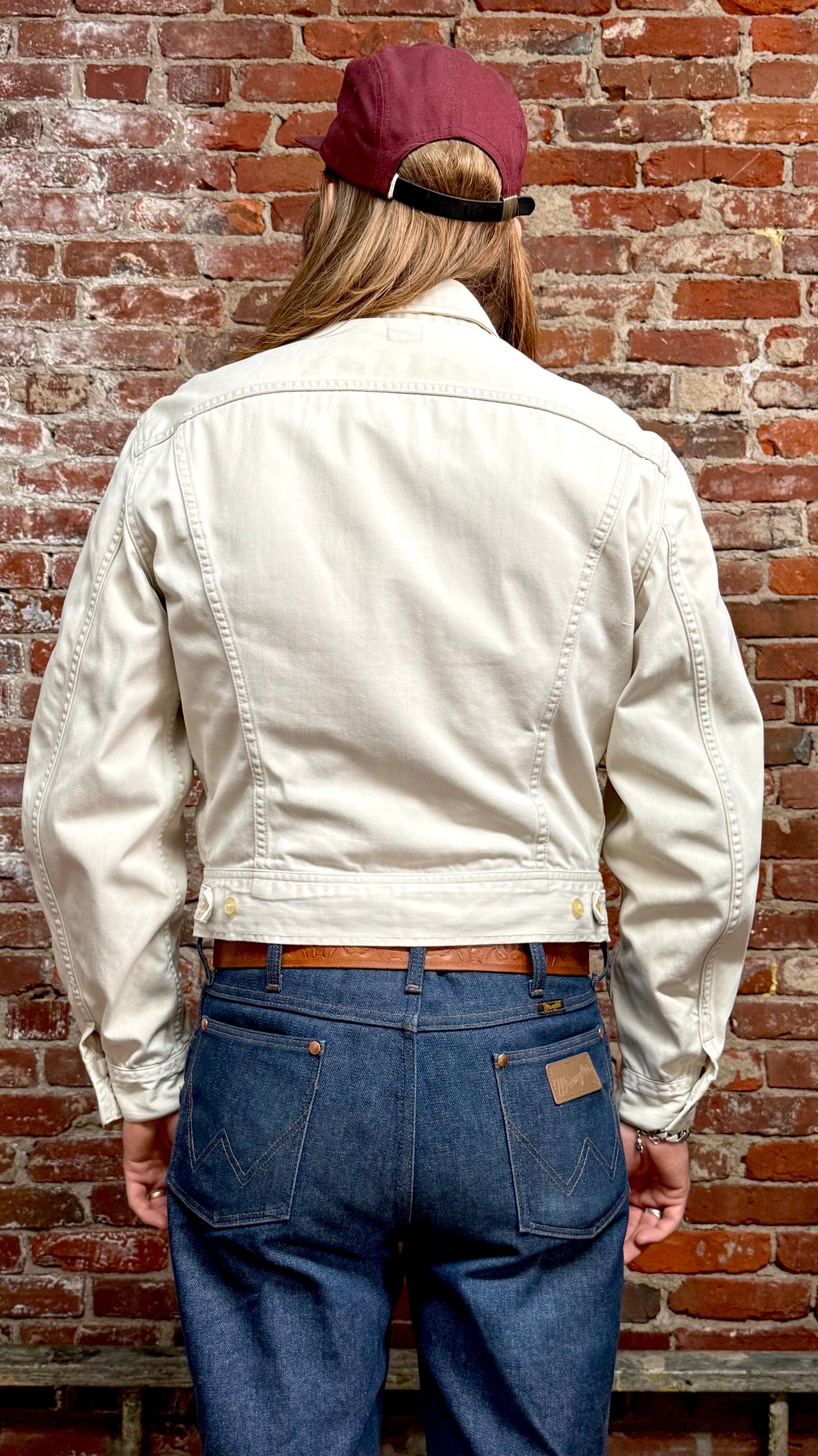 An authentic vintage Lee 100-J Westerner denim jacket. crafted from a satin twill denim. similar in cut to a Lee Rider with a slim cowboy fit. features branded riveted buttons and original button waist cinch tabs.
