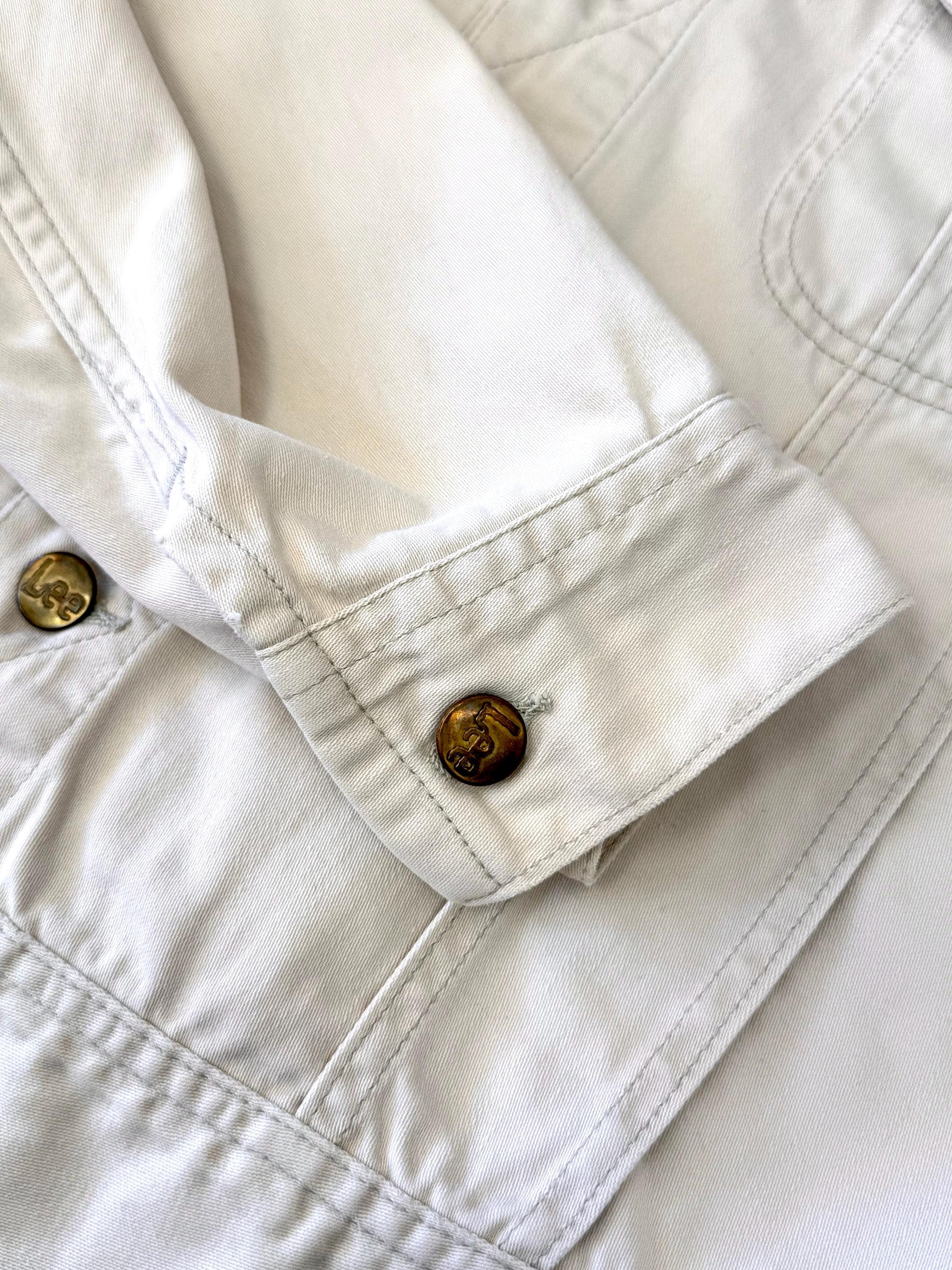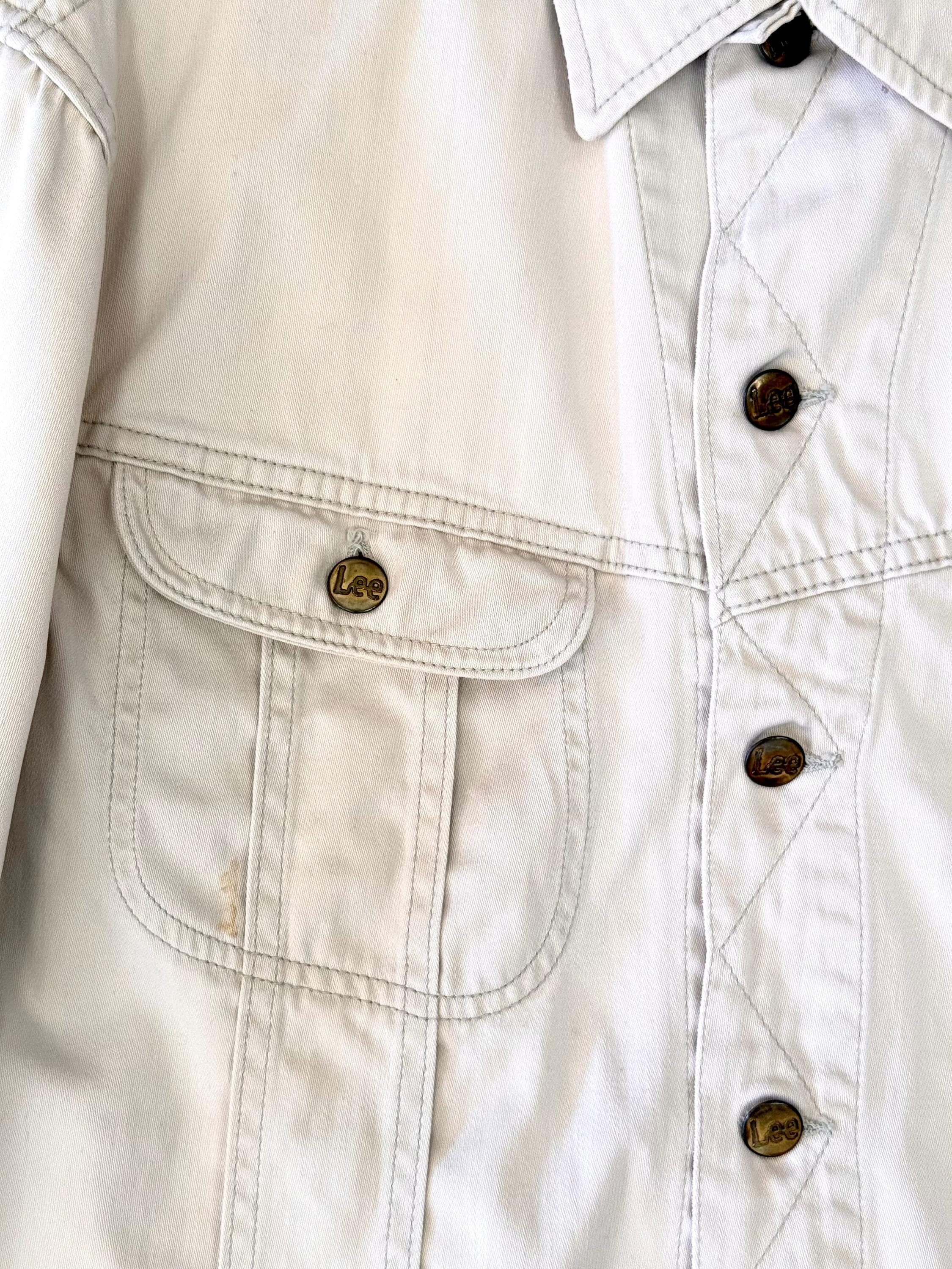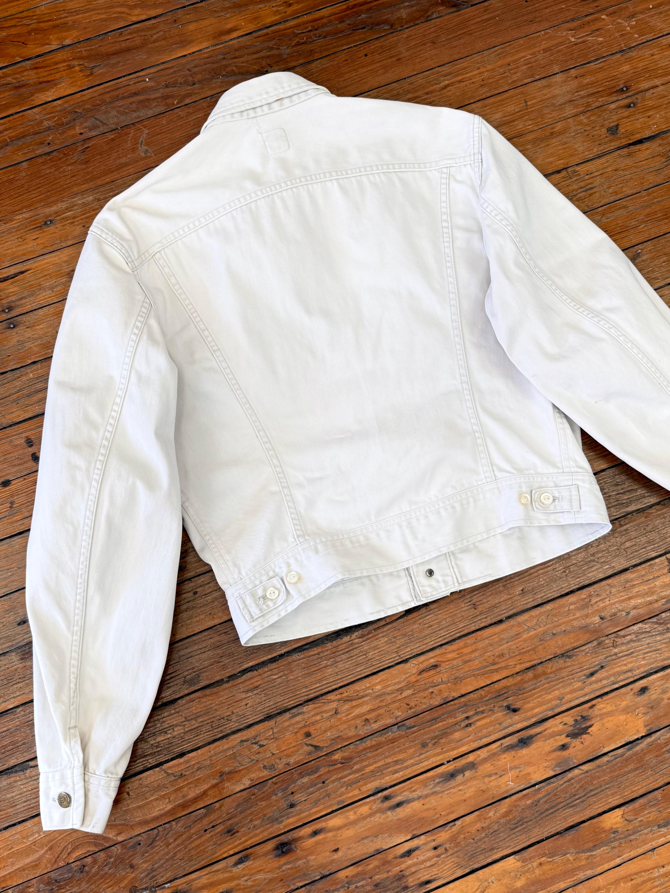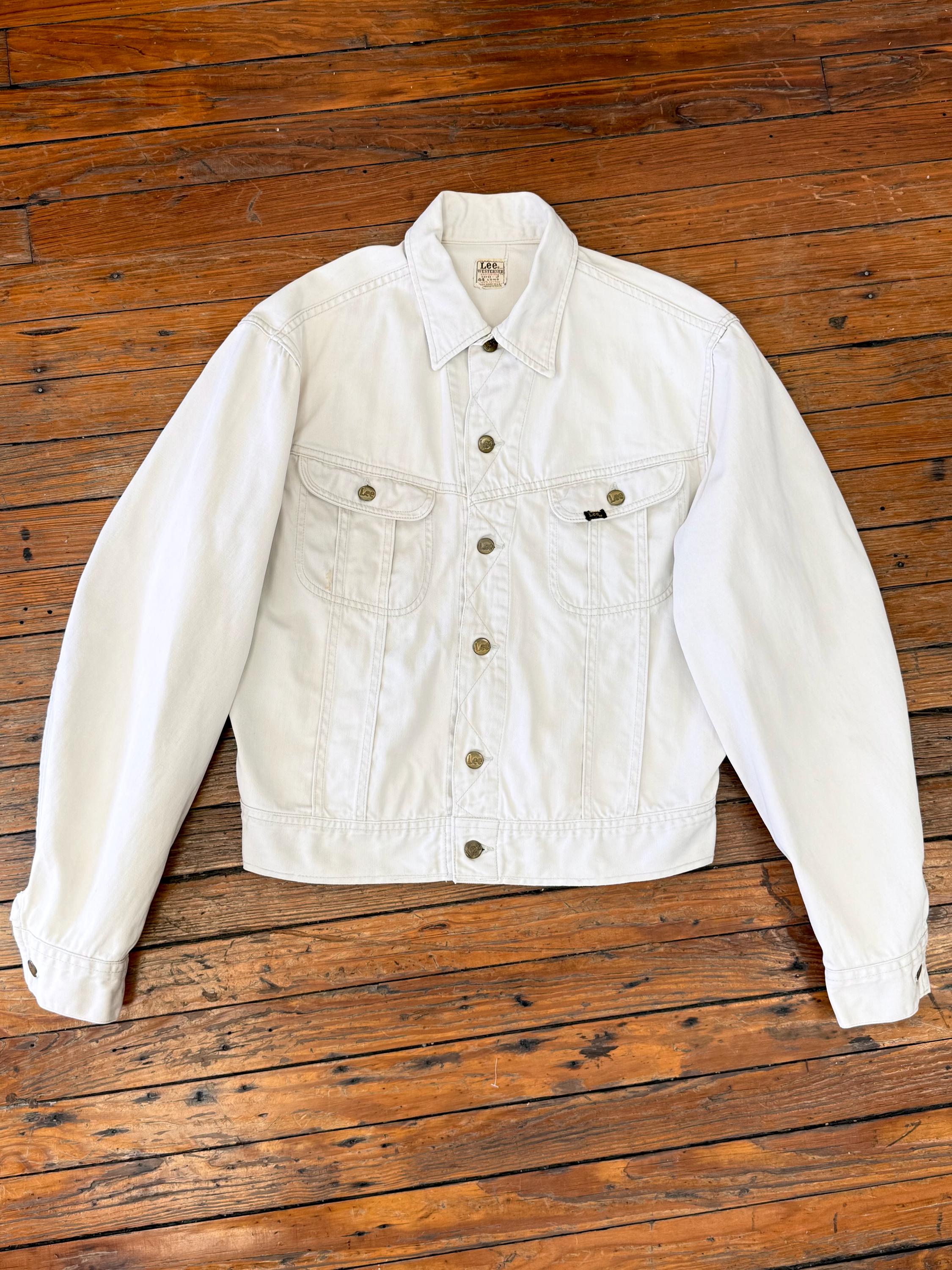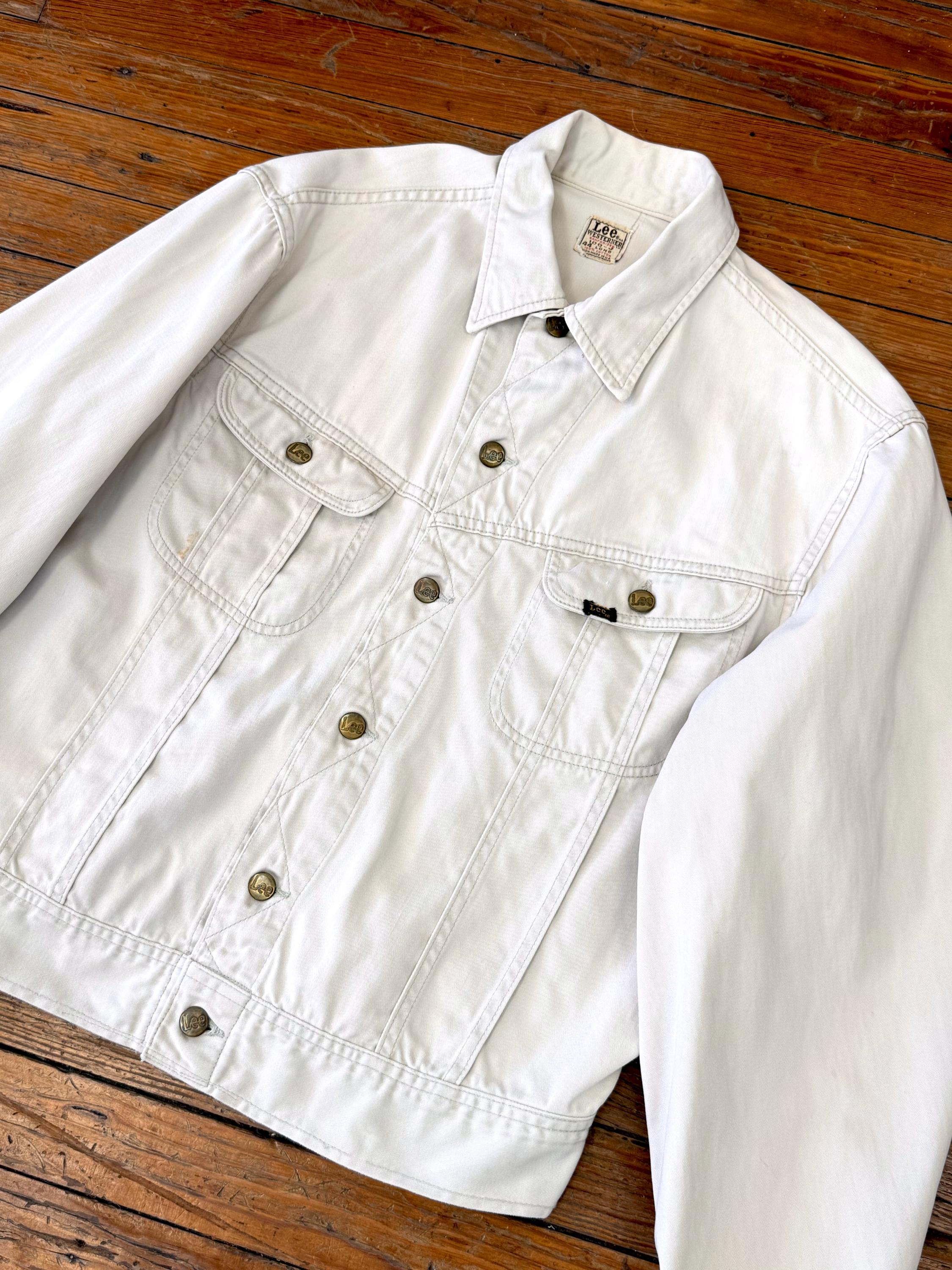 An authentic vintage Lee 100-J Westerner denim jacket. crafted from a satin twill denim. similar in cut to a Lee Rider with a slim cowboy fit. features branded riveted buttons and original button waist cinch tabs.