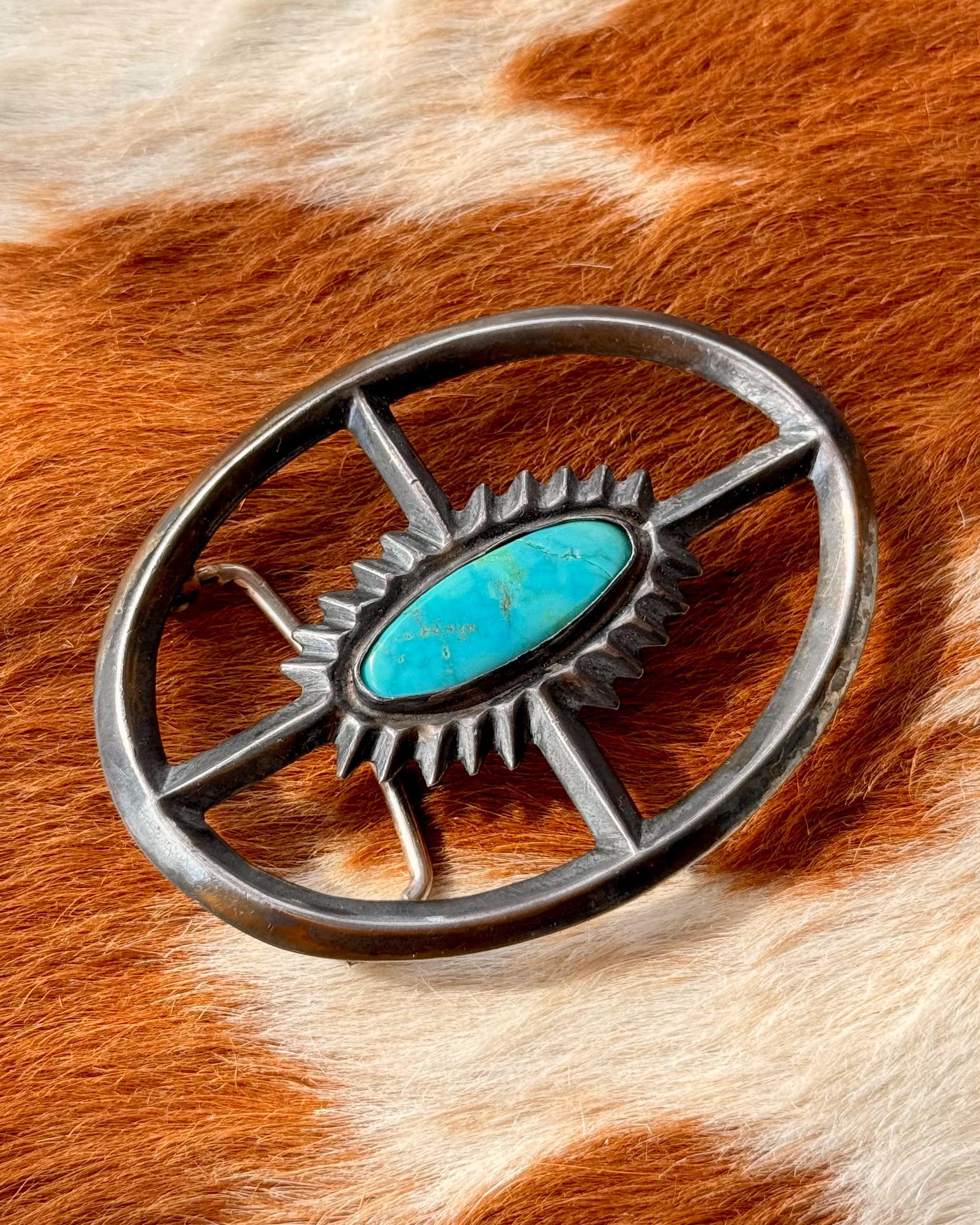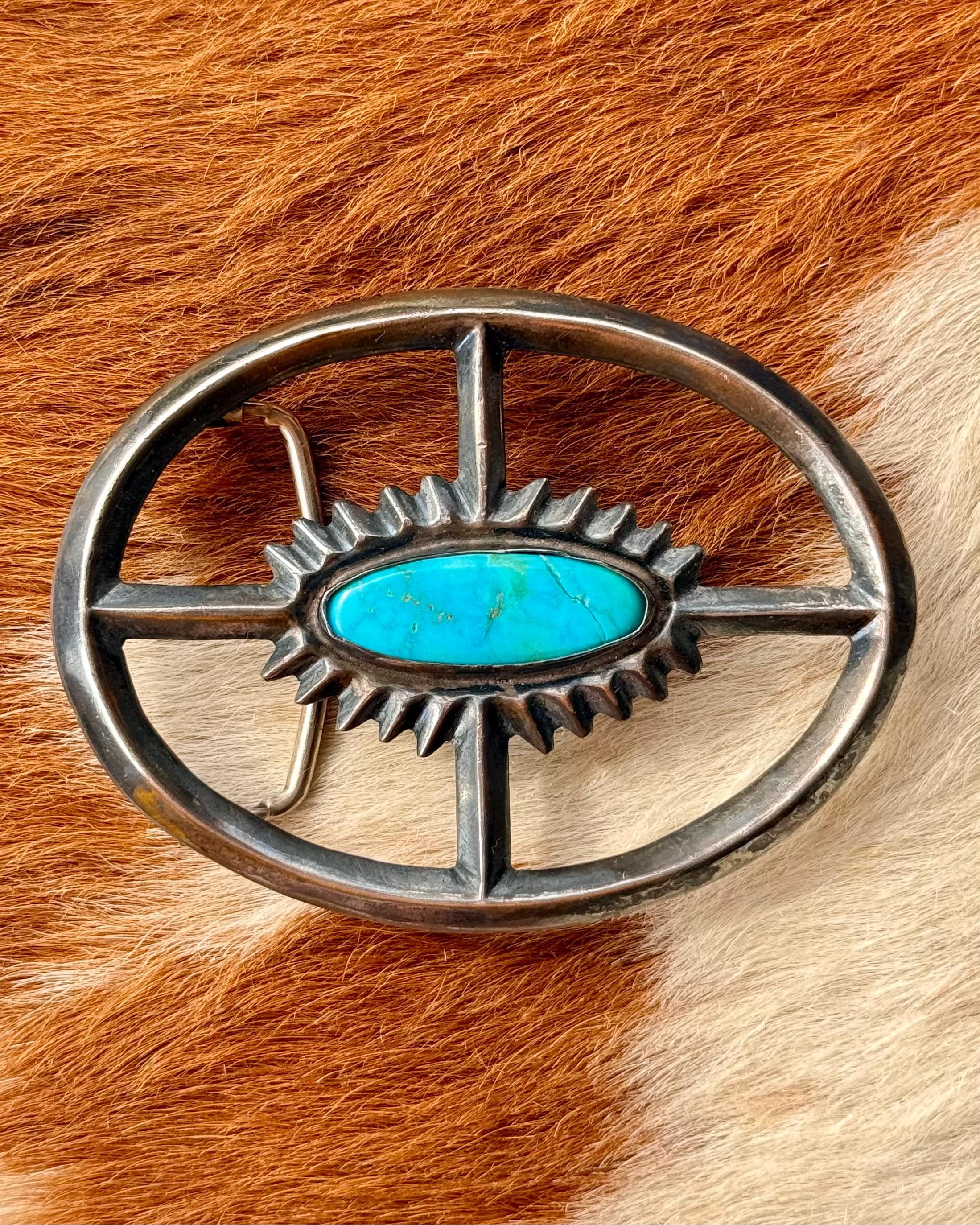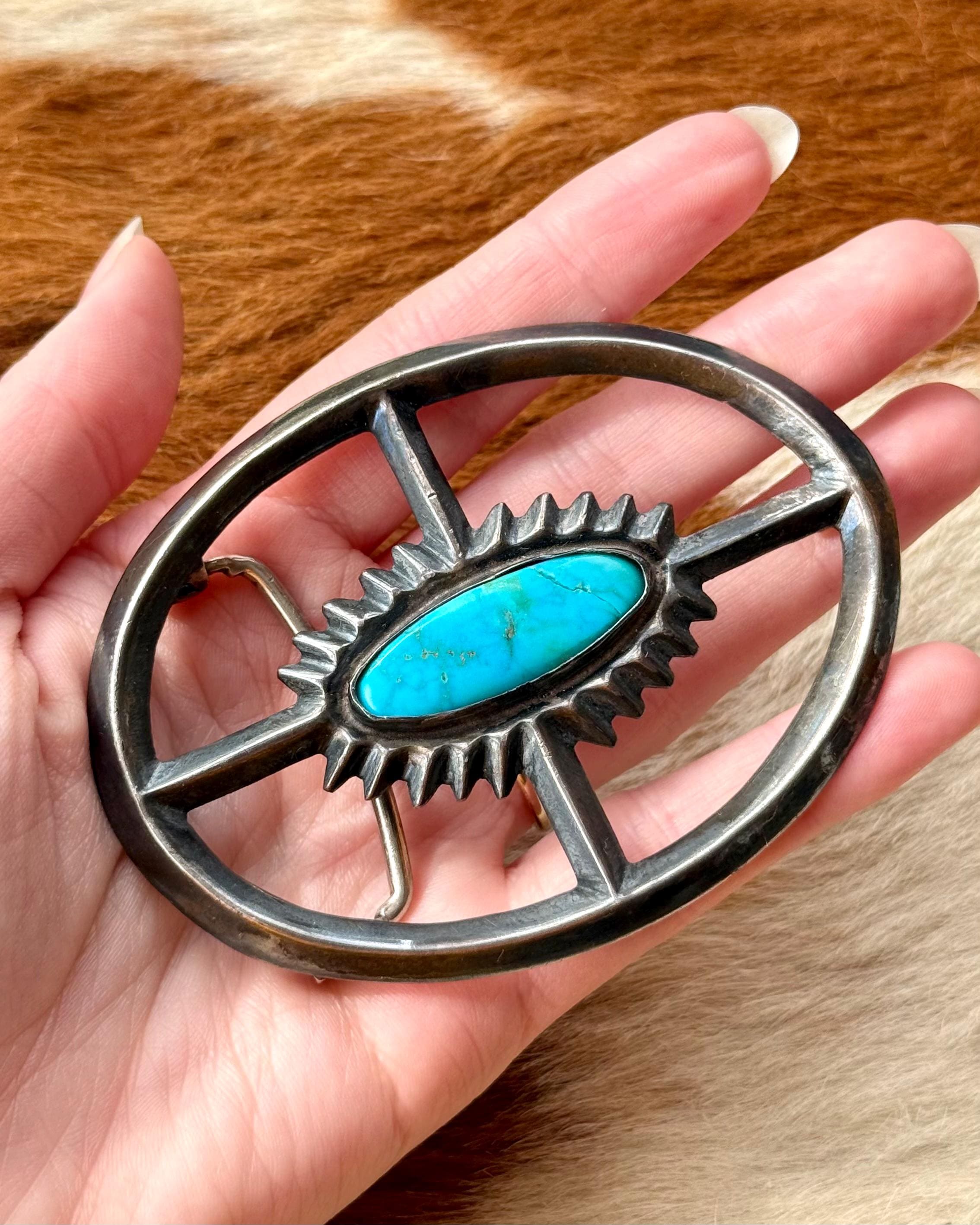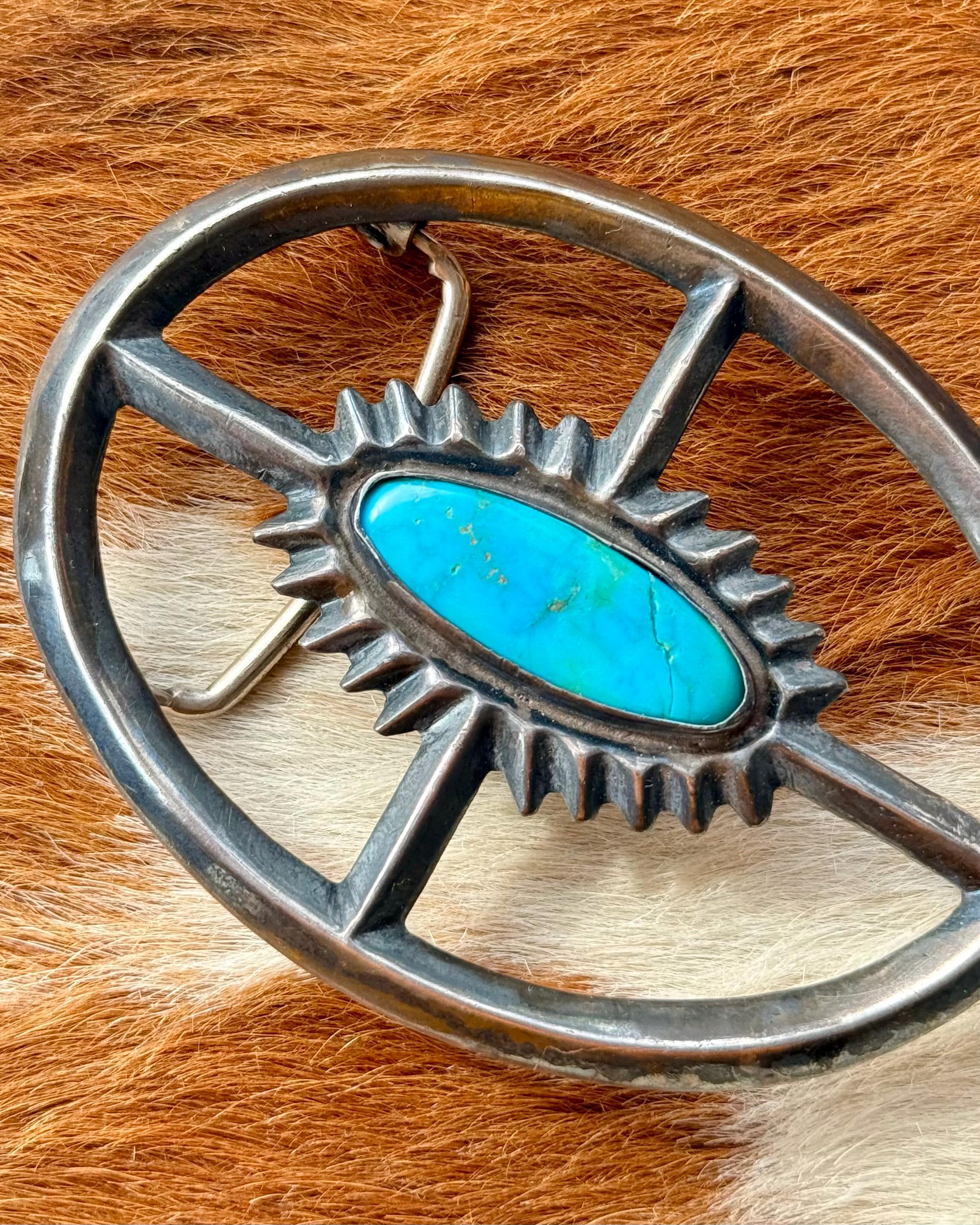 An authentic vintage belt buckle. fine navajo craftsmanship featuring a sandcast design. a large oval shape with an interesting motif almost like looking into a rangefinder, stained glass, sunset, or a glowing eye! finished with a beautifully textured turquoise centerpiece. fastens onto your belt of choice with a swivel hinge bar and hook. unmarked silver.