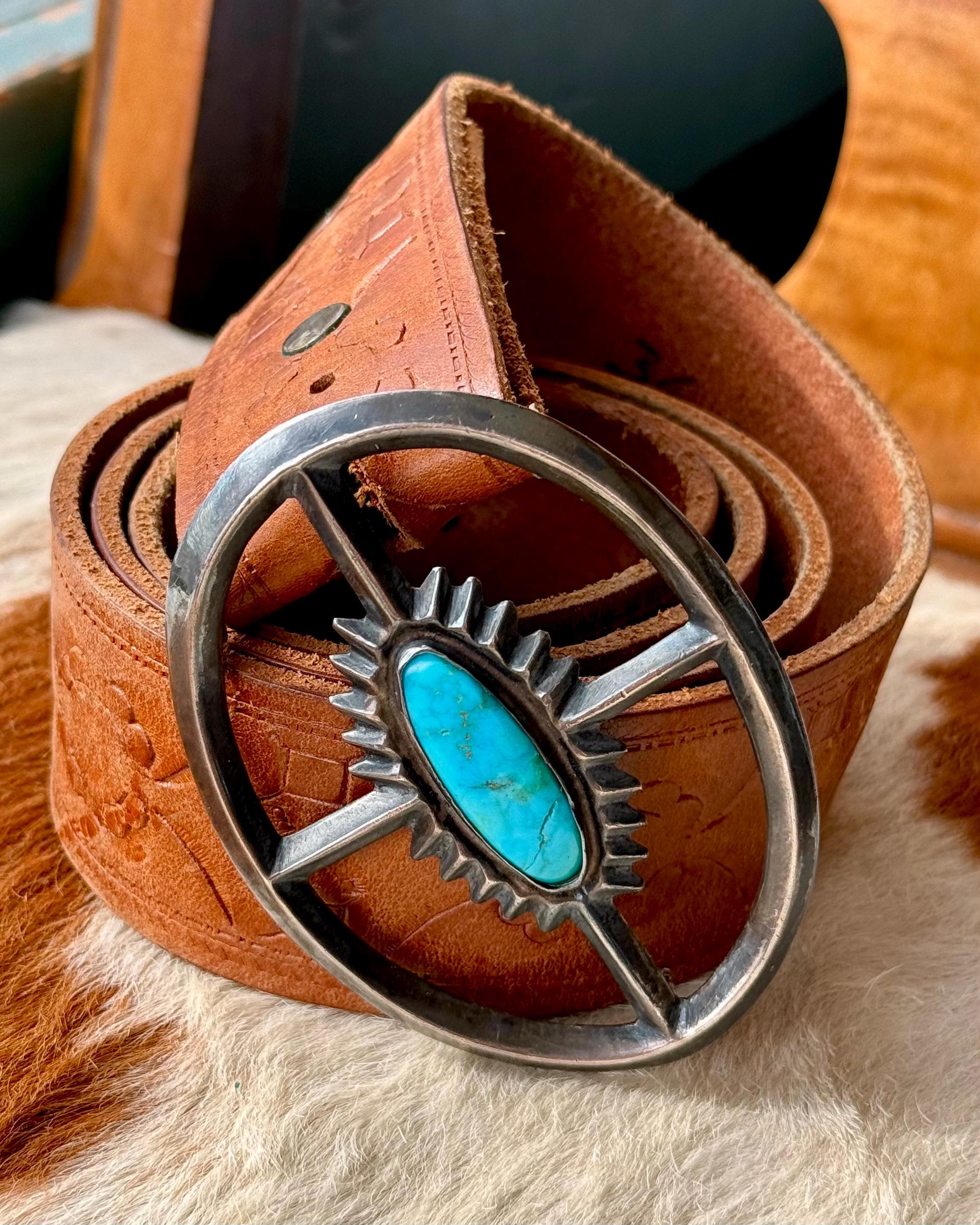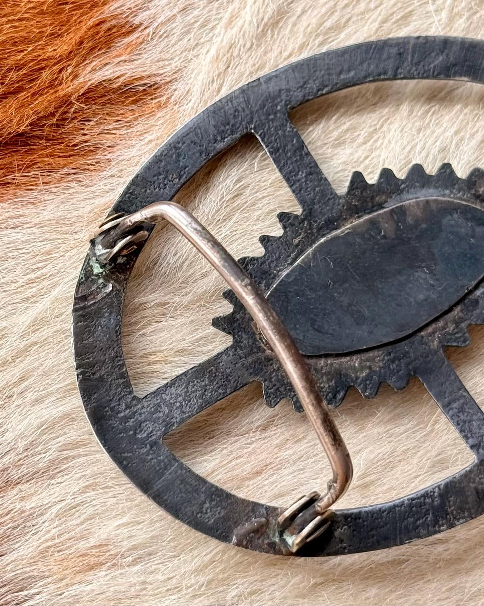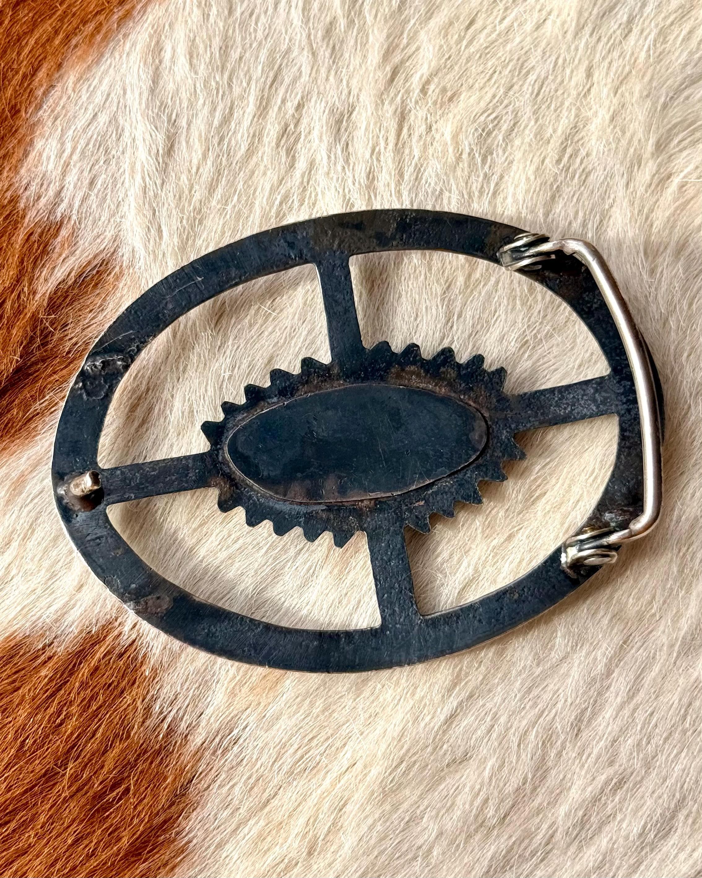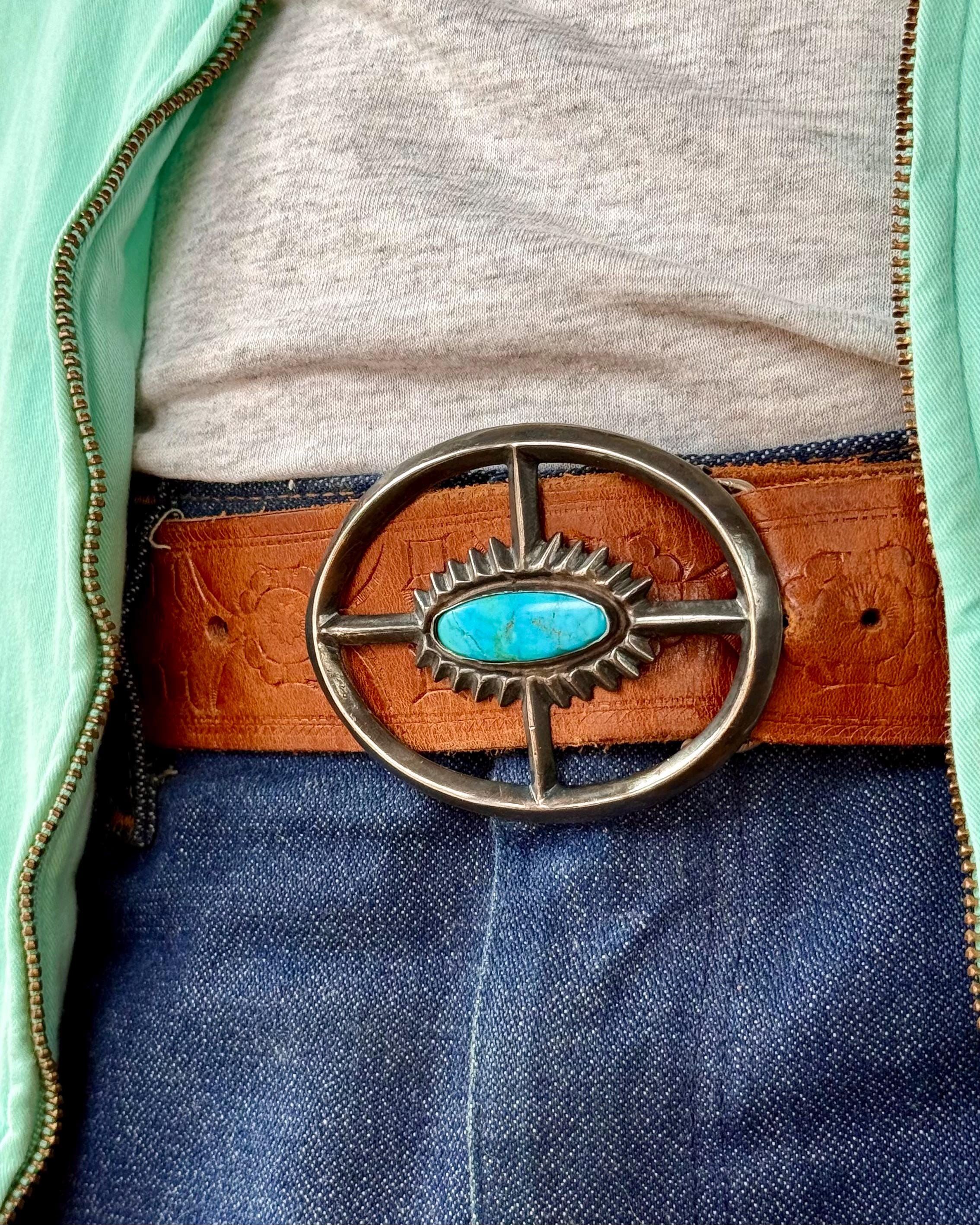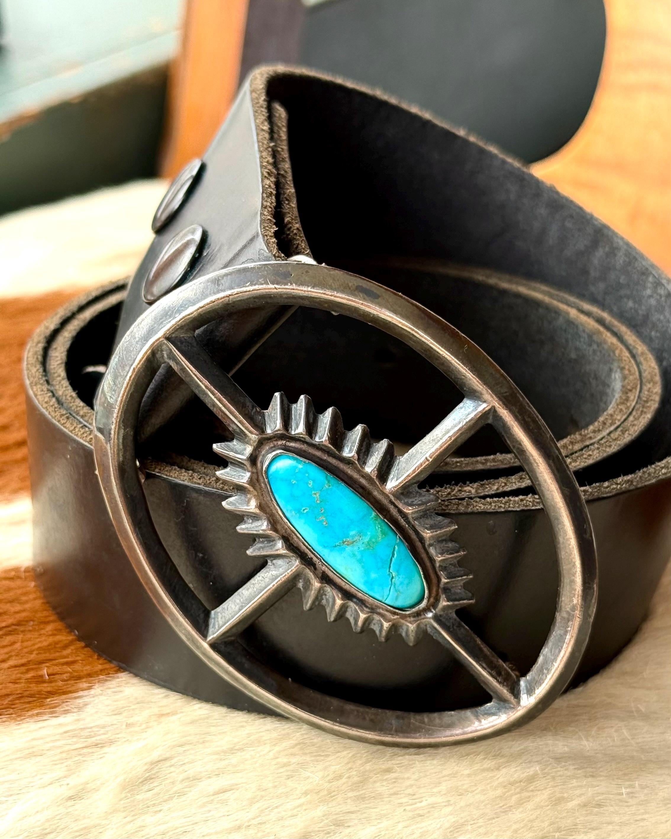 An authentic vintage belt buckle. fine navajo craftsmanship featuring a sandcast design. a large oval shape with an interesting motif almost like looking into a rangefinder, stained glass, sunset, or a glowing eye! finished with a beautifully textured turquoise centerpiece. fastens onto your belt of choice with a swivel hinge bar and hook. unmarked silver.