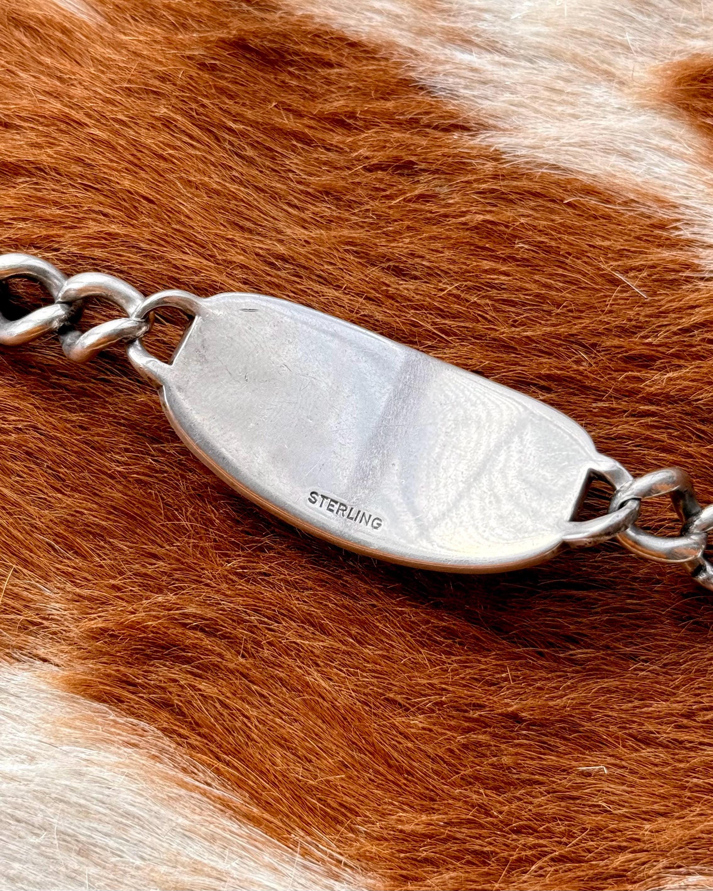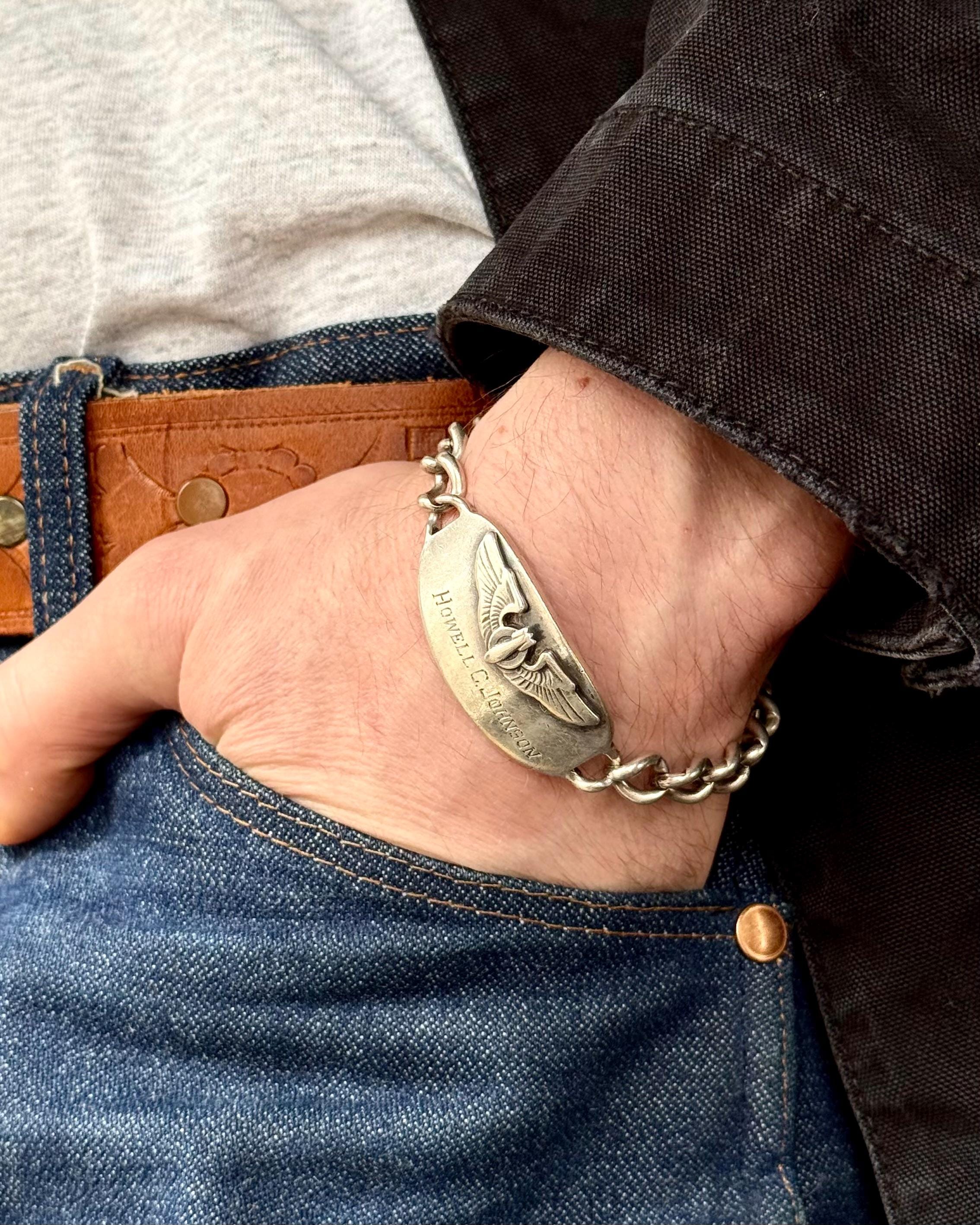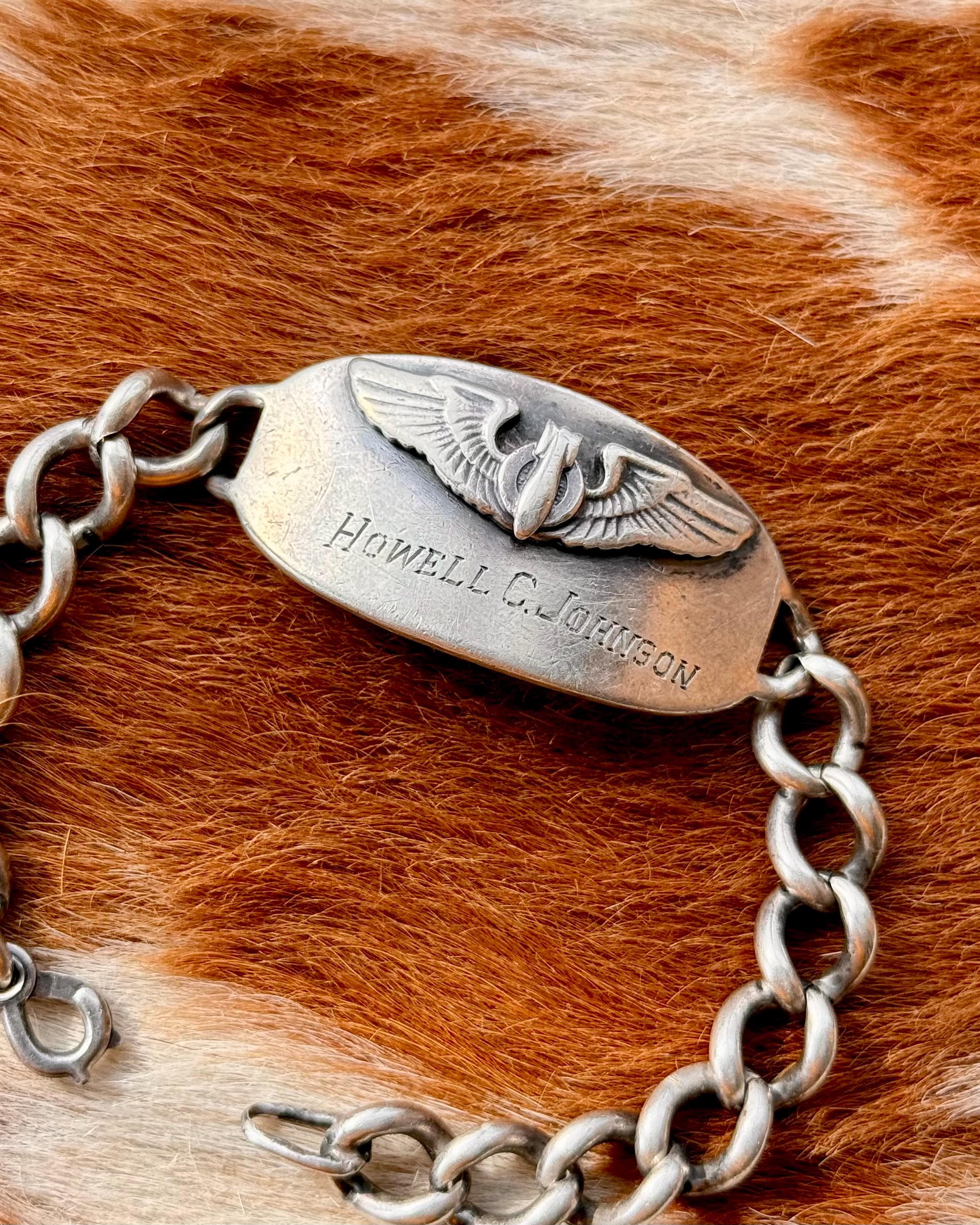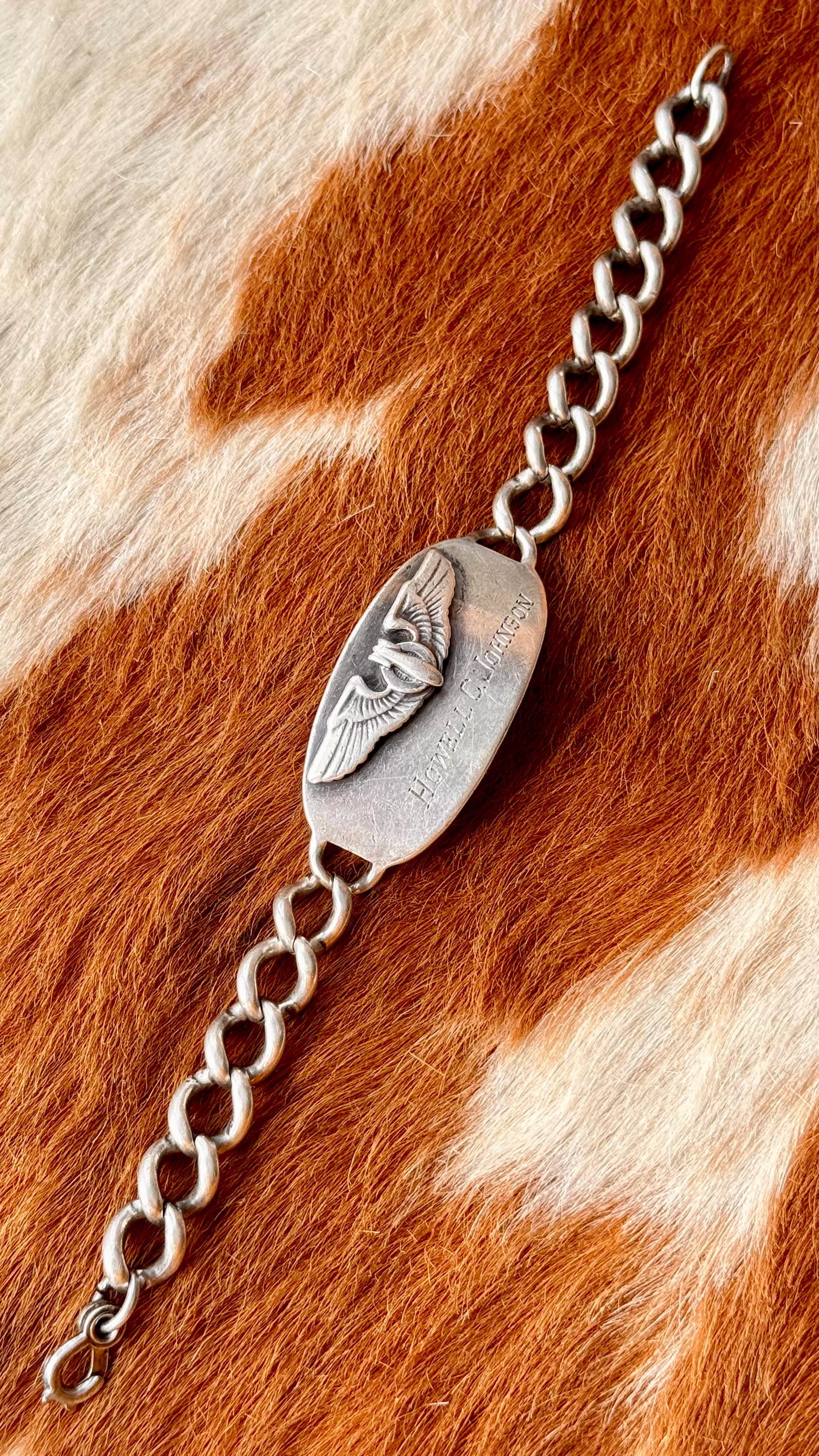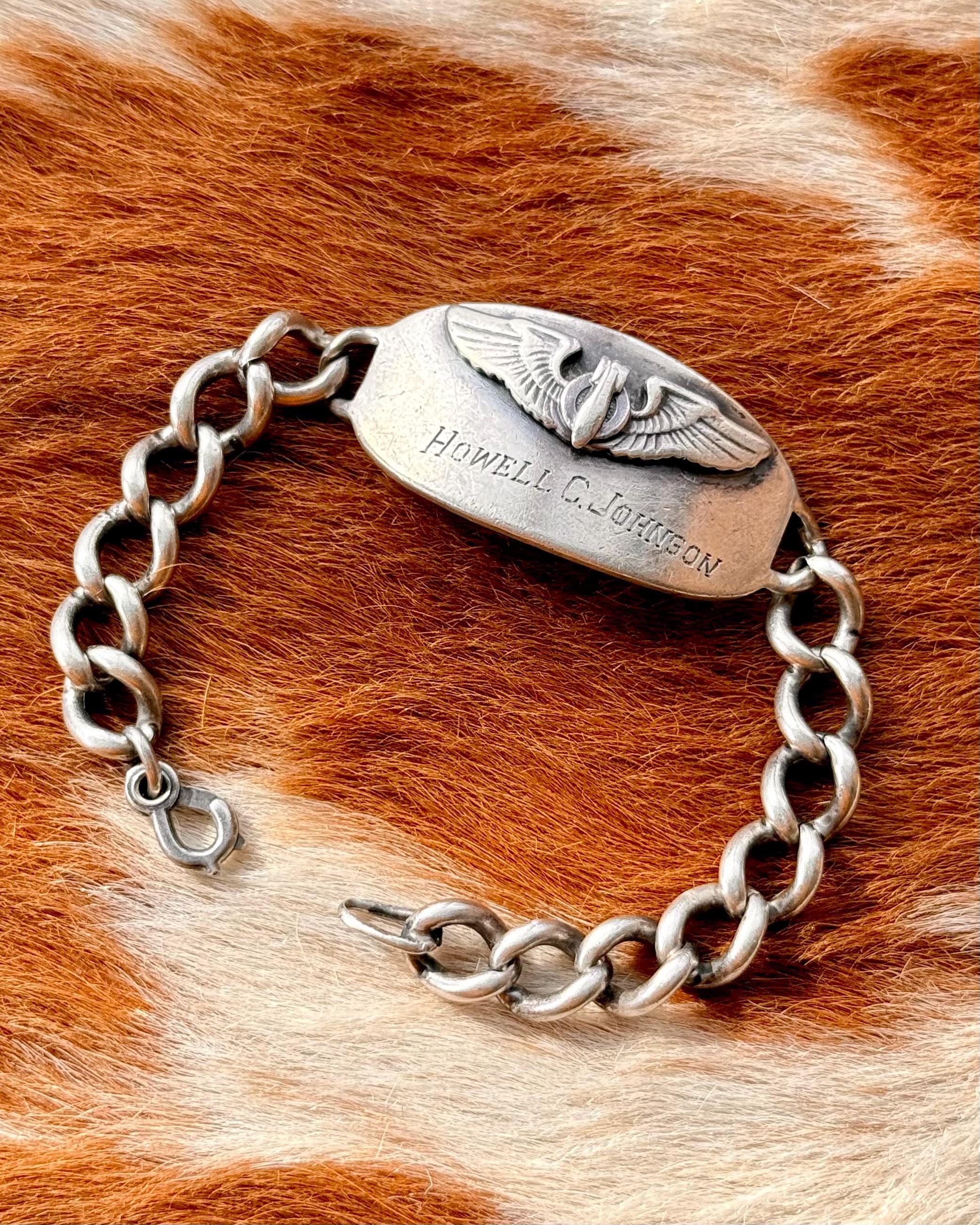 An authentic vintage WWII era sterling silver ID bracelet. features the name Howell C Johnson engraved on the front with a USAF Bombardier emblem. a strong representation of American history. wear with integrity.