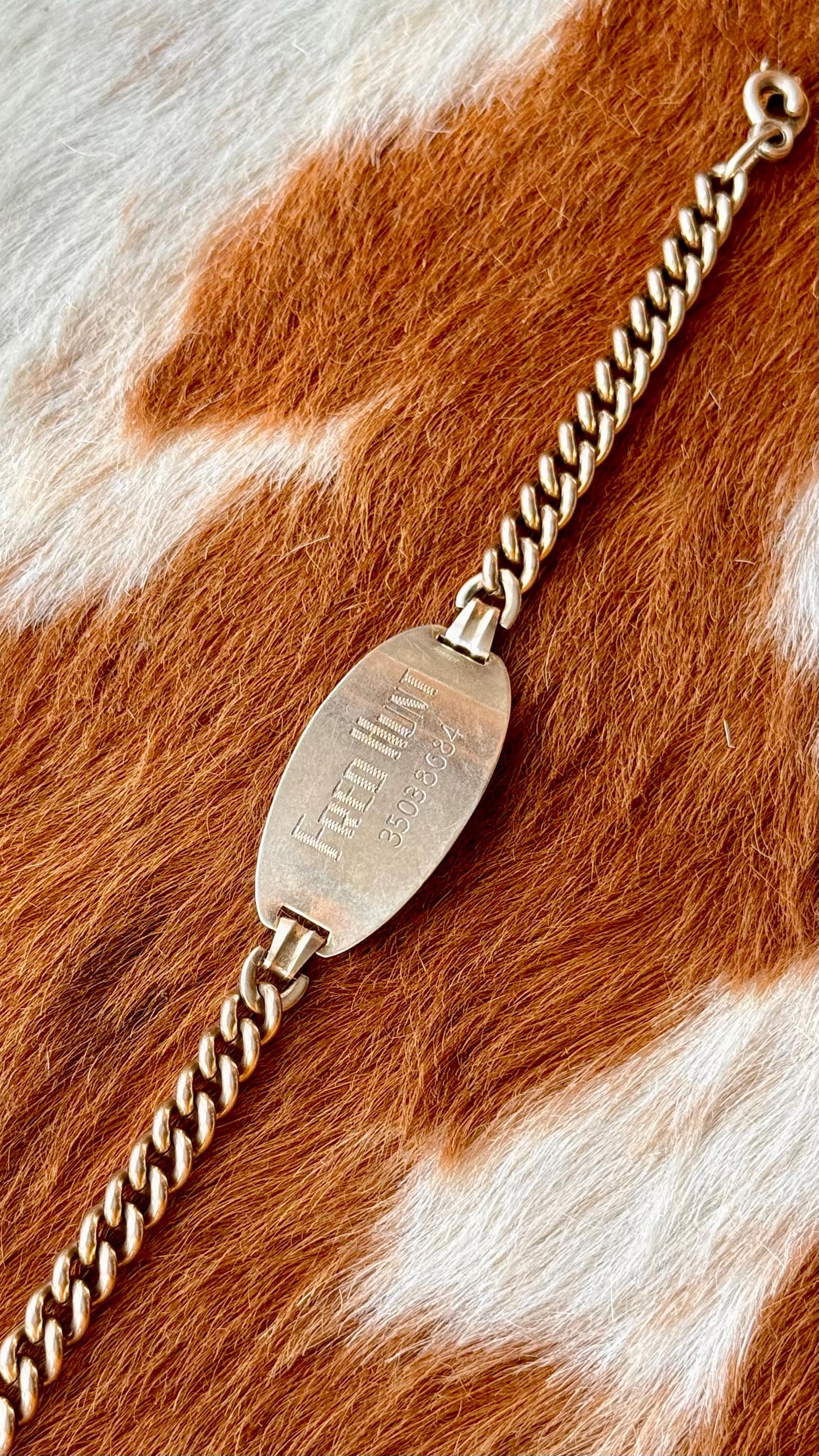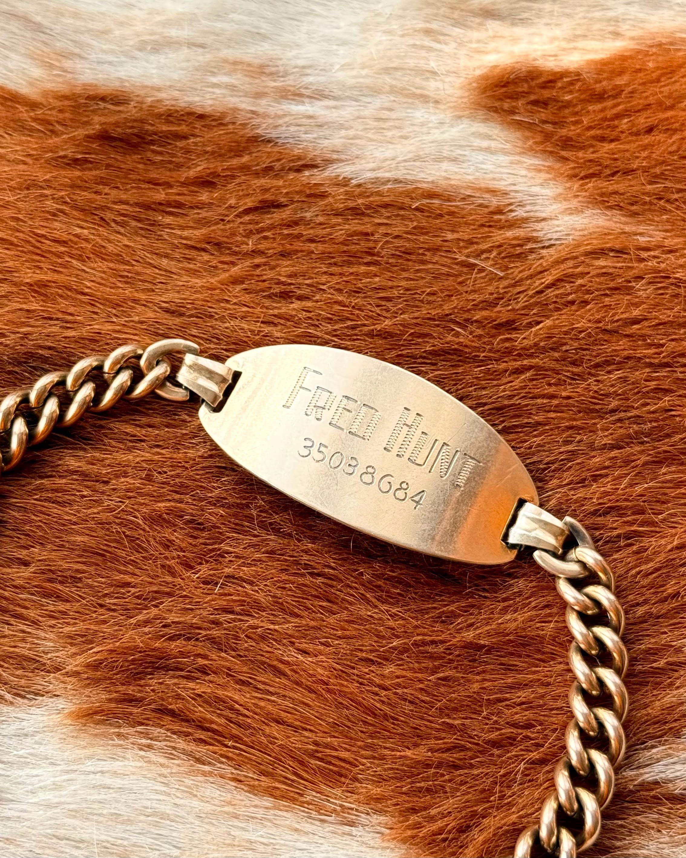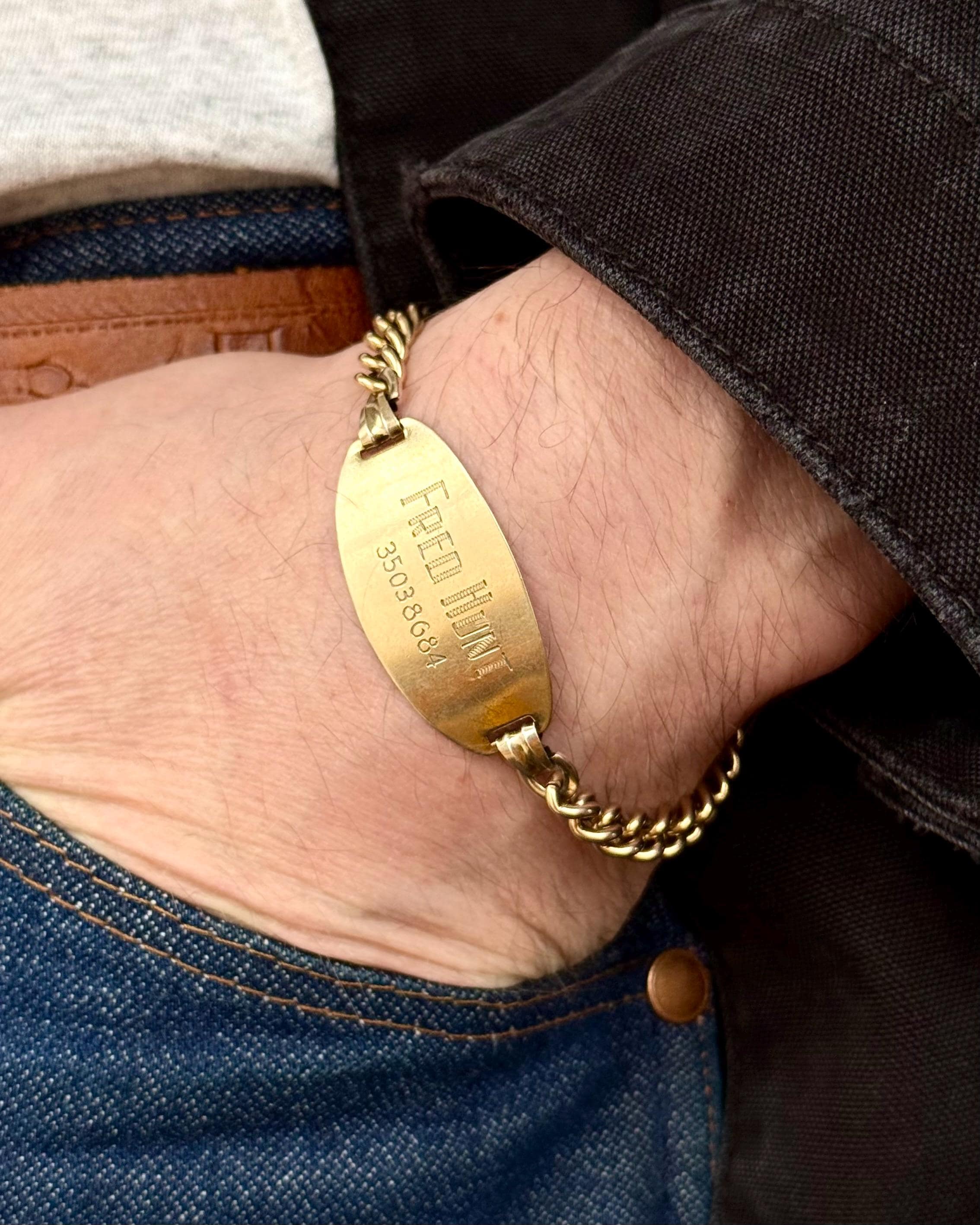 An authentic vintage midcentury era ID bracelet. 12k gold filled over sterling silver. features the name Fred Hunt and identification engraved on the front. a note from his sweetheart “Love Wanda” engraved on the back. a beautiful memento of love and representation of American history. wear with integrity.